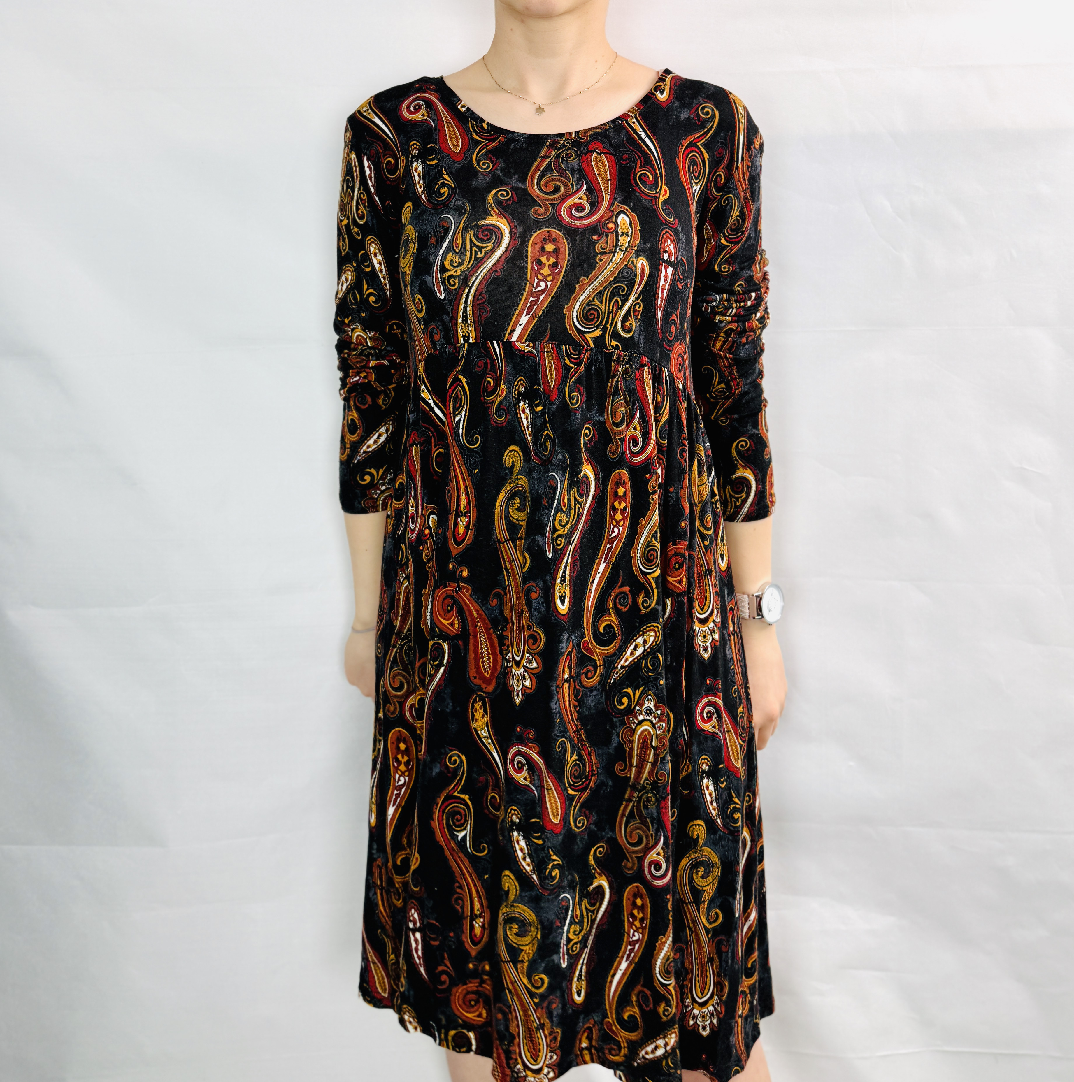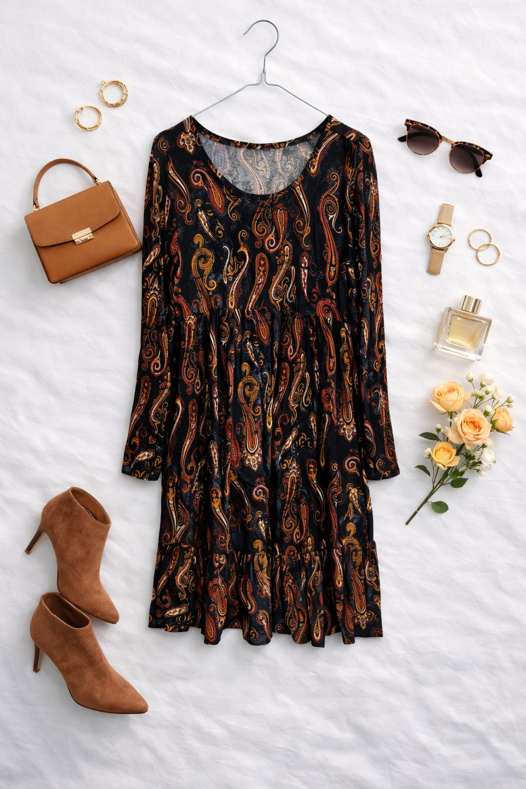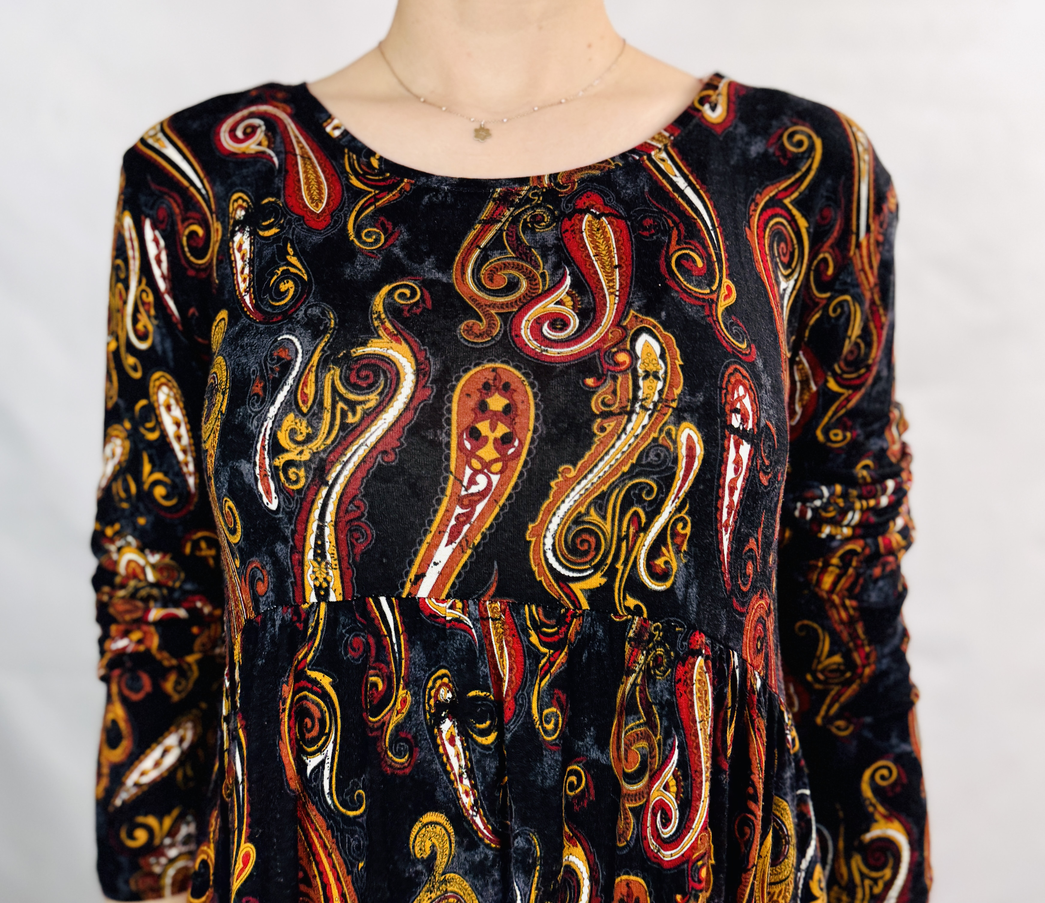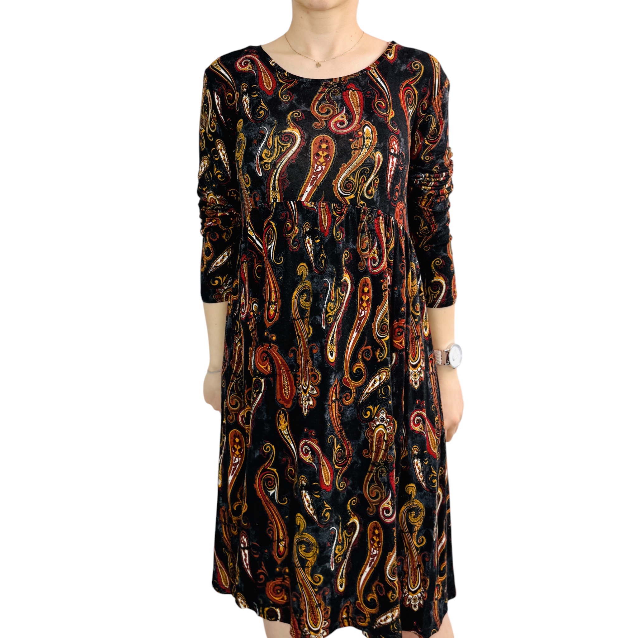 Ta sukienka to pełna temperamentu, a zarazem subtelna propozycja dla kobiet ceniących wyjątkowy wzór i komfort noszenia. Orientalny motyw paisley w ciepłych, jesiennych tonach na głębokim, czarnym tle nadaje kreacji nostalgicznego, nieco boho charakteru połączonego z elegancją. Projekt emanuje kobiecą delikatnością i swobodą jednocześnie, tworząc aurę, która sprawdzi się zarówno podczas spotkań towarzyskich, jak i w chwilach, gdy pragniesz wyglądać wyraźnie, ale z klasą.
