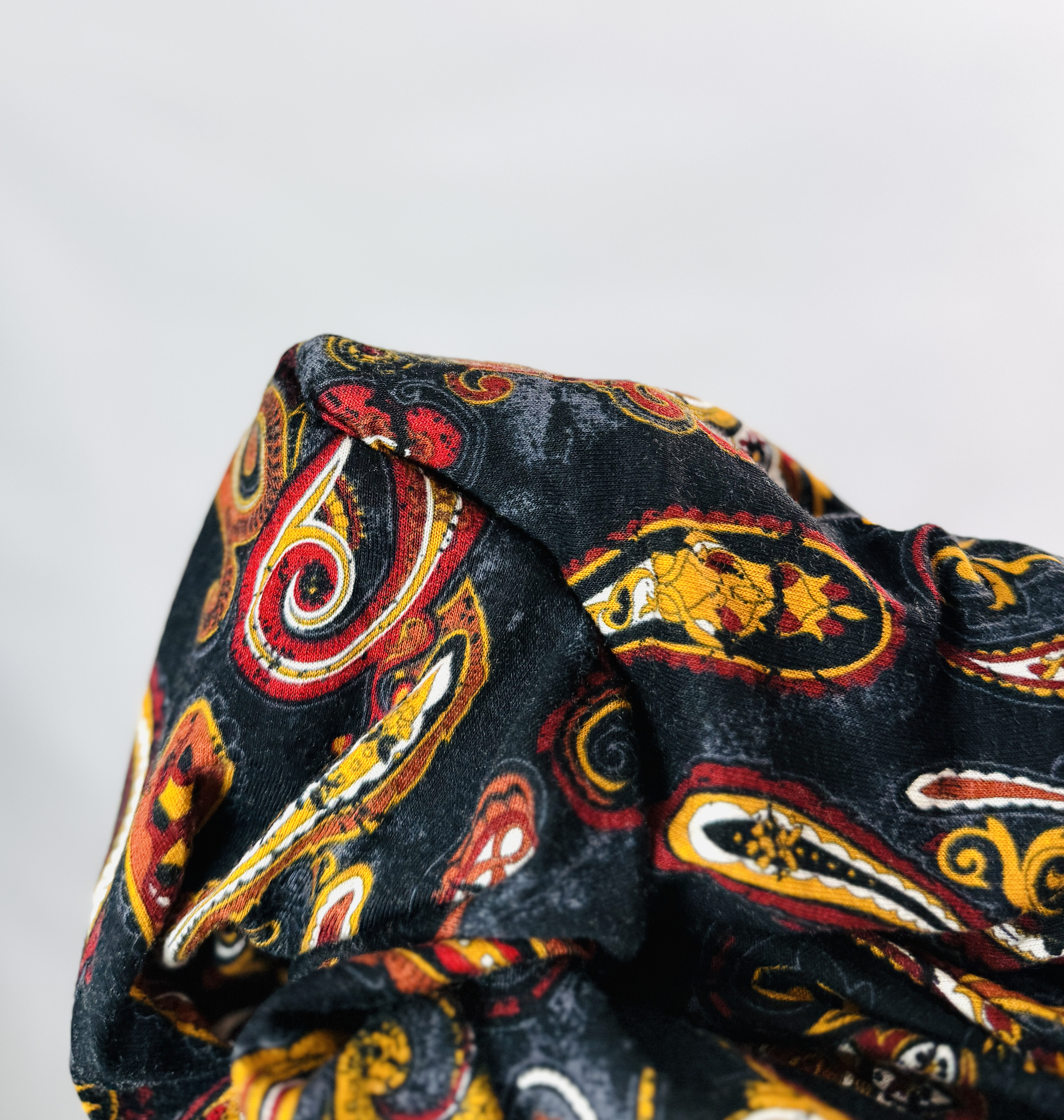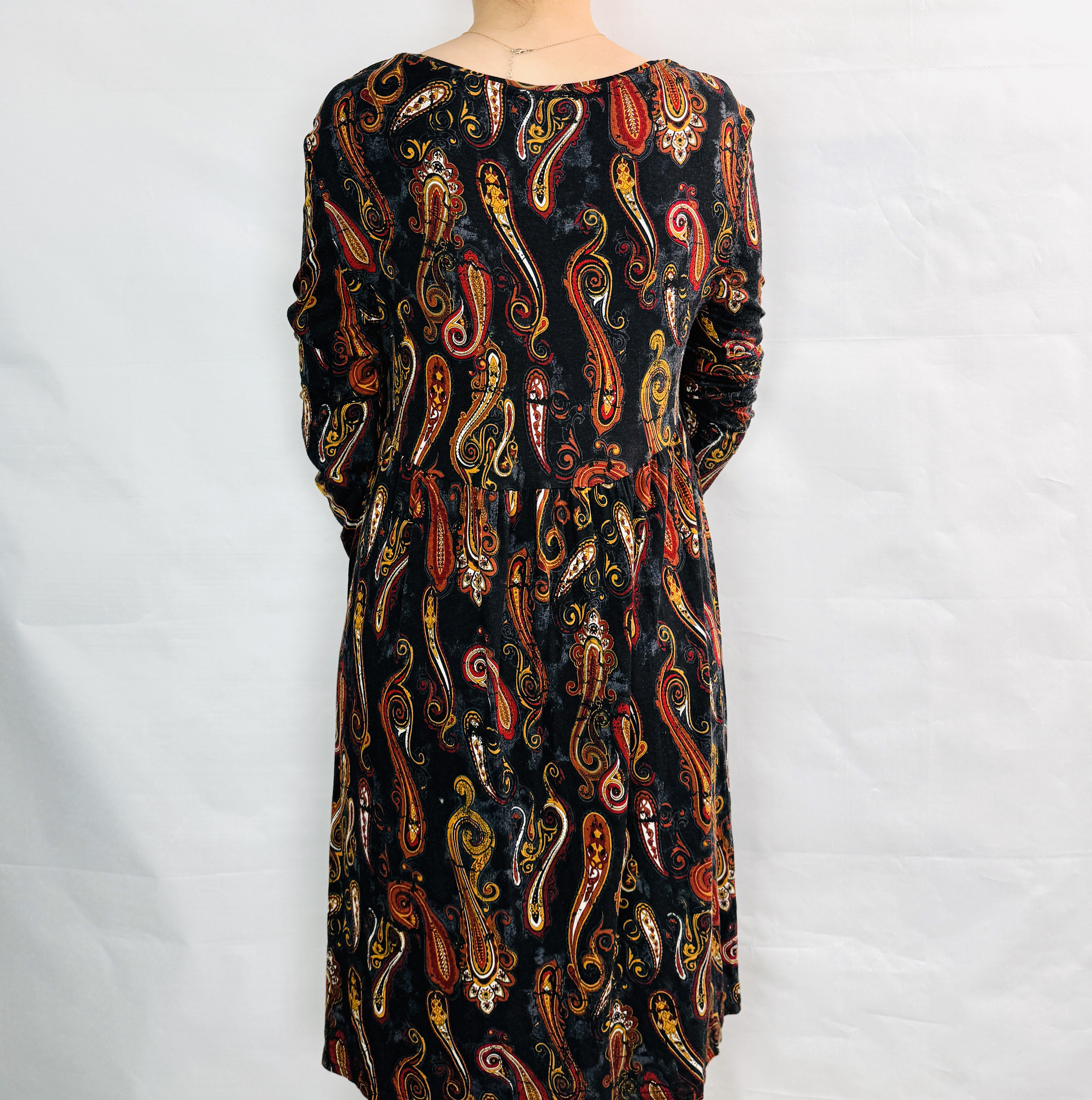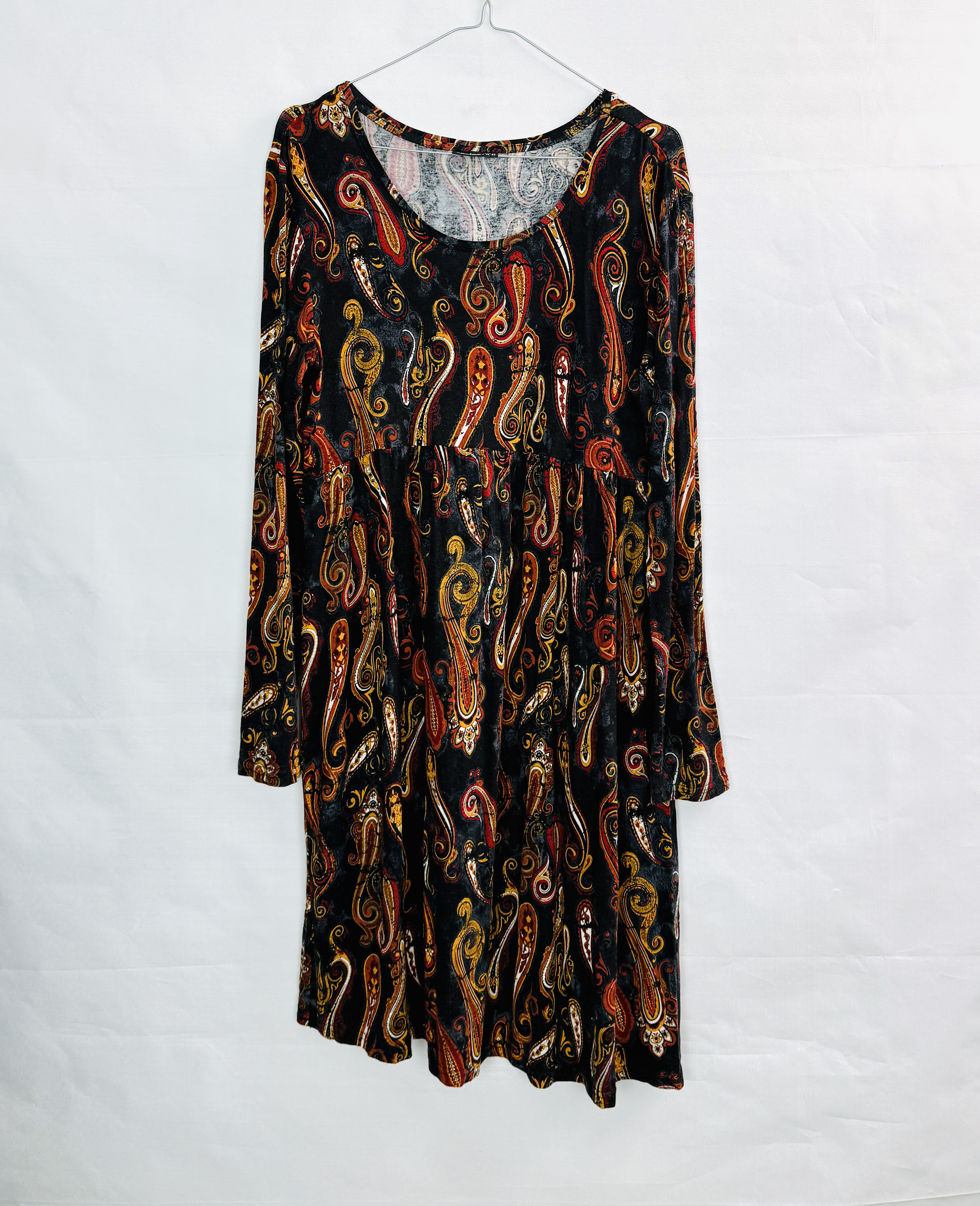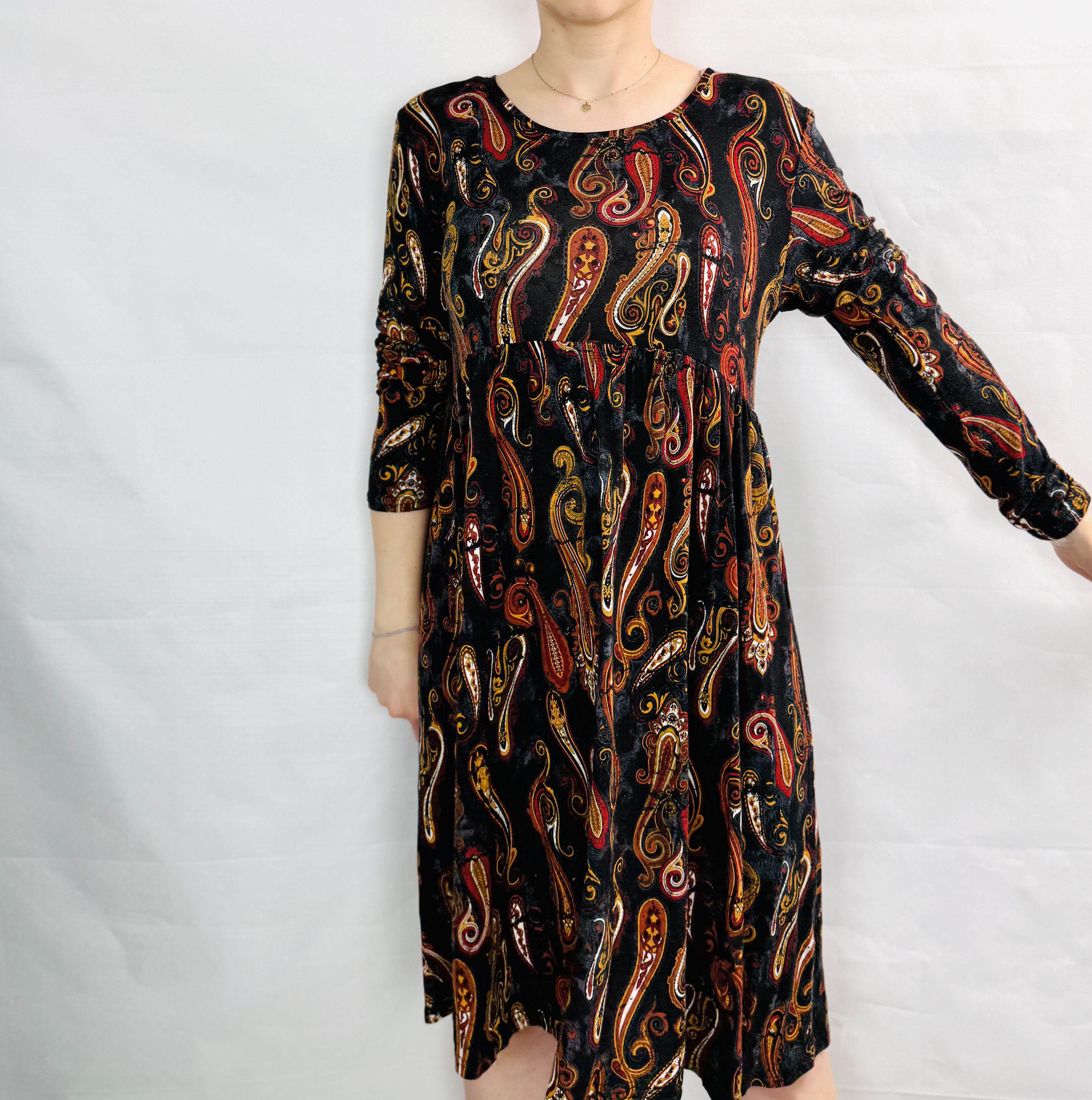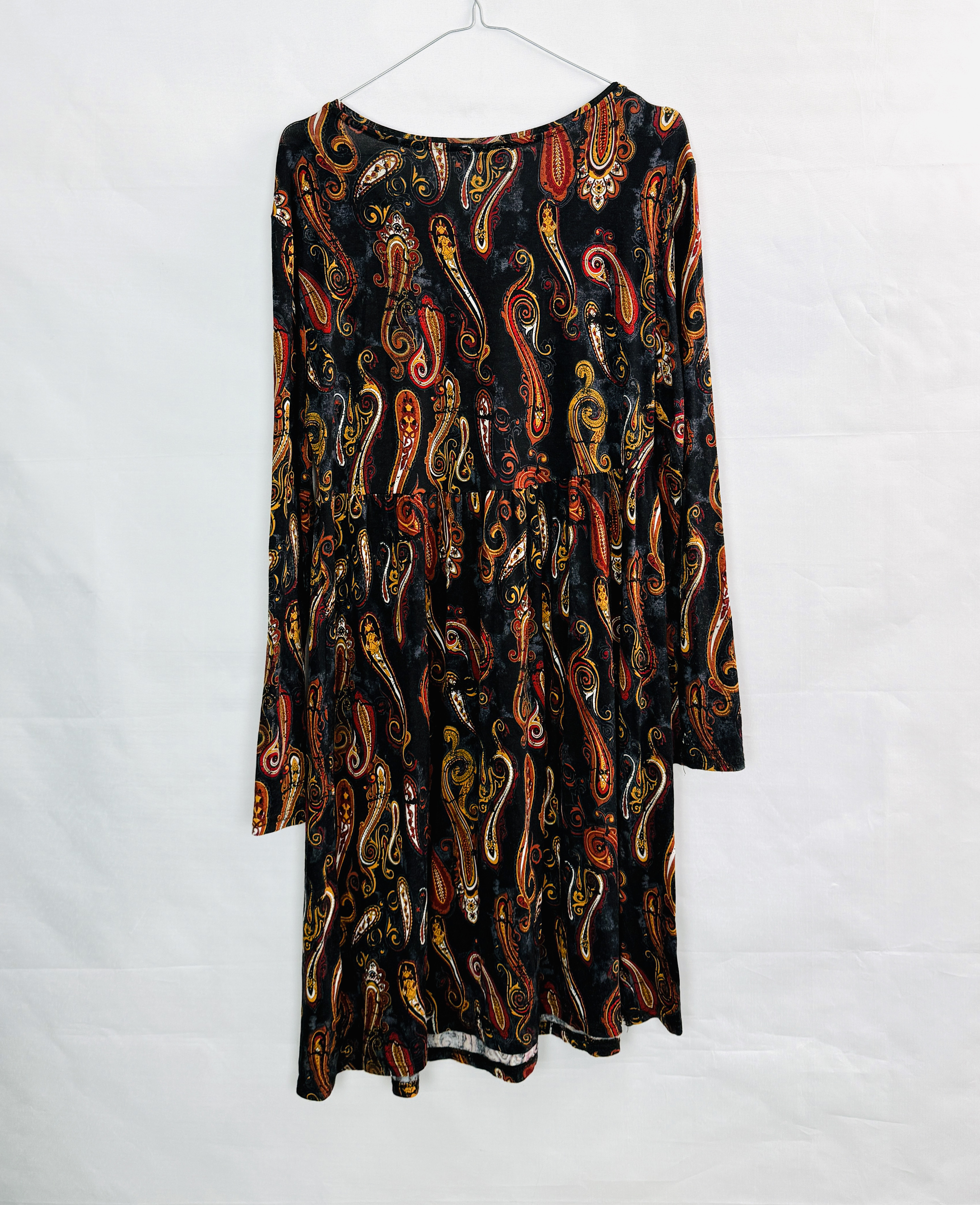 Ta sukienka to pełna temperamentu, a zarazem subtelna propozycja dla kobiet ceniących wyjątkowy wzór i komfort noszenia. Orientalny motyw paisley w ciepłych, jesiennych tonach na głębokim, czarnym tle nadaje kreacji nostalgicznego, nieco boho charakteru połączonego z elegancją. Projekt emanuje kobiecą delikatnością i swobodą jednocześnie, tworząc aurę, która sprawdzi się zarówno podczas spotkań towarzyskich, jak i w chwilach, gdy pragniesz wyglądać wyraźnie, ale z klasą.