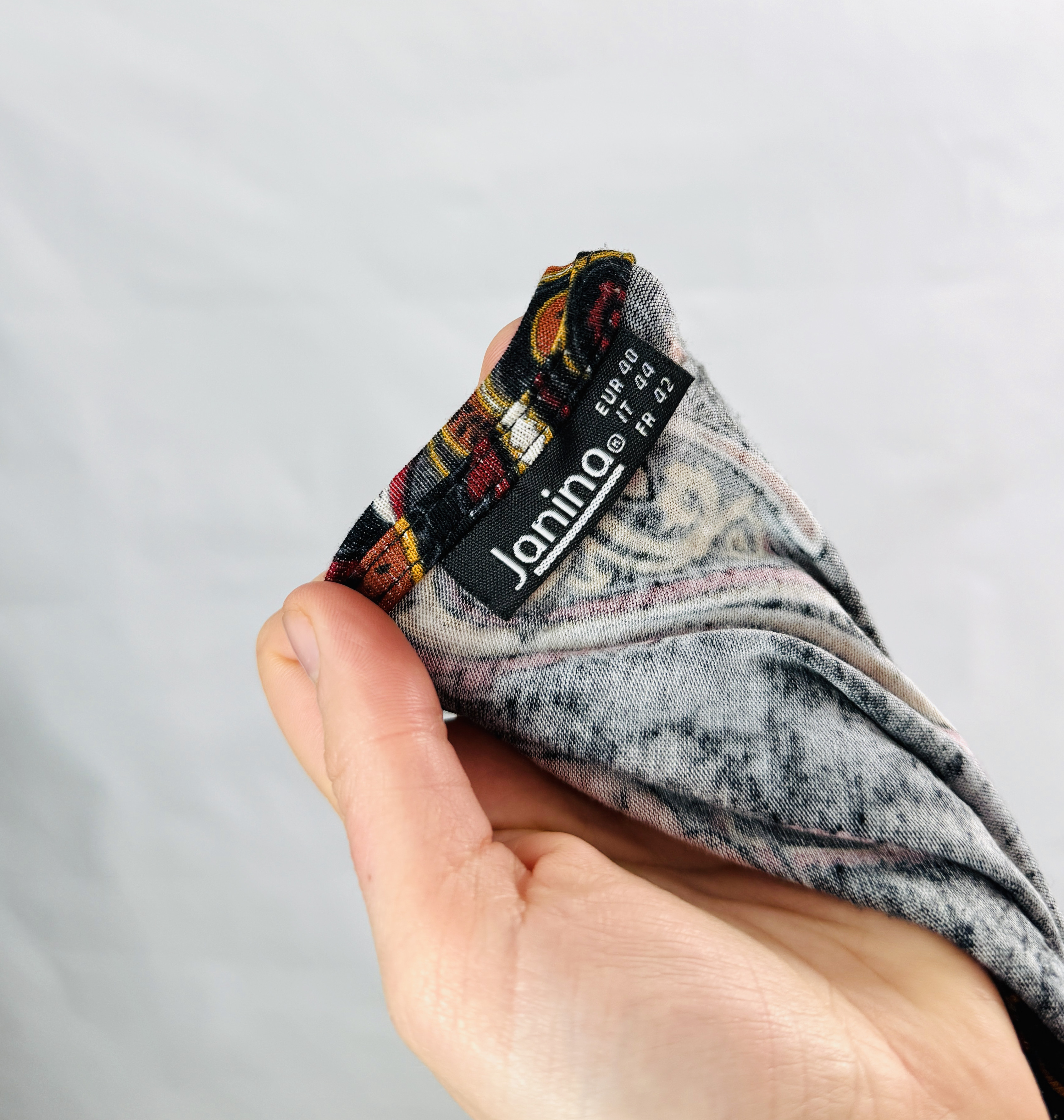 Spódnica ma długość midi, sięgając mniej więcej do połowy łydek, z miękkimi fałdami, które płynnie opadają i nadają sylwetce kobiecego wdzięku. Wzór paisley rozłożony jest rytmicznie po całej powierzchni, a intensywne akcenty w kolorze złota, bordo i ciepłego brązu tworzą ciekawą grę barw na czarnym tle. Materiał wygląda na miękko układający się i delikatnie połyskujący, dzięki czemu sukienka porusza się z naturalną lekkością i subtelnie odbija światło, nadając stylizacji elegancki efekt.