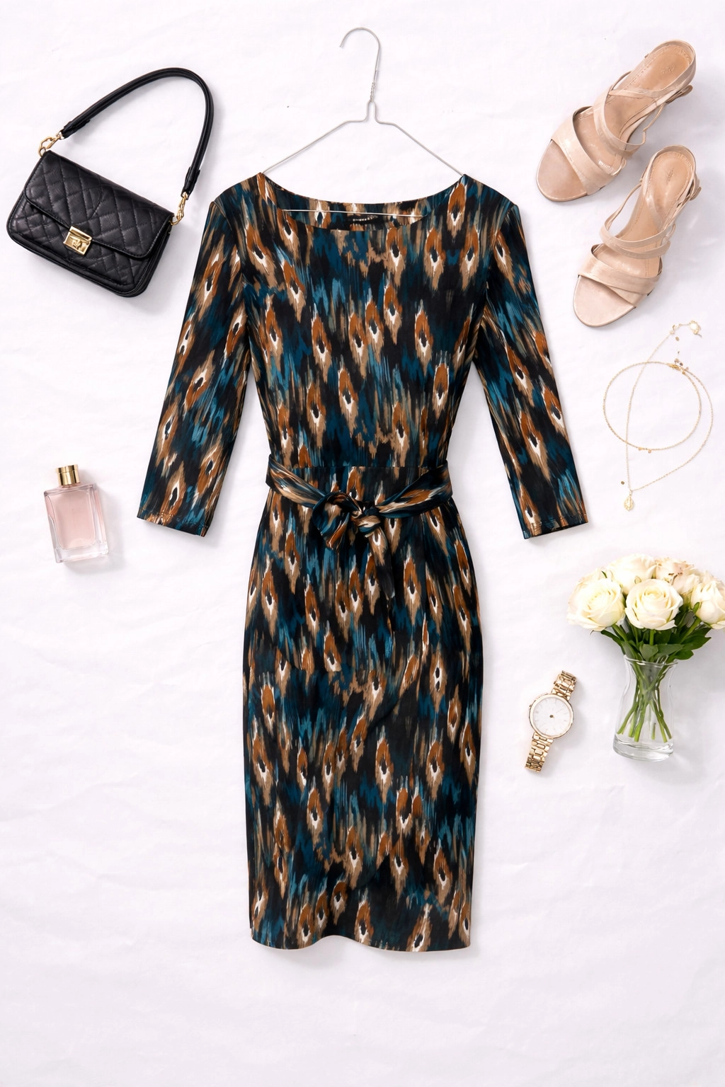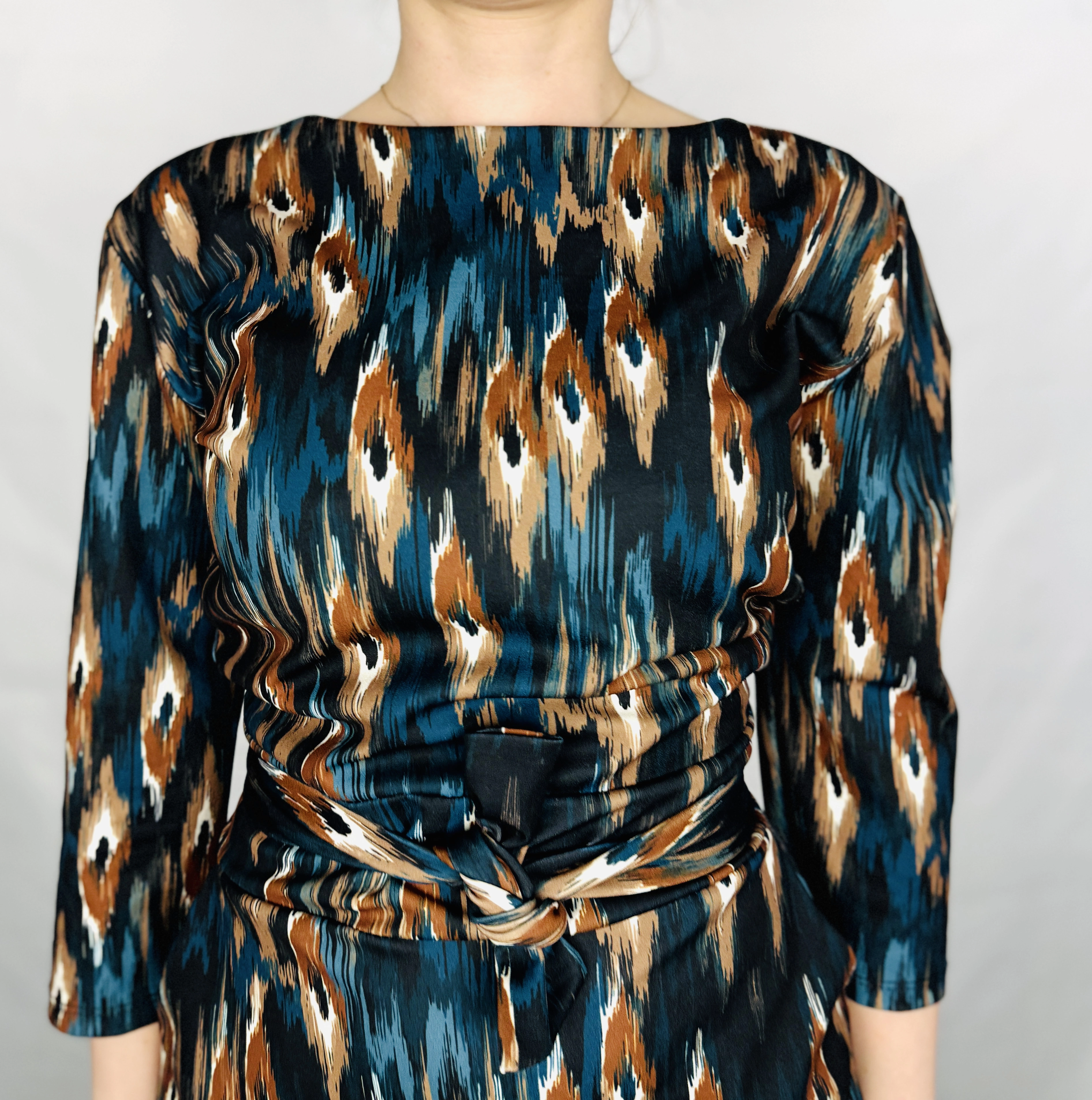 Fason sukienki jest prosty, ale wzbogacony o wyraźne zaznaczenie talii poprzez wiązanie, co nadaje sylwetce proporcji i podkreśla jej naturalny kształt. Góra ma zabudowany, łagodnie zaokrąglony dekolt, który nadaje całości elegancji i równoważy intensywność wzoru. Rękawy o długości za łokieć dodają lekkości i sprawiają, że model jest bardzo uniwersalny, odpowiedni na różne pory roku.