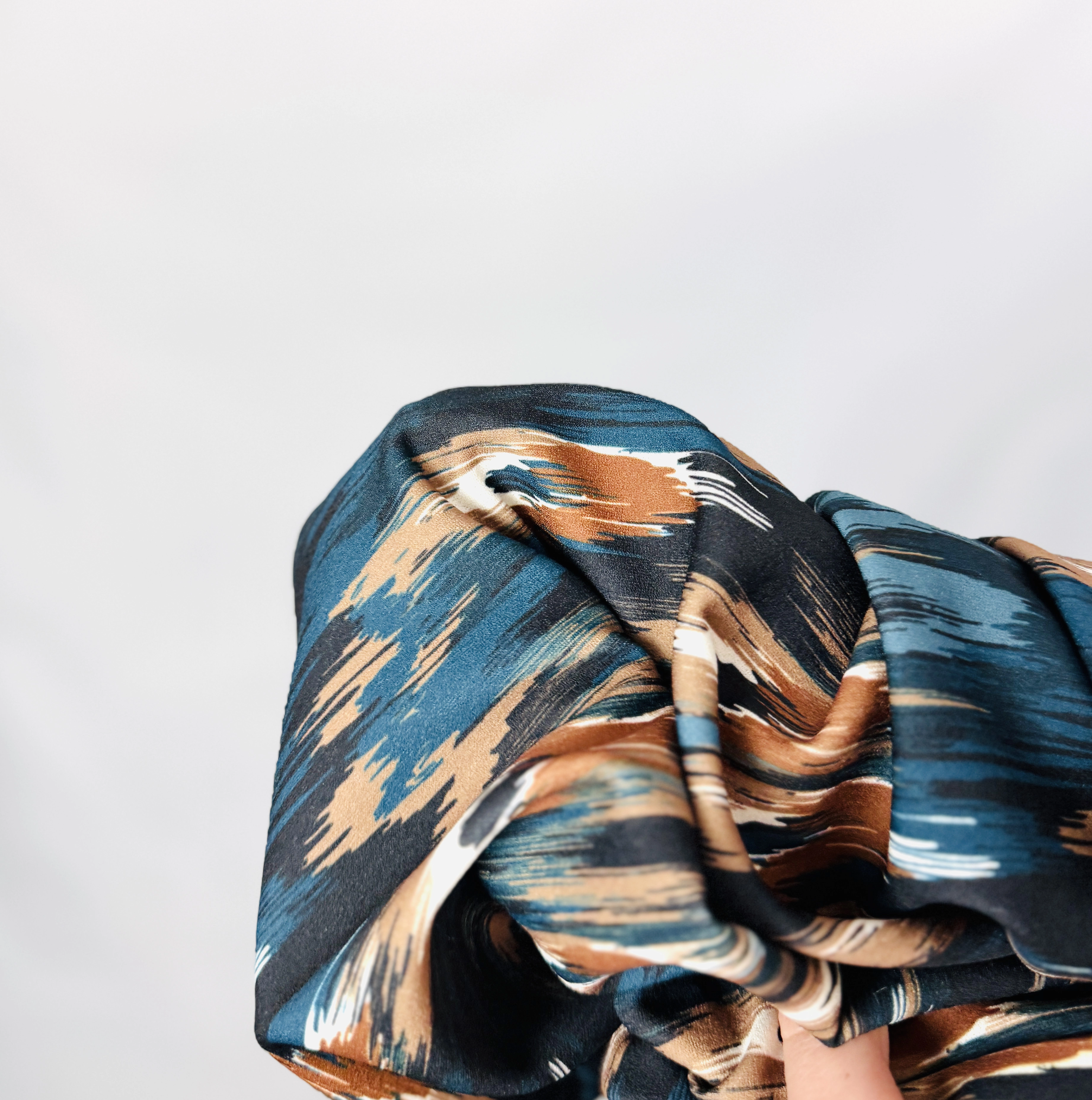 Ta wzorzysta sukienka zachwyca wyrazistym, artystycznym printem, który przyciąga uwagę i nadaje stylizacji unikalnego charakteru. Połączenie głębokich odcieni niebieskiego, czerni oraz ciepłych tonów brązu i beżu tworzy harmonijną, ale dynamiczną kompozycję. Całość ma lekko etniczny i nowoczesny klimat, który świetnie sprawdzi się zarówno na co dzień, jak i w bardziej dopracowanych zestawach.