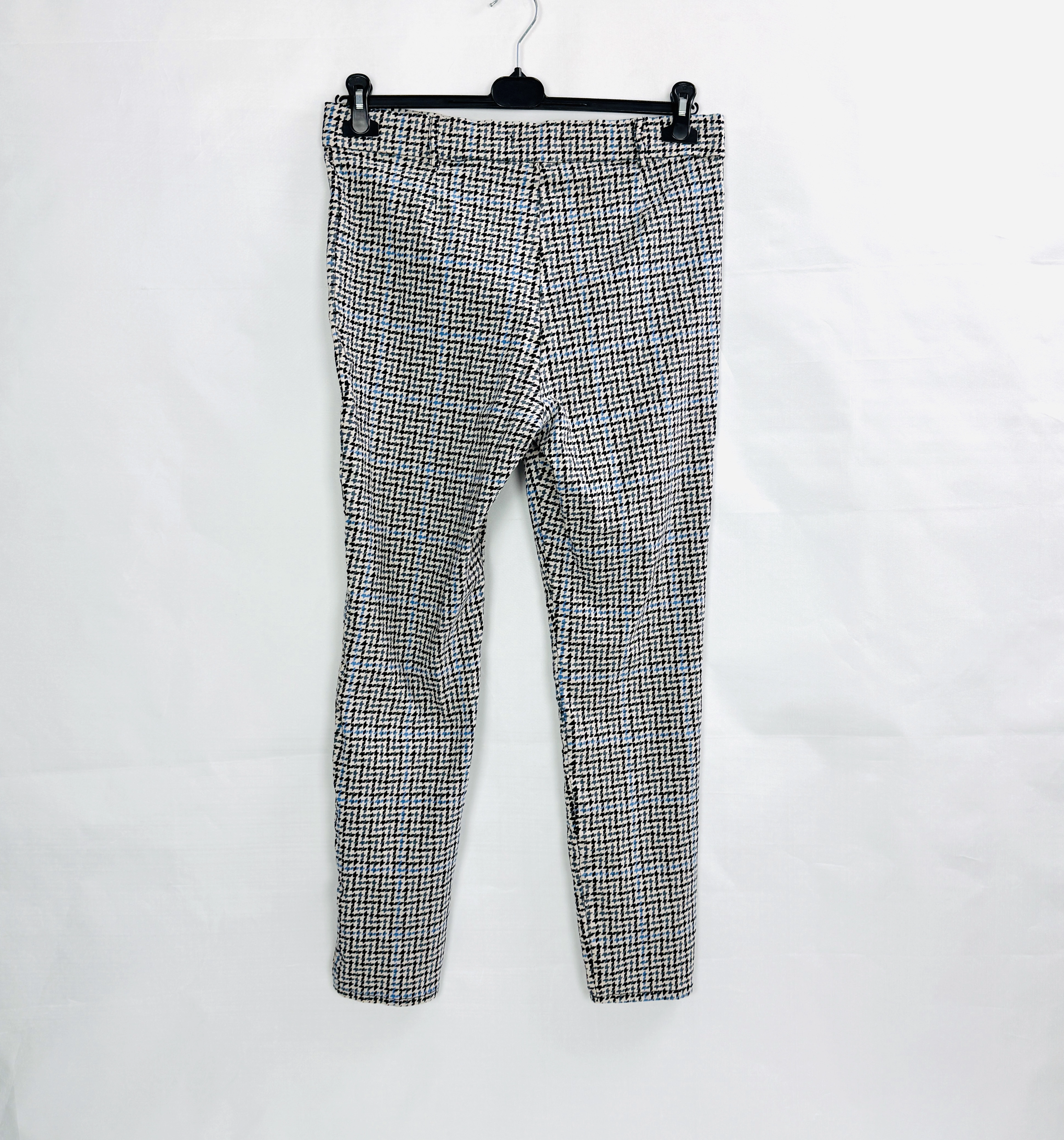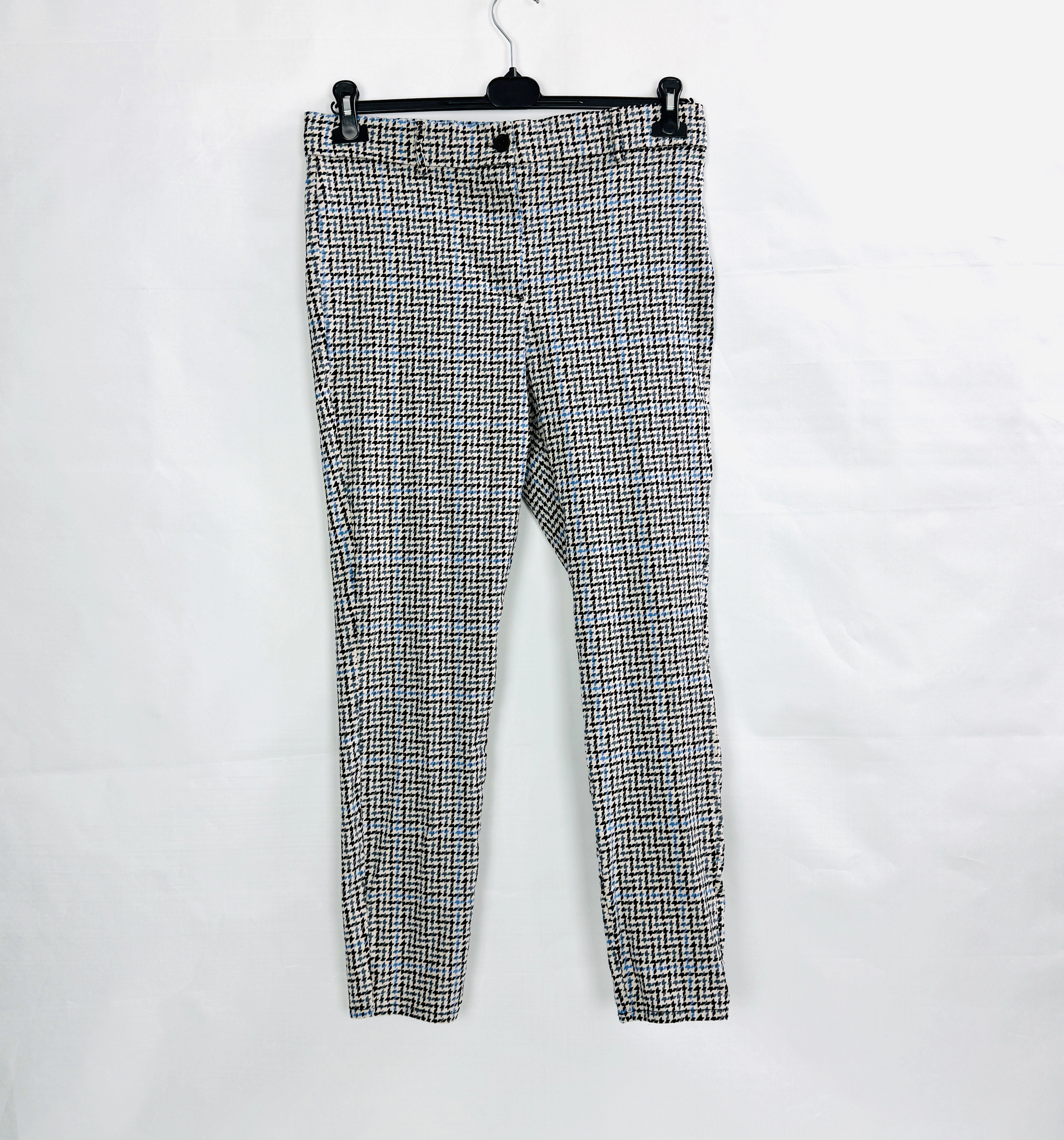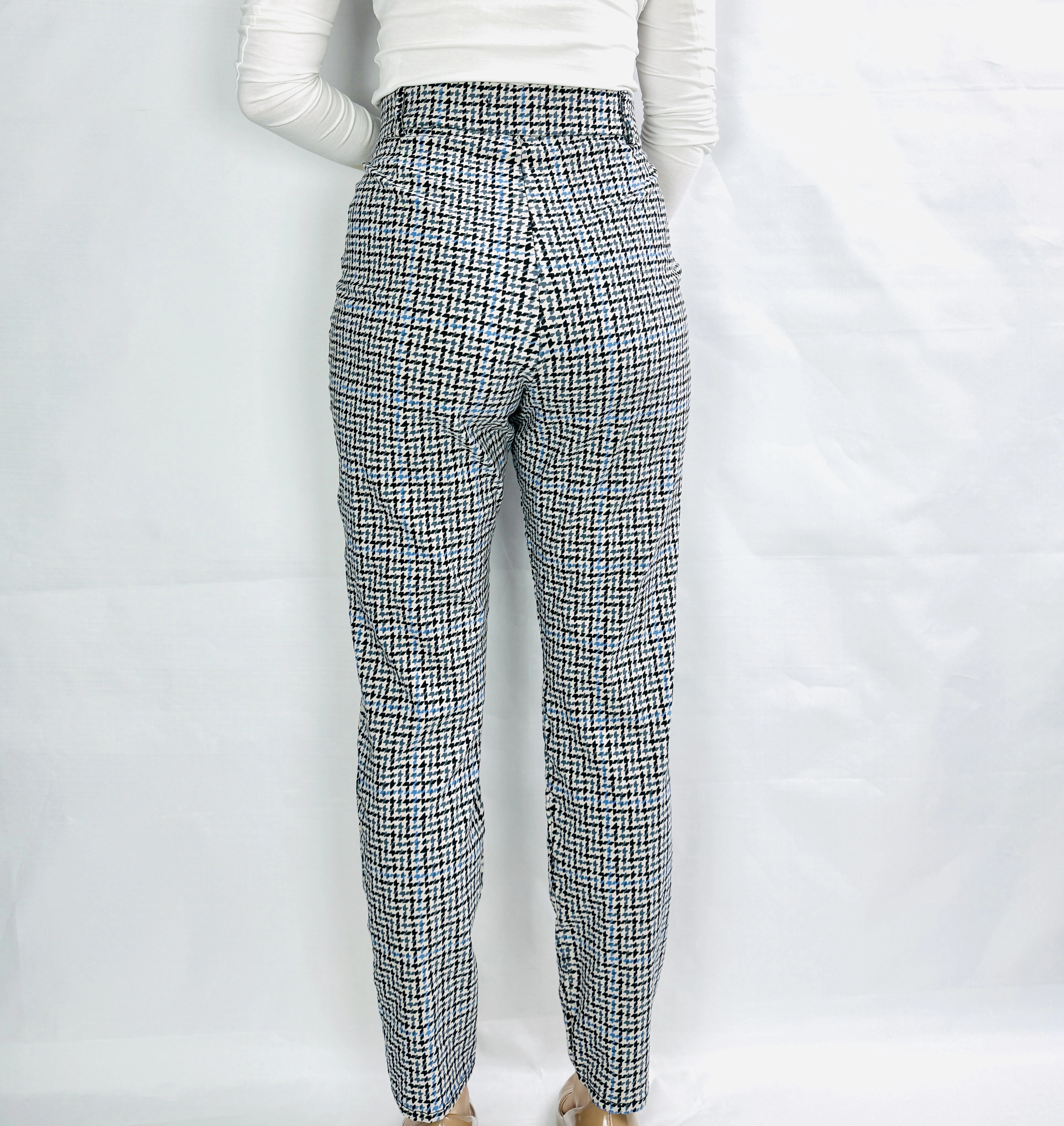 Te wzorzyste spodnie to doskonałe połączenie klasyki z nowoczesnym, modnym akcentem, które wprowadza do garderoby świeżość i wyrazistość. Delikatny, geometryczny wzór w stonowanych kolorach czerni, bieli i błękitu nadaje całości eleganckiego charakteru, jednocześnie zachowując uniwersalność i ponadczasowość. Spodnie emanują spokojem i subtelnym urokiem, tworząc stylizację pełną harmonii i kobiecej lekkości. To model, który świetnie sprawdzi się zarówno w codziennych, jak i bardziej formalnych zestawieniach, oferując wygodę i styl na najwyższym poziomie.