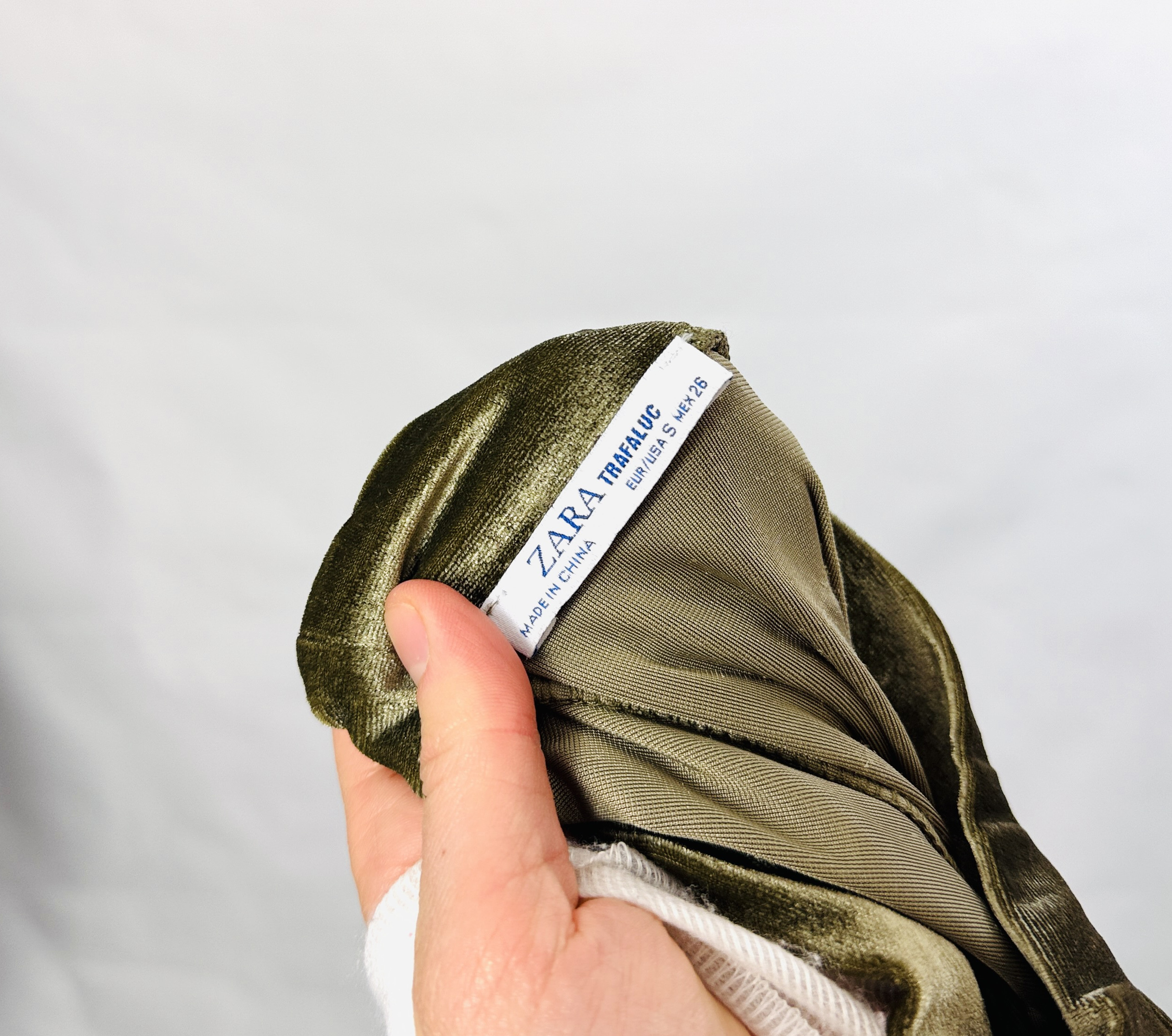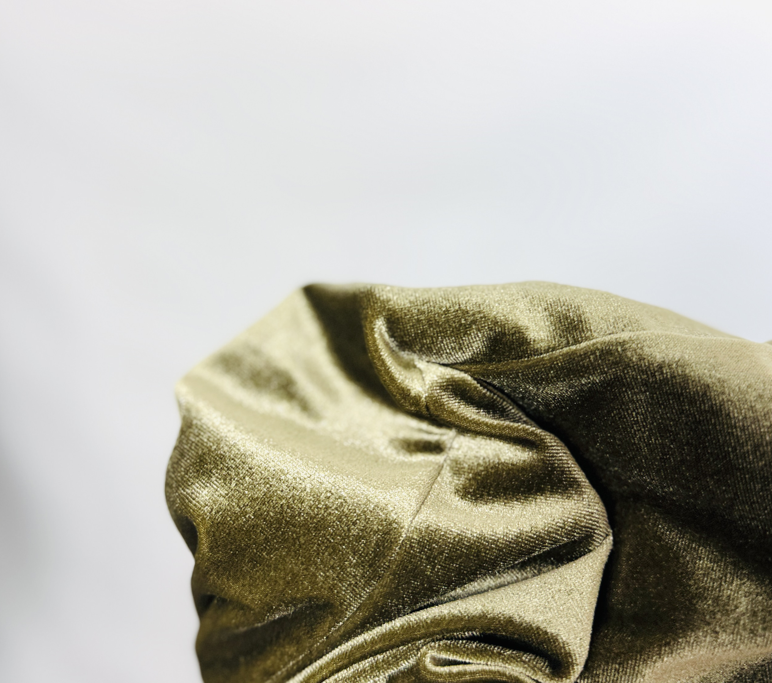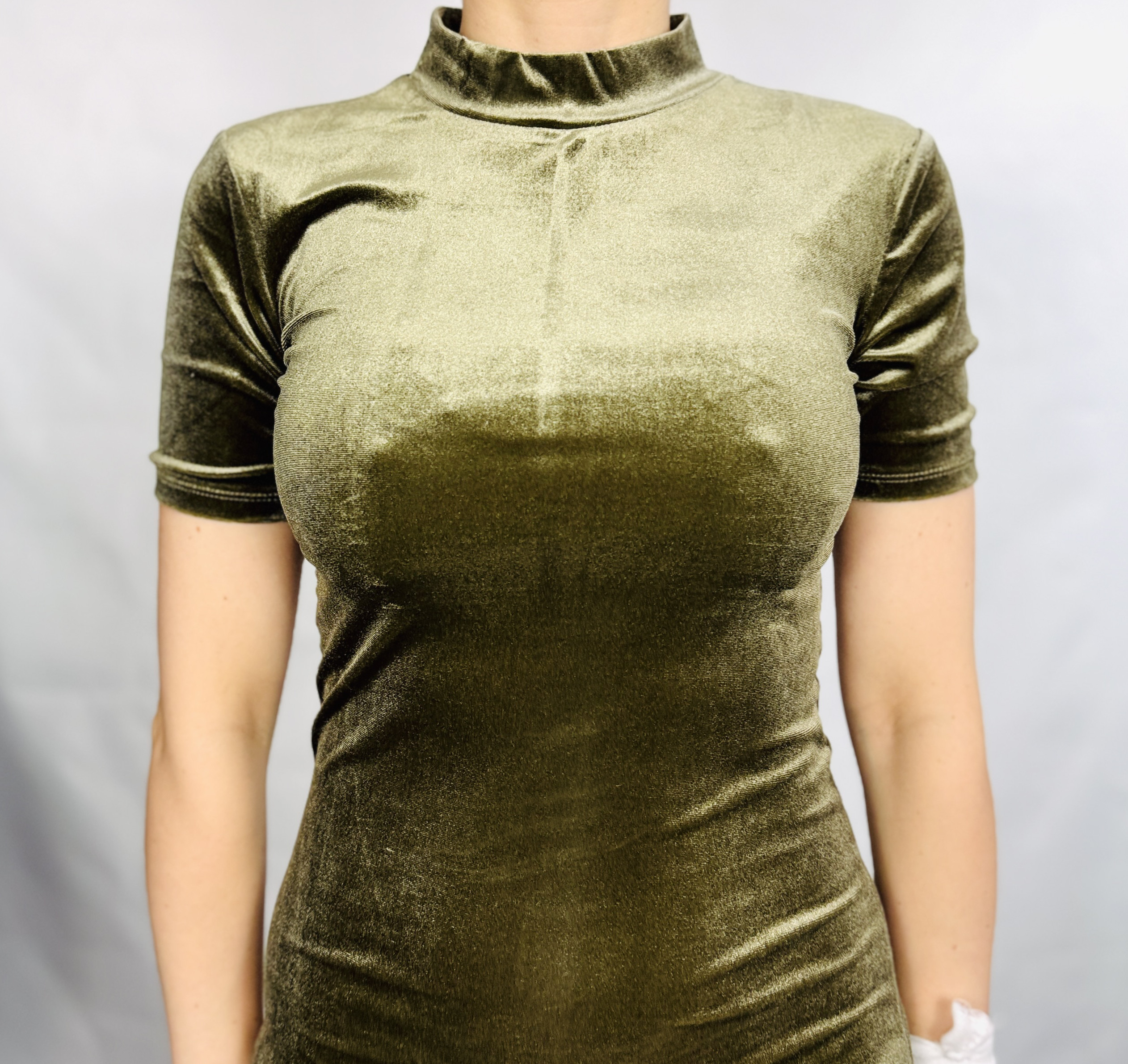 Materiał prezentuje się jako aksamitny, delikatnie połyskujący i miękko otulający — tkanina subtelnie odbija światło, tworząc głębię koloru i piękne refleksy przy każdym ruchu. Dzięki swojej lekko gęstszej strukturze materiał ładnie trzyma formę sylwetki, jednocześnie miło przylega i nie krępuje ruchów; tam, gdzie sukienka pracuje z ciałem, materiał układa się w naturalne fałdki, dodając całości miękkości. Aksamit nadaje stylizacji elegancki sznyt, który z łatwością przenosi look z dnia na wieczór.