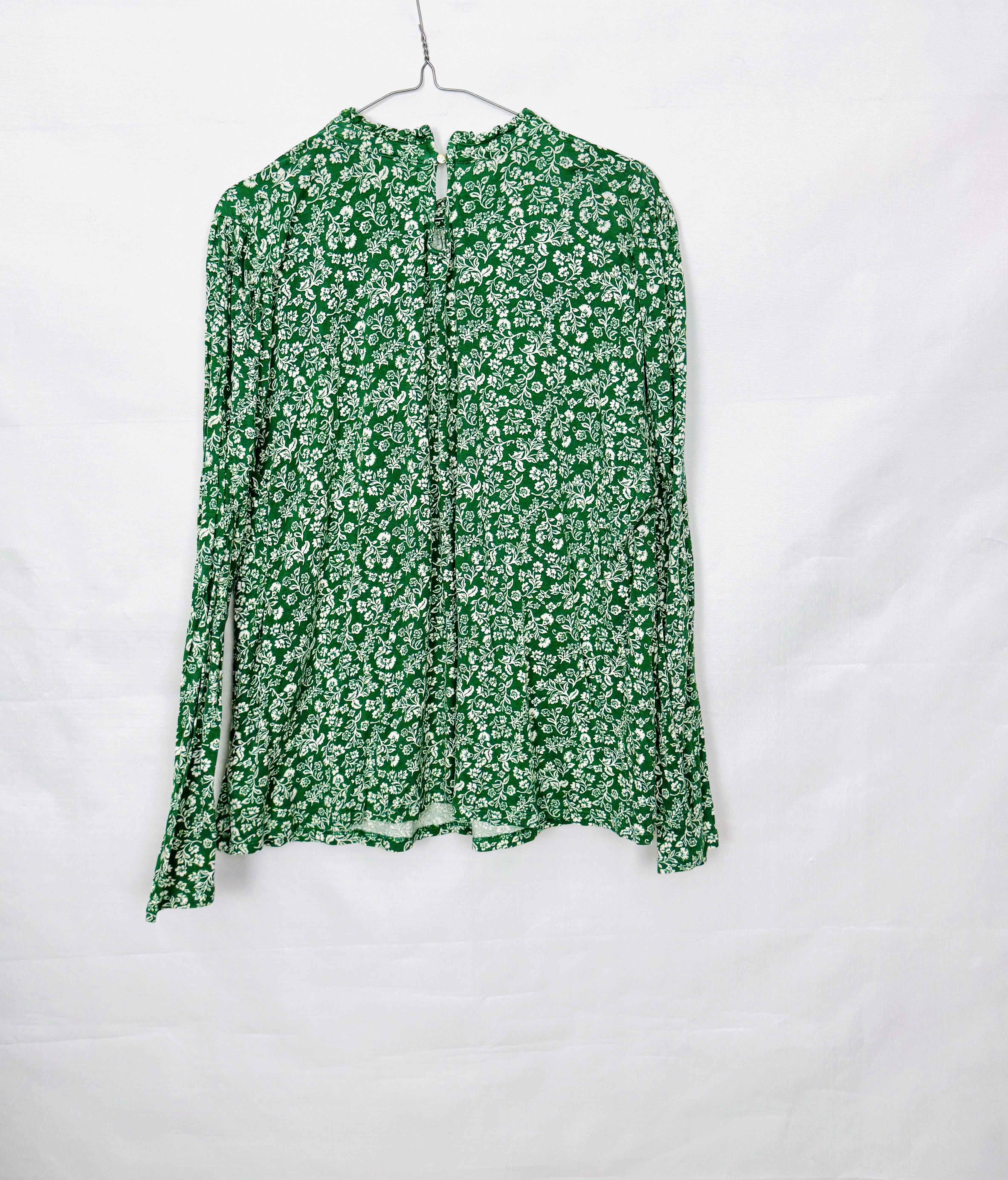 To świeża i kobieca bluzka, która emanuje delikatną, romantyczną nutą dzięki soczystej zieleni przeplatanej drobnym, białym wzorem kwiatowym. Model ma w sobie subtelną lekkość i naturalny urok — wygląda promiennie, a jednocześnie zachowuje stonowaną elegancję, co sprawia, że nadaje się zarówno do codziennych, jak i bardziej dopracowanych stylizacji. Całość daje wrażenie swobody i finezji, przywołując nastrój wiosennej świeżości z nutą klasycznej kobiecości.