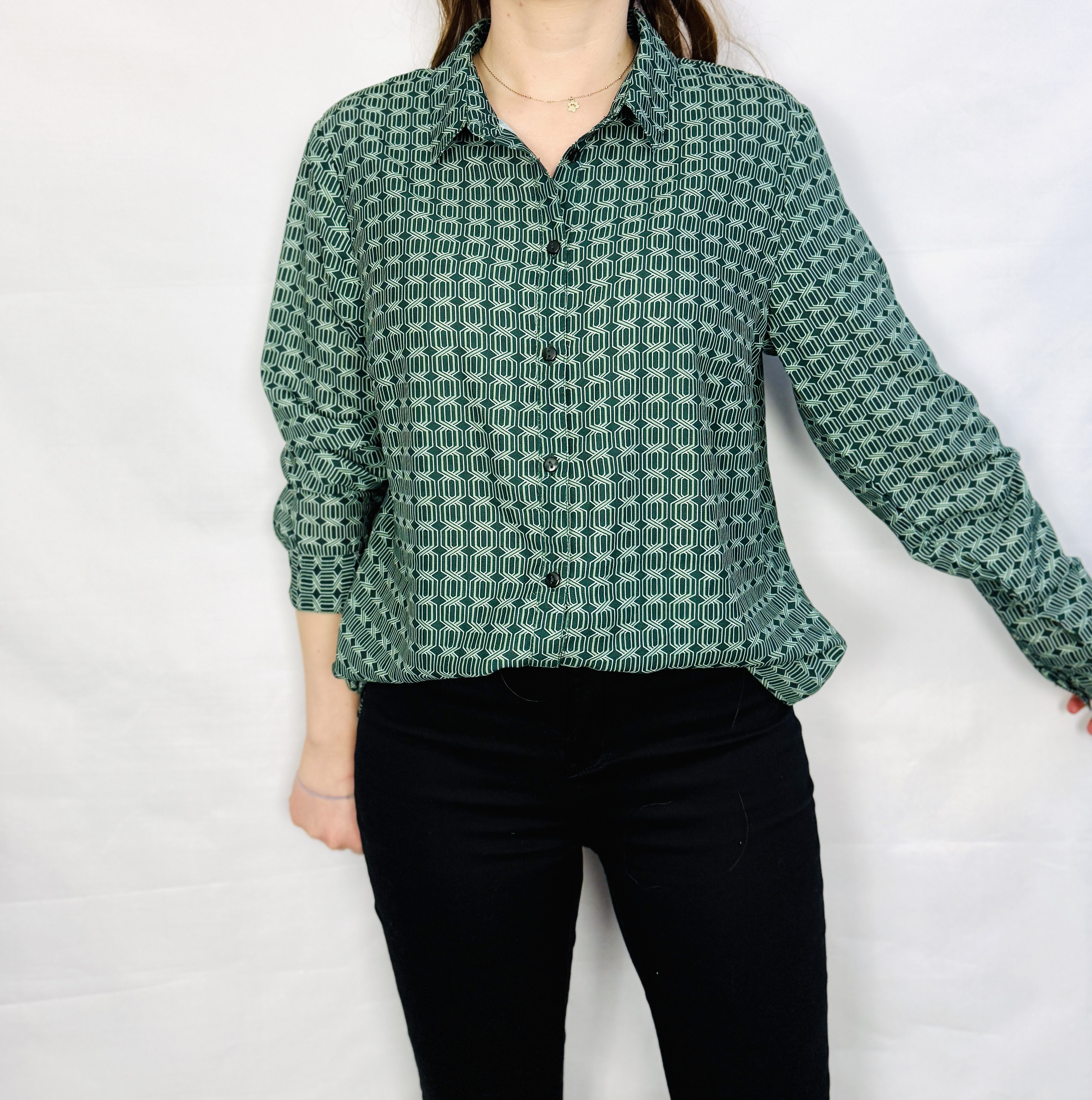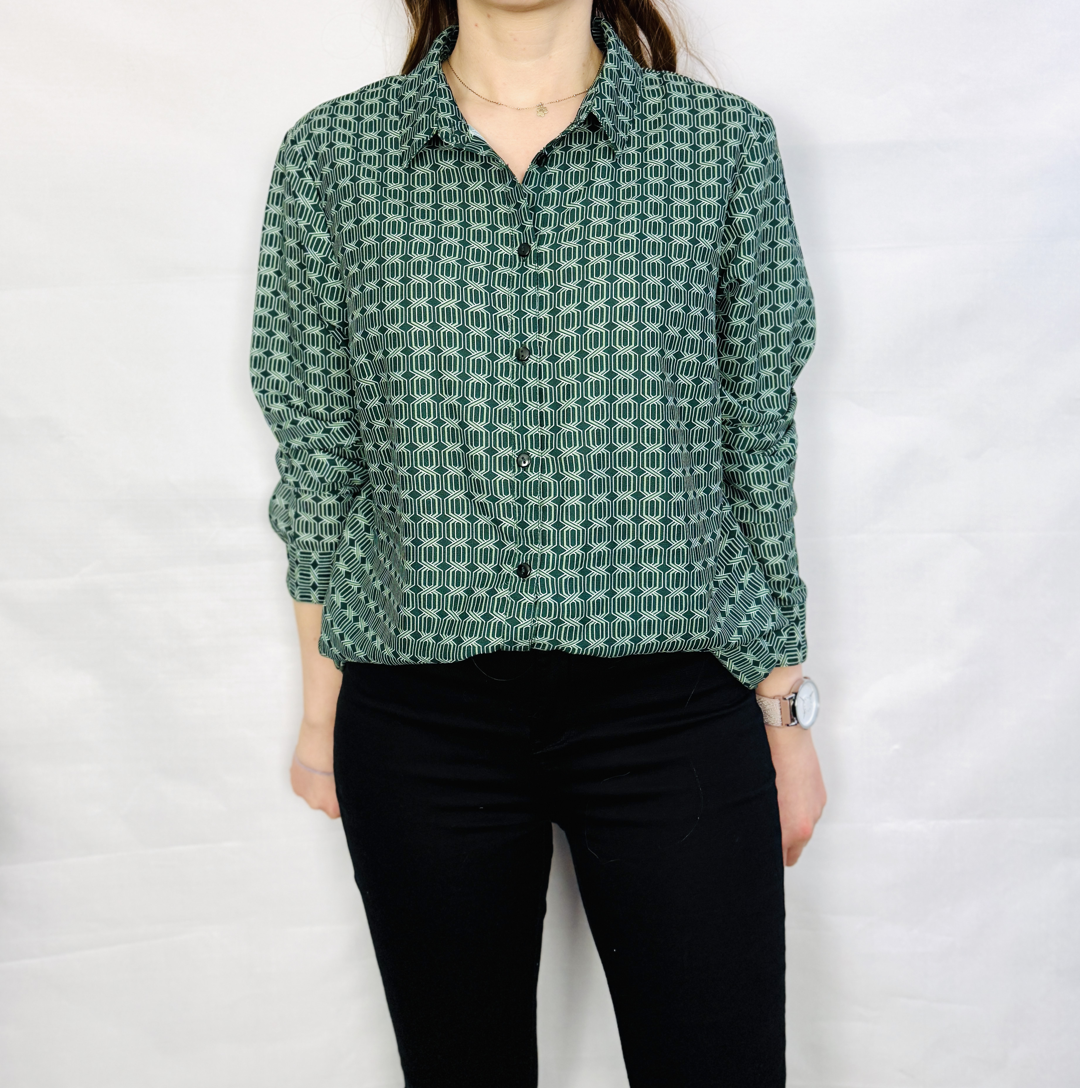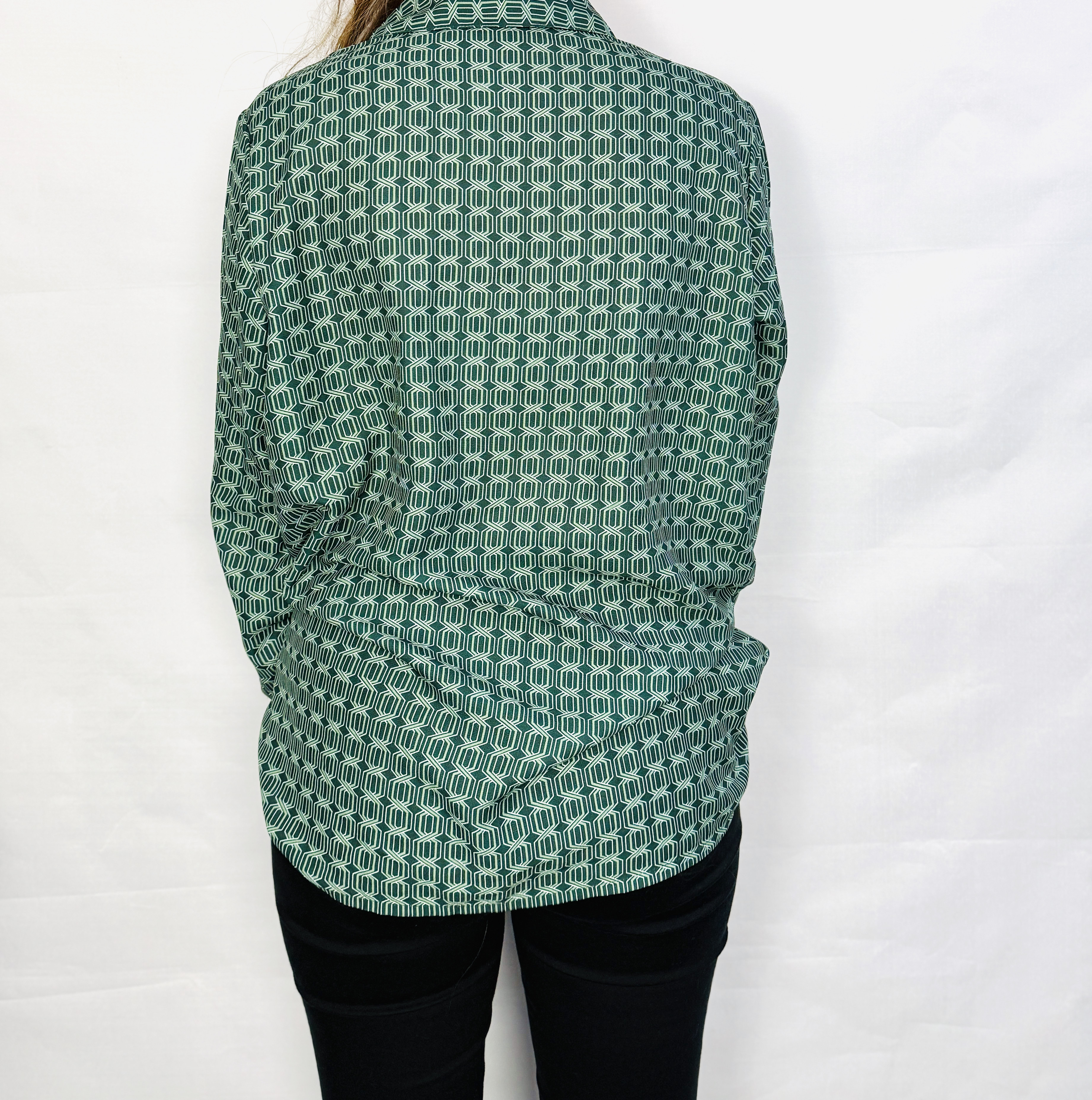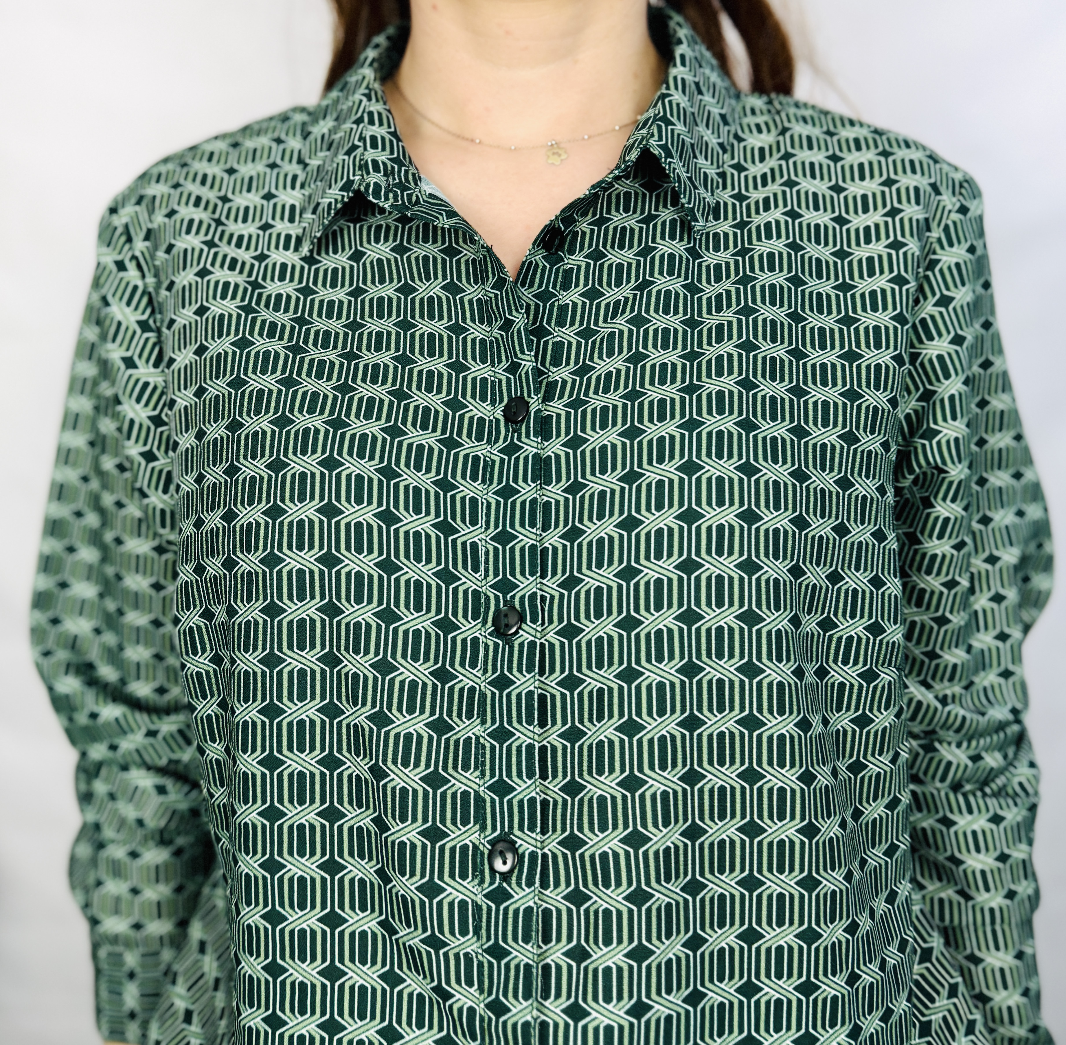 Ta koszula to połączenie kobiecej subtelności i nowoczesnej elegancji. Głęboka zieleń z regularnym, geometrycznym wzorem nadaje jej wyrafinowanego charakteru, który dobrze sprawdzi się zarówno w codziennych, jak i bardziej formalnych stylizacjach. Całość emanuje spokojem i łagodną energią, dzięki czemu koszula łatwo staje się bazą stylizacji podkreślającej szyk i gustowną prostotę.