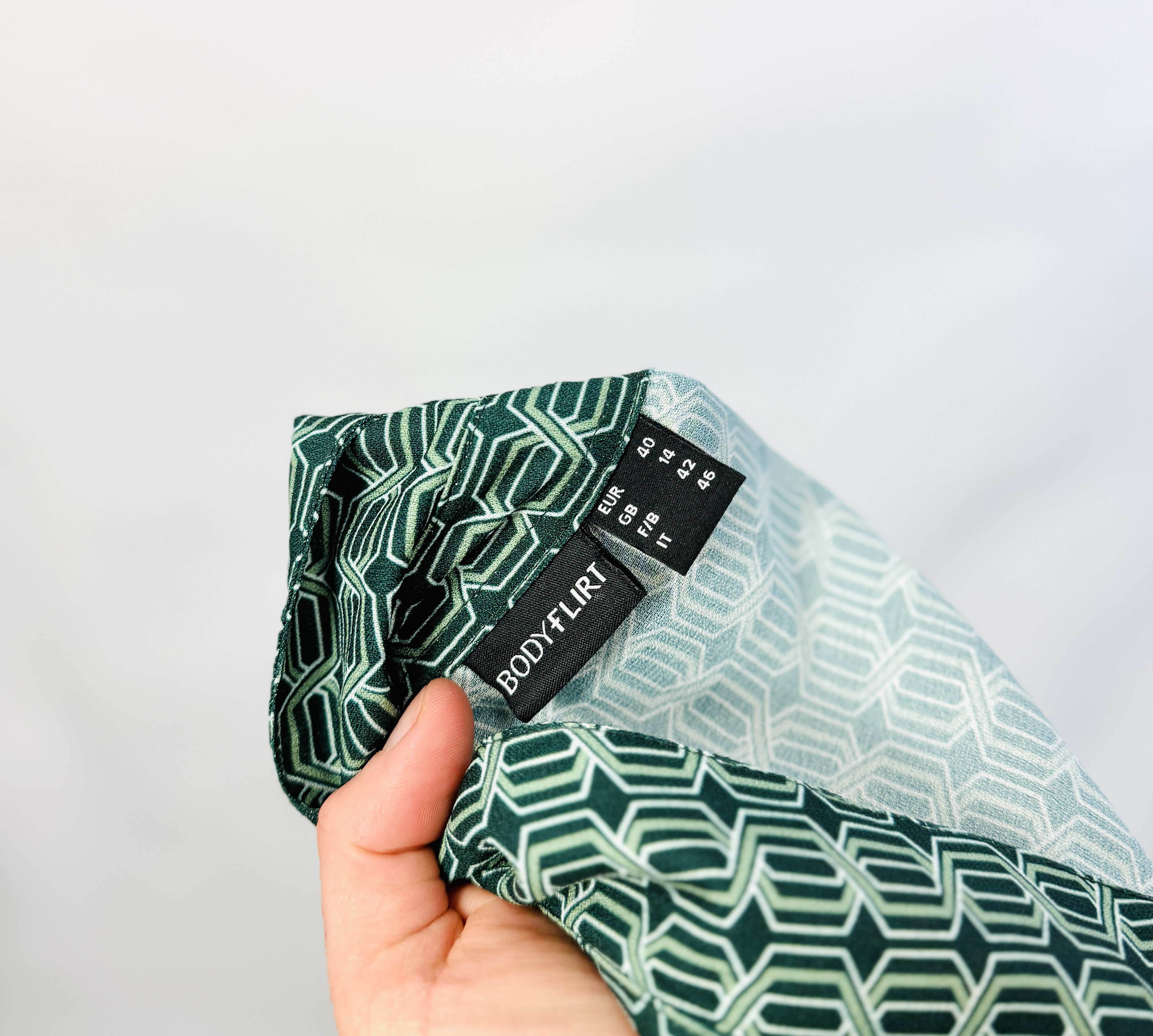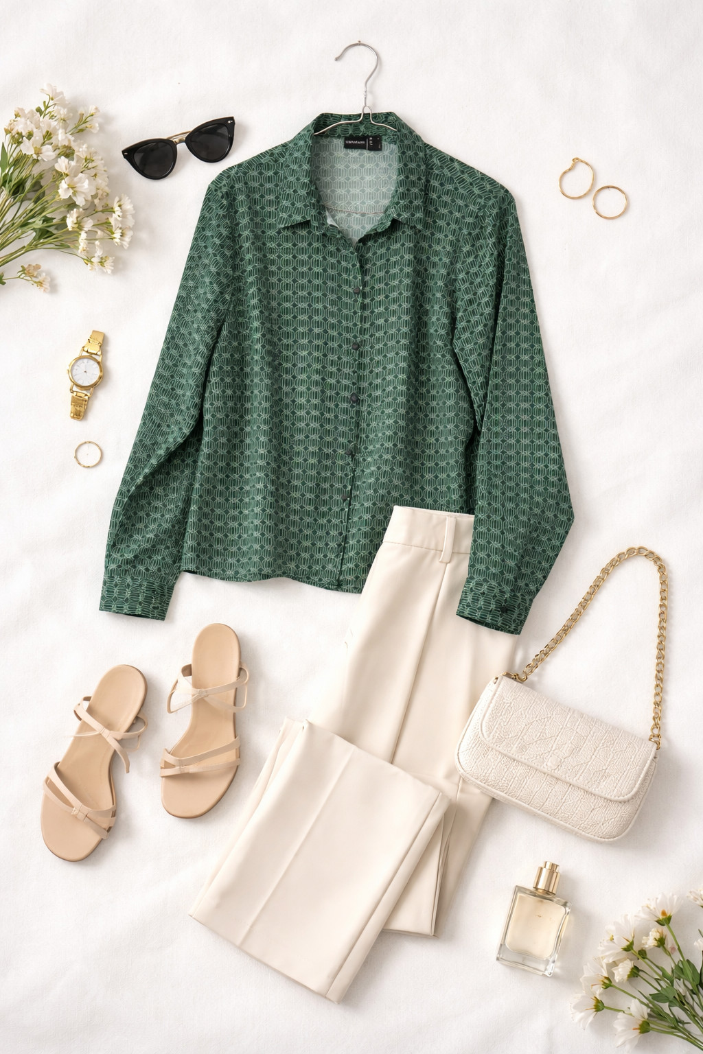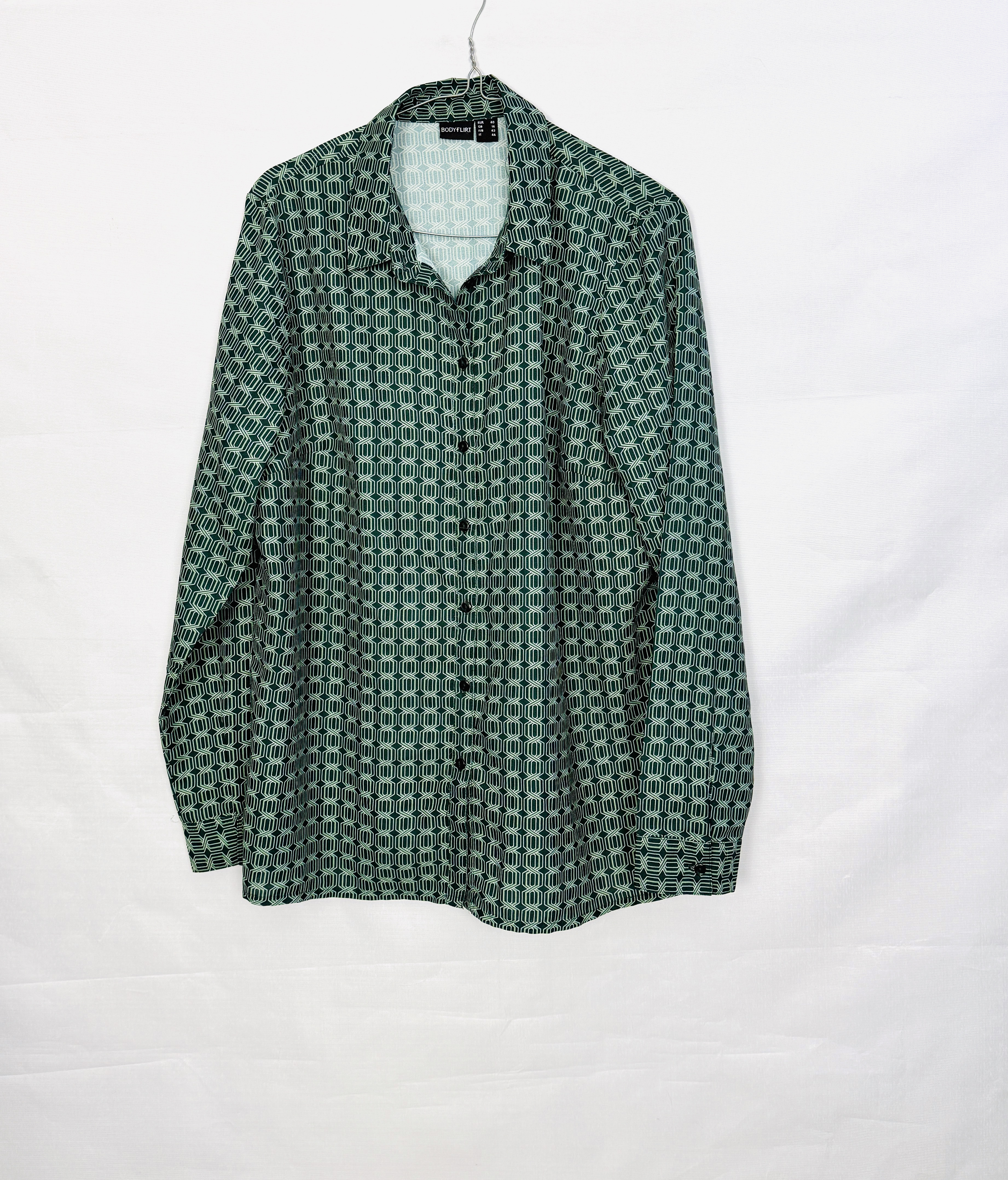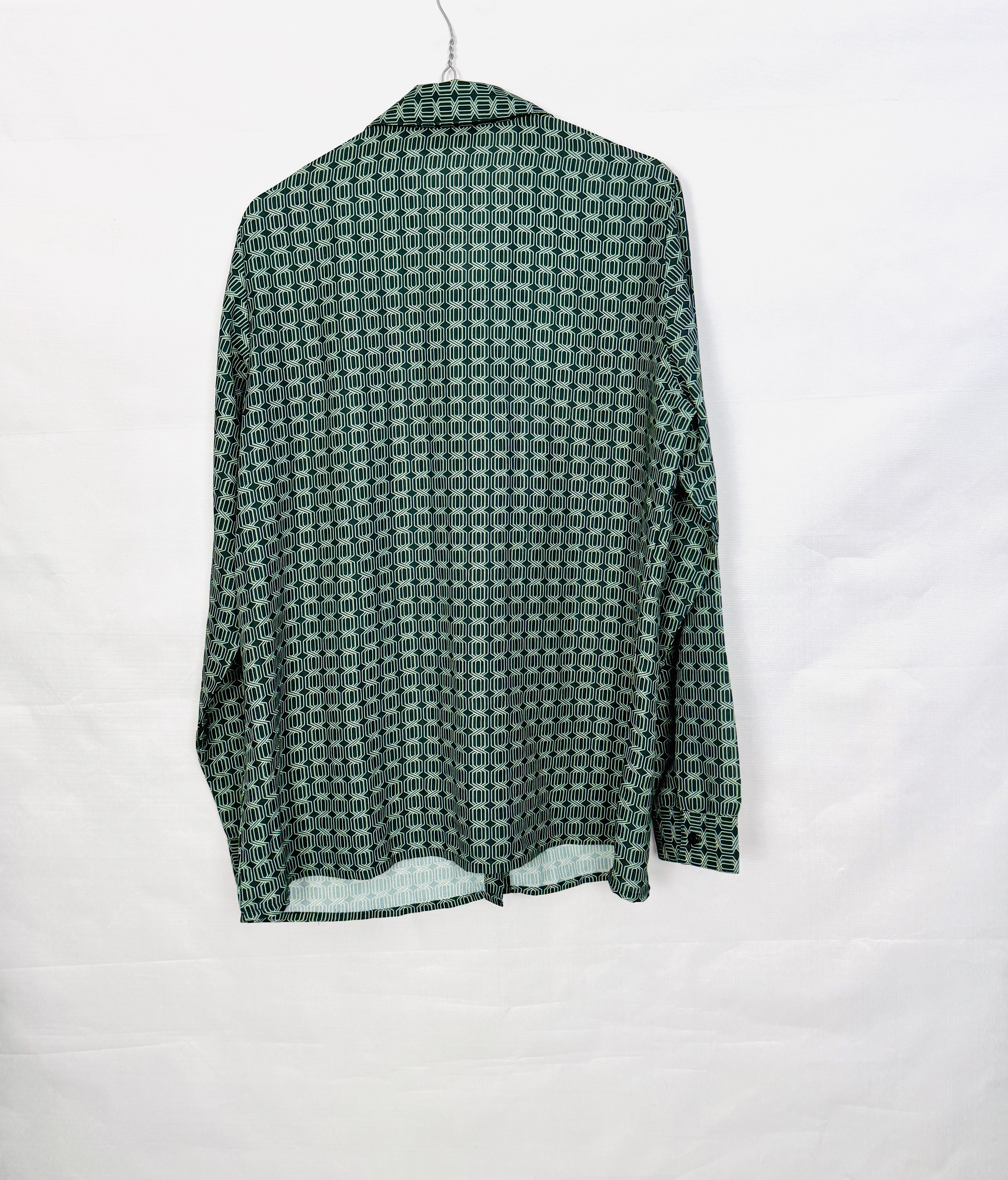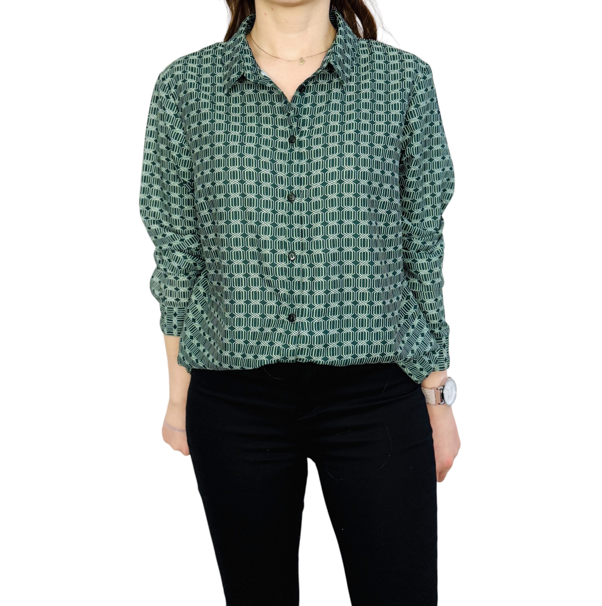 Ta koszula to połączenie kobiecej subtelności i nowoczesnej elegancji. Głęboka zieleń z regularnym, geometrycznym wzorem nadaje jej wyrafinowanego charakteru, który dobrze sprawdzi się zarówno w codziennych, jak i bardziej formalnych stylizacjach. Całość emanuje spokojem i łagodną energią, dzięki czemu koszula łatwo staje się bazą stylizacji podkreślającej szyk i gustowną prostotę.