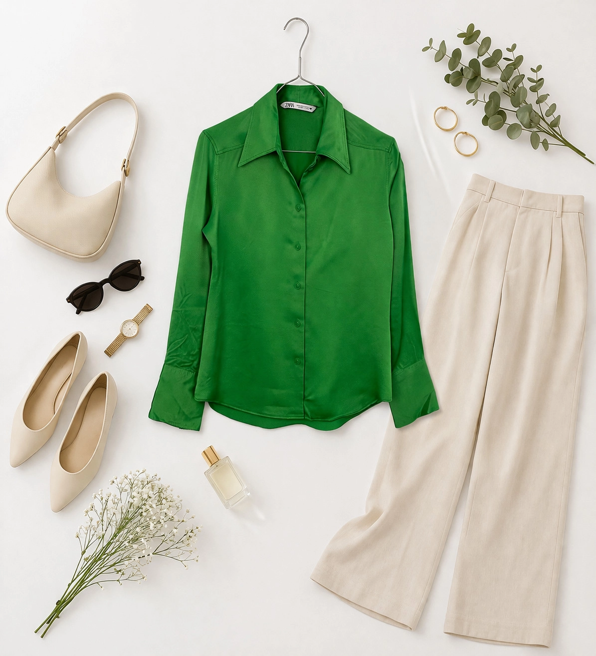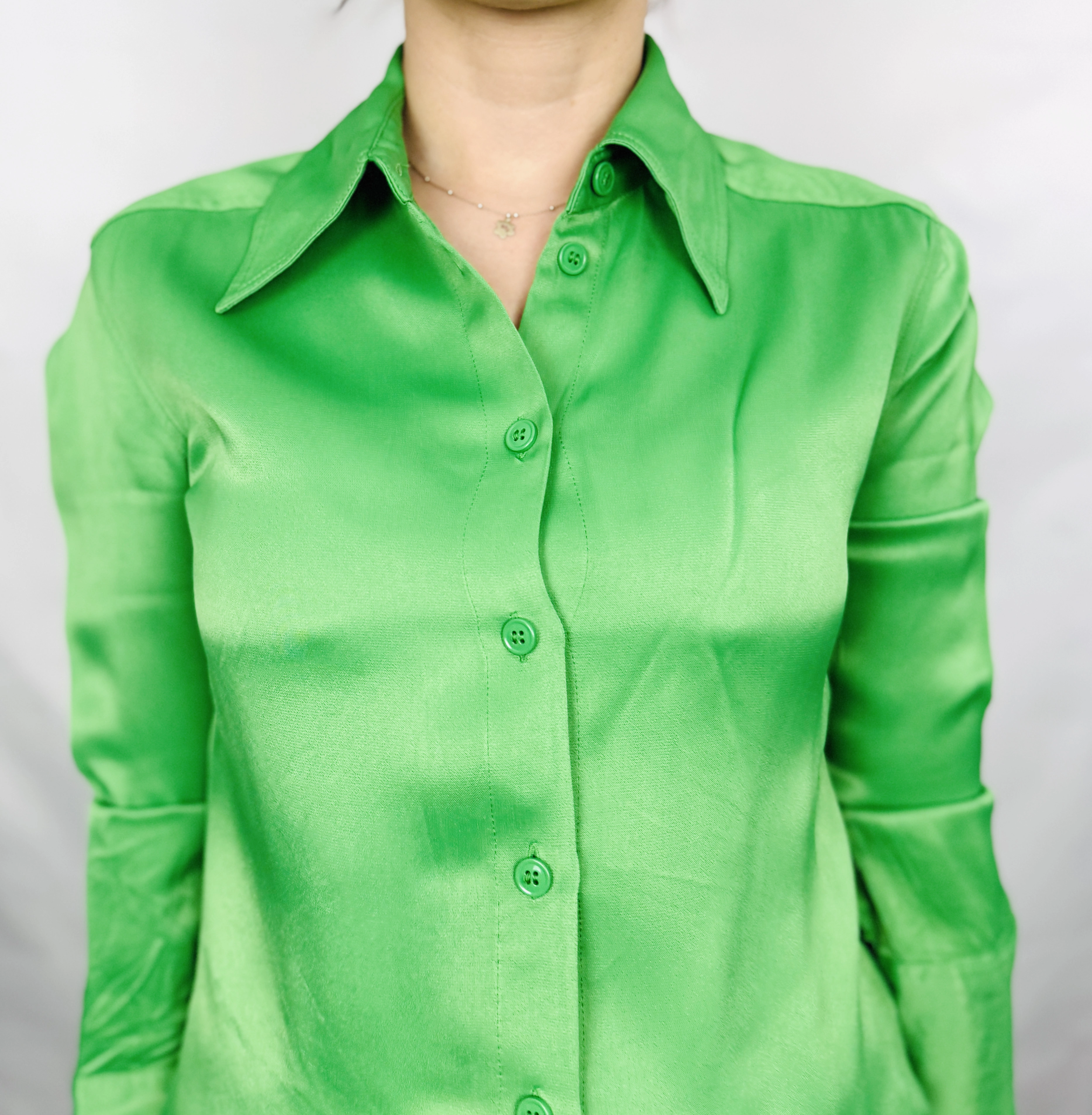 Ta zielona koszula to kwintesencja nowoczesnej elegancji i subtelnej wyrafinowanej kobiecości. Intensywny, soczysty odcień zieleni przyciąga wzrok i dodaje stylizacji świeżości oraz energii, jednocześnie zachowując klasyczny charakter. Satynowe wykończenie tkaniny nadaje całości luksusowego połysku, który pięknie odbija światło, podkreślając głębię koloru i delikatność materiału. To propozycja dla kobiet, które cenią sobie ponadczasowy styl z nutą wyrafinowania i chcą wyróżnić się w tłumie.