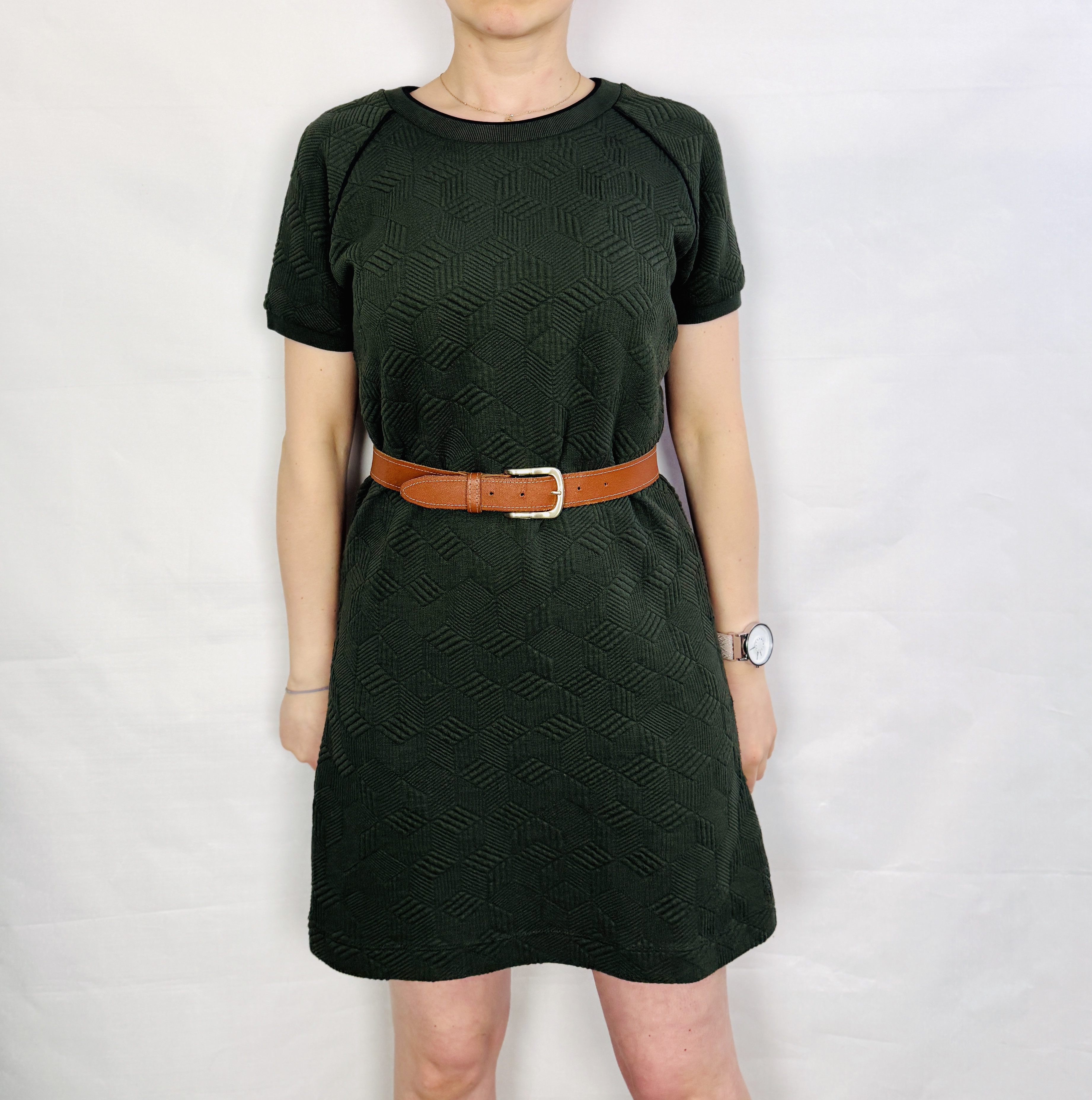 Dekolt jest okrągły i delikatnie wykończony, co łagodnie otwiera przestrzeń szyi i tworzy przyjazną, uniwersalną linię. Ramiona zarysowane są poprzez skośne przeszycia raglanowe, które dodają góry subtelnej dynamiki, a krótki rękaw kończy się ściągaczem, tworząc uporządkowaną, lekko sportową linię ręki. Tułów ma niezbyt dopasowany, raczej swobodny charakter z delikatnym wcięciem w talii, które porządkuje proporcje i przechodzi w prostą, lekko rozkloszowaną spódnicę o długości sięgającej tuż nad kolano — to rozwiązanie daje ładny ruch i swobodę przy chodzeniu, a jednocześnie zachowuje schludny, estetyczny kontur.