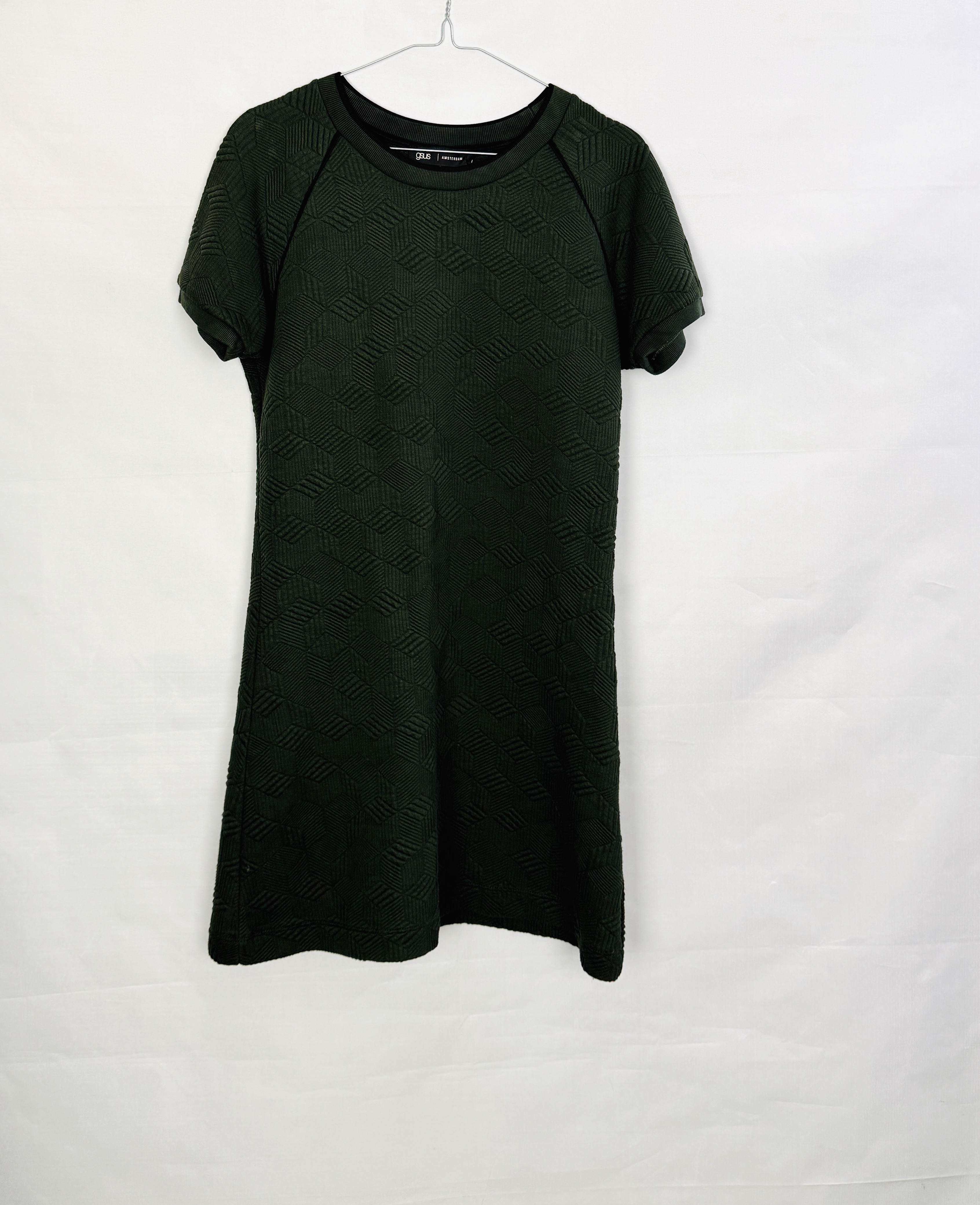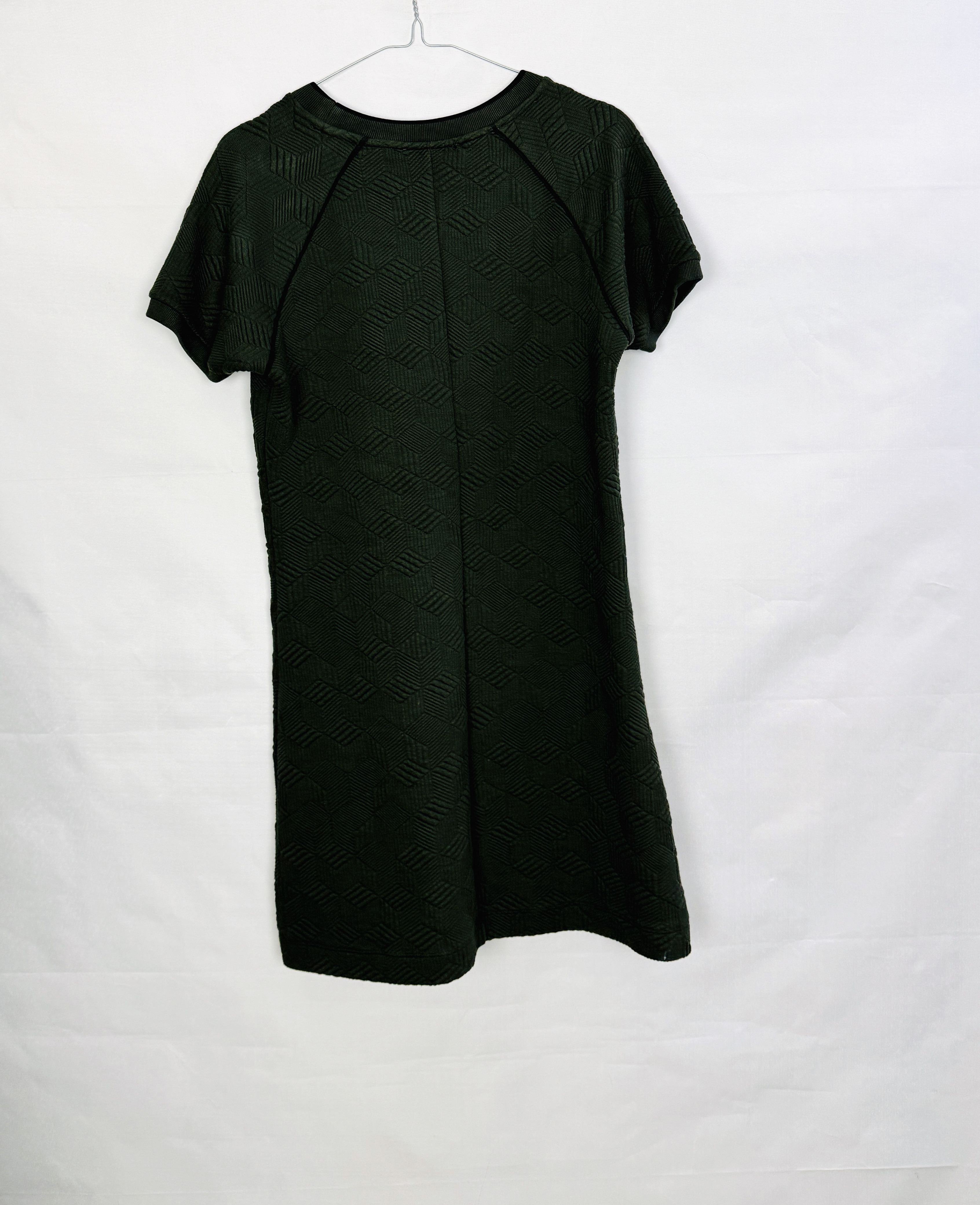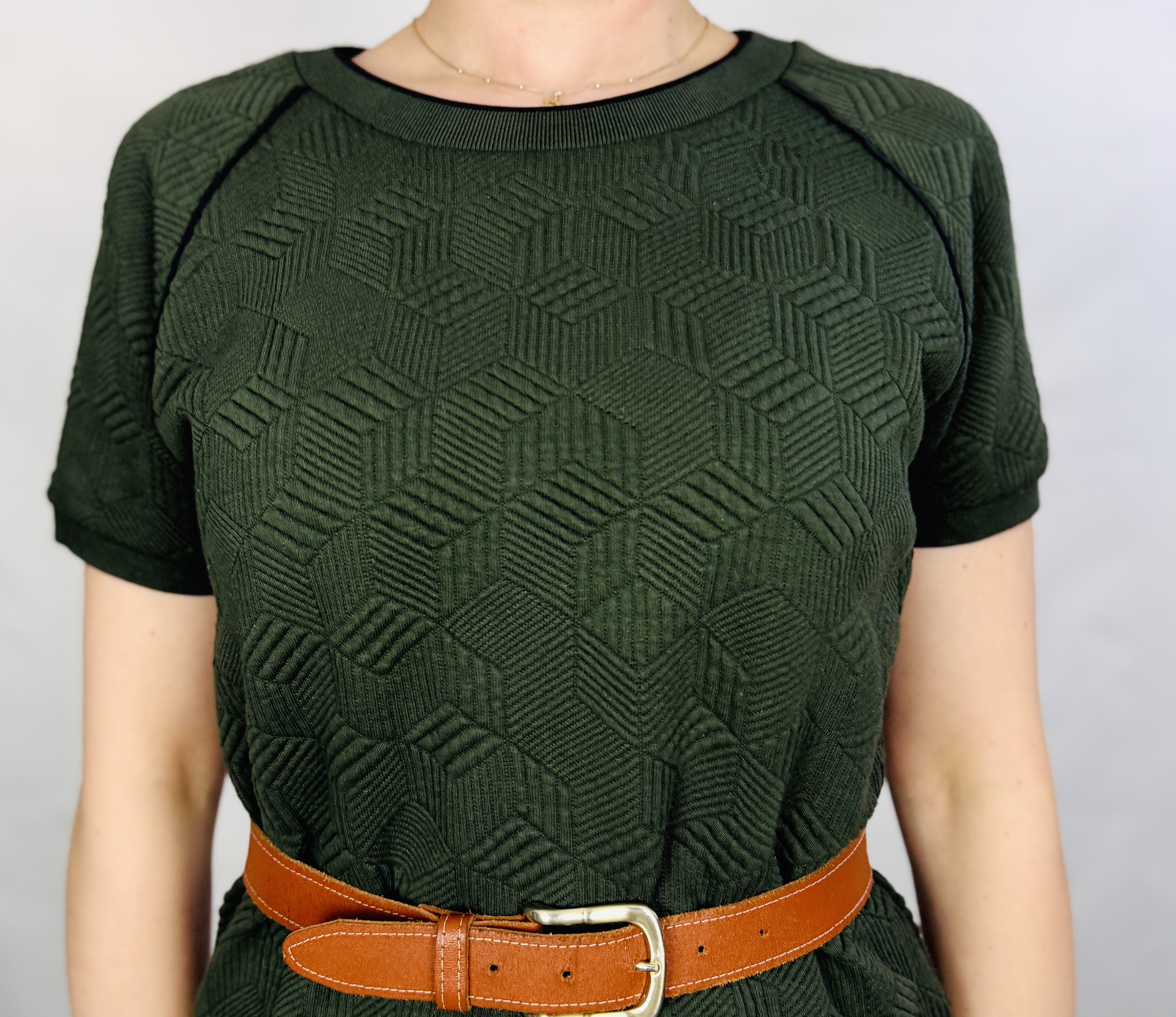 Ta sukienka emanuje spokojną, wyrafinowaną elegancją — głęboki, zielony odcień w połączeniu z subtelną, geometryczną fakturą nadaje kreacji nowoczesnego, ale spokojnego charakteru. Projekt wypada naturalnie kobieco: to propozycja, która łączy komfort dzianiny z uporządkowaną sylwetką, oferując jednocześnie dyskretny, ale wyraźny akcent dekoracyjny. Fason ma w sobie nutę klasyki i lekko sportowego porządku, dzięki czemu sprawdzi się w wielu sytuacjach — od zadań dnia codziennego po spotkania wymagające nieco bardziej dopracowanego stroju.