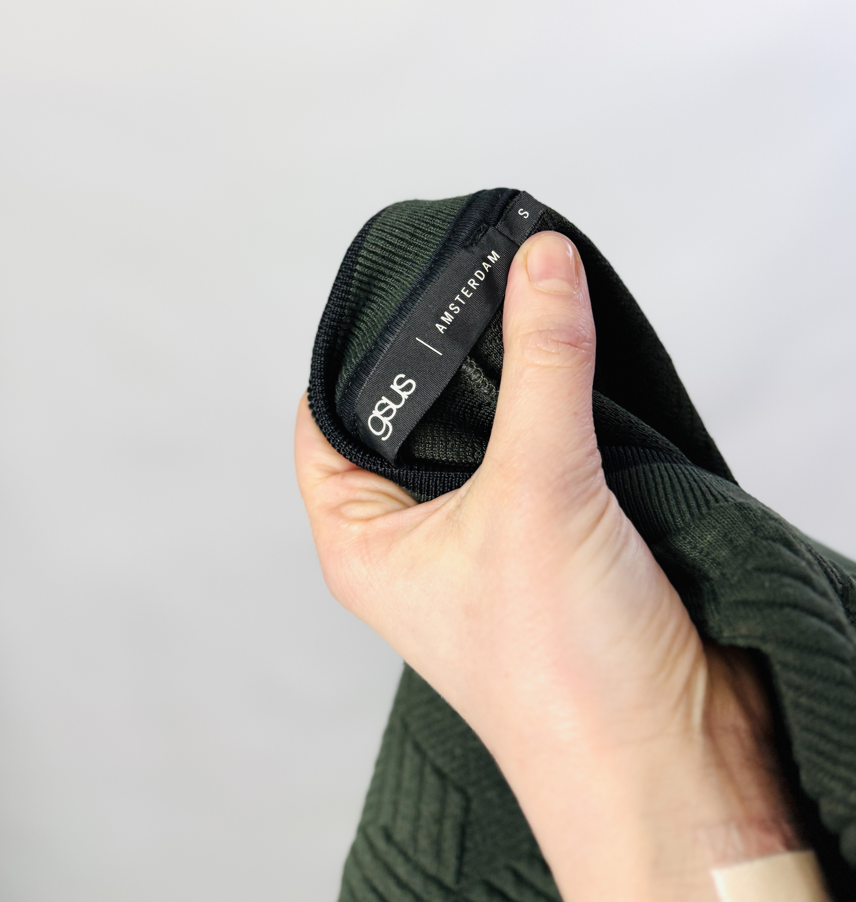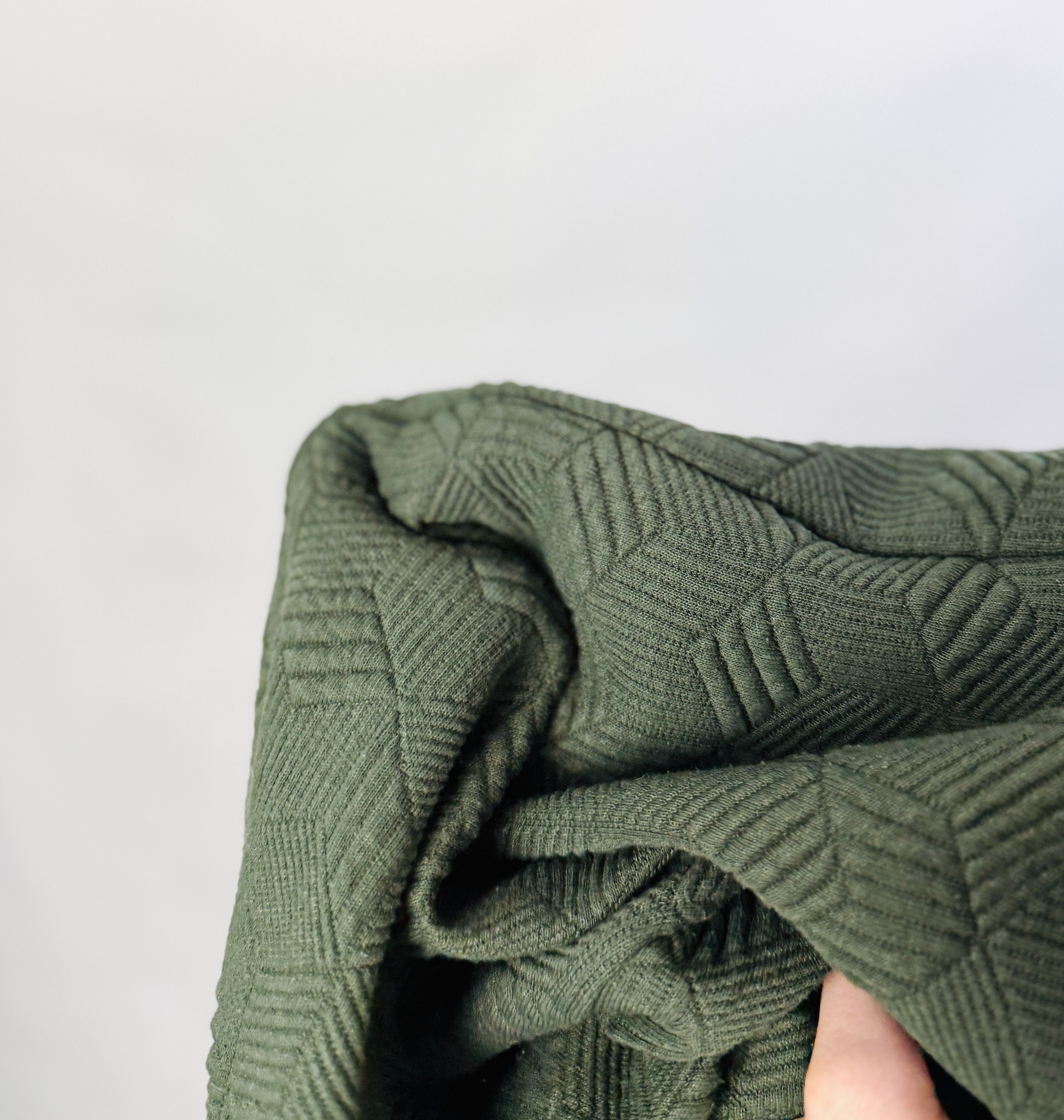 Materiał prezentuje się jako nieco grubszy, mięsisty splot dzianinowy o wyraźnej, trójwymiarowej strukturze — geometryczne wzory tworzą rytmiczne, niemal płaskorzeźbowe pole na powierzchni tkaniny. Dzięki temu sukienka trzyma formę, delikatnie otula sylwetkę i nie wymaga nadmiernego dopasowania, co daje komfort cieplny i poczucie lekkości noszenia. Powierzchnia tkaniny ma uporządkowany, matowy wygląd, a faktura dodaje całości głębi i interesującego charakteru, nie konkurując jednocześnie z prostotą kroju.