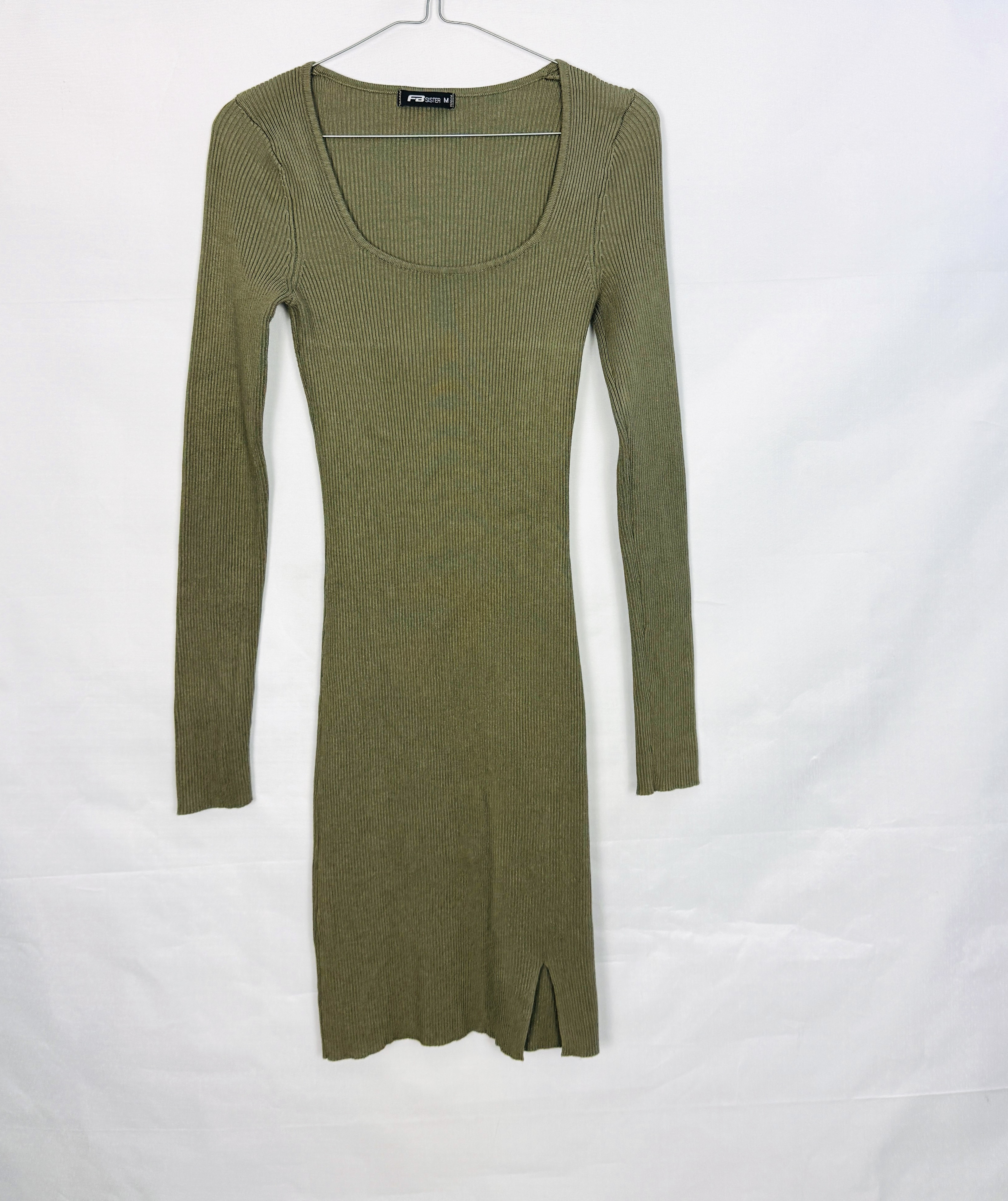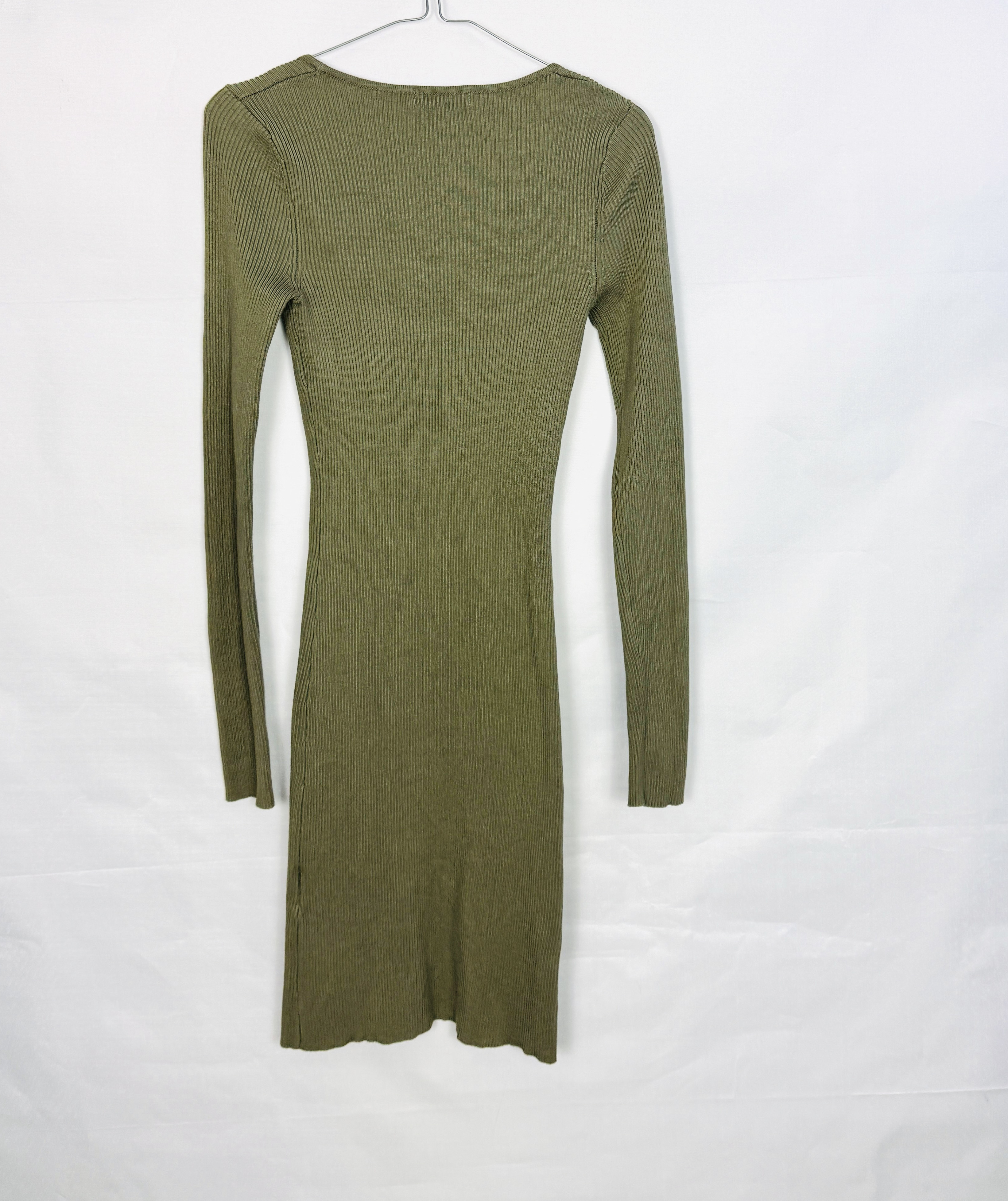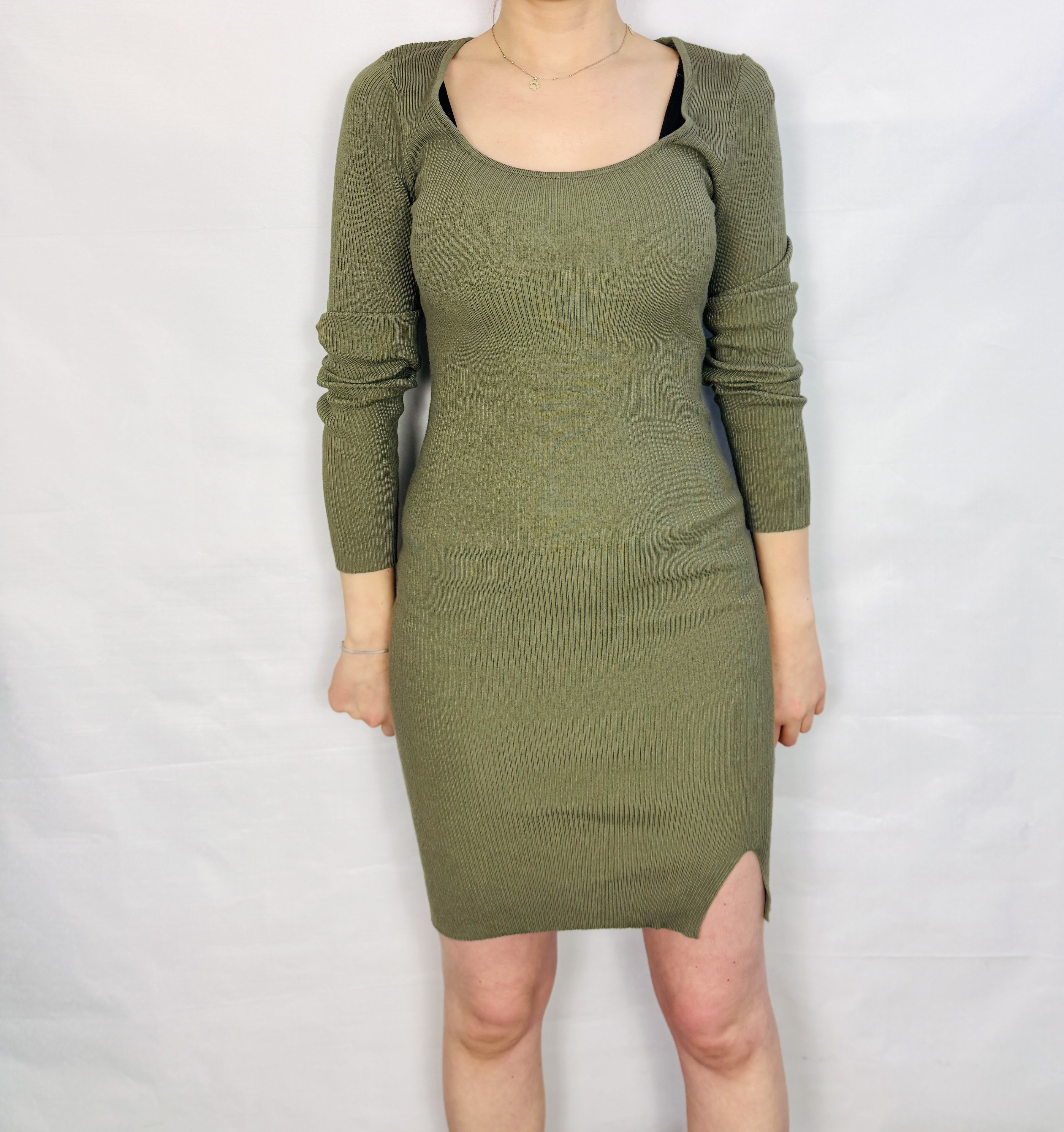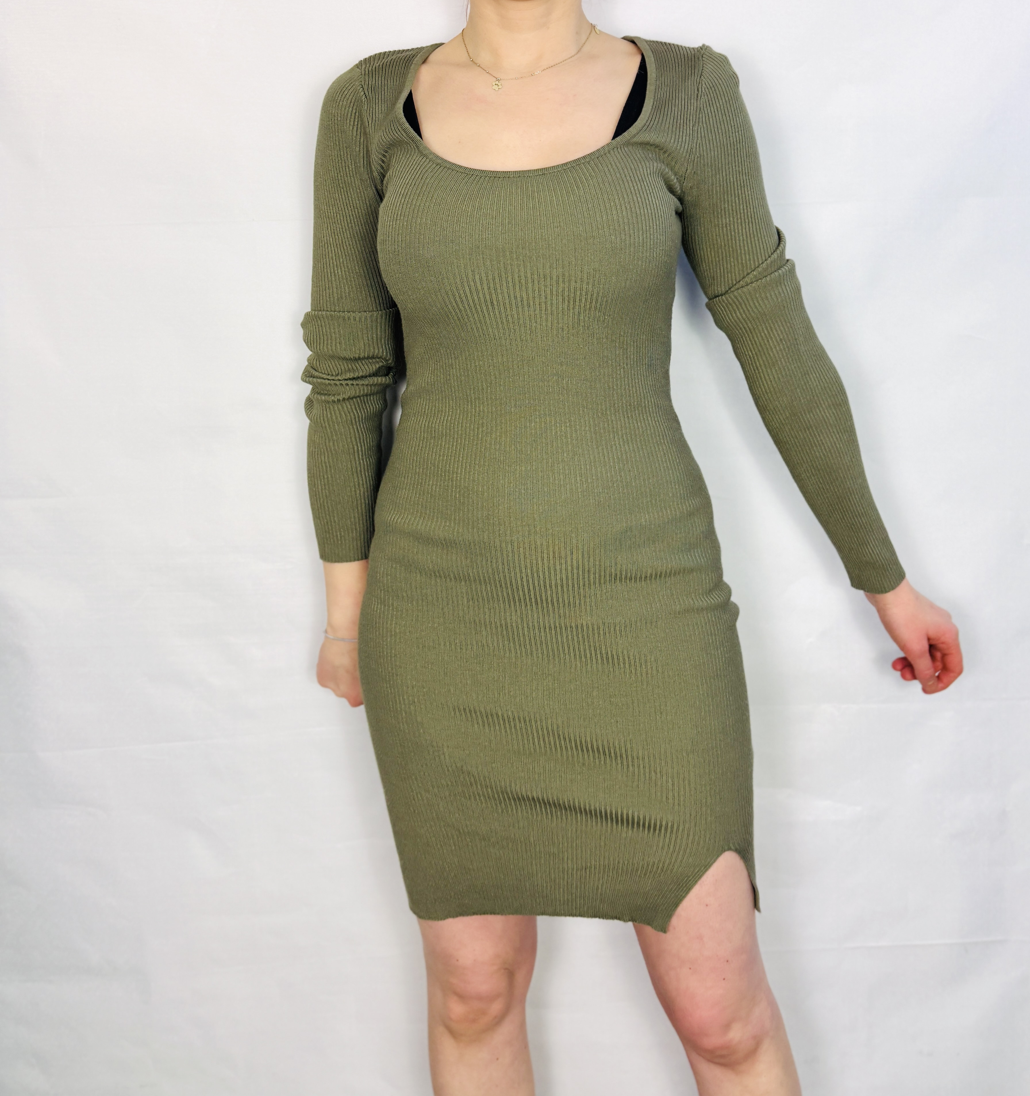 Ta sukienka to esencja kobiecej prostoty z nutą nowoczesnej zmysłowości — głęboki, oliwkowy odcień i subtelna prążkowana faktura nadają jej naturalnego ciepła i jednocześnie eleganckiej prezencji. Konstrukcja jest oszczędna i przemyślana: prosta forma spotyka się tu z dopasowaniem, które emanuje pewnością siebie, a jednocześnie zachowuje komfort noszenia. To model dla osób lubiących minimalistyczne akcenty, które jednak przyciągają uwagę detalem i świetnym wykończeniem.