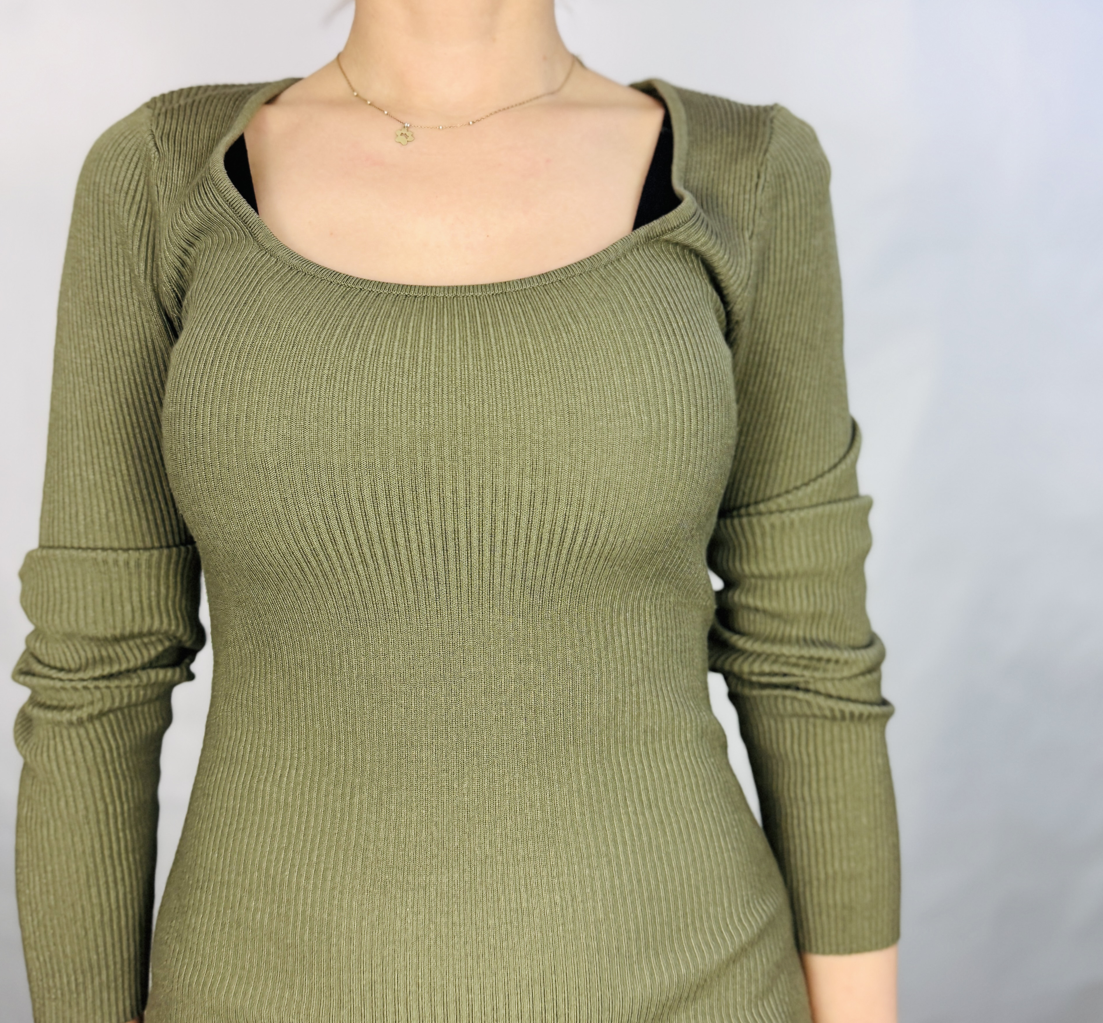 Krój jest mocno dopasowany — sukienka opinająca sylwetkę podkreśla linię tułowia i bioder, prowadząc ku kolanom w klasycznym, ołówkowym konturze. Dekolt ma kształt głębokiego, zaokrąglonego wycięcia, które ładnie eksponuje obojczyki i nadaje górze subtelnej lekkości. Rękawy są długie i przylegające, z delikatnym marszczeniem na przedramionach, co wprowadza przyjemny rytm i miękkość w całej formie. Na dole widoczne jest niewielkie, asymetryczne rozcięcie przy przedniej krawędzi, które dodaje sukience zmysłowego, swobodnego akcentu i ułatwia poruszanie się.