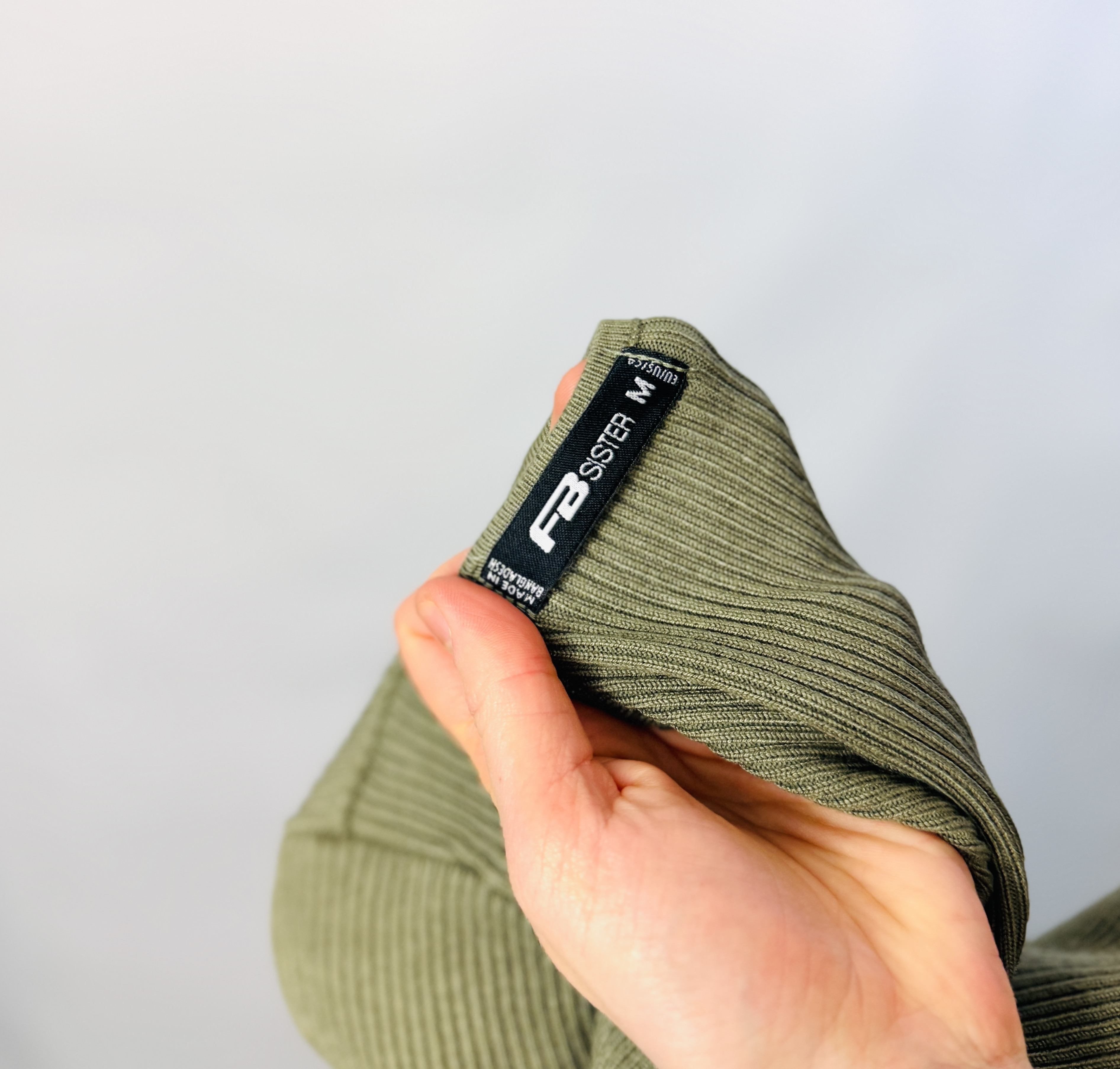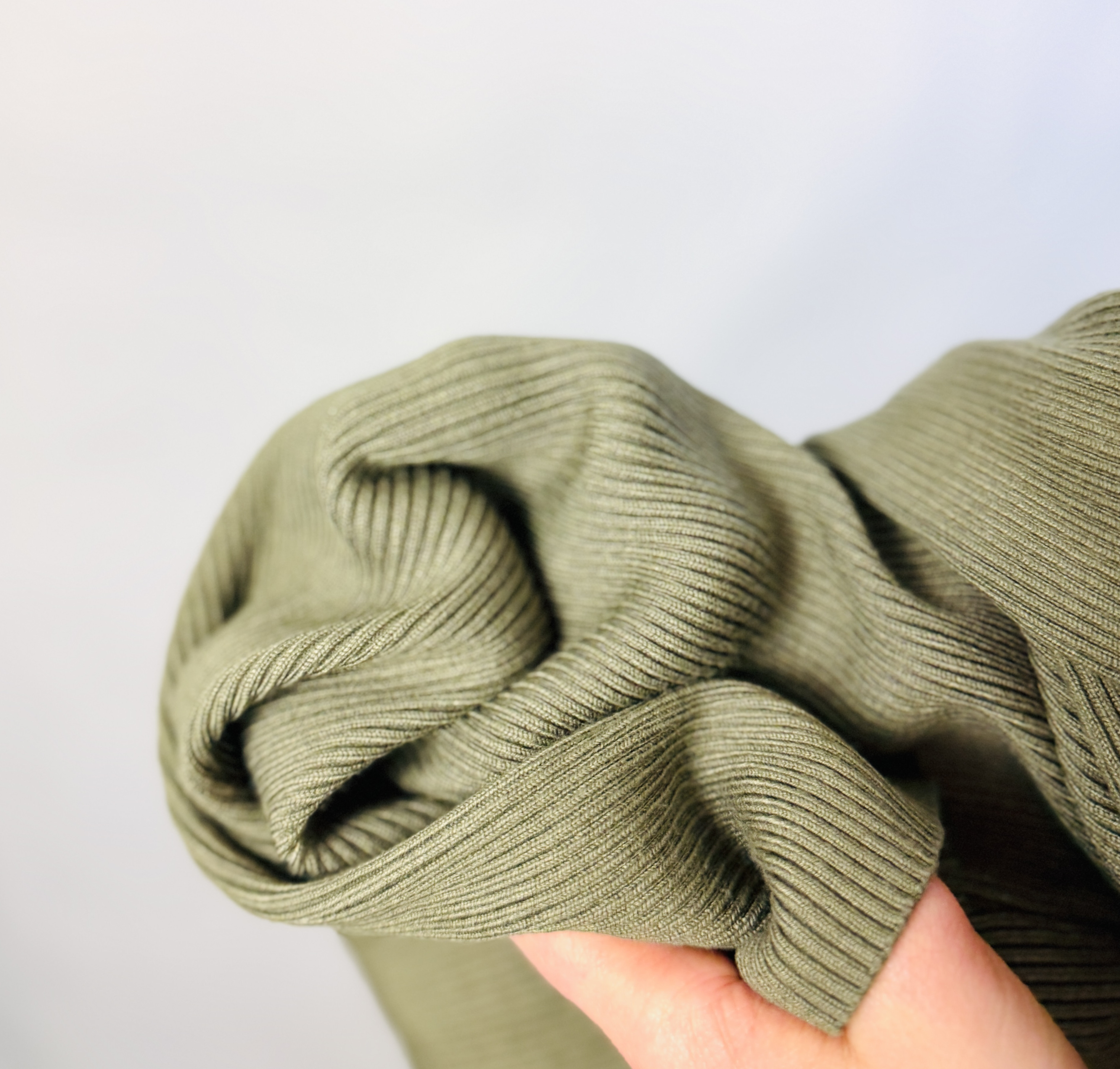 Materiał prezentuje się jako gęsto prążkowana dzianina o matowym wykończeniu — tkanina wygląda na elastyczną i dobrze dopasowującą się do kształtów, miękko układającą się na ciele. Prążkowanie nadaje powierzchni interesującej tekstury i optycznie modeluje sylwetkę, a jednocześnie zapewnia komfort noszenia dzięki sprężystości splotu. Wykończenie jest schludne i pozbawione zbędnych zdobień, co podkreśla minimalistyczny charakter projektu.