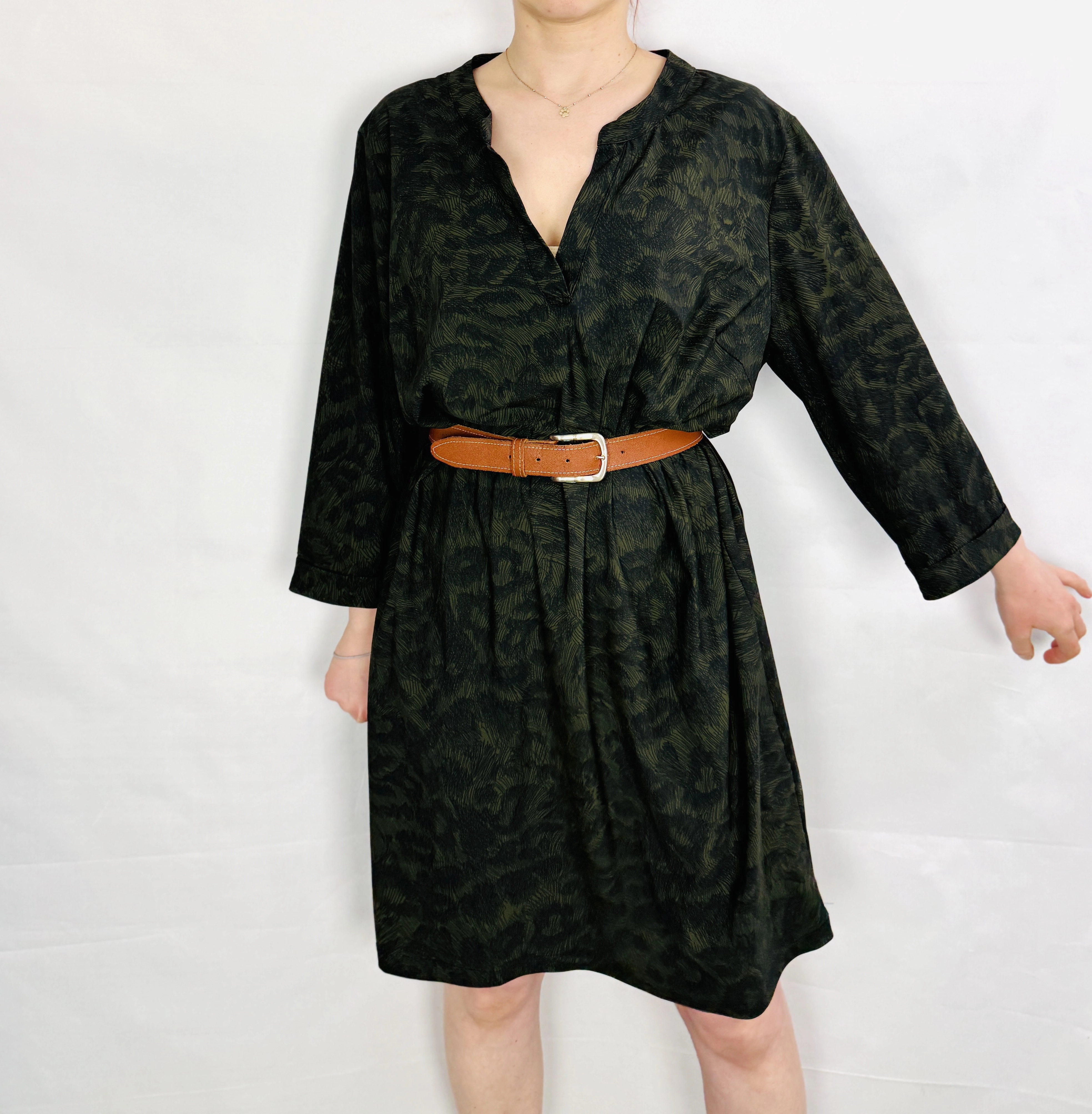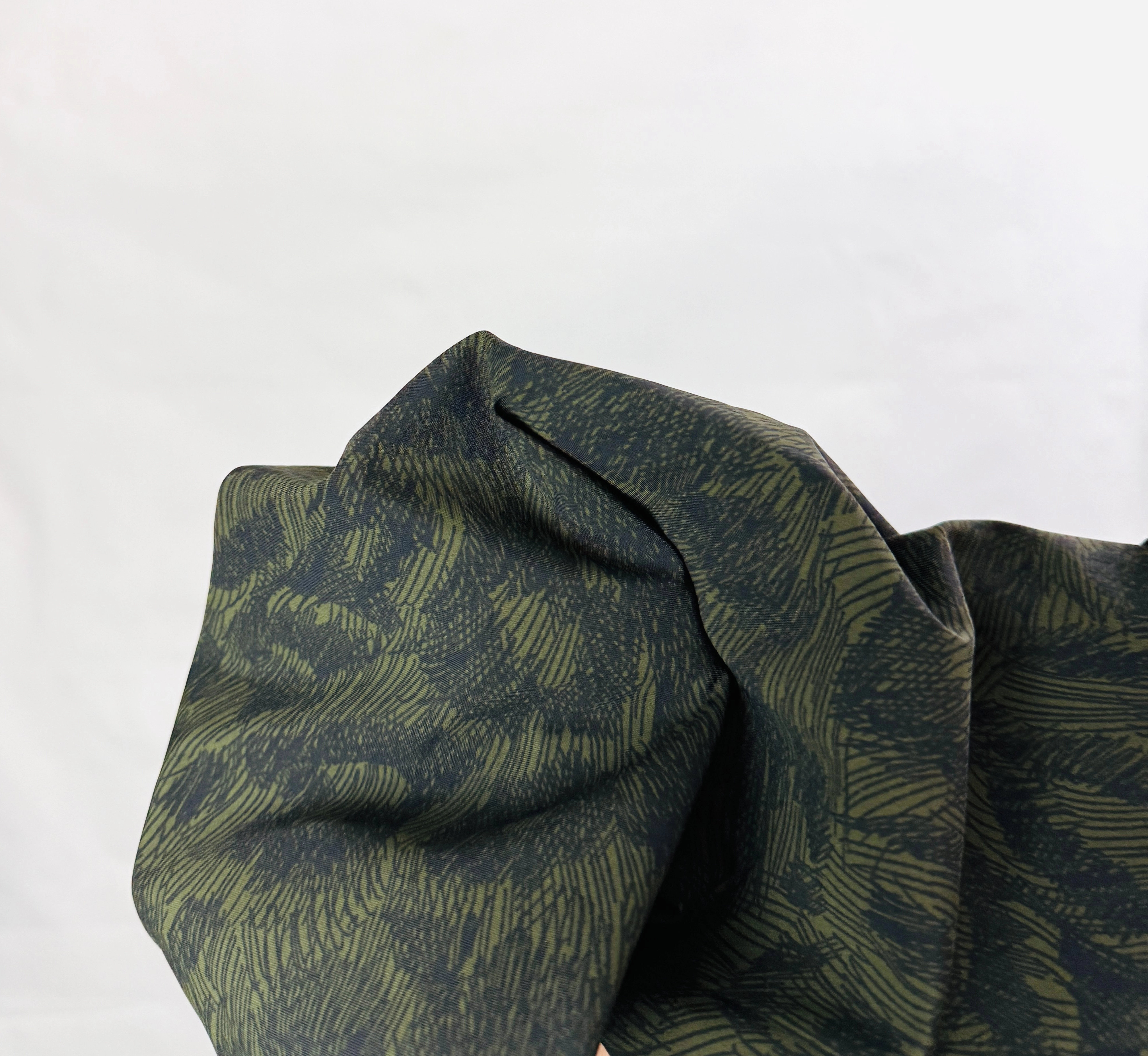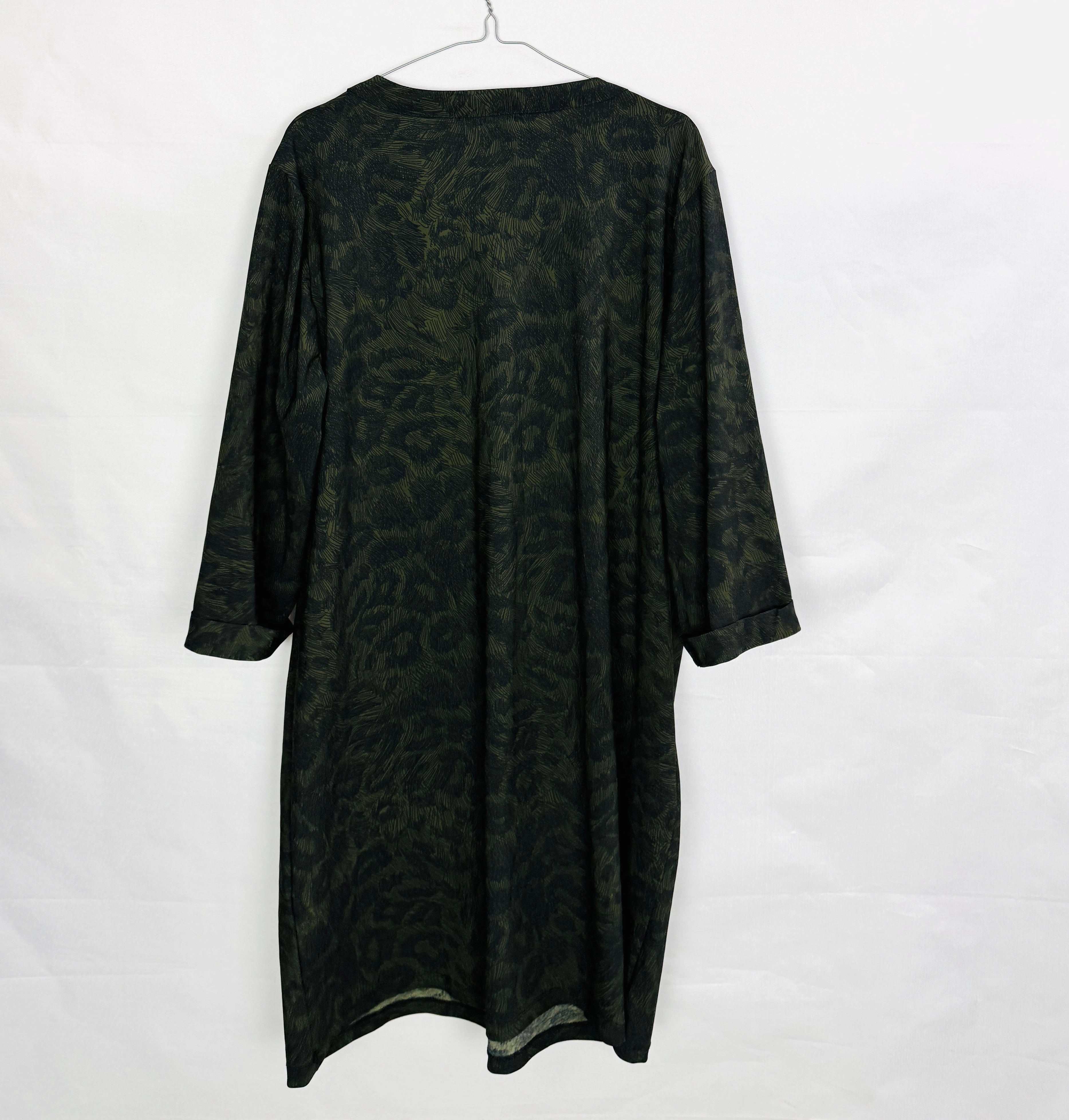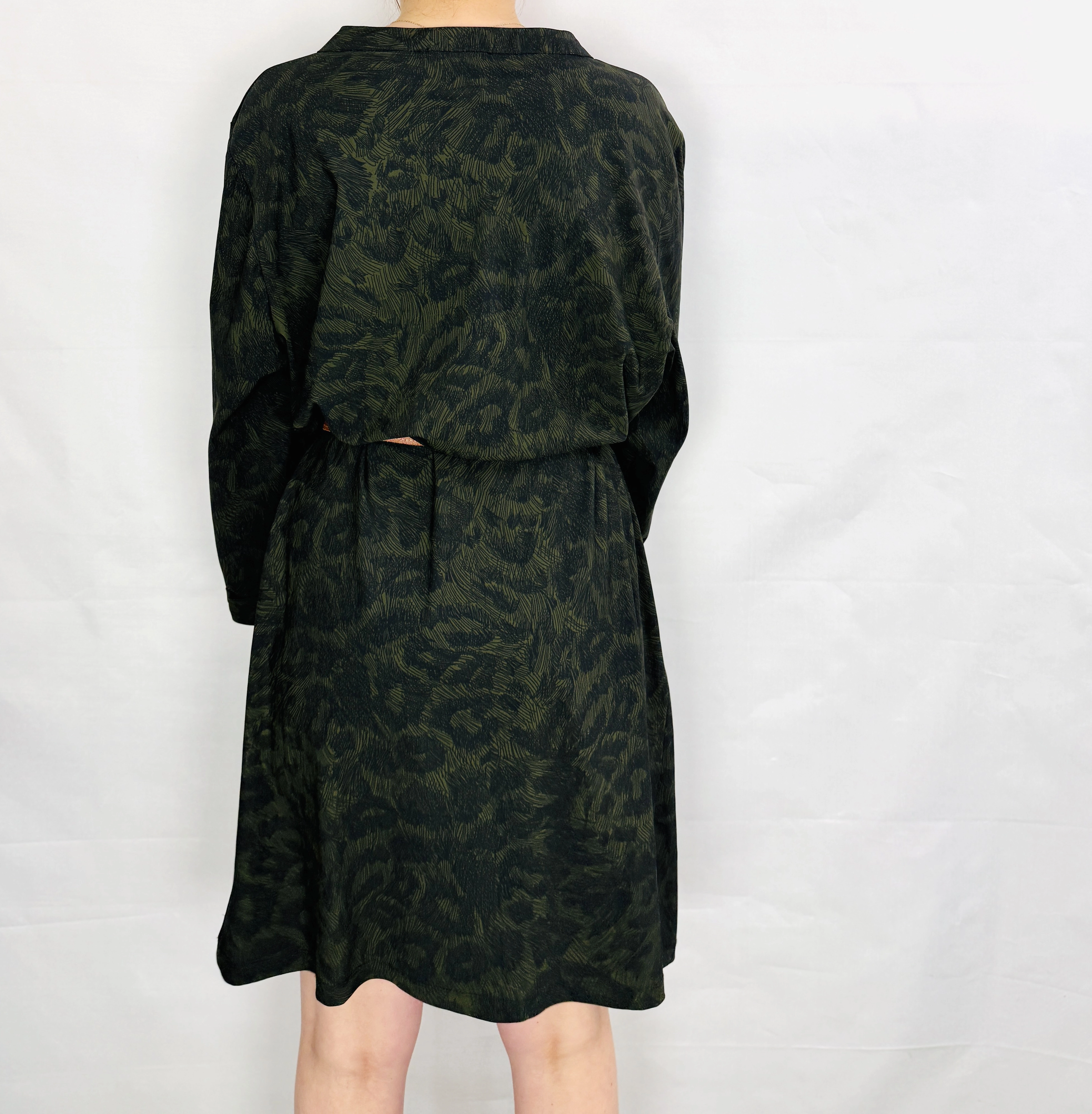 To sukienka o nastroju naturalnej elegancji — głęboki zielony odcień przeplatany ciemniejszym, niemal pędzlowym wzorem nadaje jej wyrafinowanego, lekko tajemniczego charakteru. Projekt łączy prostotę kroju z delikatną dekoracyjnością nadruku, co sprawia, że sukienka jest zarazem uniwersalna i pełna osobowości. Ma w sobie kobiecą łagodność i spokojny, dzienny szyk, dzięki czemu sprawdzi się w wielu sytuacjach — od spotkań w ciągu dnia po bardziej stonowane wyjścia wieczorem.