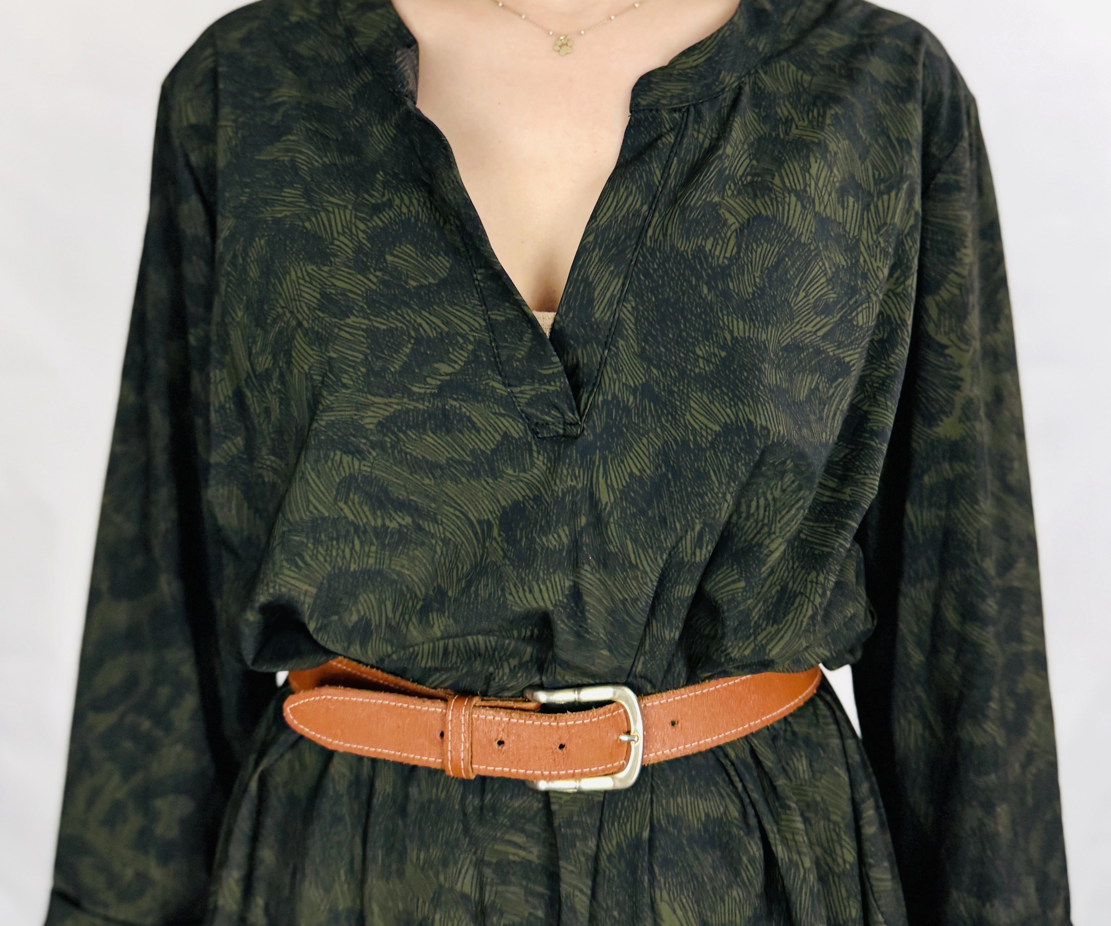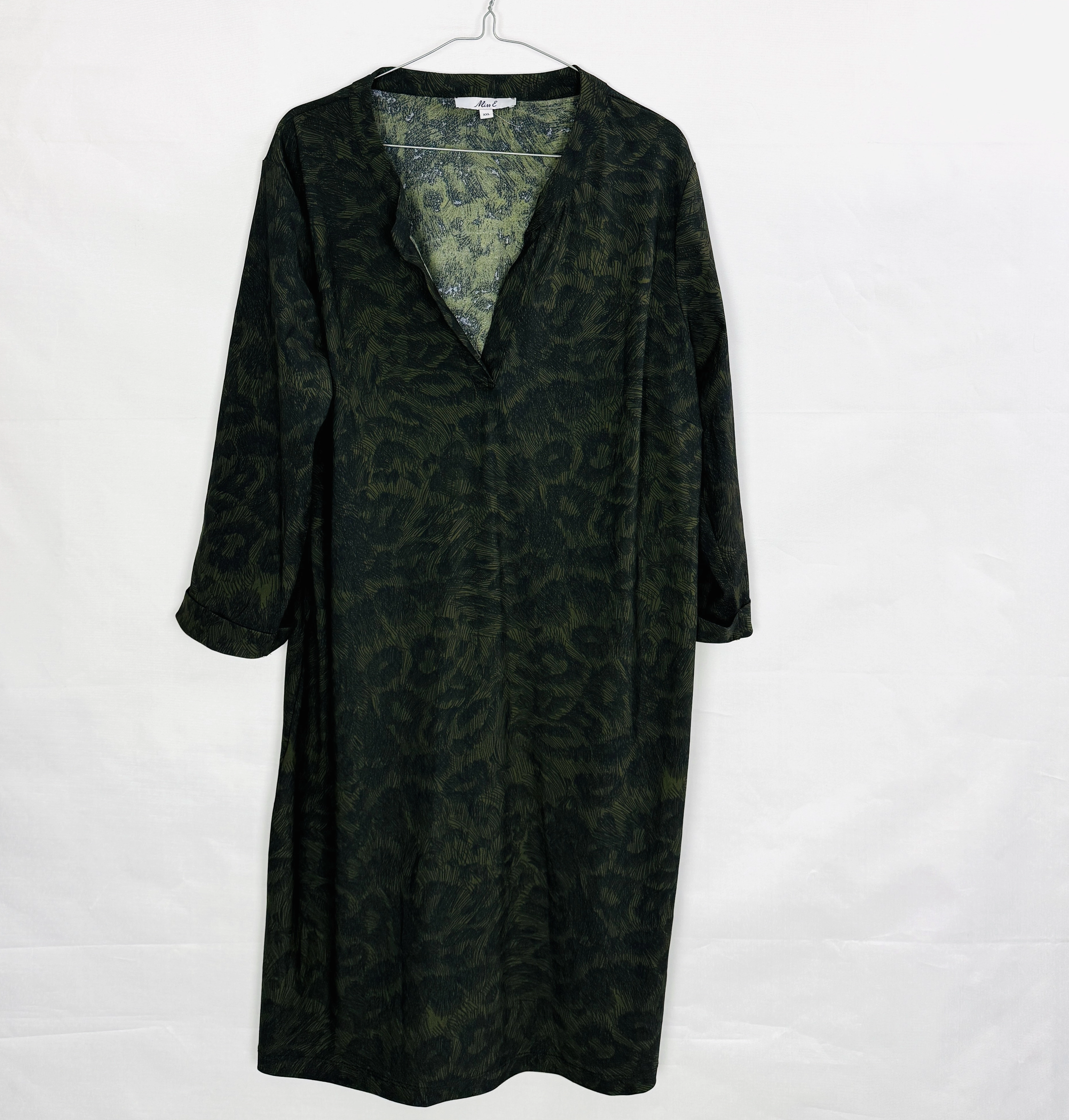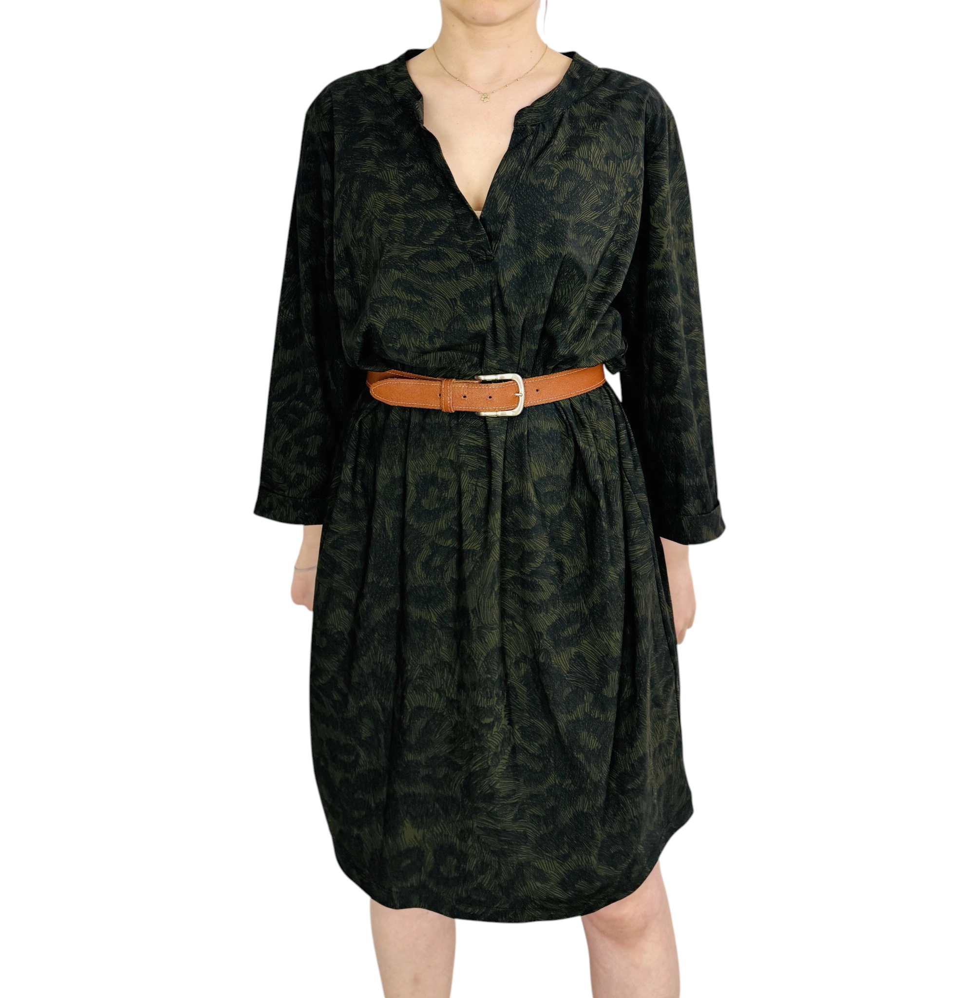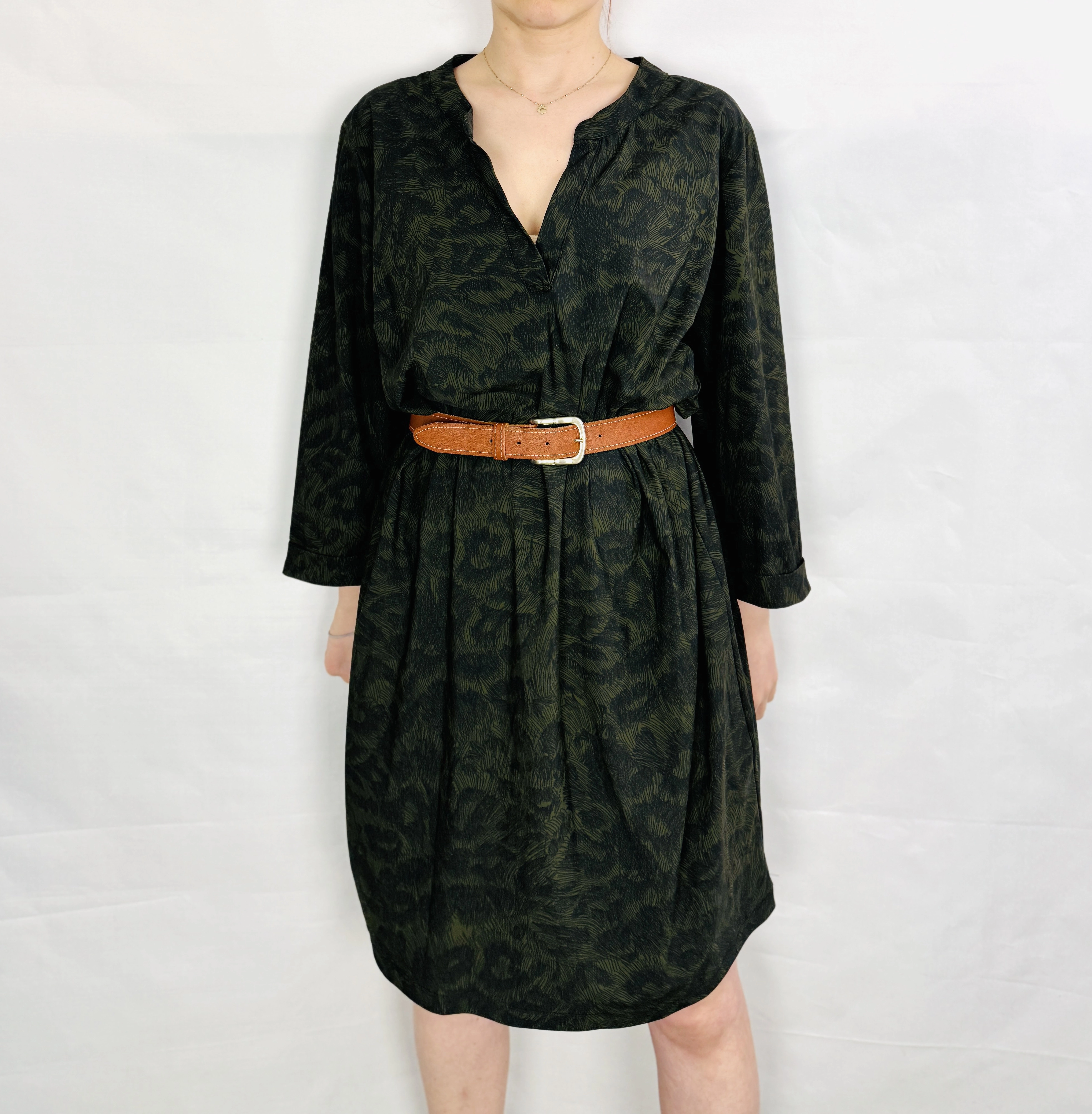 To sukienka o nastroju naturalnej elegancji — głęboki zielony odcień przeplatany ciemniejszym, niemal pędzlowym wzorem nadaje jej wyrafinowanego, lekko tajemniczego charakteru. Projekt łączy prostotę kroju z delikatną dekoracyjnością nadruku, co sprawia, że sukienka jest zarazem uniwersalna i pełna osobowości. Ma w sobie kobiecą łagodność i spokojny, dzienny szyk, dzięki czemu sprawdzi się w wielu sytuacjach — od spotkań w ciągu dnia po bardziej stonowane wyjścia wieczorem.