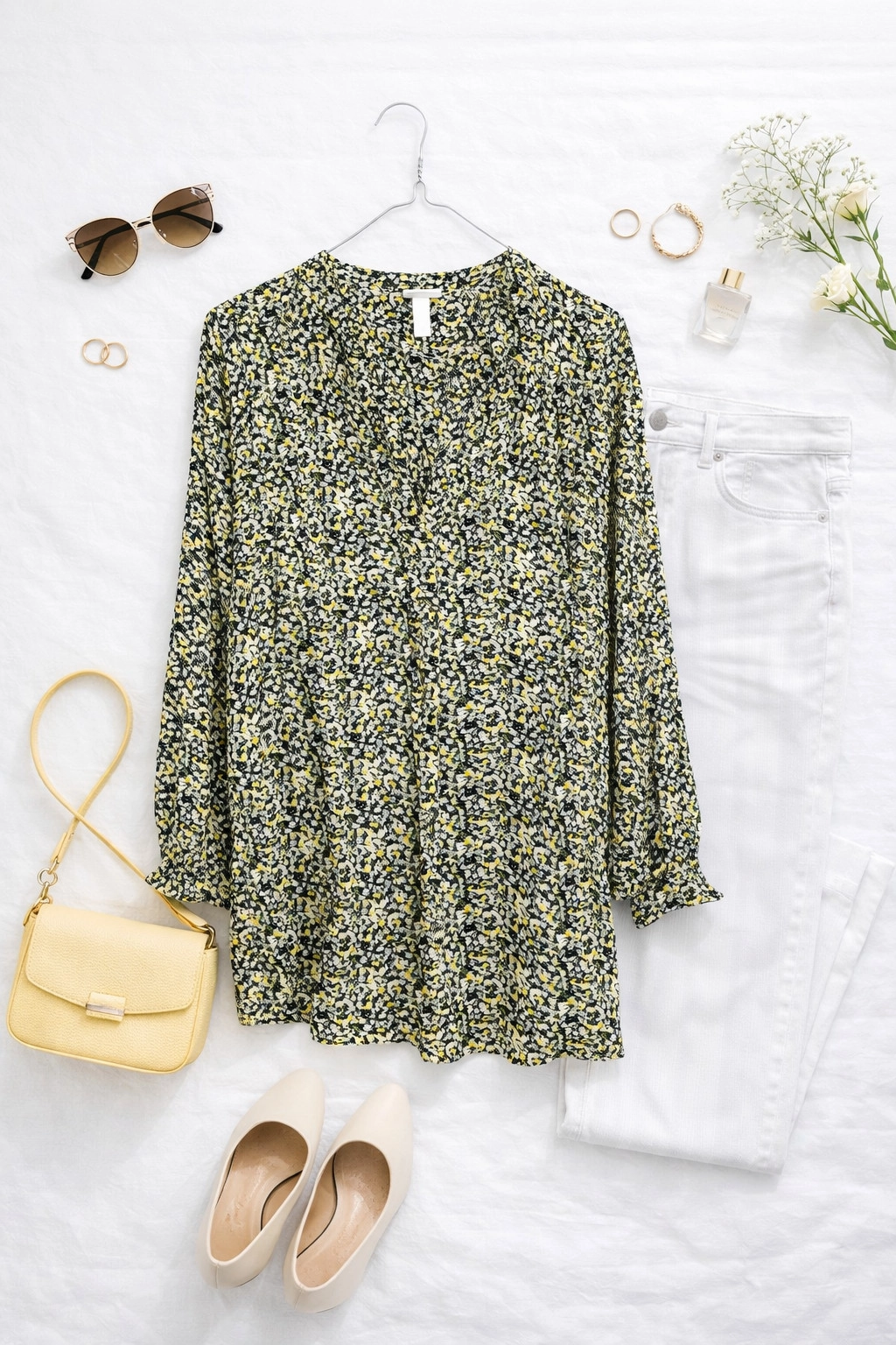 Długość całkowita tuniki sięga za linię bioder, z charakterystycznym, lekko wydłużonym tyłem, co czyni ją niezwykle ustawny elementem stroju. Doskonale prezentuje się w zestawieniu z dopasowanymi czarnymi spodniami lub legginsami, tworząc nowoczesną i bardzo wygodną sylwetkę typu "slim bottom, loose top". Można ją również z powodzeniem łączyć z klasycznymi jeansami i sandałkami, co nada zestawowi wakacyjnego, luźnego charakteru. Połączenie zieleni, żółci i bieli daje szerokie możliwości w doborze dodatków – od delikatnej złotej biżuterii po słomkowe akcesoria. Jest to idealny wybór na codzienne spacery, spotkania z bliskimi czy do pracy, kiedy pragniesz połączyć profesjonalizm z nutą romantycznej swobody.
