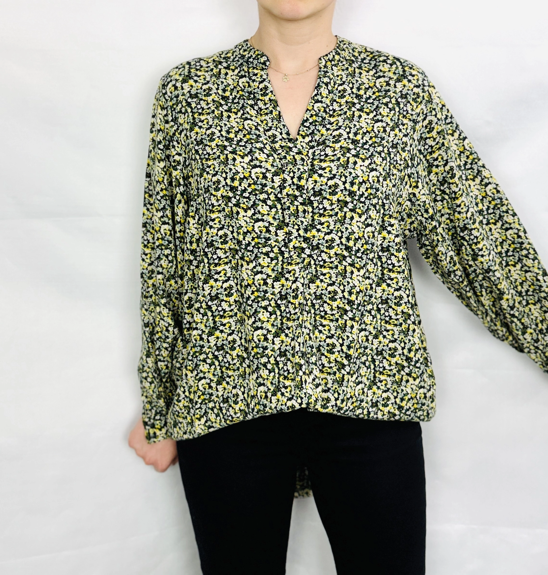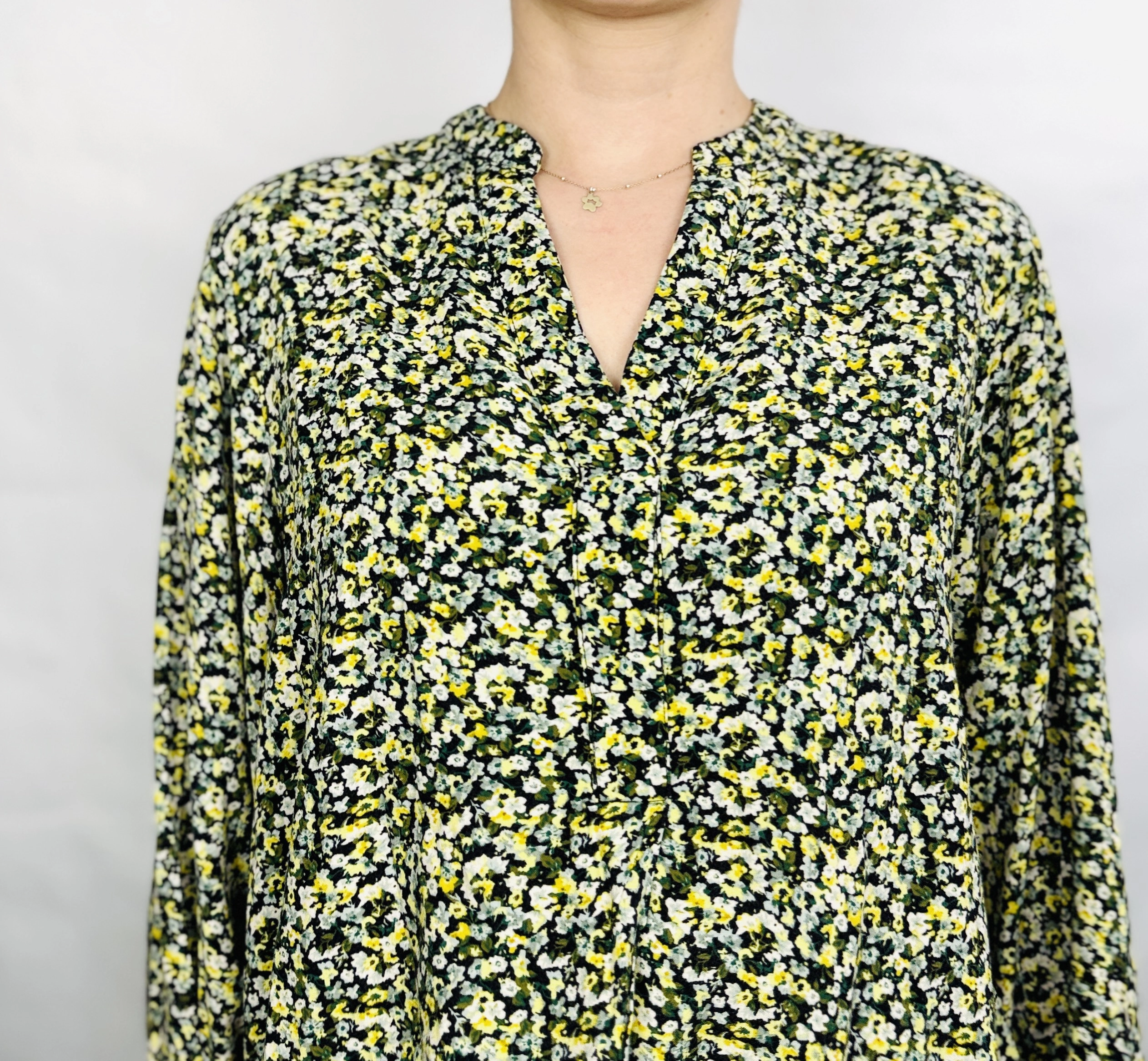 Ta zielona tunika to kwintesencja wiosennej świeżości i swobodnej elegancji, która wnosi do kobiecej garderoby powiew naturalności i lekkości. Całość materiału pokrywa niezwykle gęsty, malowniczy wzór drobnych kwiatuszków w odcieniach bieli, cytrynowej żółci i głębokiej czerni, co tworzy harmonijną, a zarazem wyrazistą kompozycję. To ubranie, które emanuje radosną energią i dziewczęcym wdziękiem, stanowiąc idealną propozycję dla kobiet, które cenią sobie stylowy wygląd w połączeniu z maksymalnym komfortem noszenia.