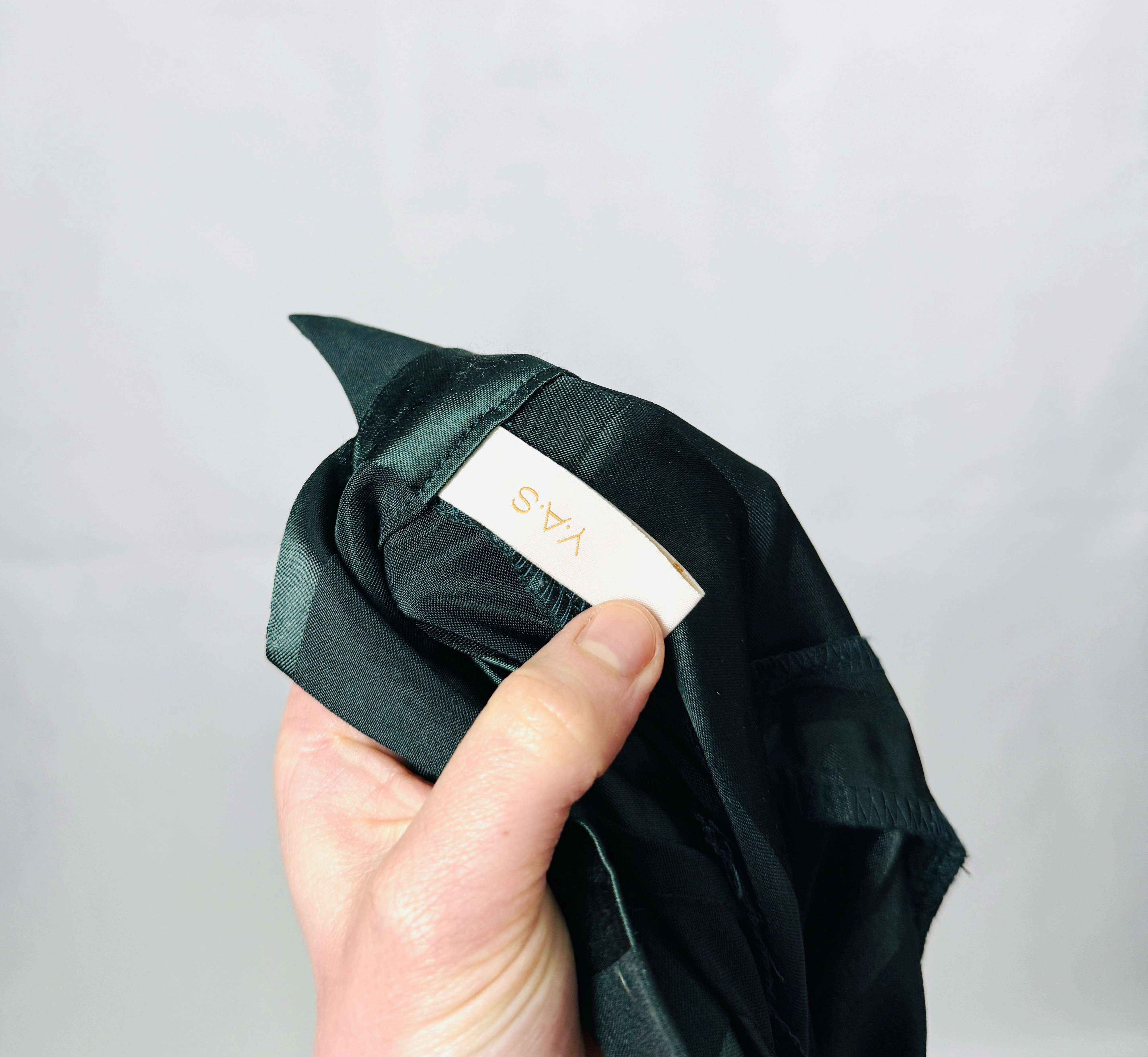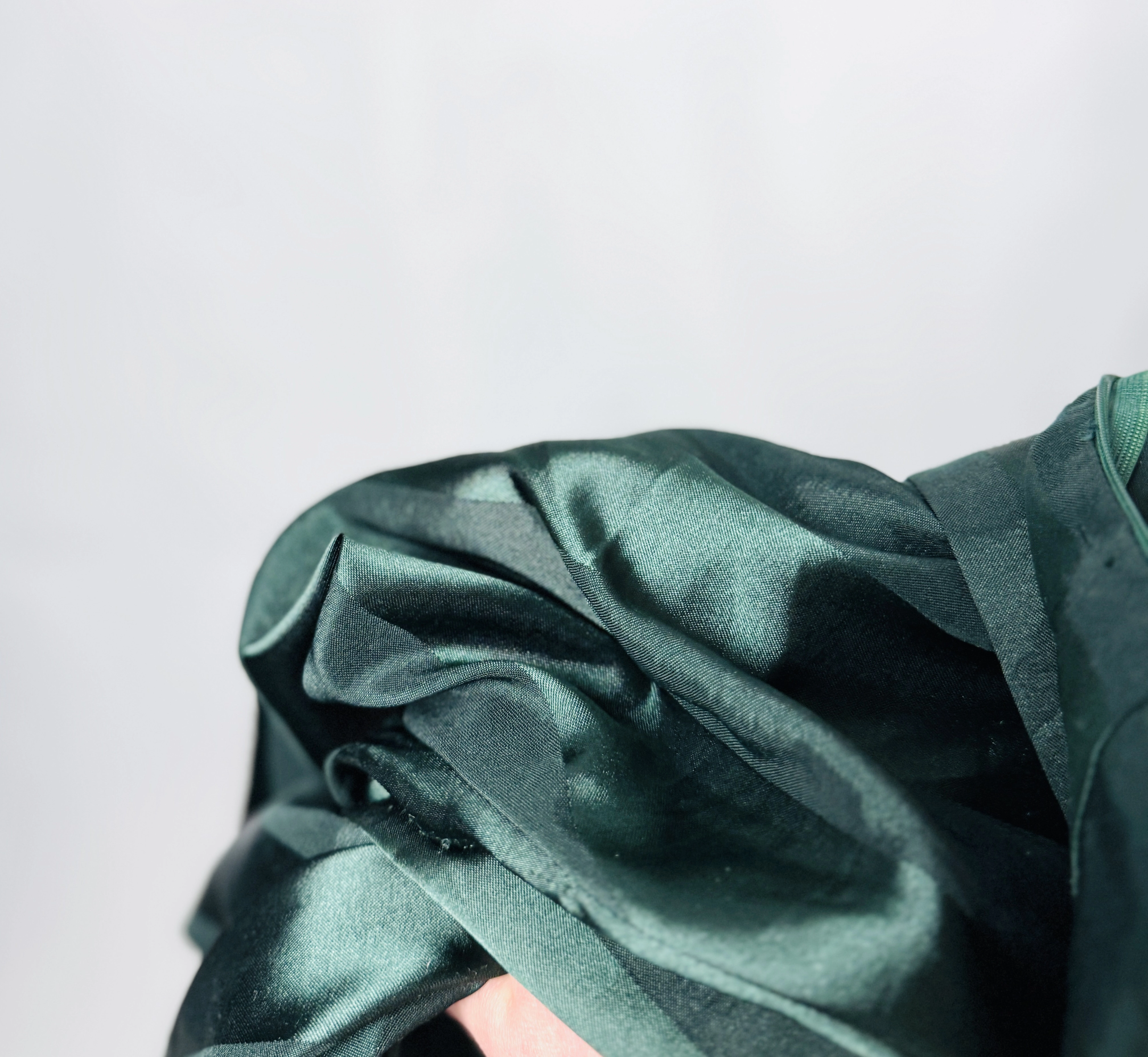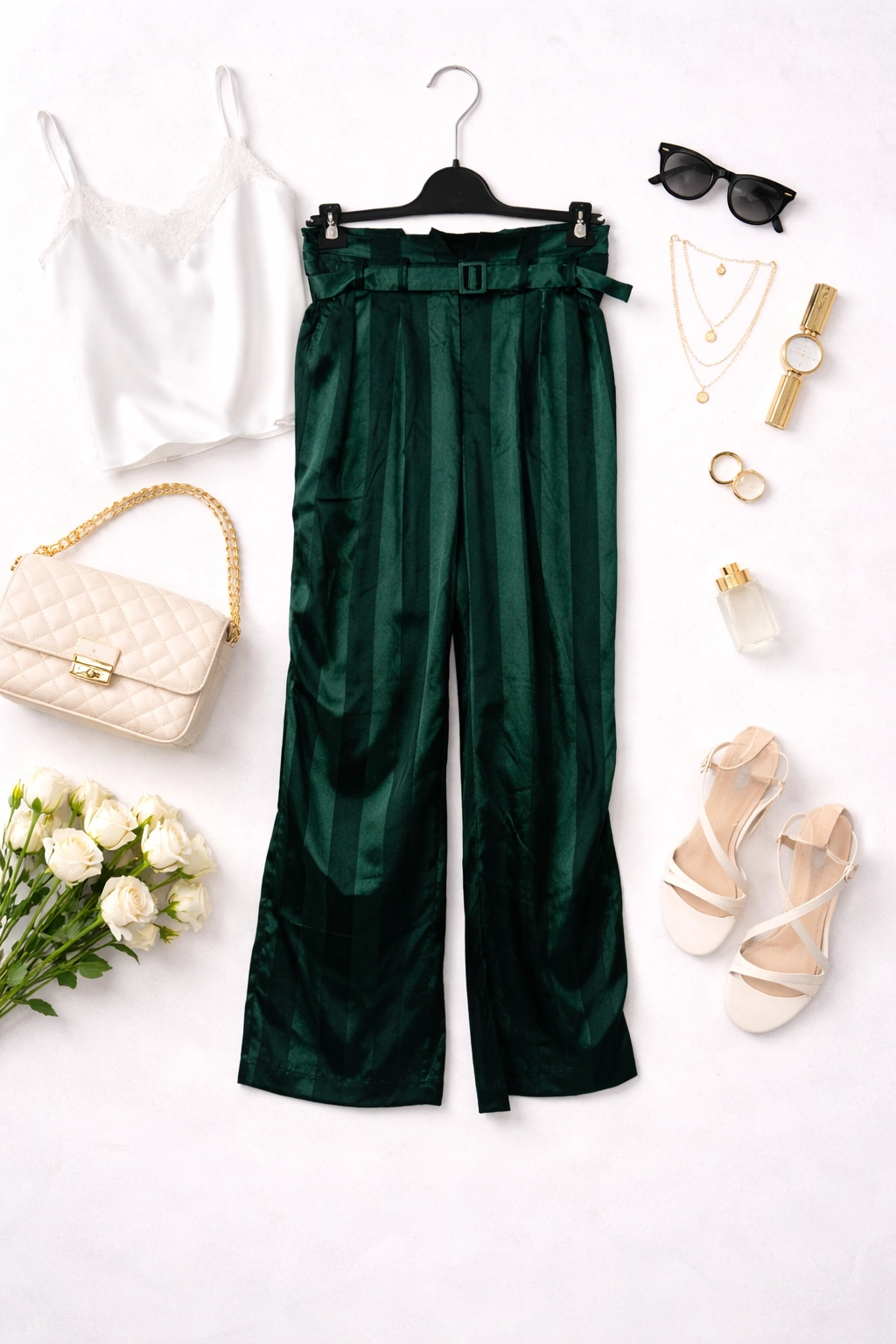 To niezwykle wyrazisty, a zarazem kobiecy projekt — głęboki zielony odcień przeplata się tutaj z eleganckim połyskiem pasów, tworząc efekt pełen szyku i lekko teatralnej nuty. Całość emanuje śmiałą, ale przemyślaną estetyką: spodnie wyglądają elegancko i nieco retro, a jednocześnie zachowują nowoczesną świeżość, dzięki czemu nadają się do okazji, kiedy chcesz poczuć się wyjątkowo, zachowując przy tym klasę i subtelność.