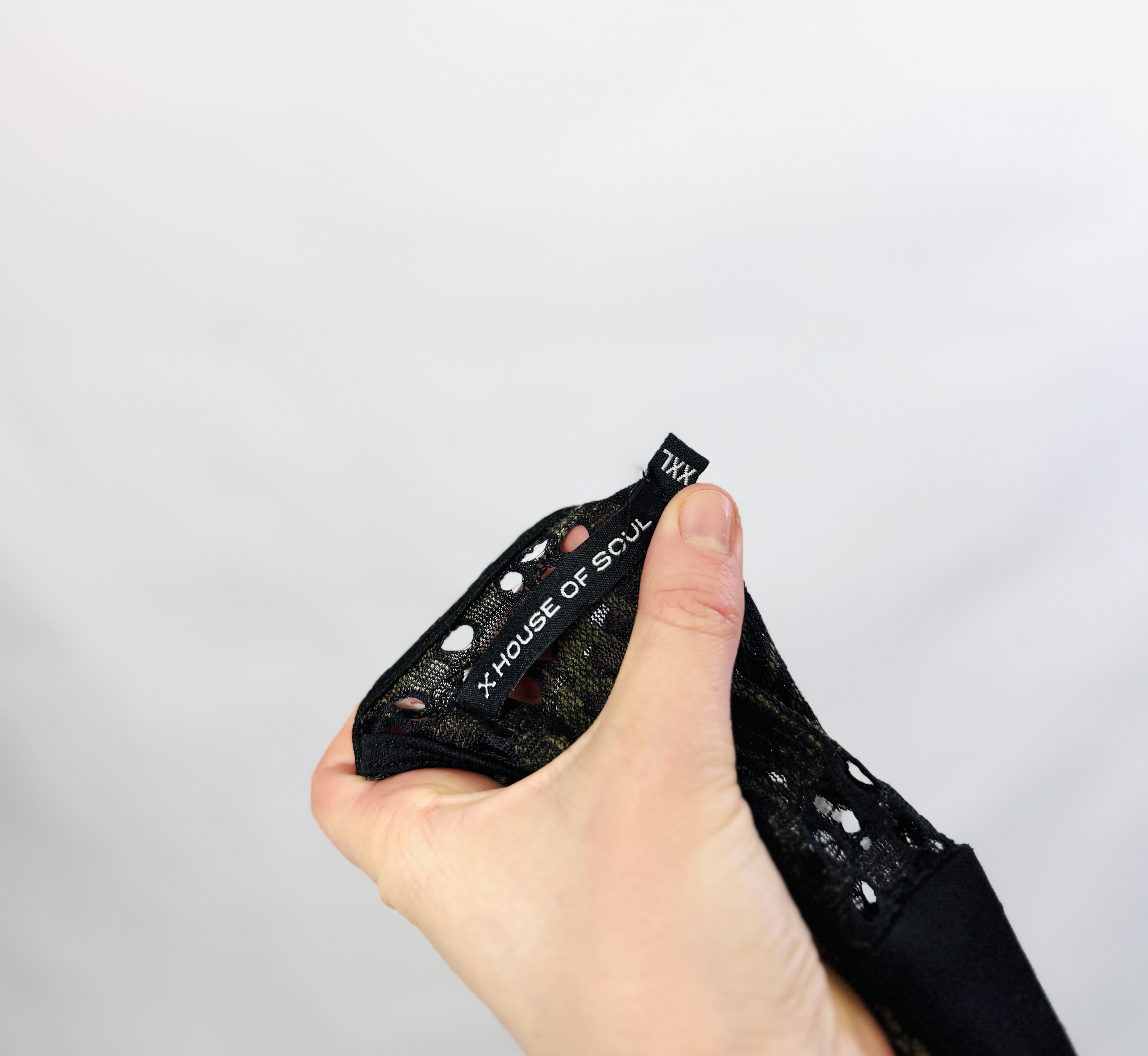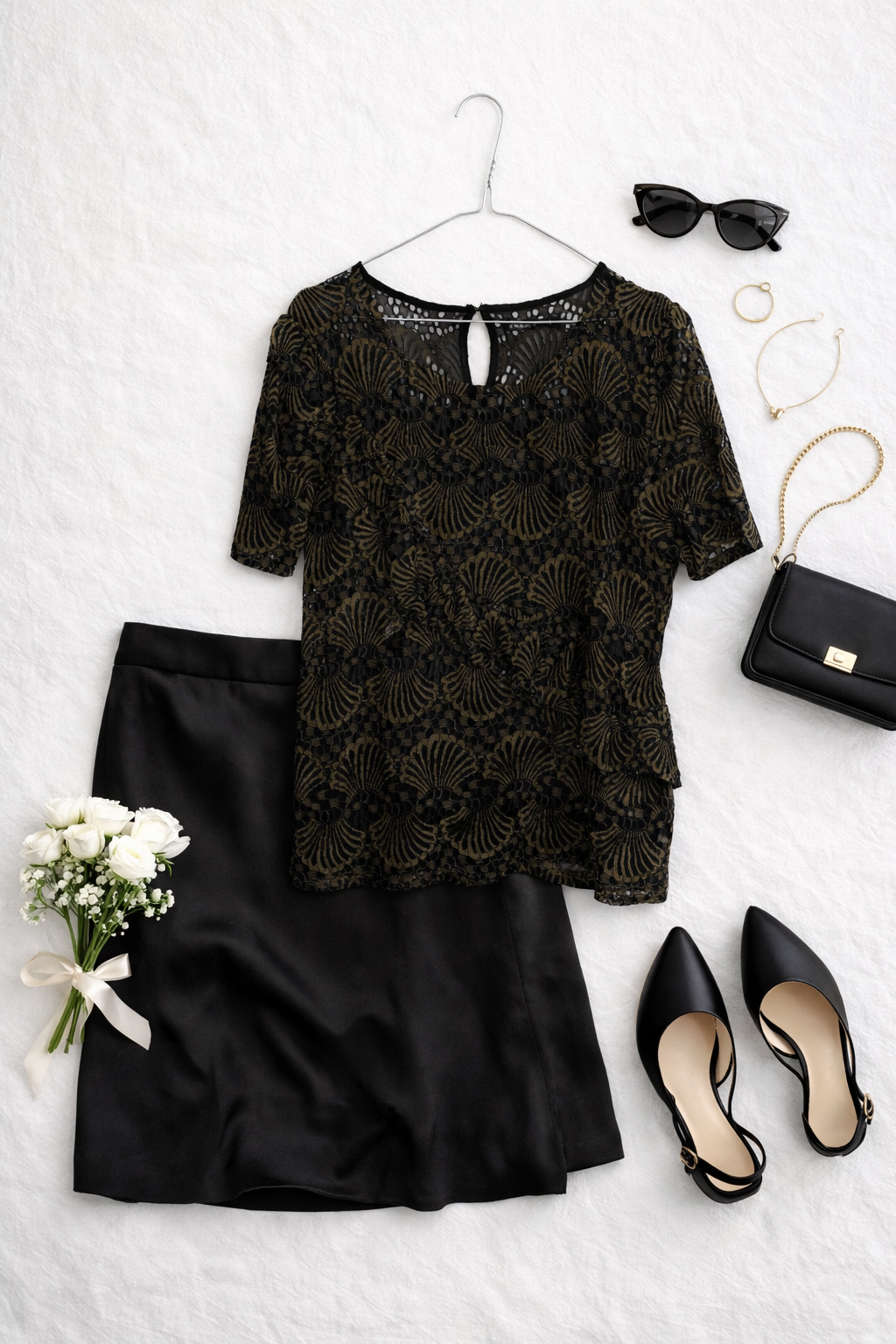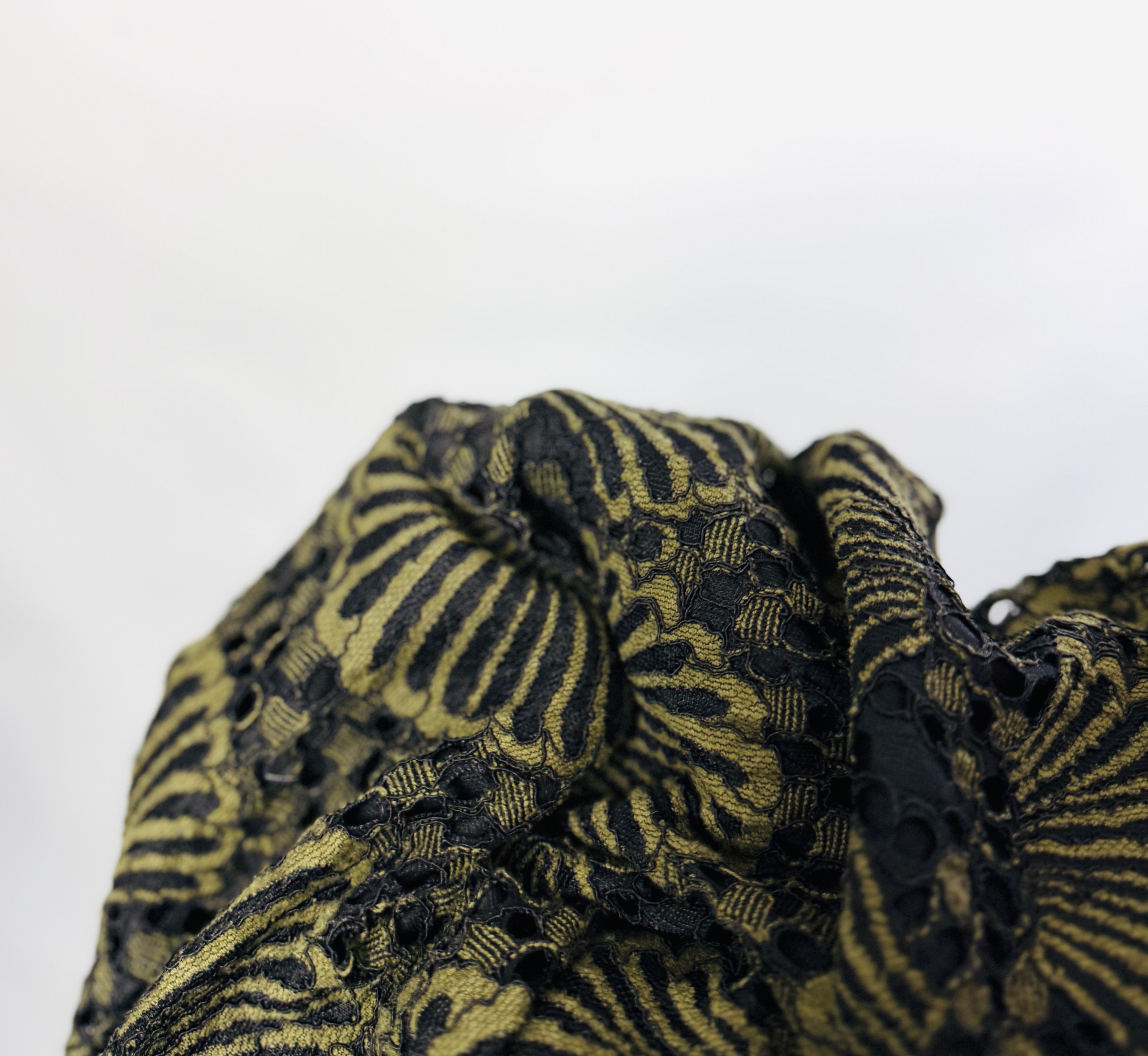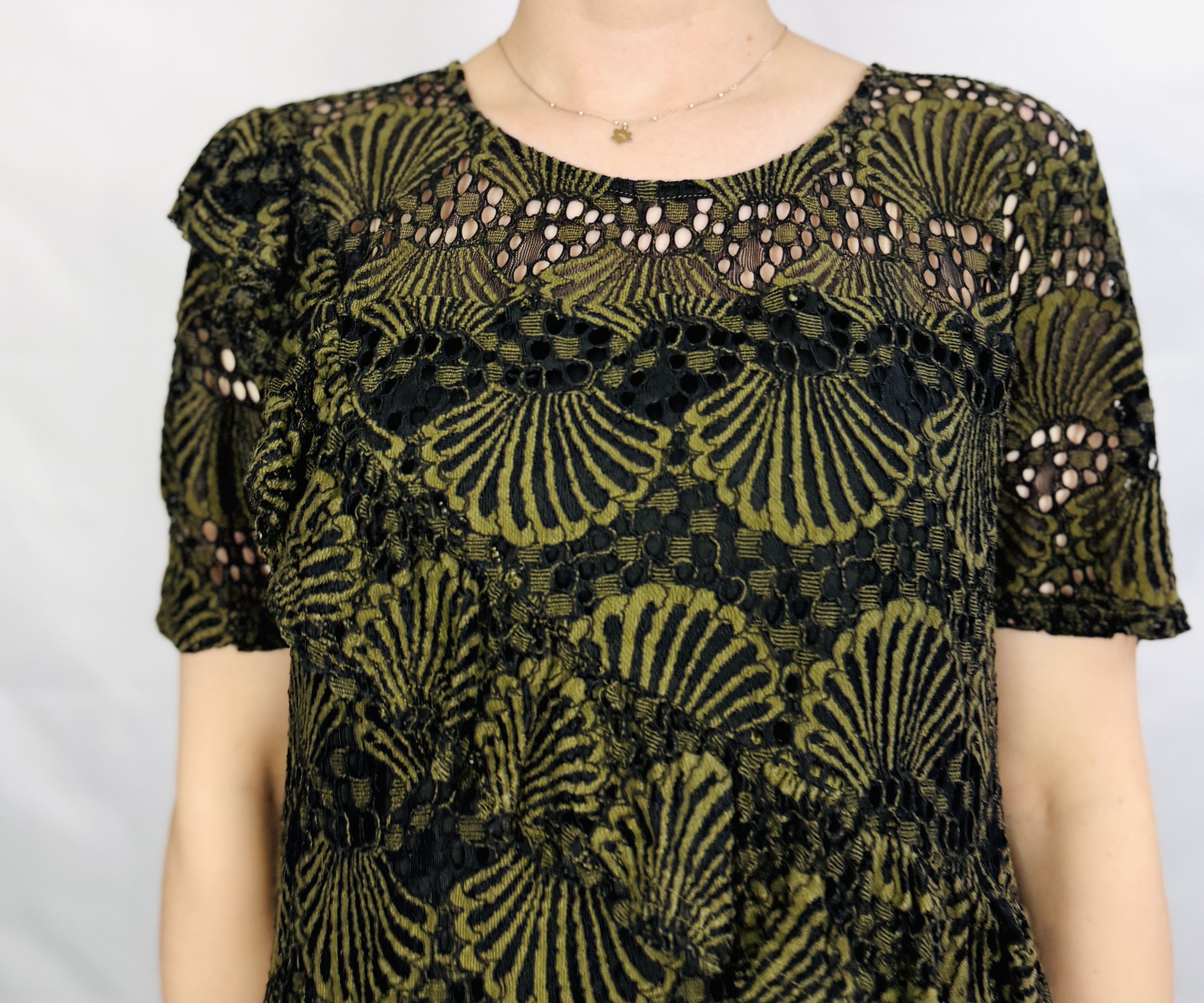 Koronkowa faktura jest główną ozdobą: regularne, przypominające wachlarze motywy łączą się z drobnym ażurowym splotem, tworząc bogaty, lecz harmonijny ornament. W centralnej części tułowia pod koronką widoczna jest gładka podszewka w ciemnym odcieniu, która subtelnie podkreśla głębię wzoru, podczas gdy wyższa partia przy dekolcie i rękawach pozostaje delikatnie ażurowa, dodając całości lekkości i finezji. Powierzchnia tkaniny wydaje się miękko układająca, a sama koronka porusza się z ruchem ciała, tworząc eleganckie, dyskretne załamania i zmianę światła.