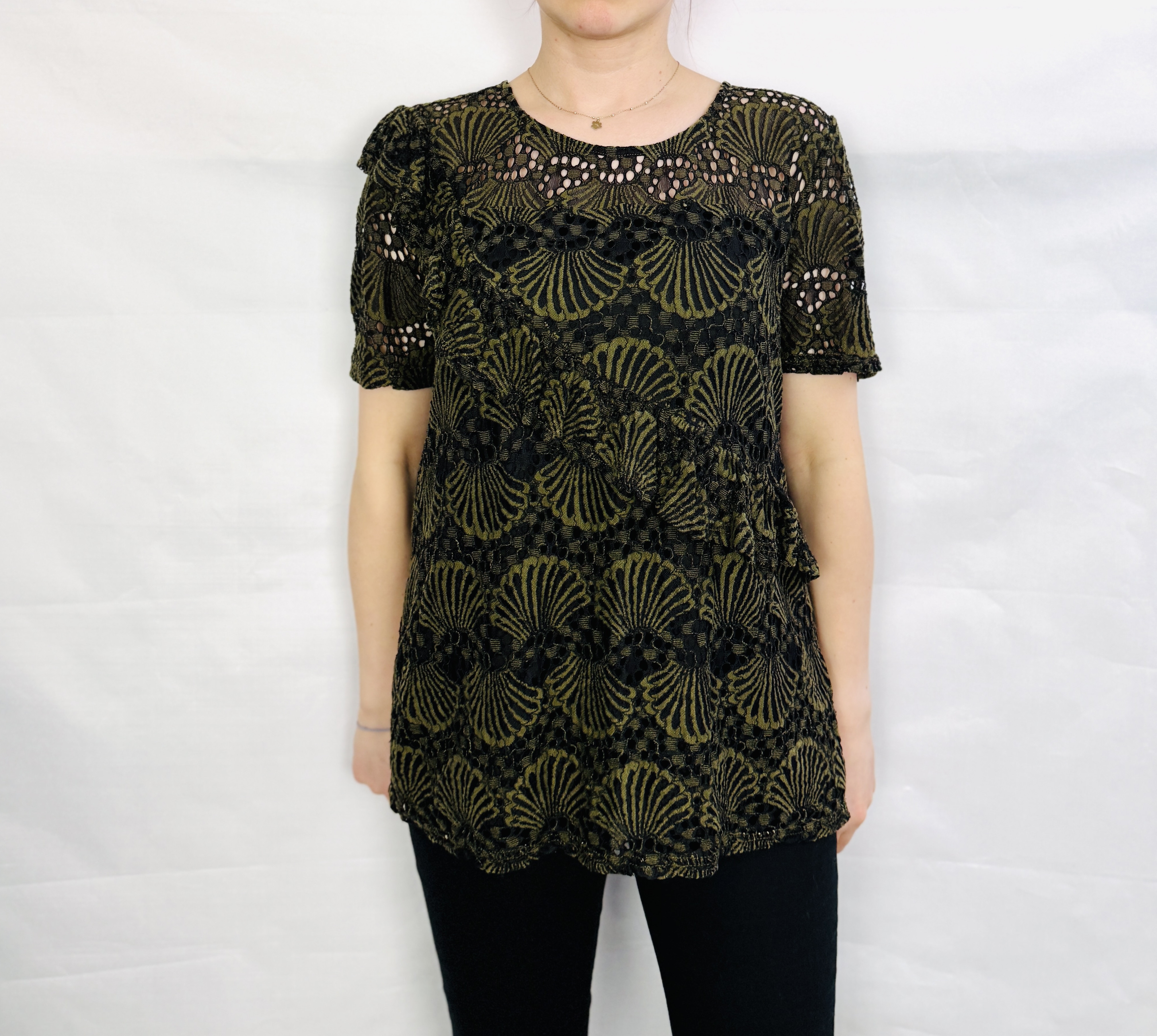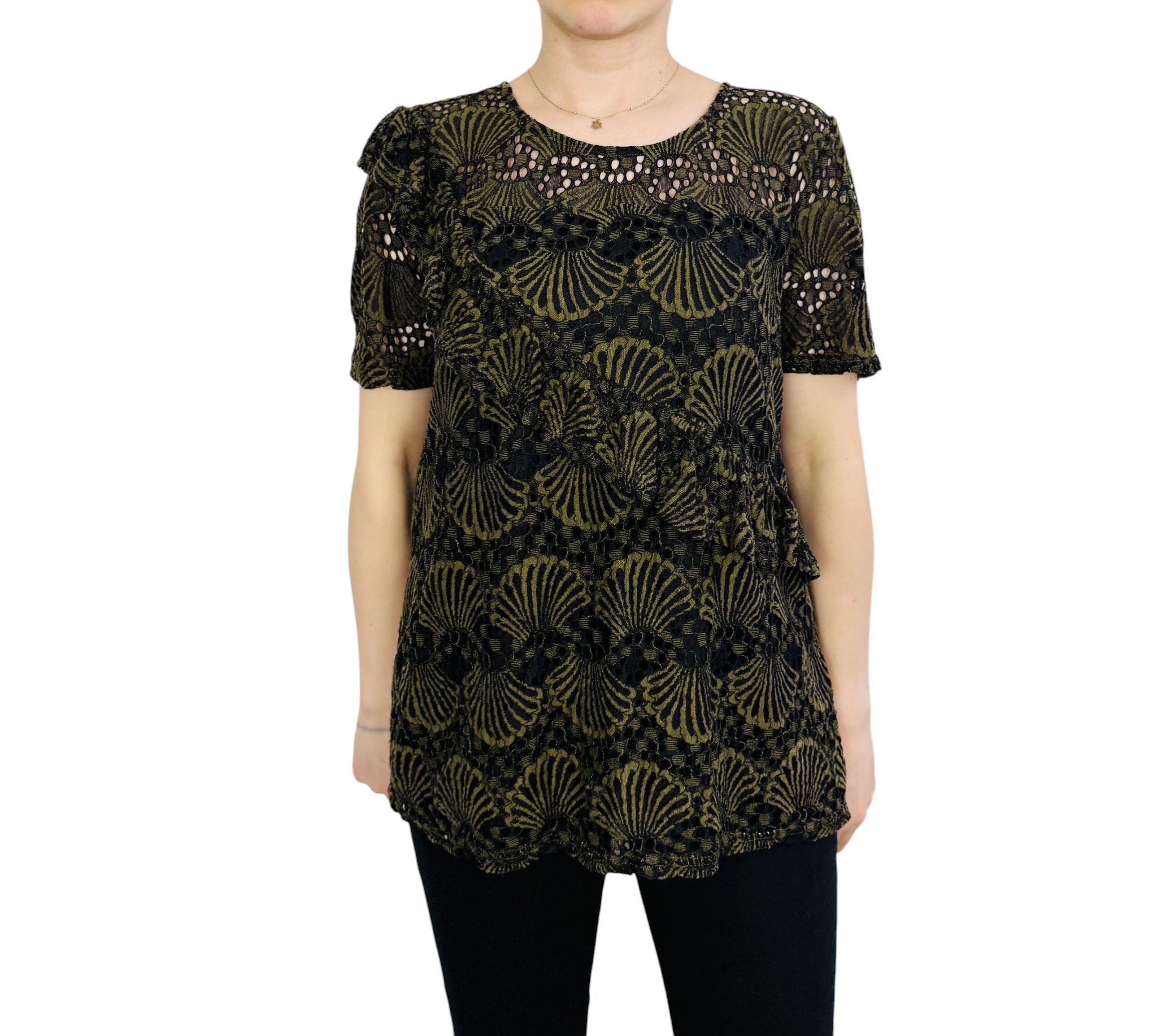 Fason ma luźniejszą, swobodną linię tułowia, która delikatnie opada i nie opinając ciała tworzy subtelną sylwetkę. Dekolt jest okrągły, prosty i uporządkowany, co równoważy bogactwo wzoru koronkowego, natomiast krótkie rękawy zachowują klasyczny kształt z delikatnym wykończeniem. Na froncie widoczny jest dekoracyjny, skośny element rozmieszczony jako delikatna falbanka lub zakładka, która wprowadza dynamiczny akcent i łamie regularność wzoru, dodając projektowi lekkości i oryginalności. Długość bluzki sięga poniżej linii bioder, co daje efekt tunikowy i sprawia, że model dobrze komponuje się z dopasowanym dołem.