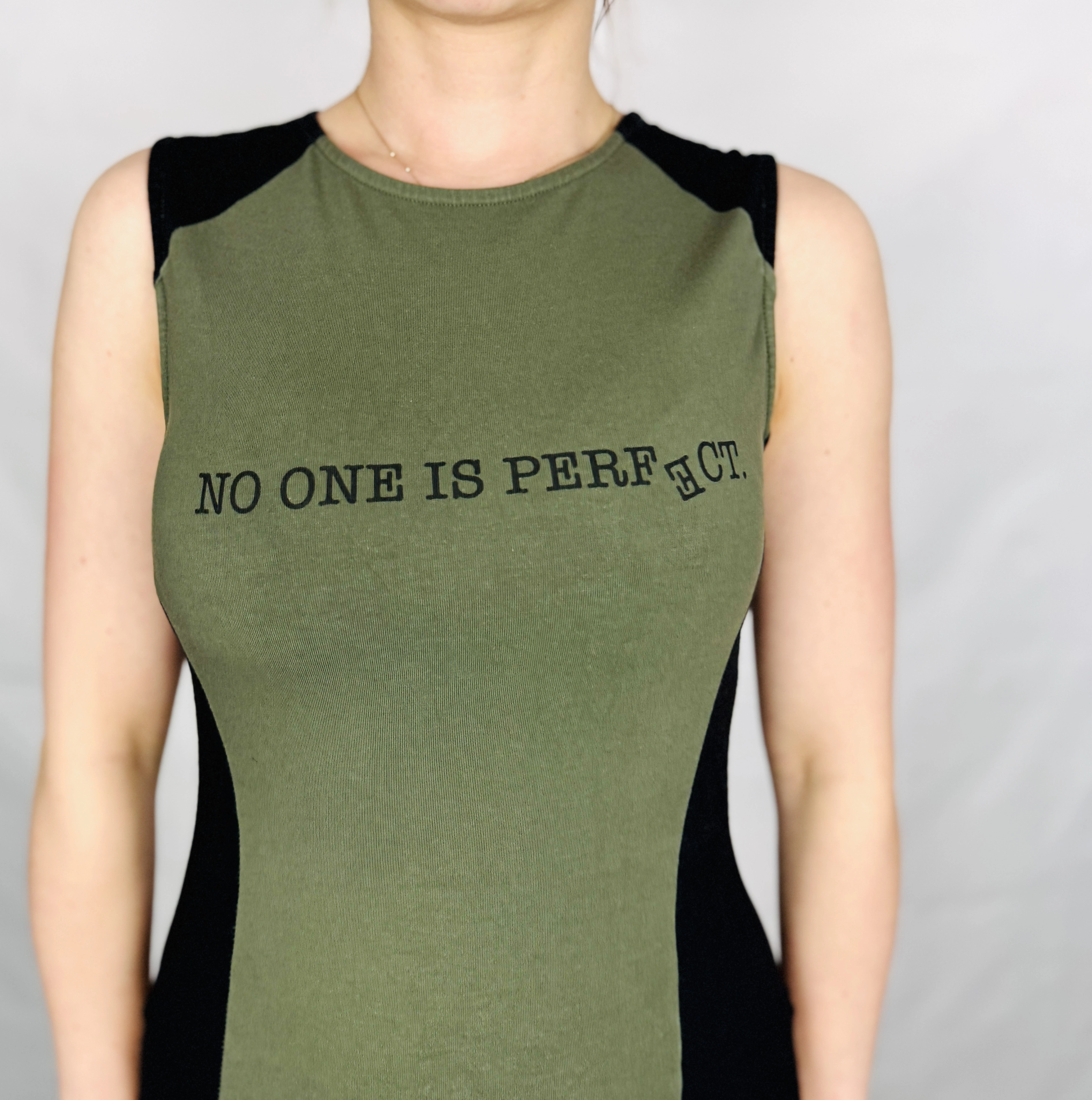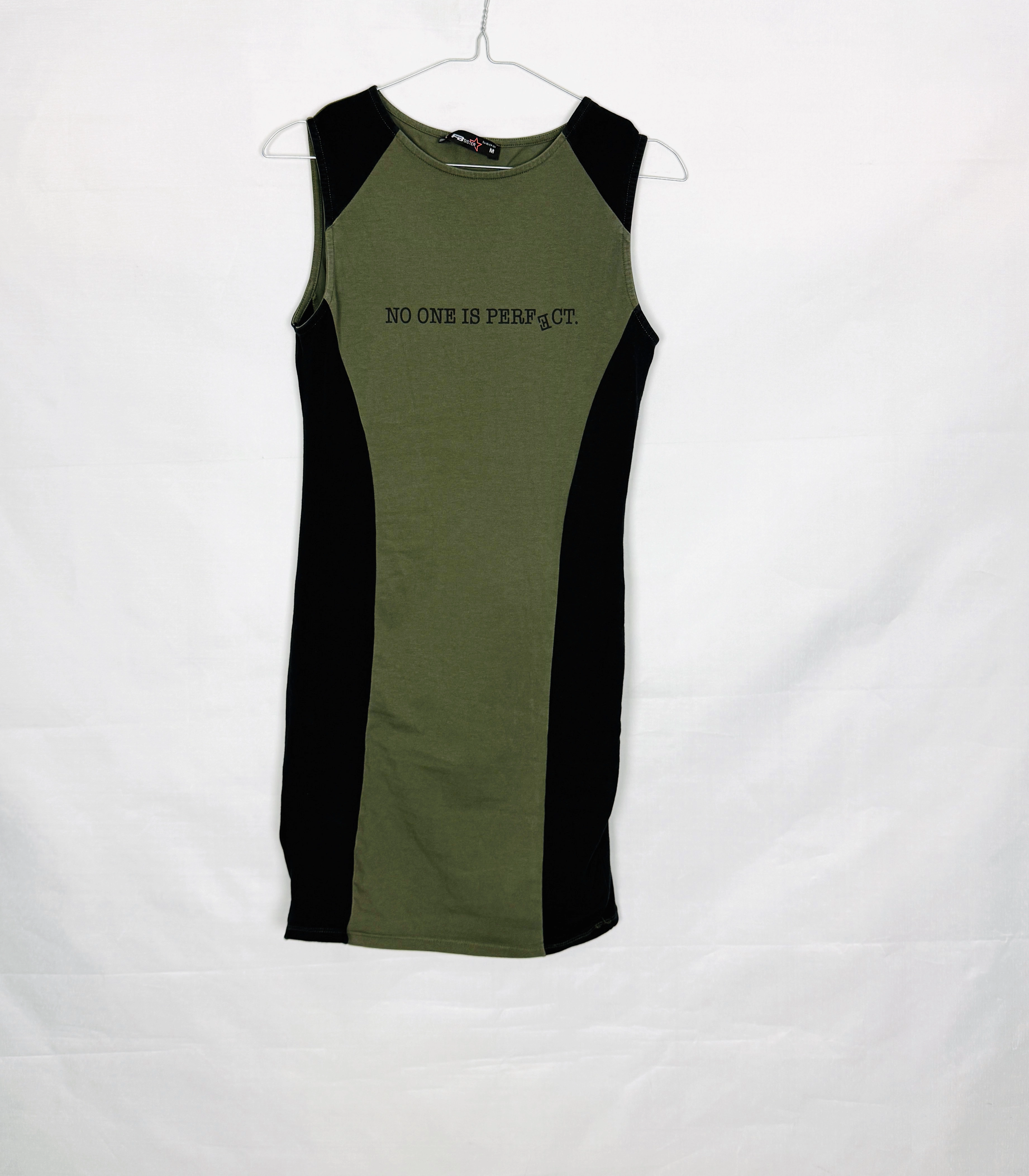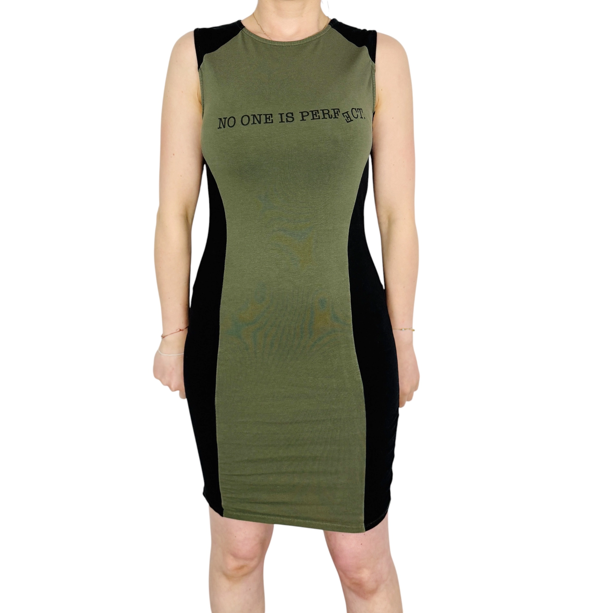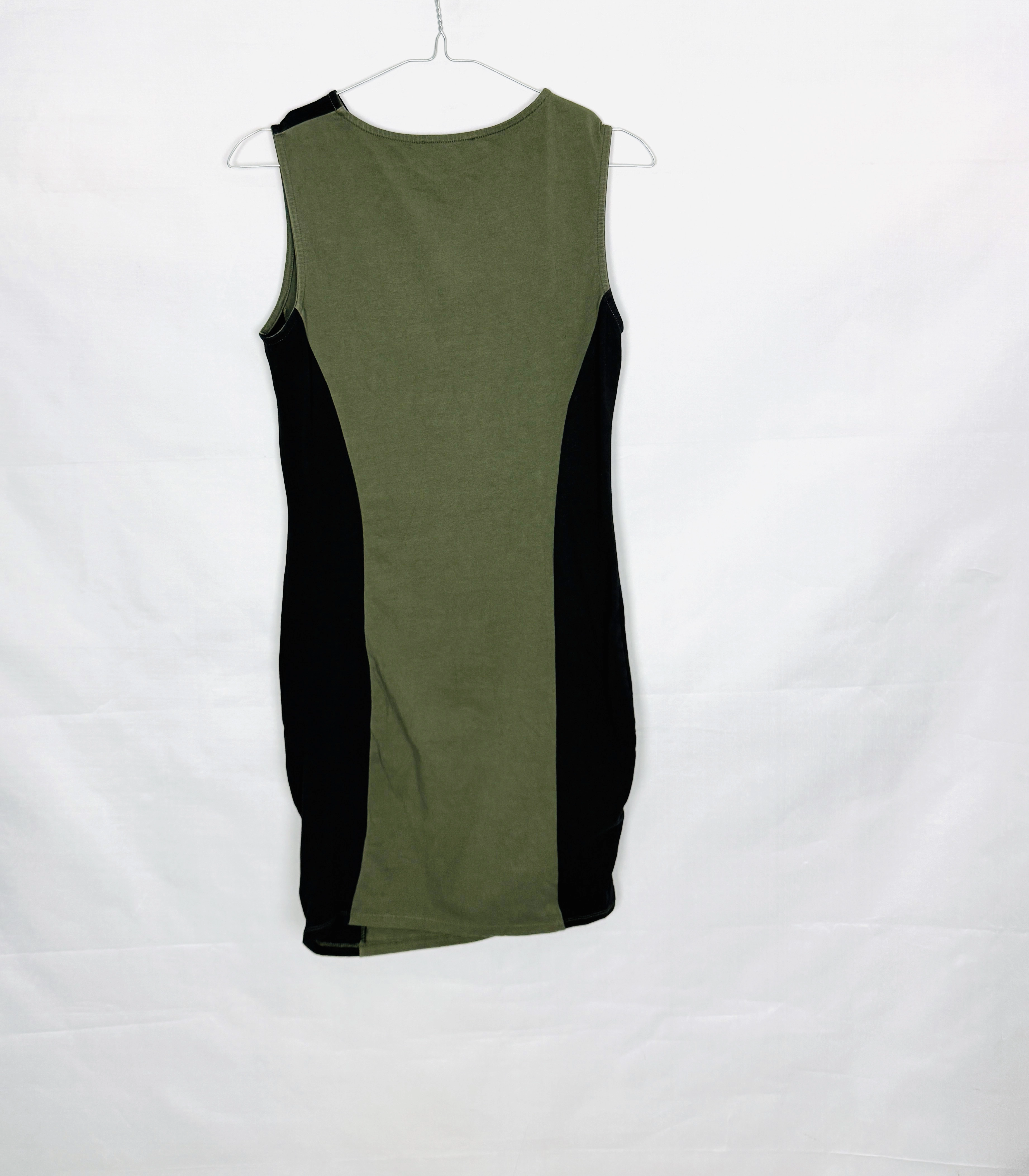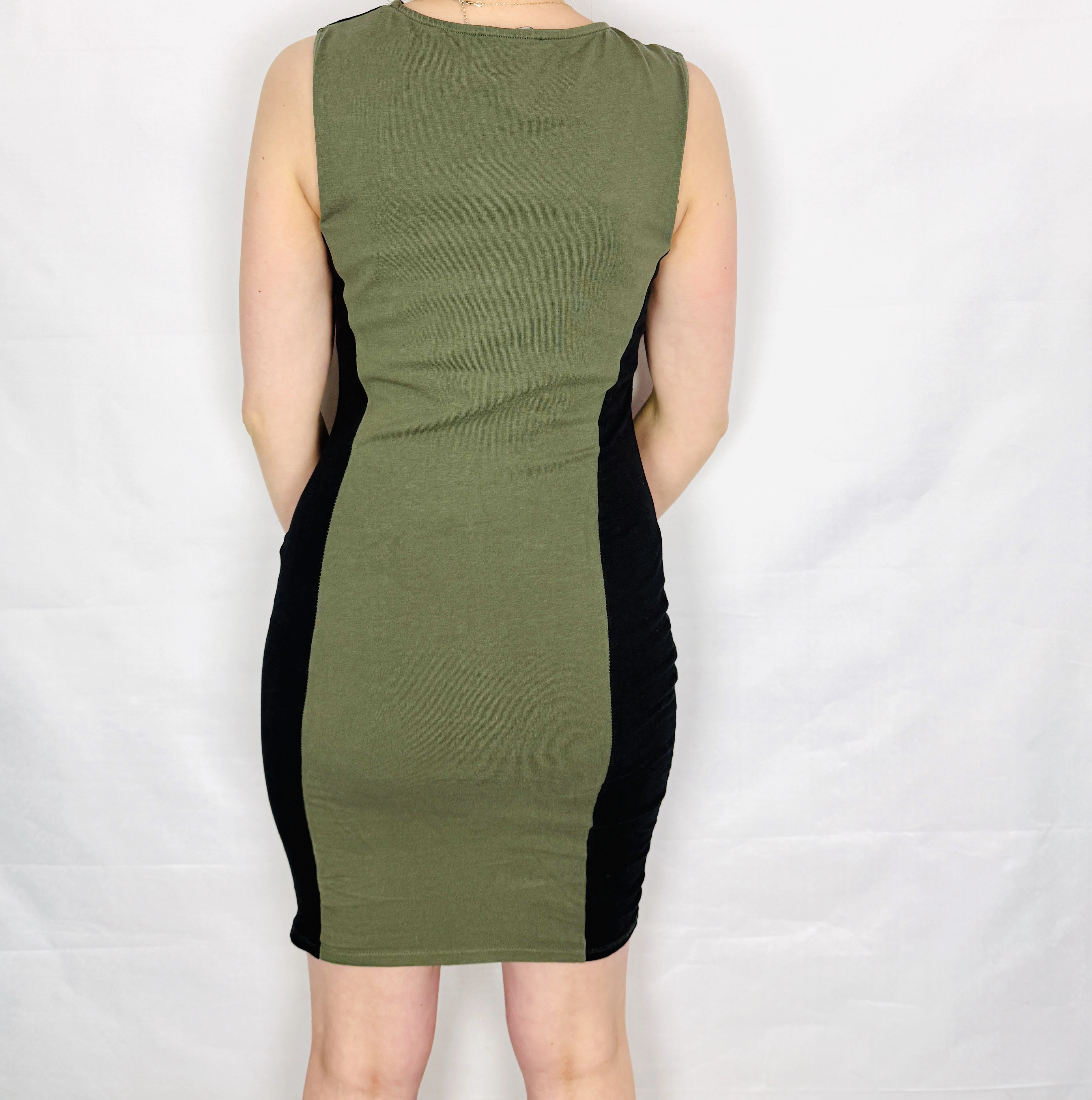 Fason sukienki jest dopasowany i wyraźnie podkreśla linię ciała. Centralny panel w odcieniu zieleni optycznie wysmukla sylwetkę, podczas gdy czarne wstawki po bokach dodatkowo modelują talię i biodra, tworząc efekt bardziej zarysowanych proporcji. Góra została wykończona zabudowanym, okrągłym dekoltem, który nadaje całości klasycznego charakteru, a brak rękawów eksponuje ramiona i dodaje lekkości.