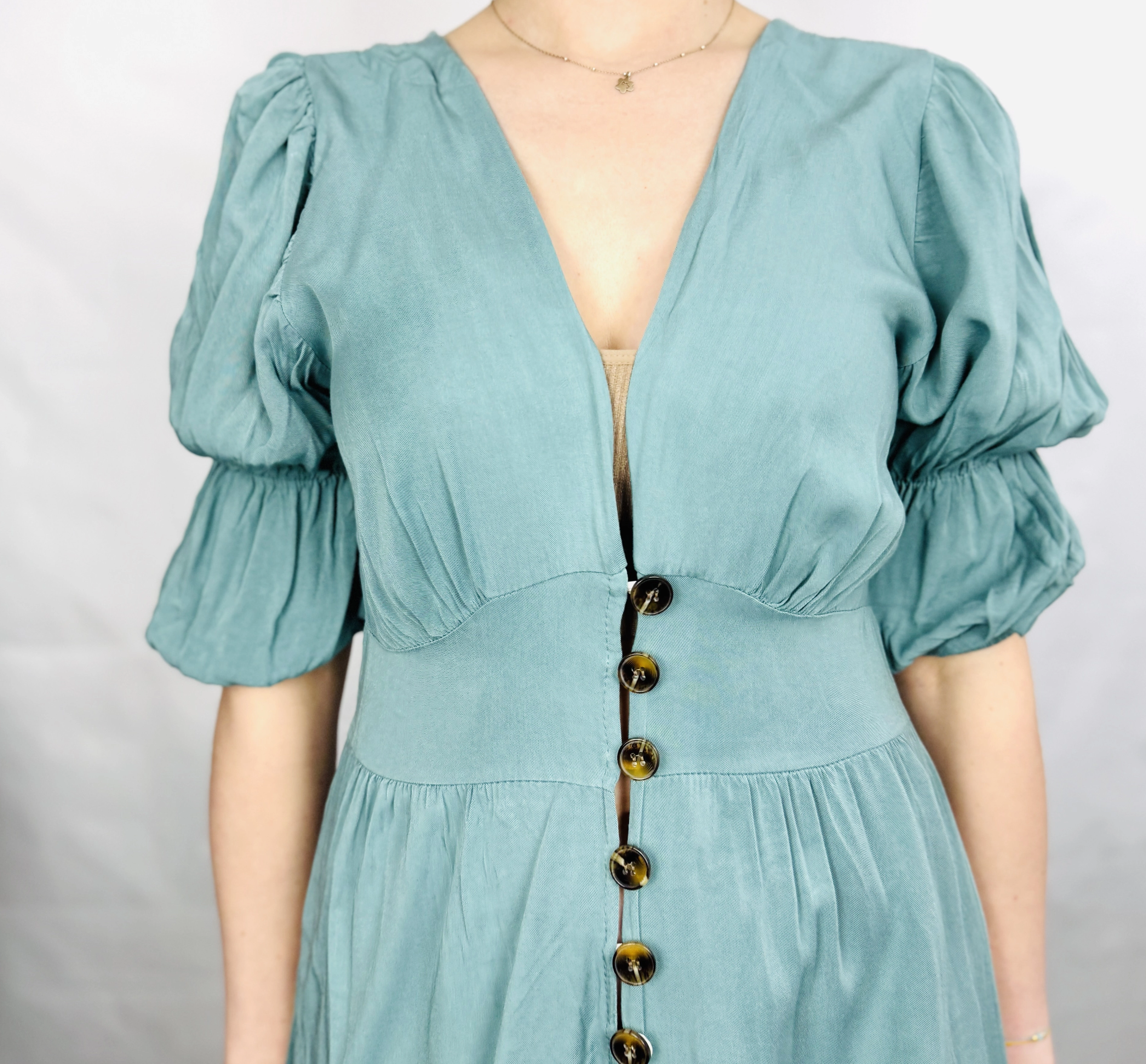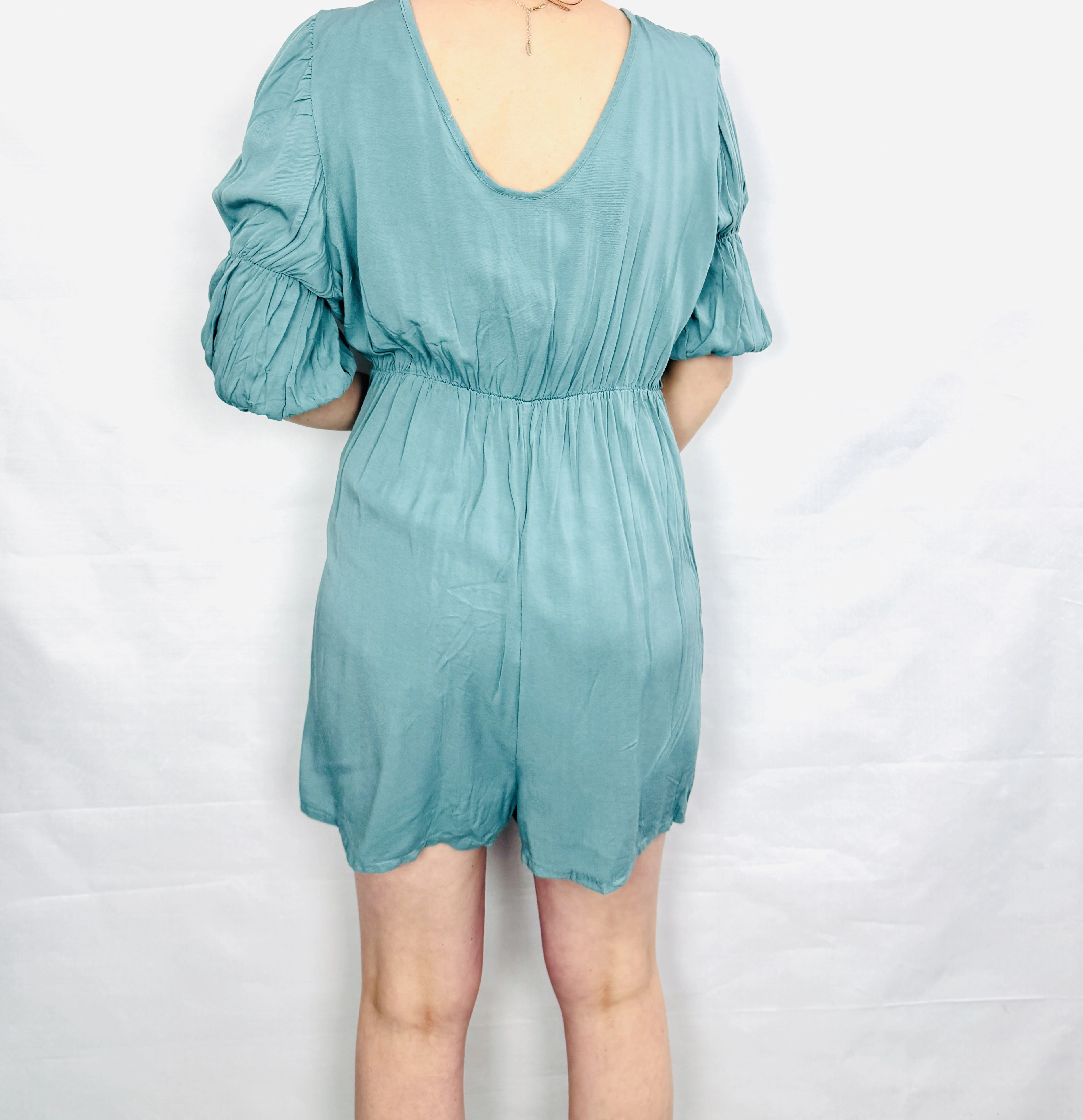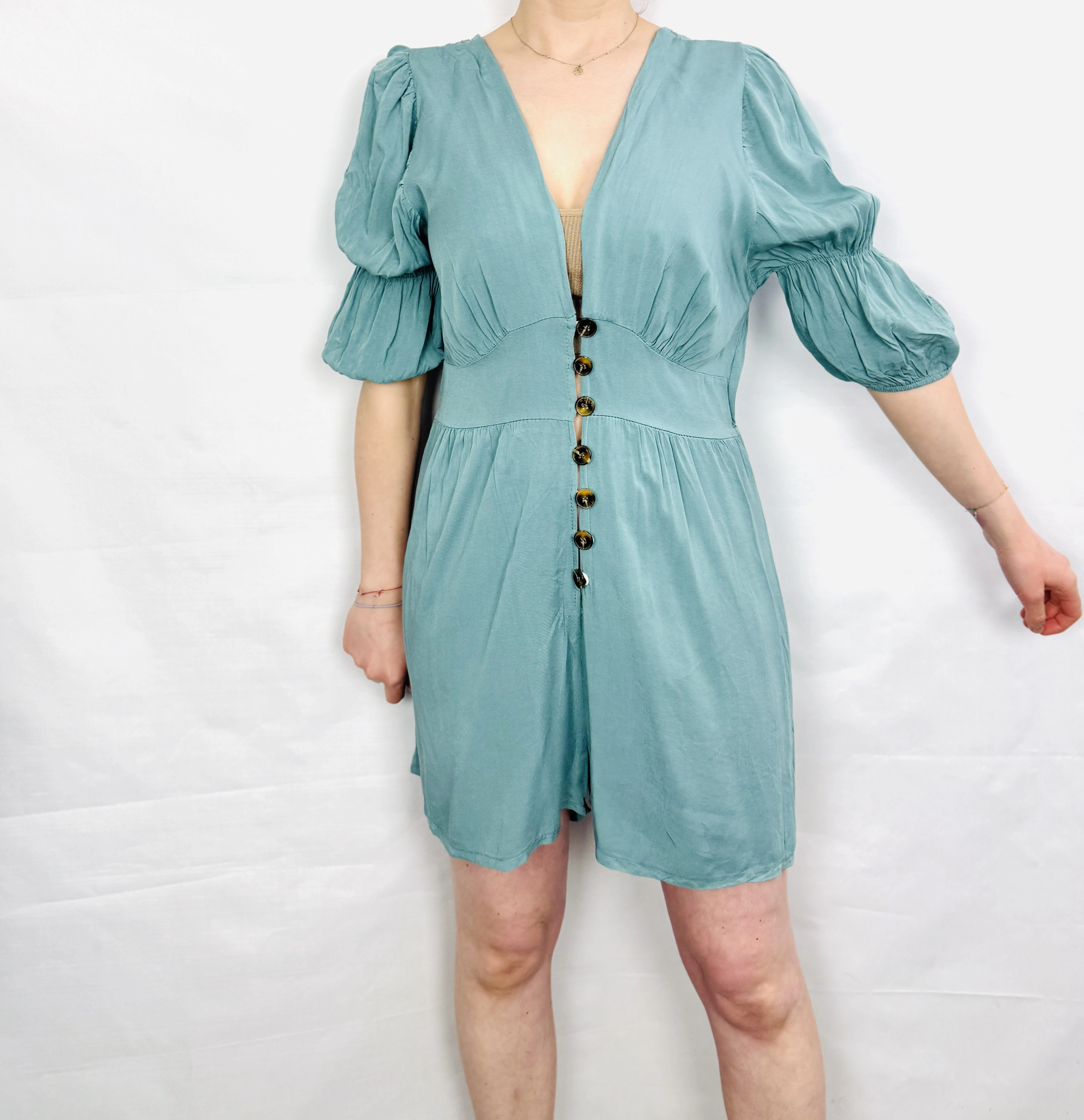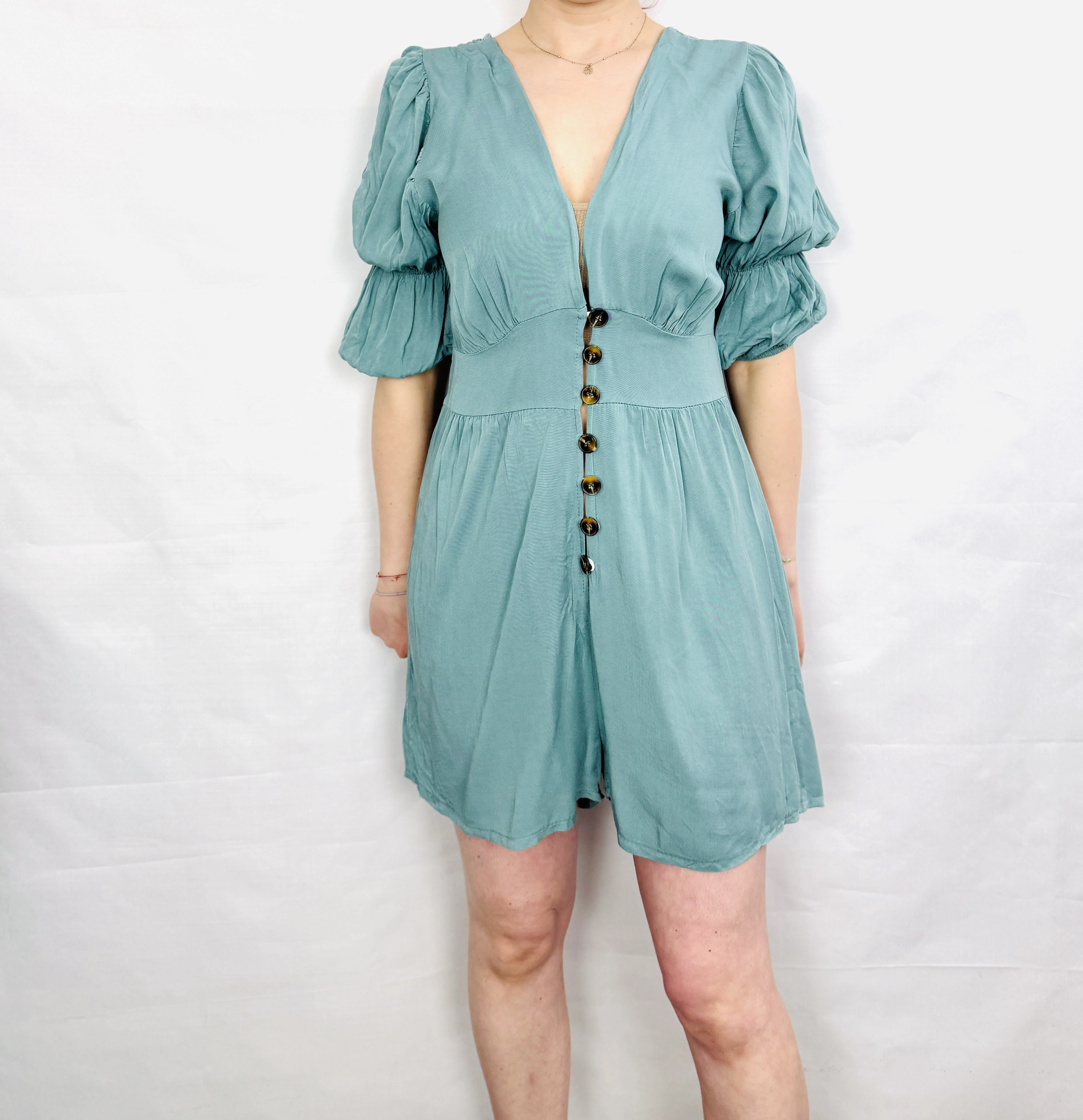 Fason kombinezonu charakteryzuje się dopasowaną górą z głębokim dekoltem w kształcie litery V, który pięknie wysmukla szyję i eksponuje górne partie sylwetki. Linia talii została wyraźnie zaznaczona szerokim pasem materiału z rzędem ozdobnych, ciemniejszych guzików, co pozwala na perfekcyjne podkreślenie kobiecych kształtów i optyczne wydłużenie nóg. Najbardziej urokliwym elementem są krótkie, bufiaste rękawy zakończone delikatnym marszczeniem, które dodają całości objętości w górnej części i wprowadzają dziewczęcy, lekko retro klimat. Dół kombinezonu to krótkie, luźne nogawki, które swobodnie opływają biodra, zapewniając pełną swobodę ruchów i nadając sylwetce lekkości.