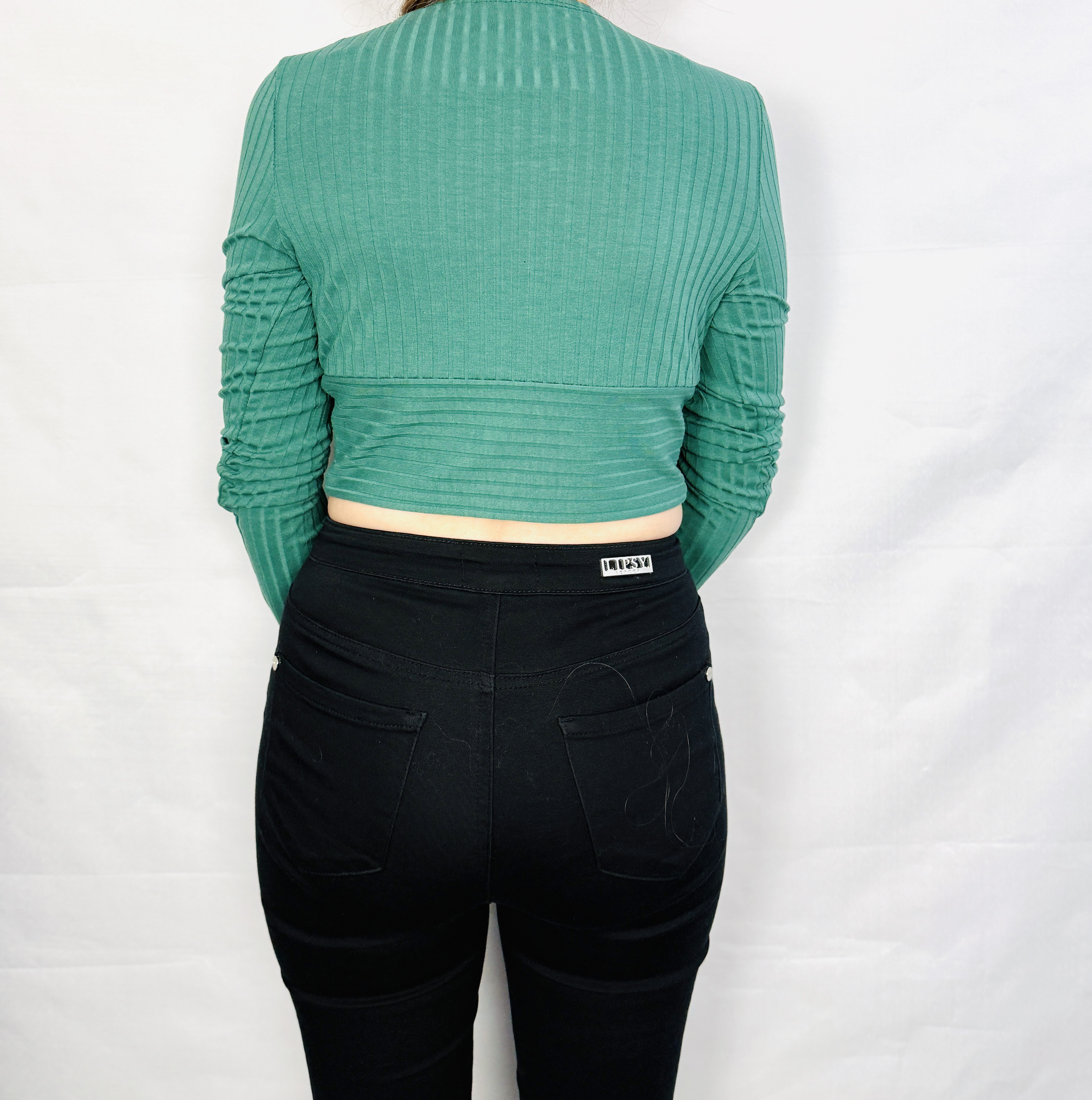 Rękawy są długie, o smukłej linii z delikatnym marszczeniem w partii przedramienia, co wprowadza subtelną teksturową grę i lekko romantyczny akcent. Dzięki temu rękawy nie są monotonne — ich dopasowanie i marszczenia nadają sylwetce dynamiki, a jednocześnie zapewniają swobodę ruchu. Długość topu jest skrócona, kończy się tuż nad linią talii, co tworzy crop topowy fason idealny do wysokiego stanu spodni czy spódnicy.