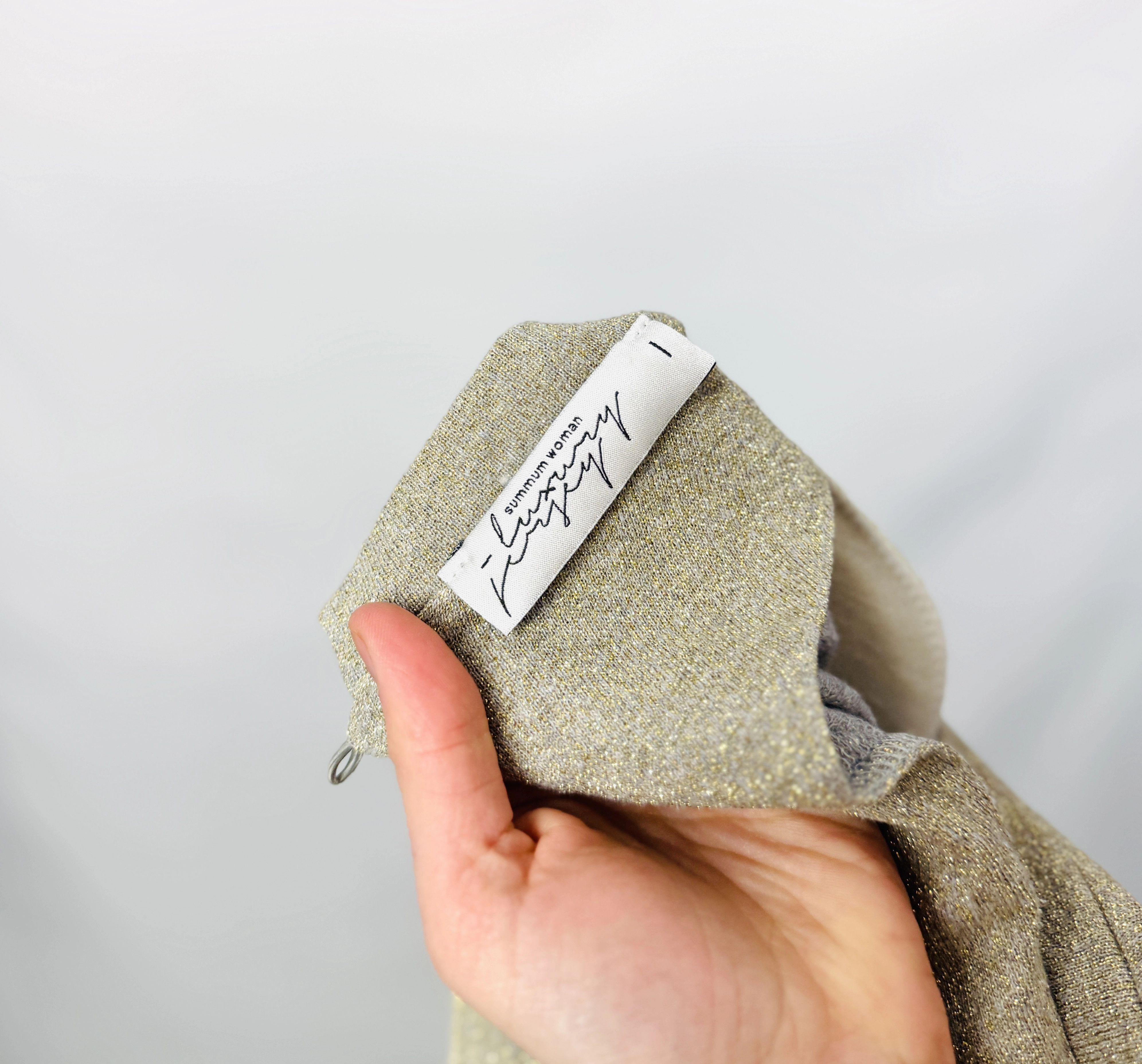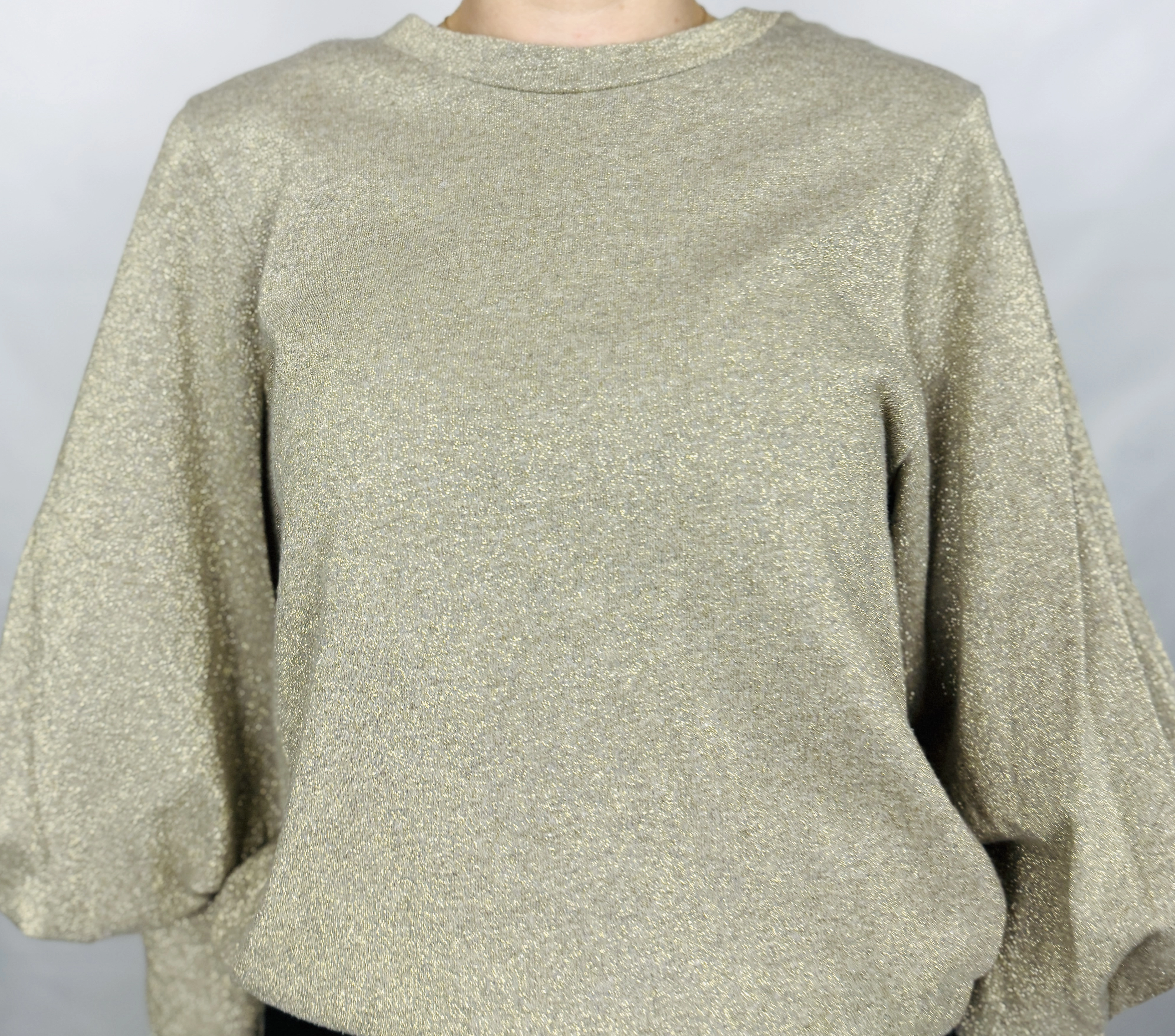 Materiał, z którego wykonano ten model, charakteryzuje się nastrojową, nieznacznie grubszą strukturą, która jest jednocześnie miękka i otulająca. Dzianina posiada gęsty splot z wplecioną metaliczną nitką, co zapewnia nastrojowy połysk i trójwymiarowość koloru. Tkanina jest gładsza od spodu, co gwarantuje przyjemny kontakt ze skórą, natomiast zewnętrzna warstwa ma wyczuwalną, brokatową teksturę. Materiał świetnie trzyma formę bufiastych rękawów, nie pozwalając im oklapnąć, a jednocześnie miękko układa się na torsie. Subtelny blask złota w połączeniu z taką strukturą materiału świadczy o wysokiej jakości wykonania i dbałości o nastrojowy detal, który czyni to ubranie wyjątkowym i bardzo luksusowym w odbiorze.
