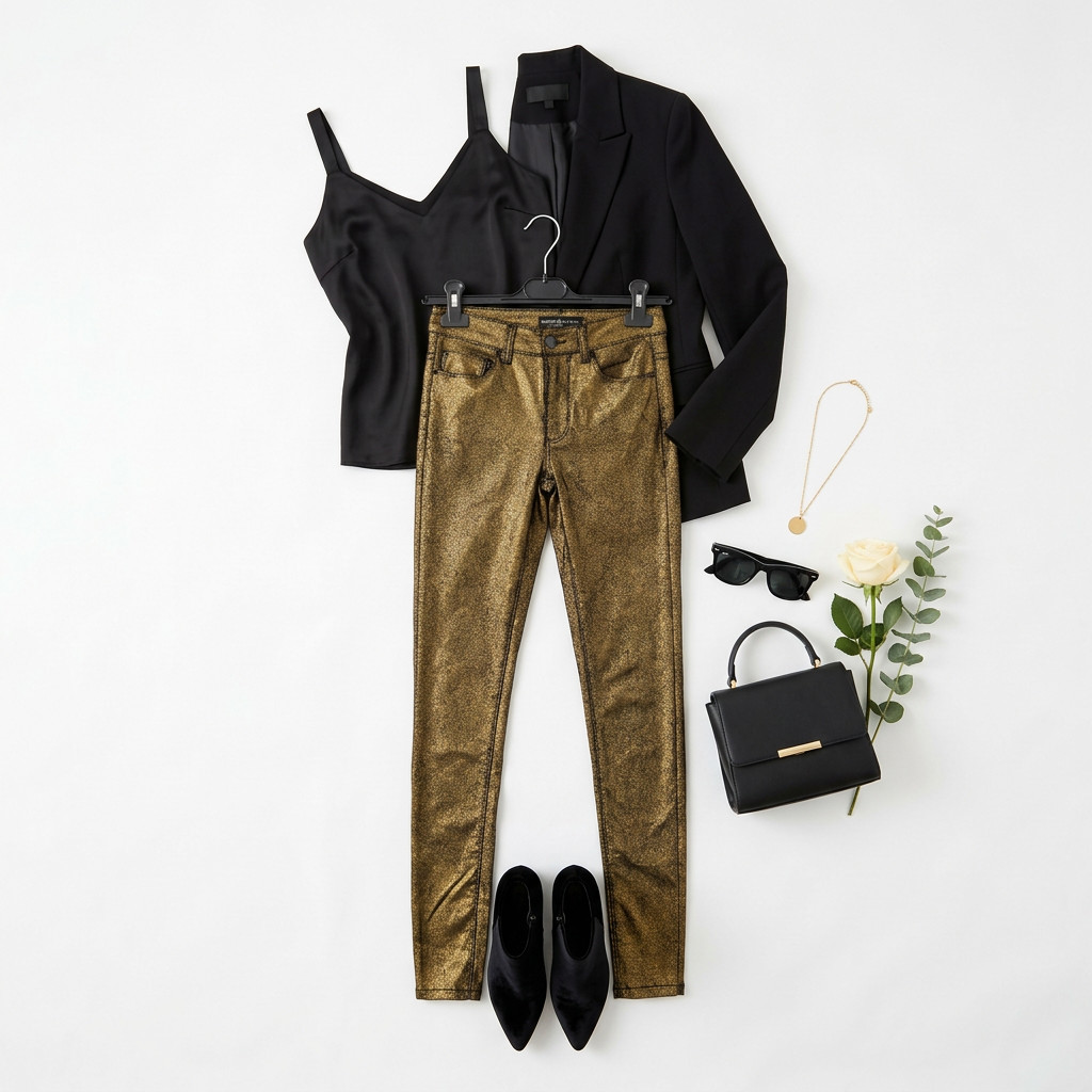 W stylizacjach spodnie stanowią gotowy punkt centralny: w wersji wieczorowej można je łączyć z prostym, eleganckim topem w kolorze krem lub czarnym i klasycznymi szpilkami, tworząc zmysłowy i dopracowany zestaw. Na dzień proponuję stonować blask miękkim swetrem lub dopasowaną marynarką oraz gładkimi loafersami lub botkami, co nada lookowi miejskiego charakteru. Złoty odcień pięknie współgra z neutralnymi barwami takimi jak czerń, biel, krem i beż, a także z głębszymi tonami — bordo, butelkowa zieleń czy granat dodadzą stylizacji wyrafinowanej głębi. To propozycja dla kobiety, która chce bawić się formą i kolorem, zachowując jednocześnie klasę i spójność stroju.