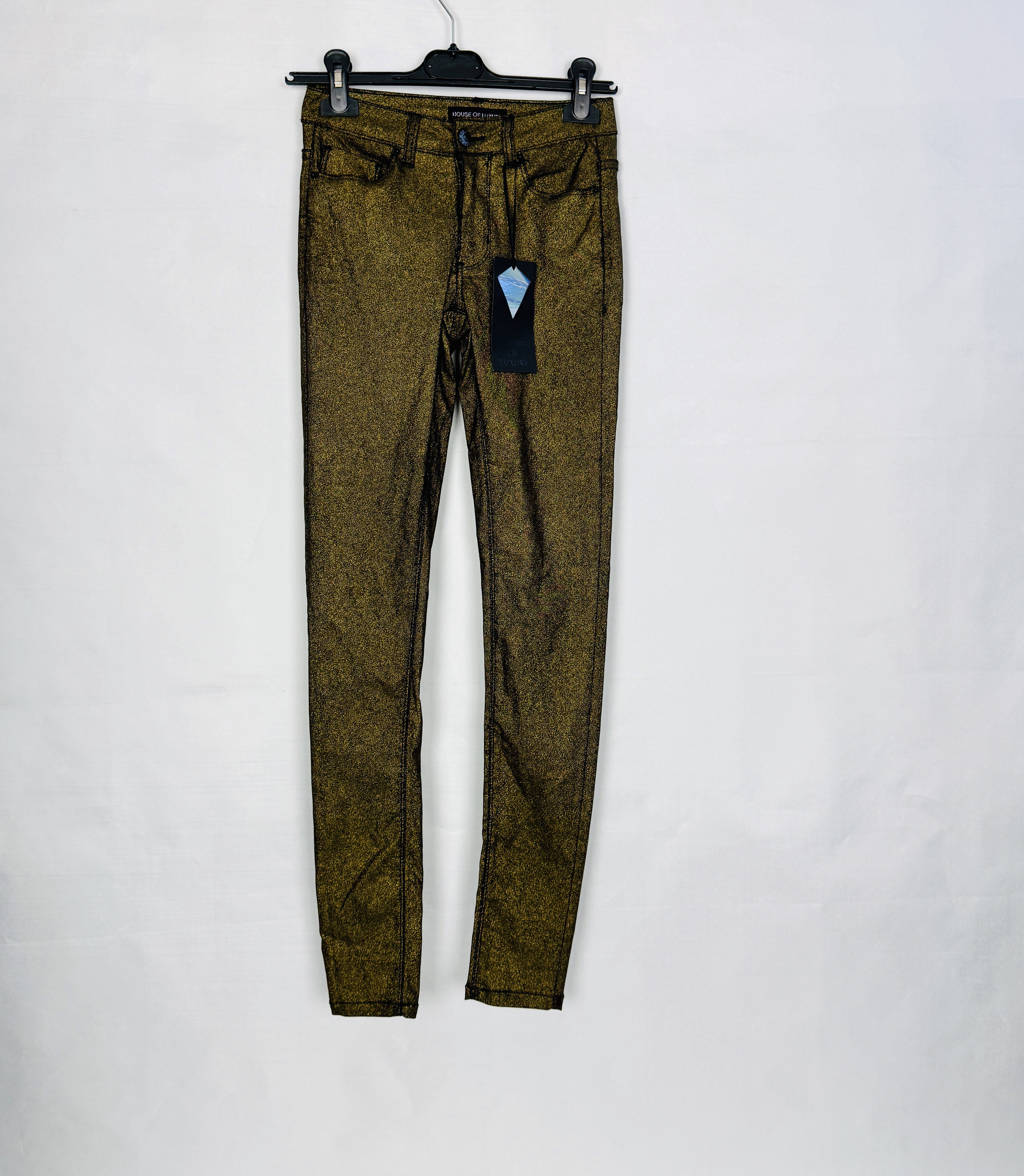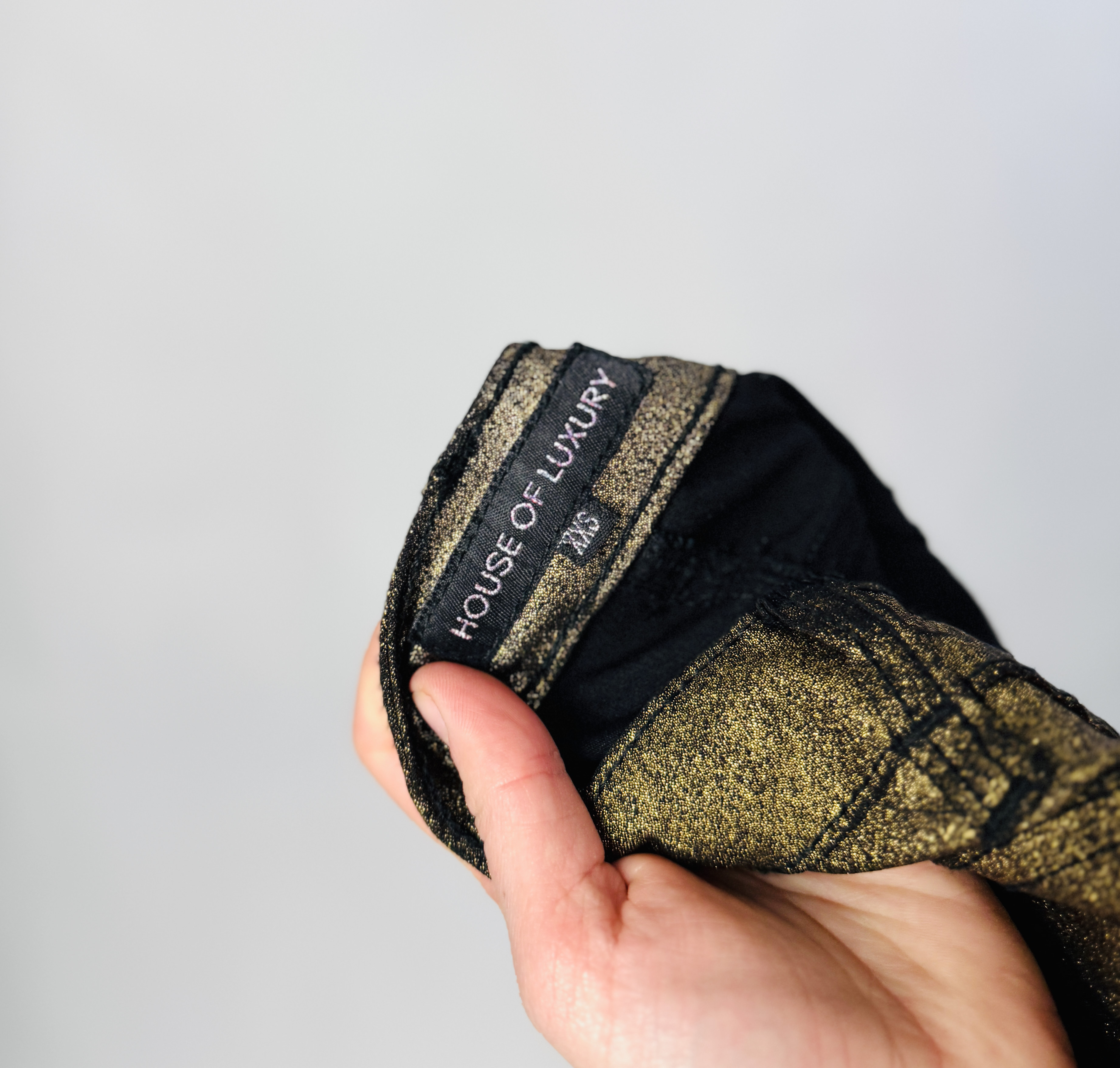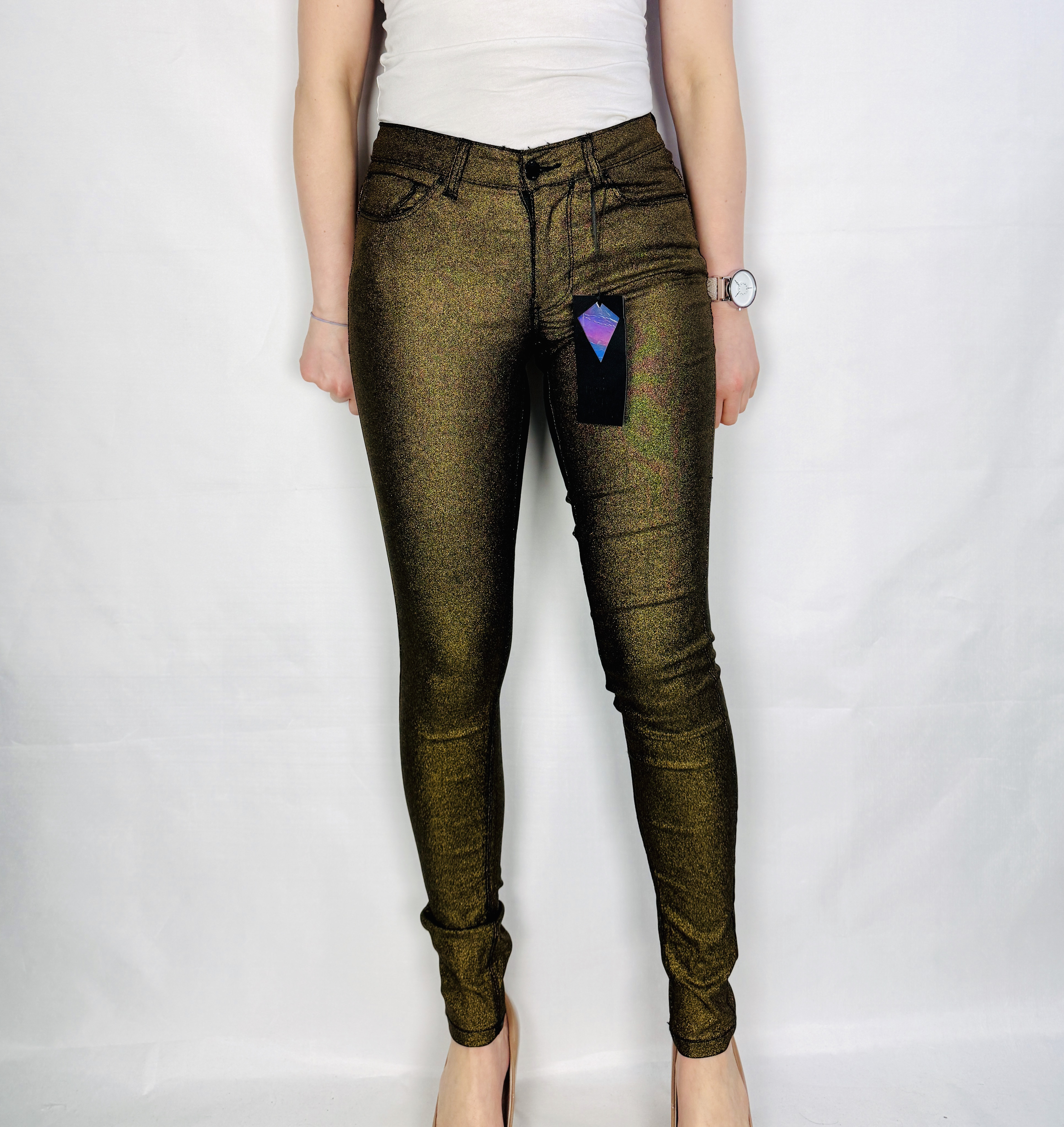 Te spodnie emanują natychmiastową, kobiecą pewnością siebie — metaliczny, złoty blask nadaje im wyrafinowanego, niemal biżuteryjnego charakteru, który łączy w sobie odrobinę teatralności z elegancją. Fason jest prosty, a jednocześnie efektowny; to model, który działa jak wyrazisty akcent w garderobie, nadając stylizacji szyku i energetycznego temperamentu. Mimo intensywnego wykończenia całość zachowuje harmonijną, kobiecą linię, dzięki czemu spodnie odnajdą się zarówno w wieczorowych, jak i bardziej odważnych dziennych zestawach.