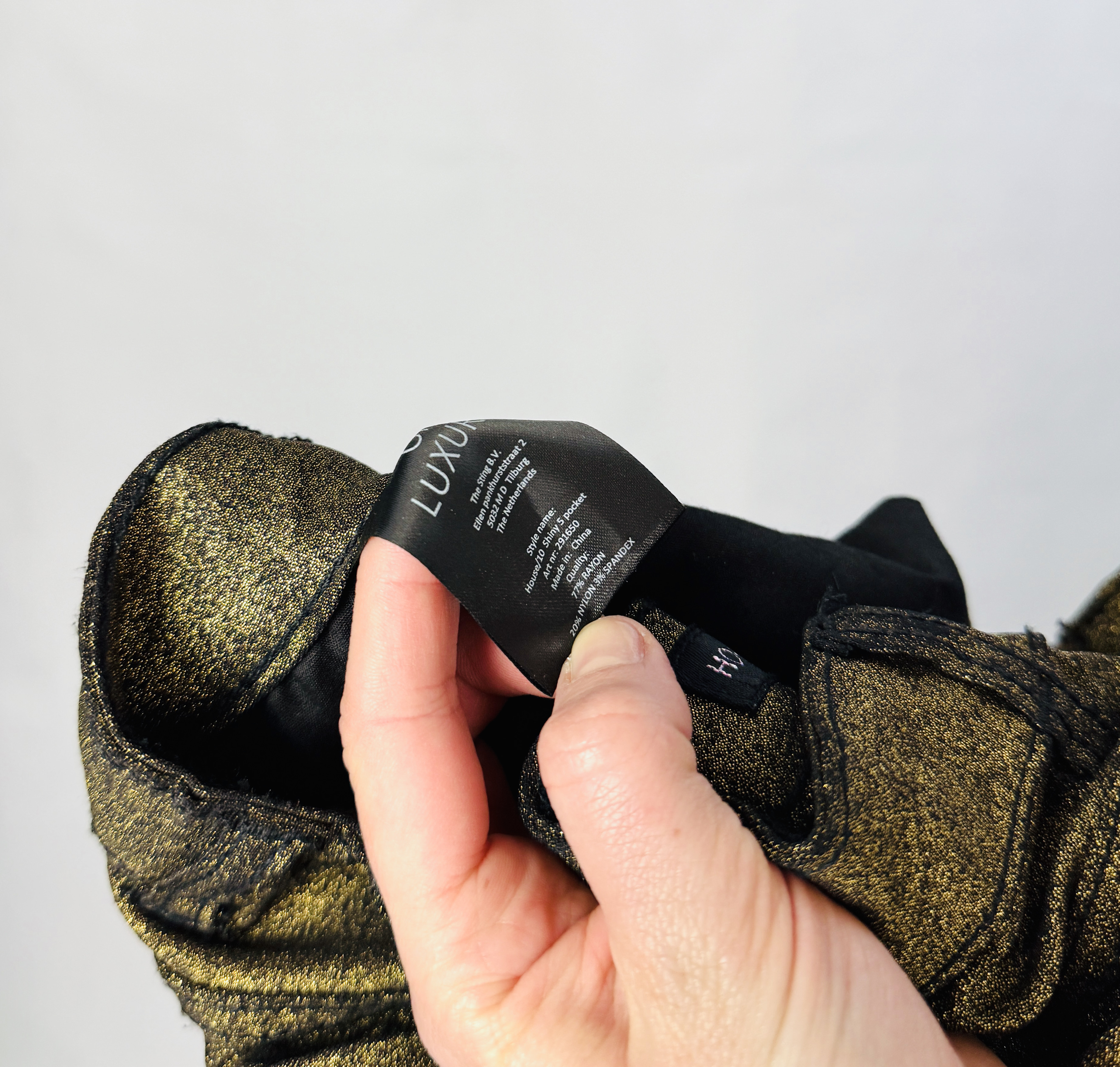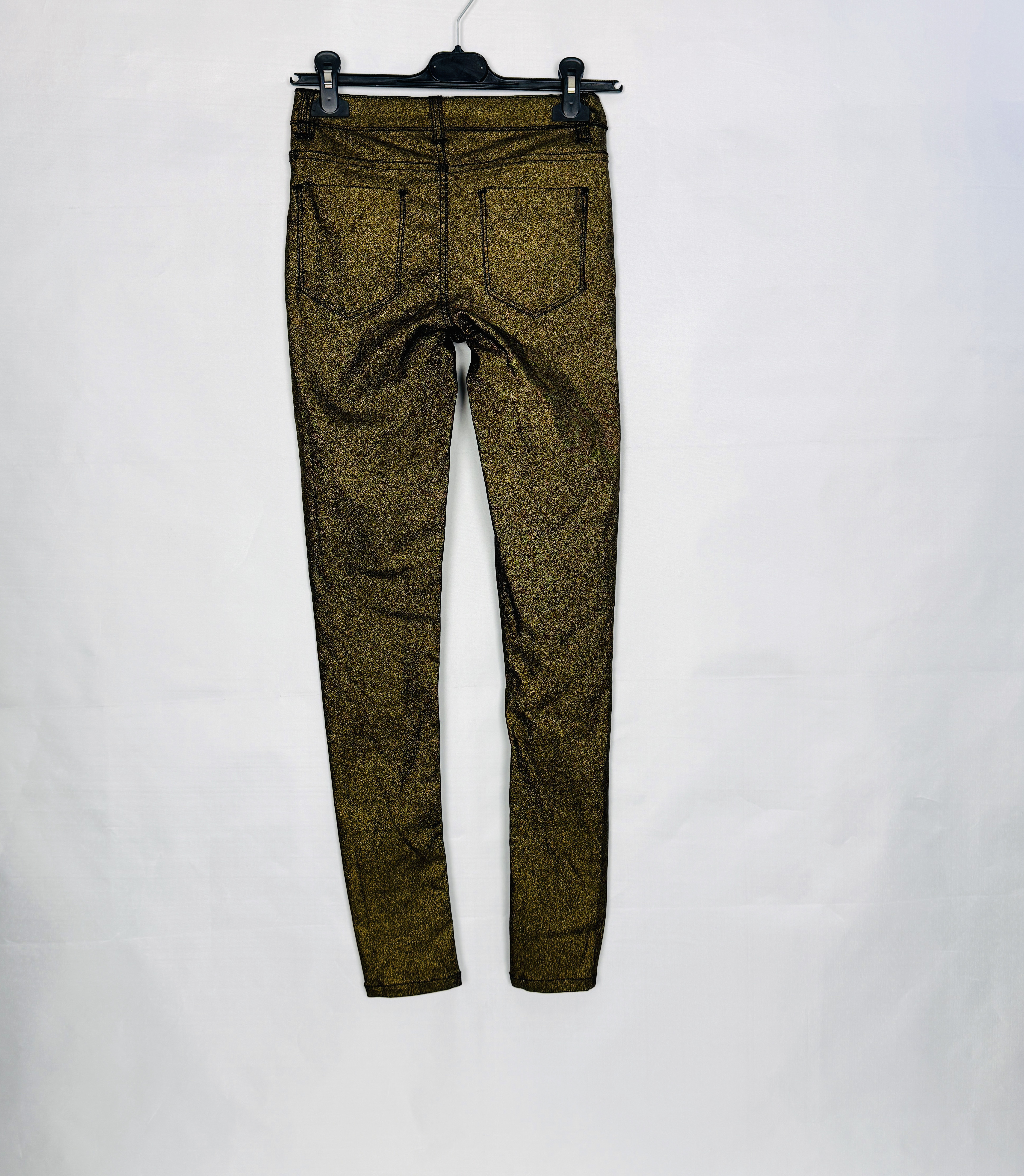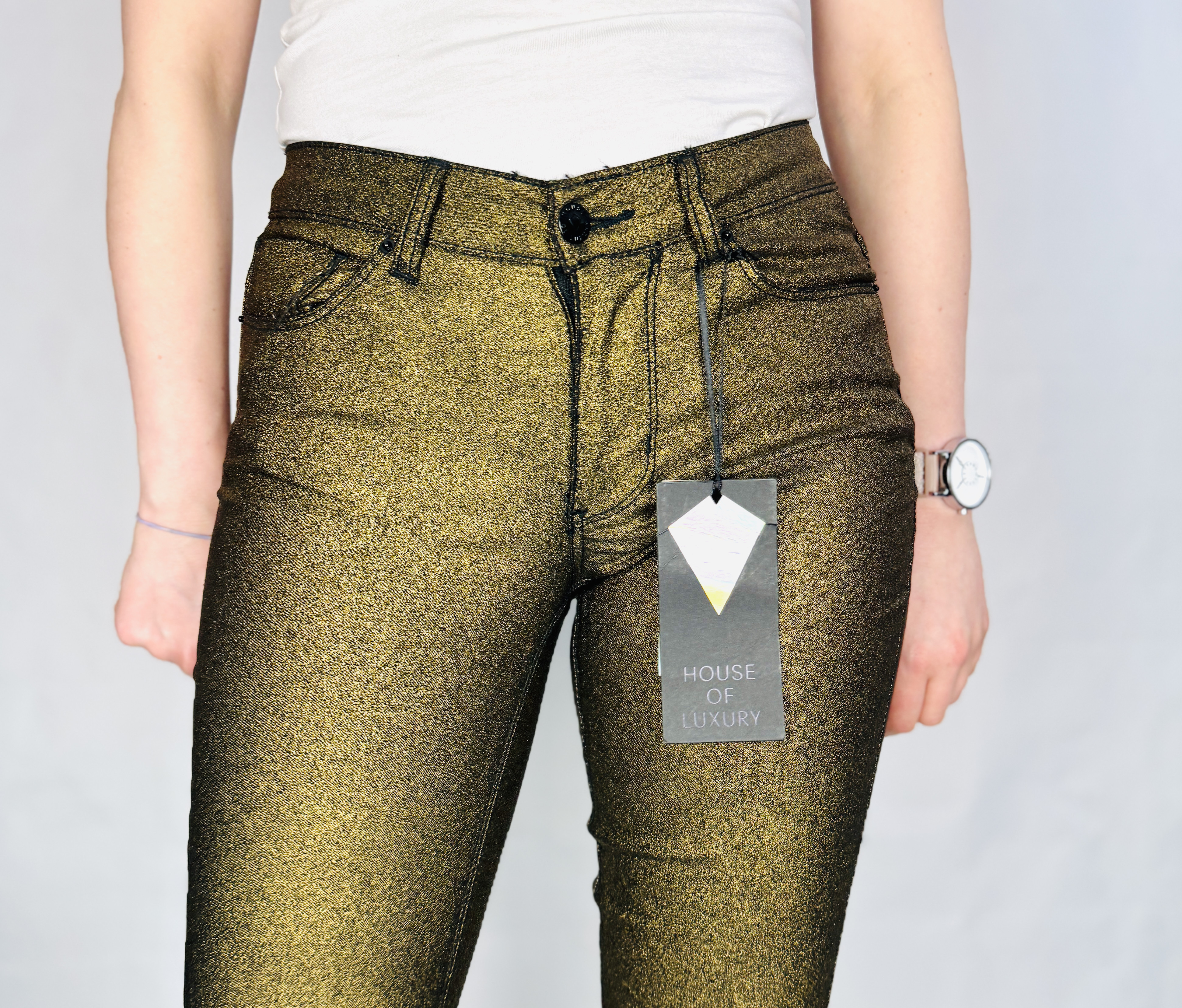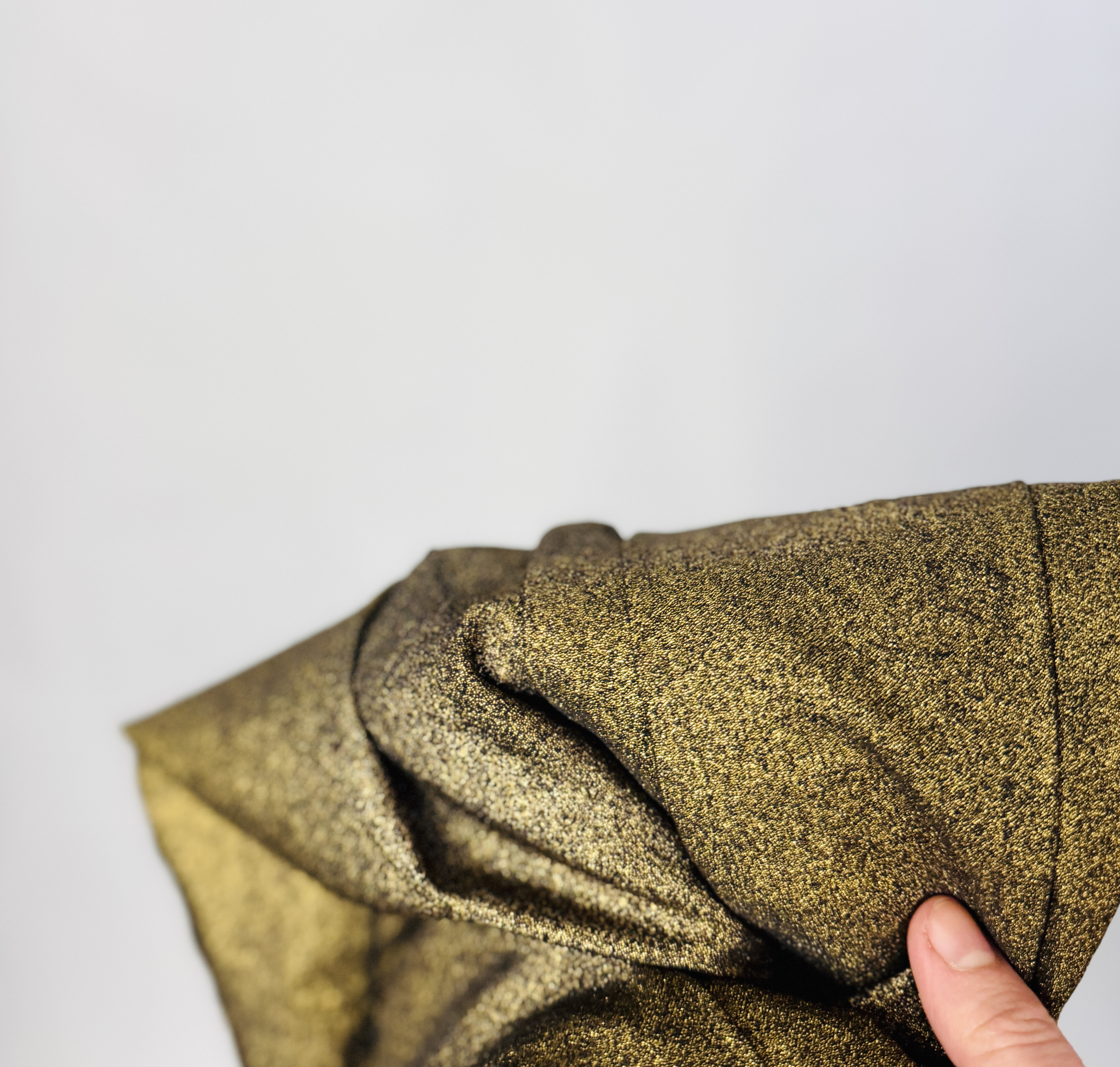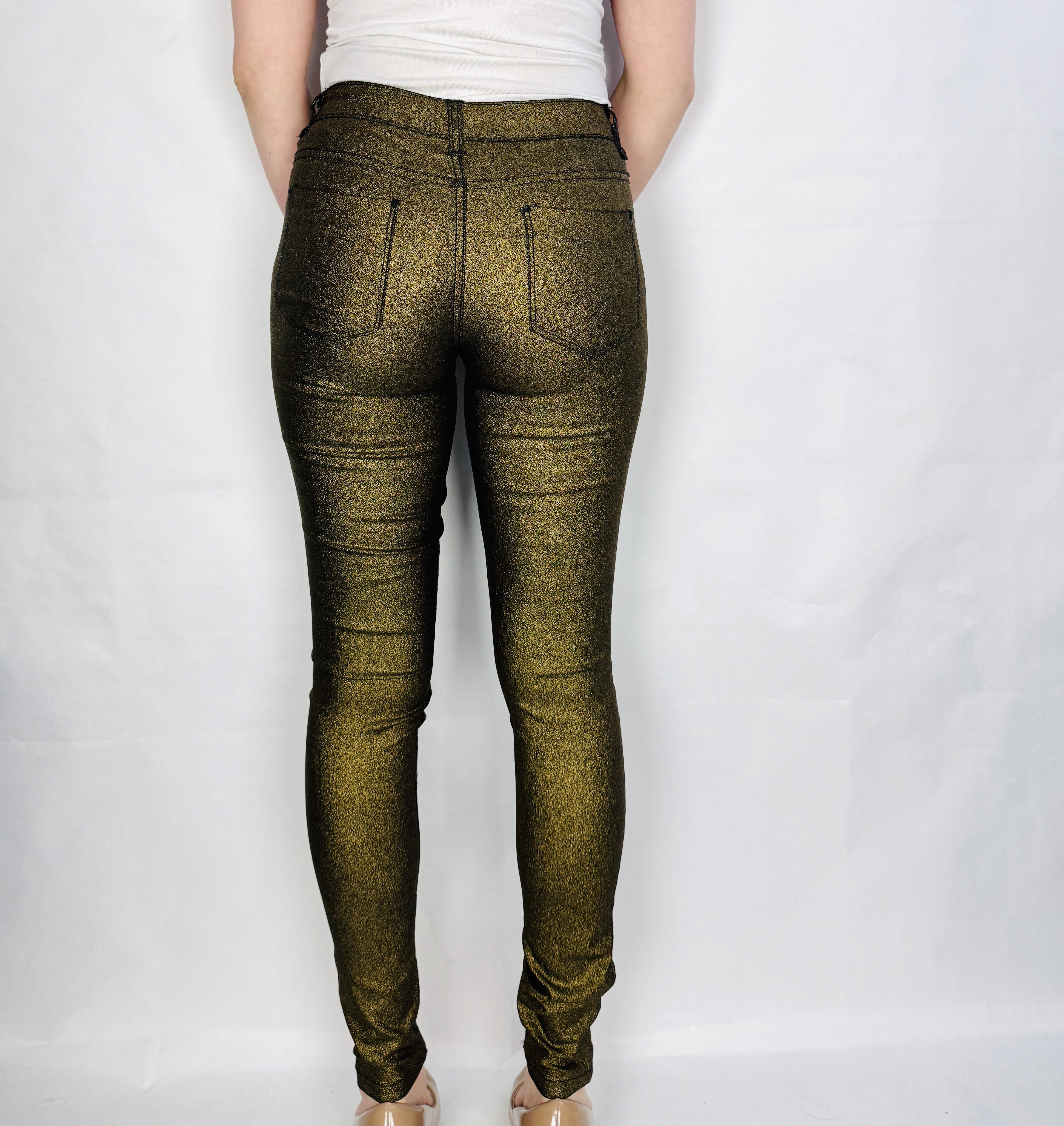 Materiał ma wyraźne, metaliczne wykończenie: powierzchnia wygląda na lekko połyskującą i drobnoziarnistą, co sprawia, że złoto nie jest monotonne, lecz wielowymiarowe i subtelnie gra światłem. Tkanina wydaje się elastyczna i gładko układająca się przy ciele, zapewniając komfort noszenia oraz dopasowanie do kształtów, przy jednoczesnym zachowaniu zwartej formy w górnych partiach. Dzięki temu spodnie nabierają efektu „druga skóra”, który podkreśla linie ciała bez dodawania zbędnej objętości.