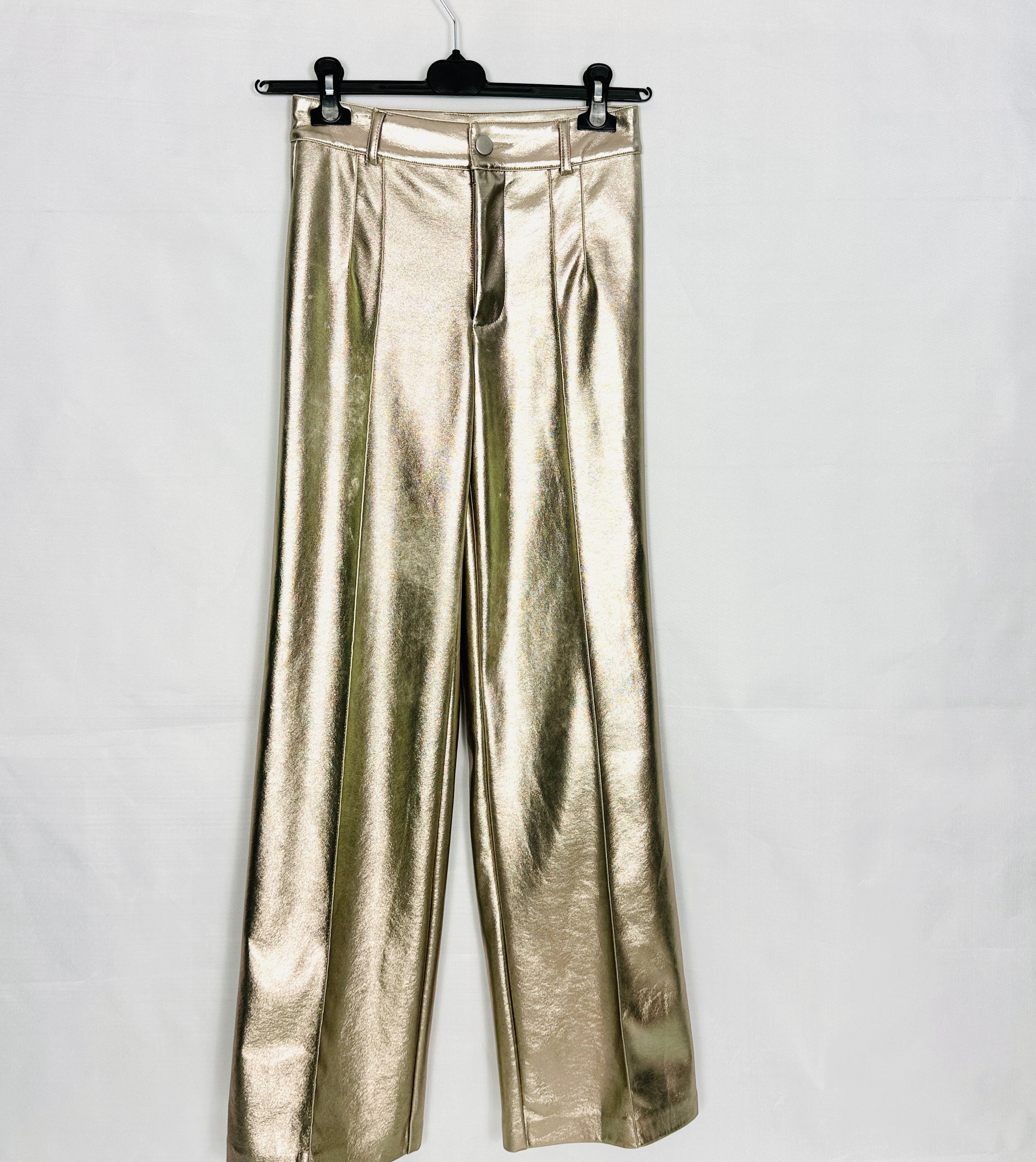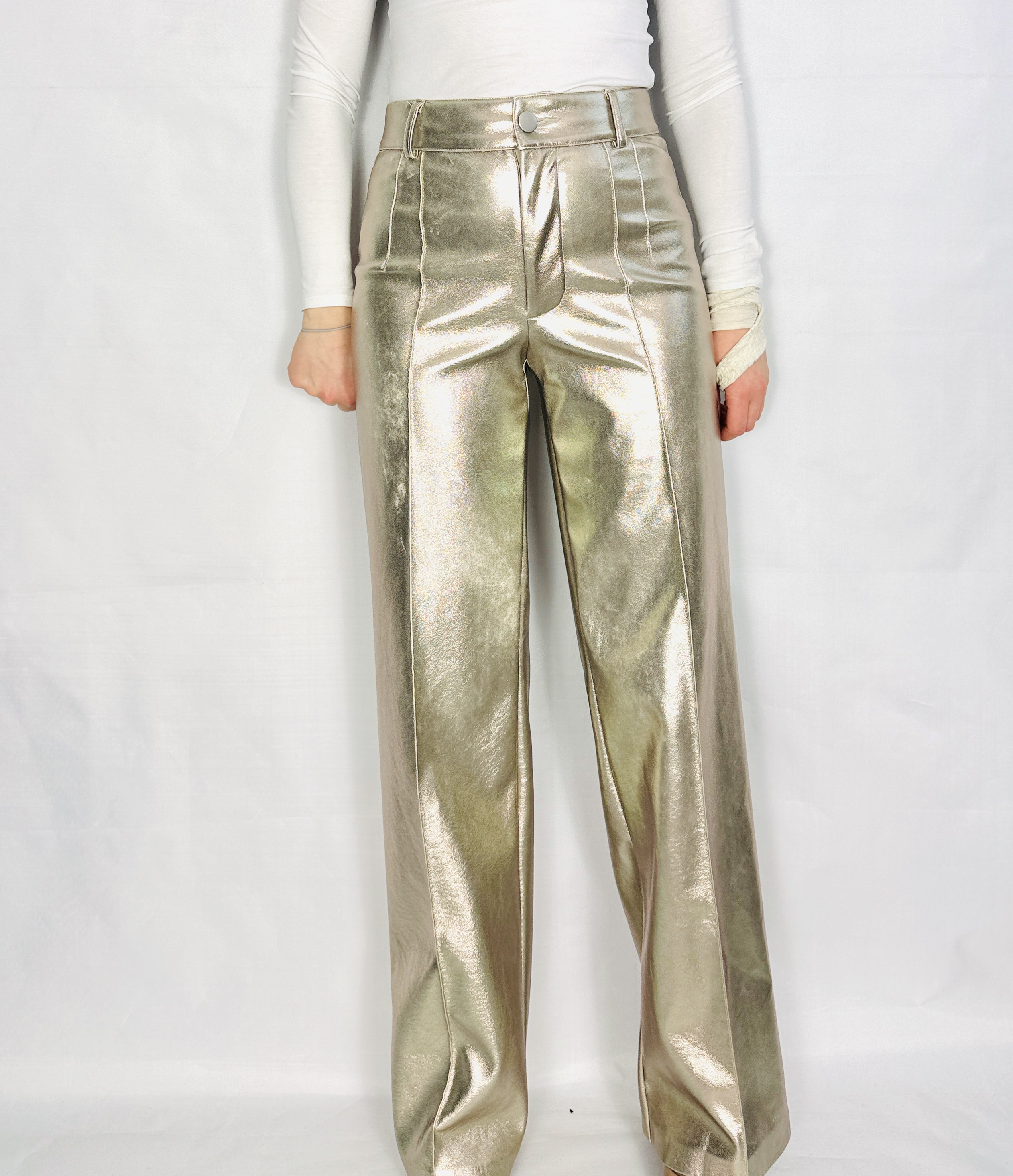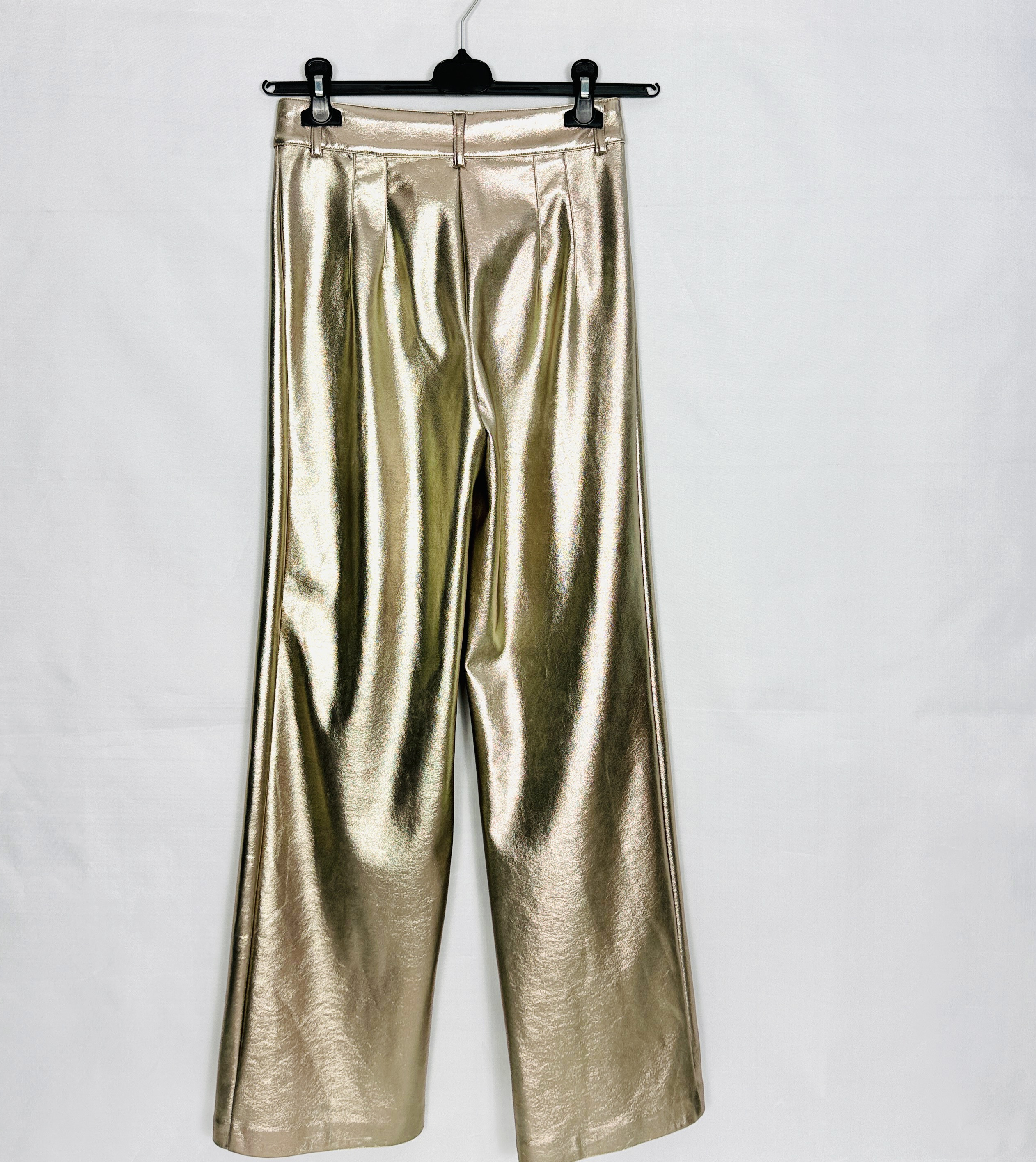 Te spodnie to odważna, a zarazem wyrafinowana interpretacja wieczorowego szyku — ciepły, metaliczny odcień złota łączy się tu z gładkim, lekko lśniącym wykończeniem, tworząc efektowną, lecz elegancką całość. Mają w sobie teatralną nutę glamour, ale zachowują harmonijną prostotę kroju, dzięki czemu sprawdzą się jako wyrazisty punkt stylizacji bez przesady. To para dla kobiety, która lubi błyszczeć w subtelny, przemyślany sposób i szuka spodni nadających charakteru specjalnym okazjom.