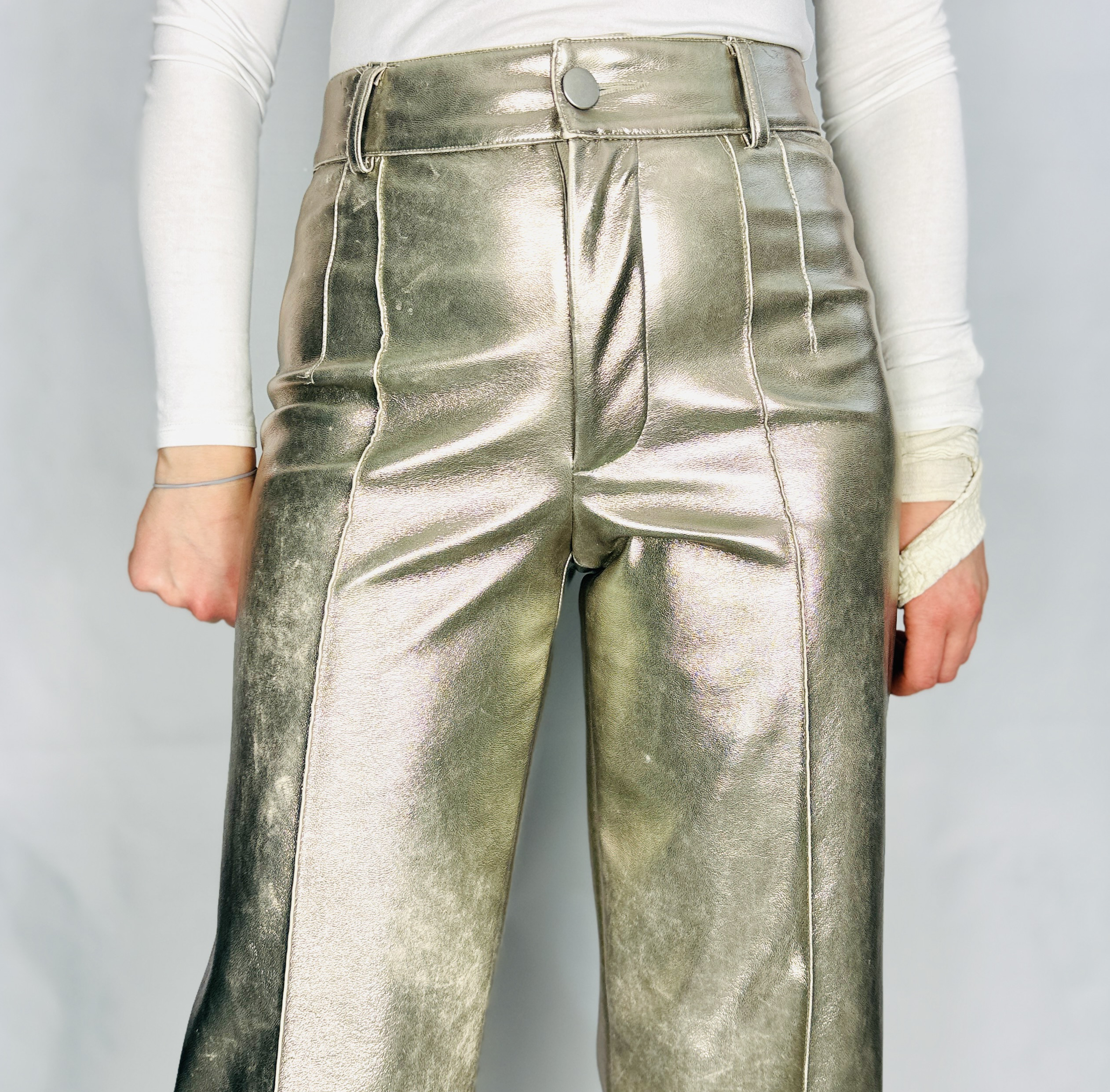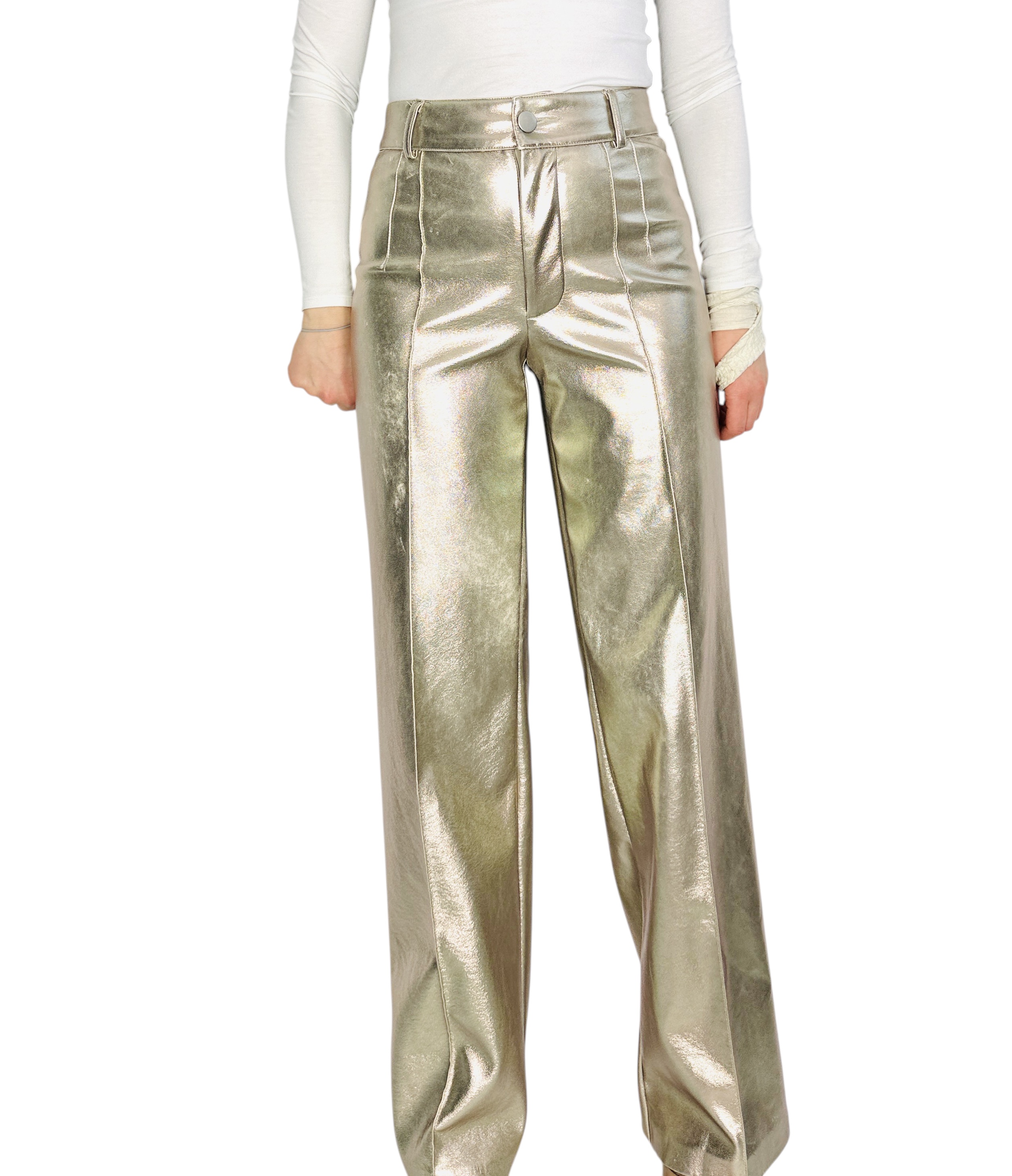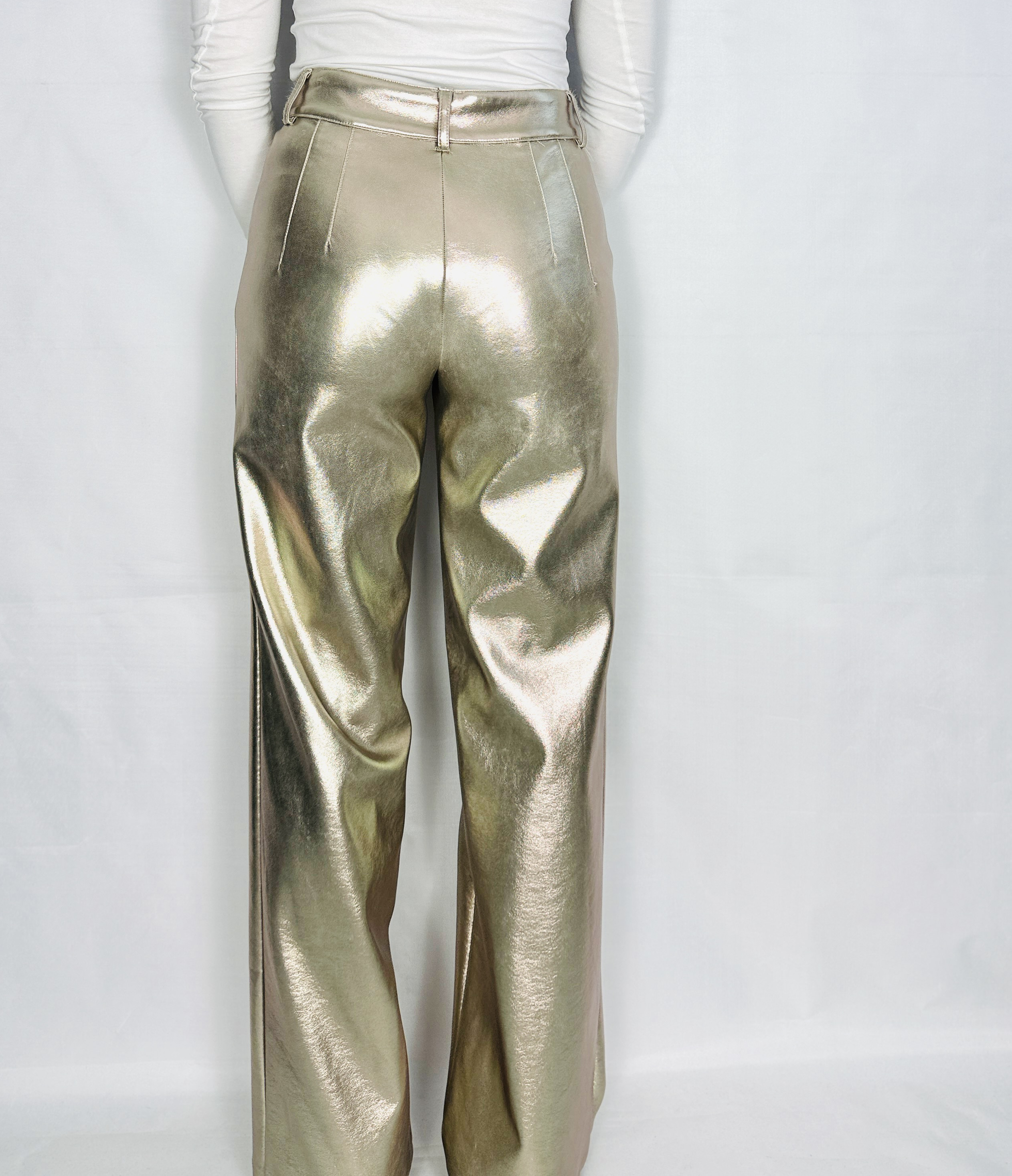 Te spodnie to odważna, a zarazem wyrafinowana interpretacja wieczorowego szyku — ciepły, metaliczny odcień złota łączy się tu z gładkim, lekko lśniącym wykończeniem, tworząc efektowną, lecz elegancką całość. Mają w sobie teatralną nutę glamour, ale zachowują harmonijną prostotę kroju, dzięki czemu sprawdzą się jako wyrazisty punkt stylizacji bez przesady. To para dla kobiety, która lubi błyszczeć w subtelny, przemyślany sposób i szuka spodni nadających charakteru specjalnym okazjom.