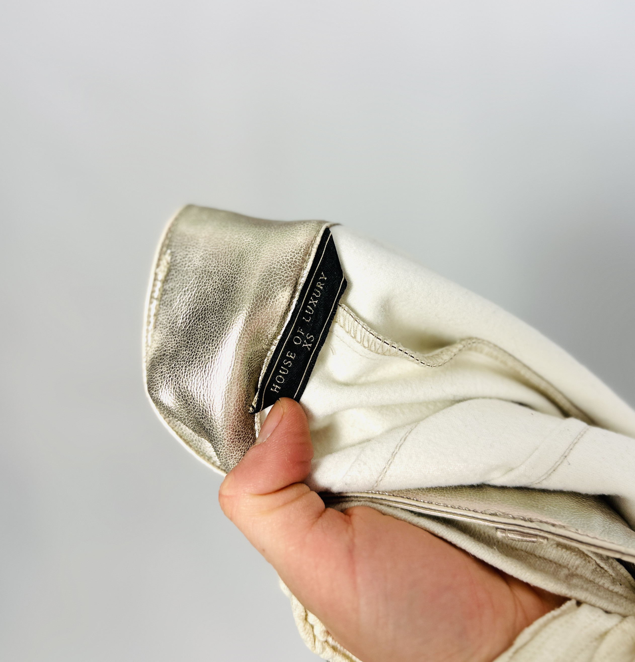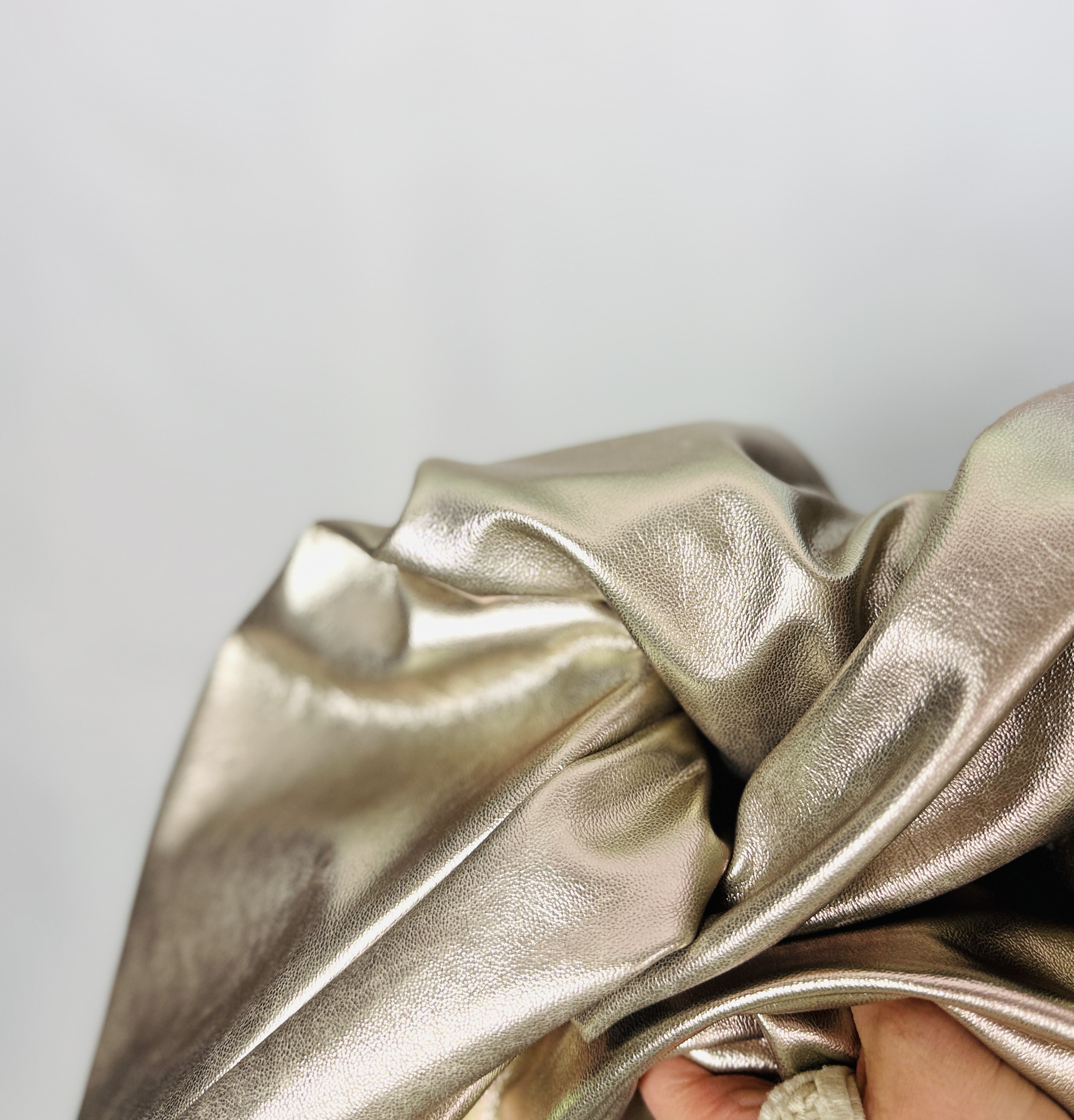 Materiał prezentuje się jako gładki, skórzany w odbiorze, z wyraźnym metalicznym połyskiem — powierzchnia mieni się ciepłymi tonami złota i delikatnie odbija światło, co dodaje całości szlachetności. Tkanina wygląda na trzymającą fason, lecz jednocześnie na tyle miękką, że podąża za ruchem, co widać po naturalnych zagięciach w miejscach zgięć. Ten połysk nie dominuje formy, lecz subtelnie podkreśla linie kroju, tworząc elegancki, wieczorowy efekt.