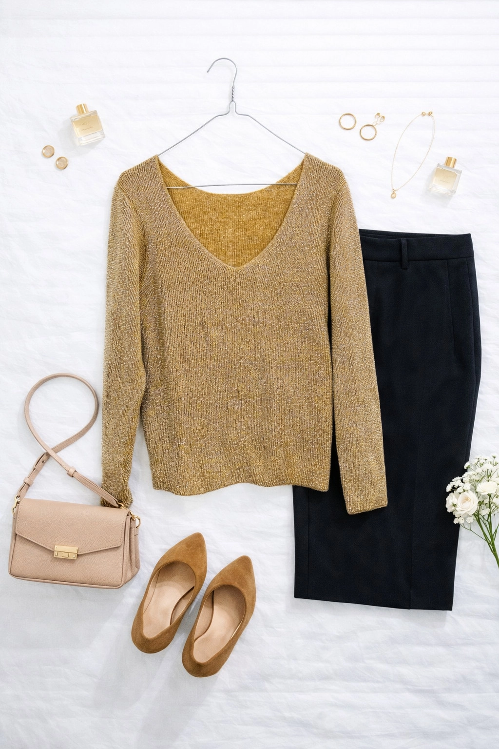 Długość sweterka sięga do linii bioder, co czyni go niezwykle uniwersalnym elementem stroju na różnorodne okazje. Wyśmienicie prezentuje się w kontrastowym zestawieniu z dopasowanymi czarnymi spodniami rurkami, co tworzy wysmukloną i pełną klasy sylwetkę, w której złoty kolor staje się głównym bohaterem stylizacji. Równie efektownie zaprezentuje się w towarzystwie klasycznej spódnicy ołówkowej ze skóry, co nada całości drapieżnego, a zarazem luksusowego wyrazu. Złoty blask sweterka nie wymaga dużej ilości dodatków – wystarczą minimalistyczne kolczyki, aby stworzyć kompletny, pełen klasy look. To produkt idealny na uroczystą kolację, spotkanie z przyjaciółmi czy wieczorne wyjście, gdzie pragniesz lśnić autentycznym, modowym stylem.