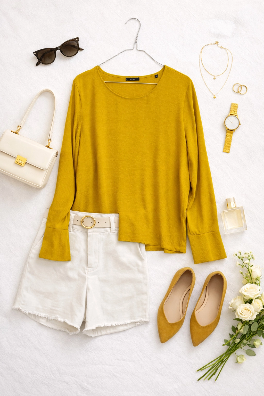 W codziennych stylizacjach żółta bluzka stworzy energetyczny i stylowy duet z klasycznymi czarnymi spodniami lub ciemnymi jeansami, co pozwoli w pełni wyeksponować jej nasycony kolor. Do pracy warto zestawić ją z eleganckimi cygaretkami w kolorze szarym lub granatowym oraz z klasyczną marynarką, uzyskując profesjonalny, a zarazem świeży wizerunek. Na wieczorne spotkanie bluzka zaprezentuje się zjawiskowo w połączeniu z białą spódnicą ołówkową i złotą biżuterią, która pięknie podkreśli ciepły odcień materiału. Żółć fantastycznie komponuje się z czernią, bielą, szarością oraz odcieniami niebieskiego, dając mnóstwo możliwości do tworzenia radosnych i pełnych klasy zestawów.