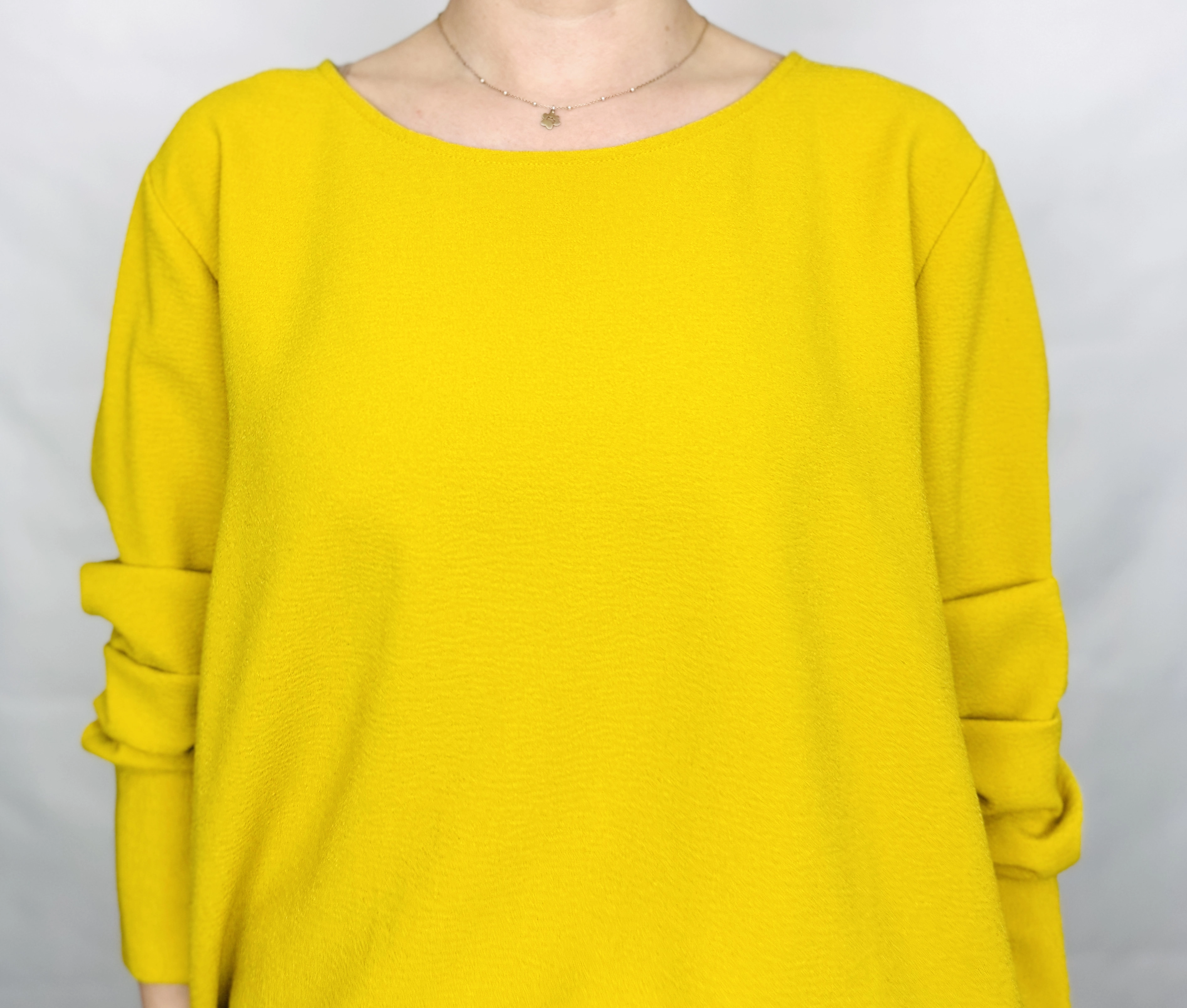 Fason bluzki charakteryzuje się swobodną, prostą linią, która miękko opływa sylwetkę, zapewniając pełną wygodę i nienaganny wygląd przez cały dzień. Szeroki, okrągły dekolt subtelnie eksponuje linię obojczyków, dodając całości kobiecego wdzięku. Długie, luźne rękawy o obniżonej linii ramion nadają ubraniu nowoczesny, nieco oversize'owy sznyt, a ich wykończenie pozwala na swobodne podwinięcie, co dodaje stylizacji luzu. Materiał posiada ciekawą, ziarnistą strukturę, która jest nieco grubsza i stabilna, dzięki czemu bluzka zachowuje swój elegancki kształt, a jednocześnie pozostaje miękka i przyjemna w dotyku.