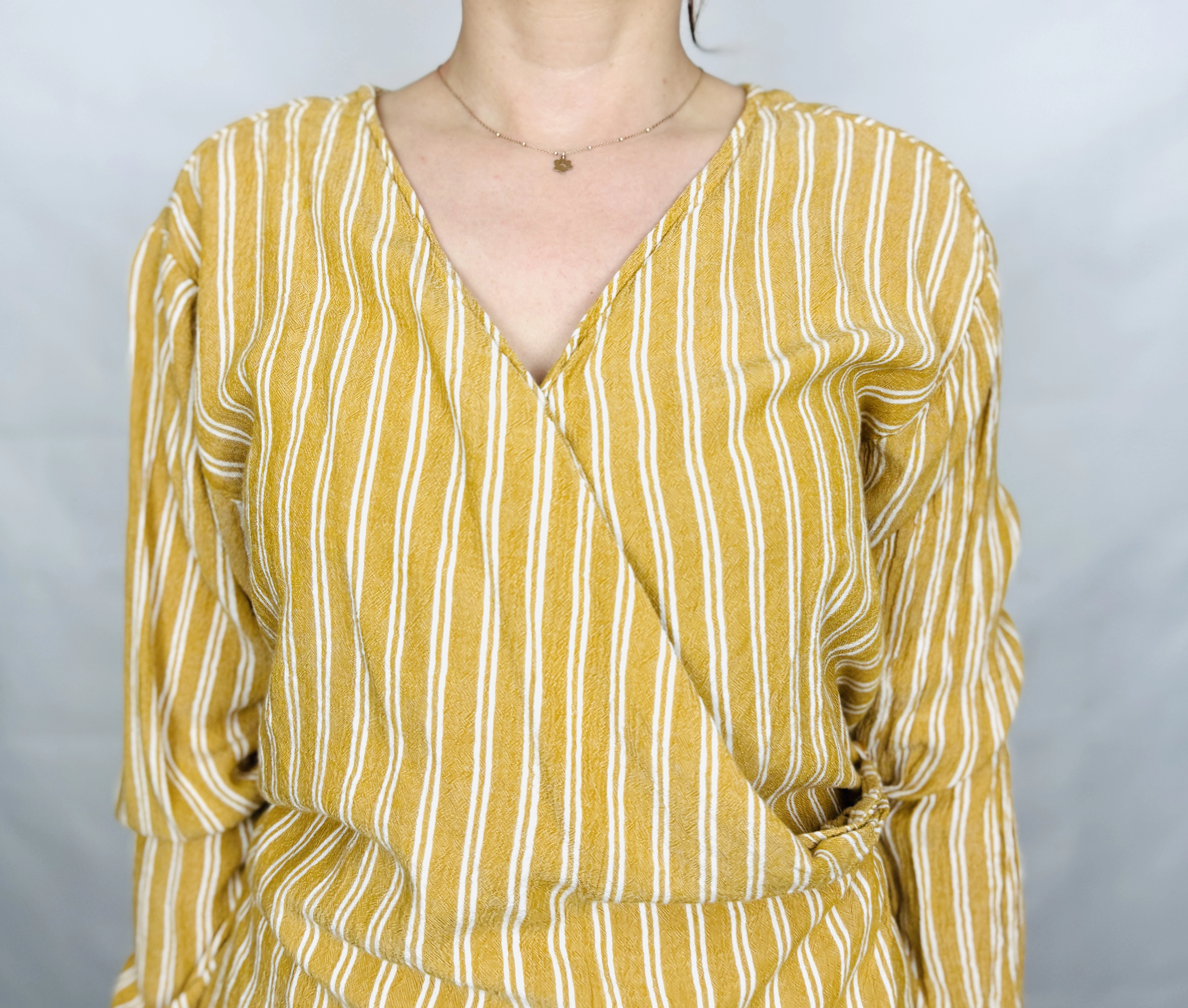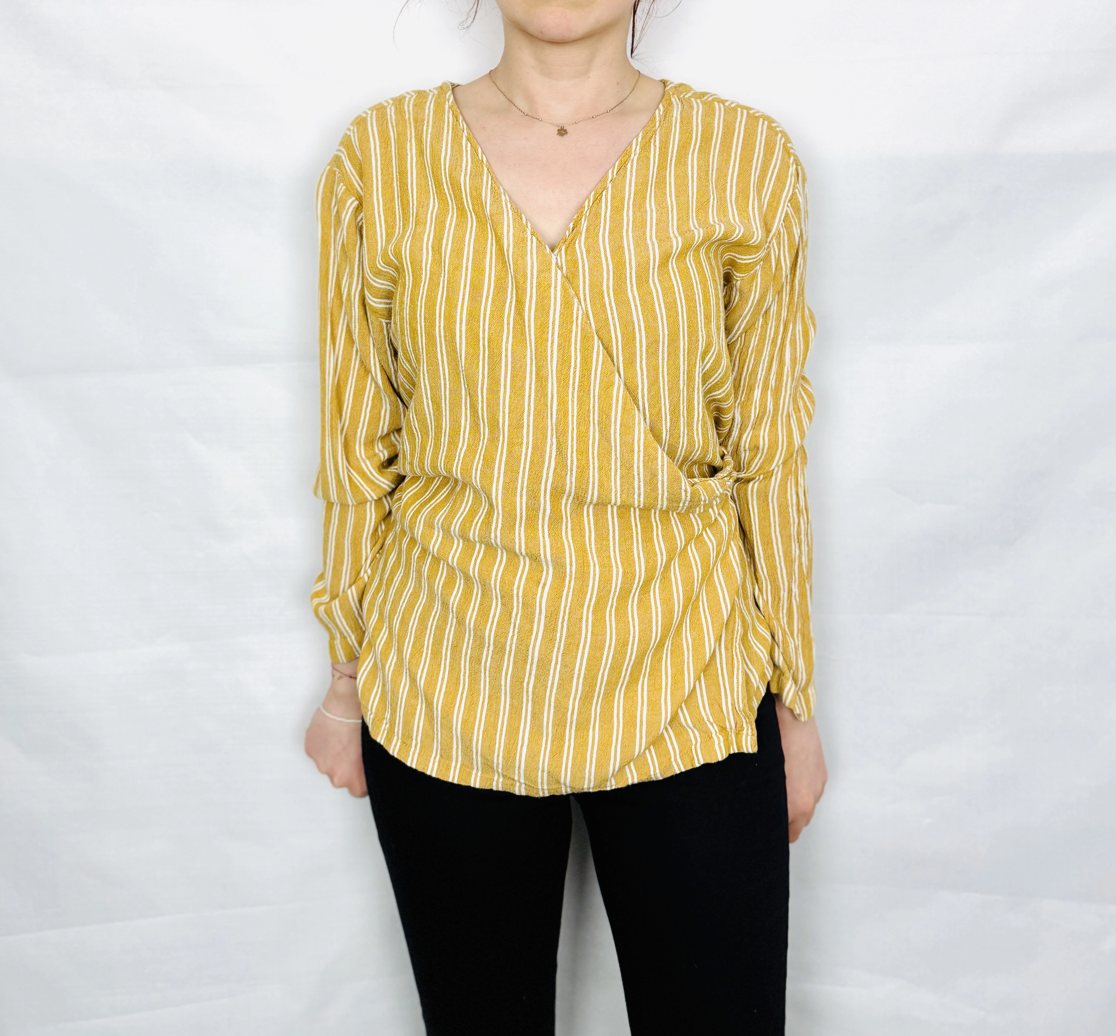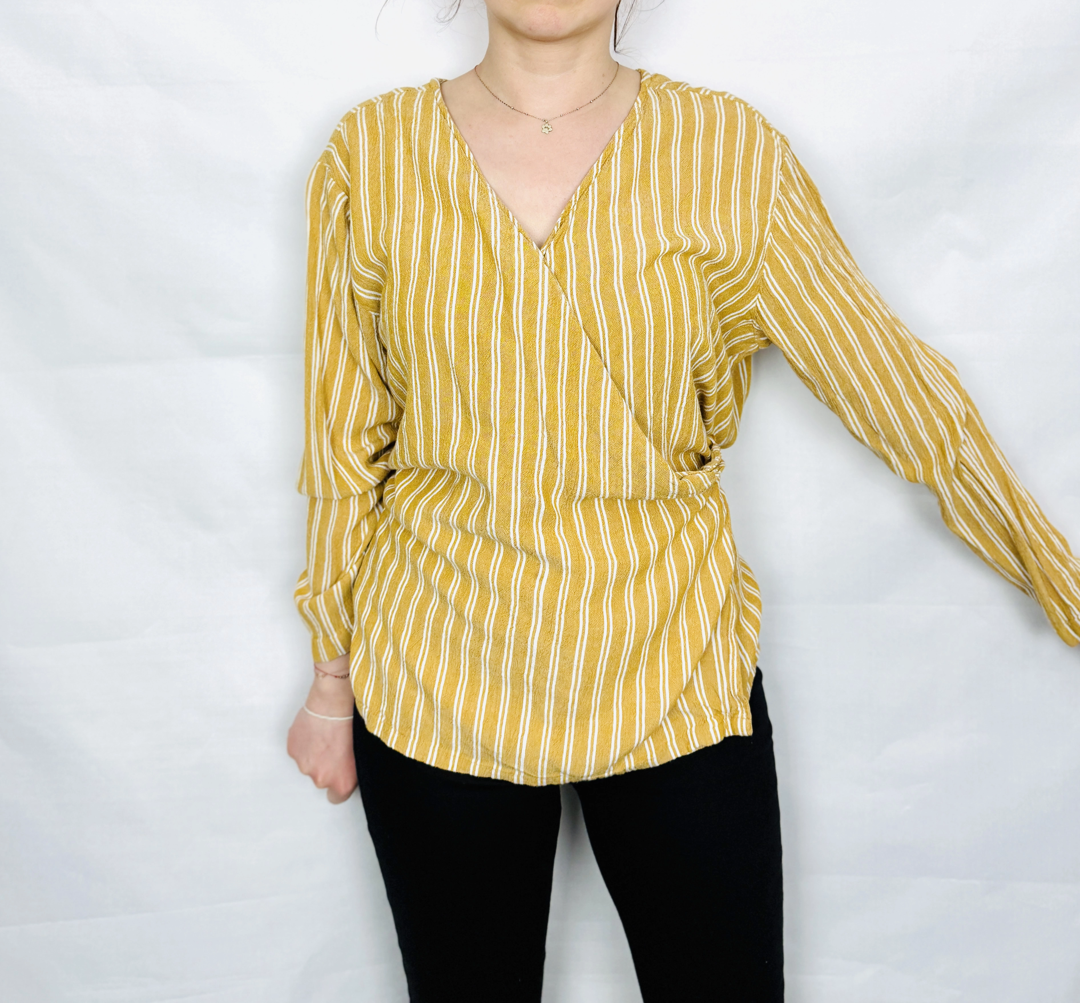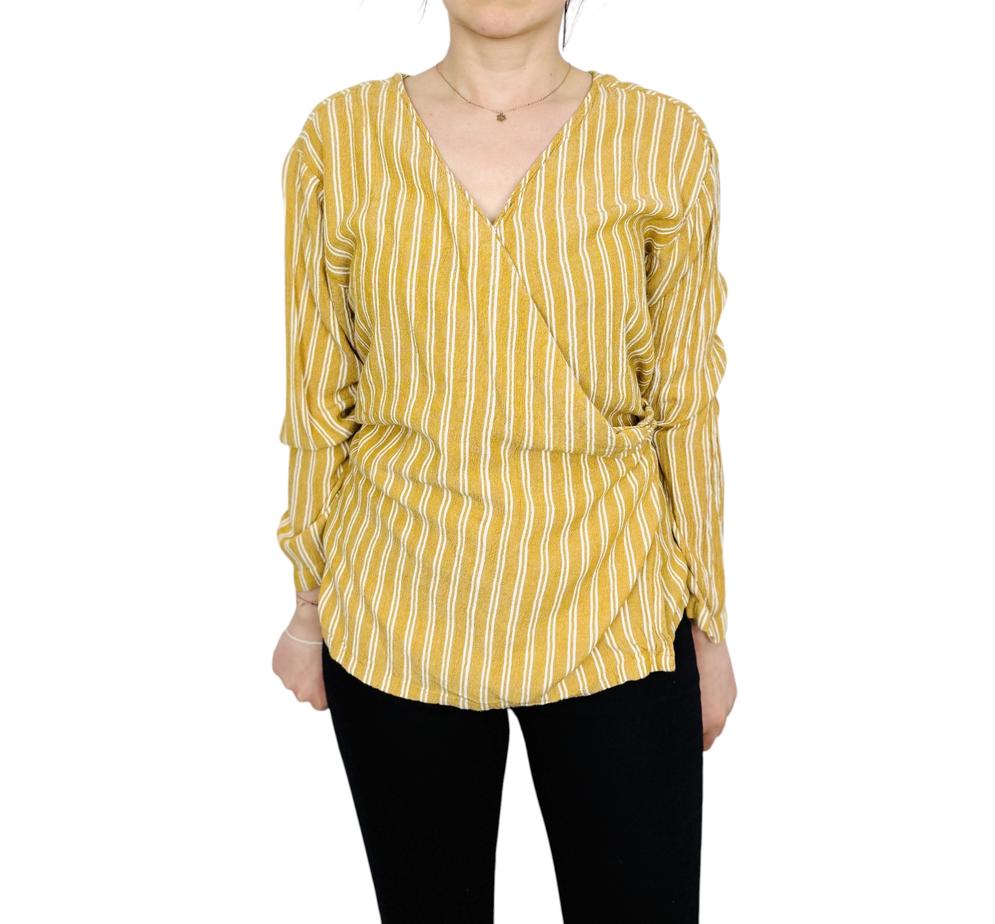 Pionowe paski działają bardzo korzystnie na sylwetkę – optycznie ją wydłużają i wysmuklają, co sprawia, że całość prezentuje się bardzo proporcjonalnie. Kopertowy fason dodatkowo podkreśla talię, nadając figurze bardziej zarysowanych kształtów. To krój szczególnie polecany dla sylwetek typu prostokąt oraz klepsydra, ponieważ pomaga wydobyć naturalne proporcje i dodać sylwetce lekkości. Długość sięgająca do bioder sprawia, że bluzka dobrze współgra zarówno z dopasowanymi, jak i luźniejszymi elementami garderoby.
