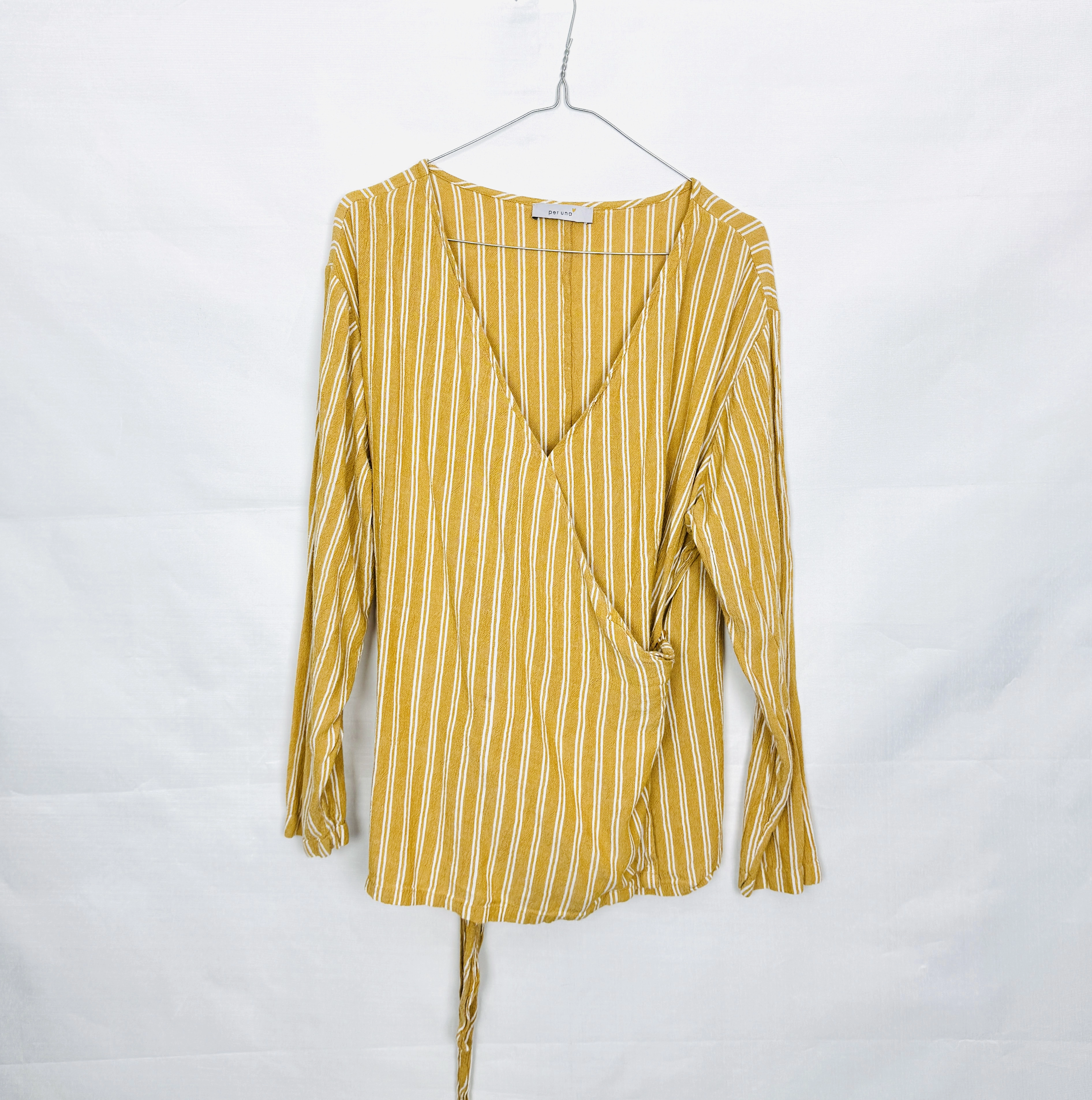 Fason bluzki opiera się na kopertowym kroju, który pięknie układa się na sylwetce i nadaje jej miękkości. Dekolt w kształcie litery V subtelnie podkreśla linię szyi oraz obojczyki, optycznie wydłużając górną partię ciała. Długie rękawy mają swobodny, lekko luźny charakter, co dodatkowo podkreśla komfort noszenia. W talii widoczne jest delikatne marszczenie, które nadaje całości bardziej kobiecego kształtu i sprawia, że materiał naturalnie dopasowuje się do sylwetki. Tkanina jest lekka, przyjemna wizualnie i miękko układa się na ciele, tworząc efekt naturalnej lekkości.