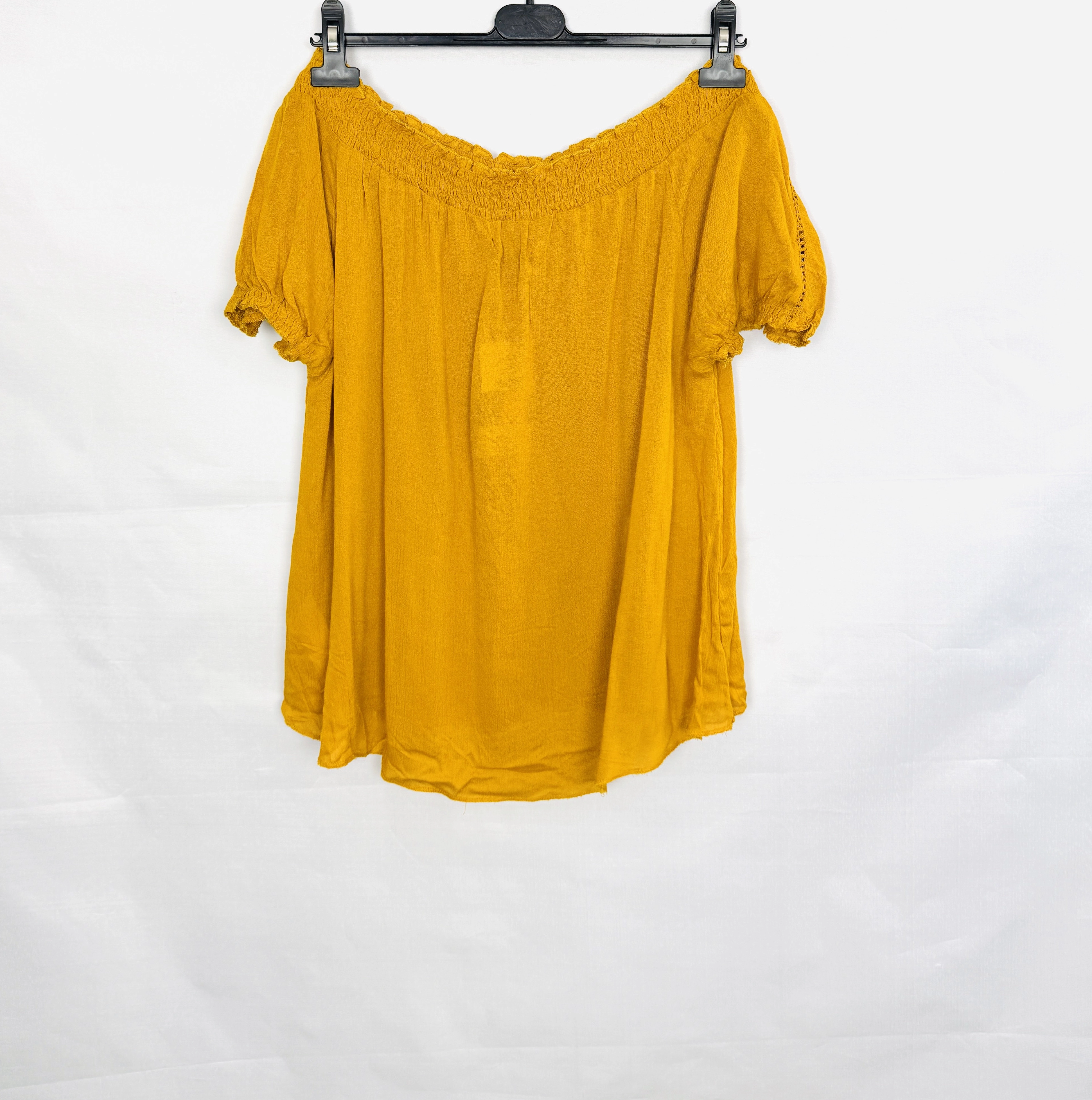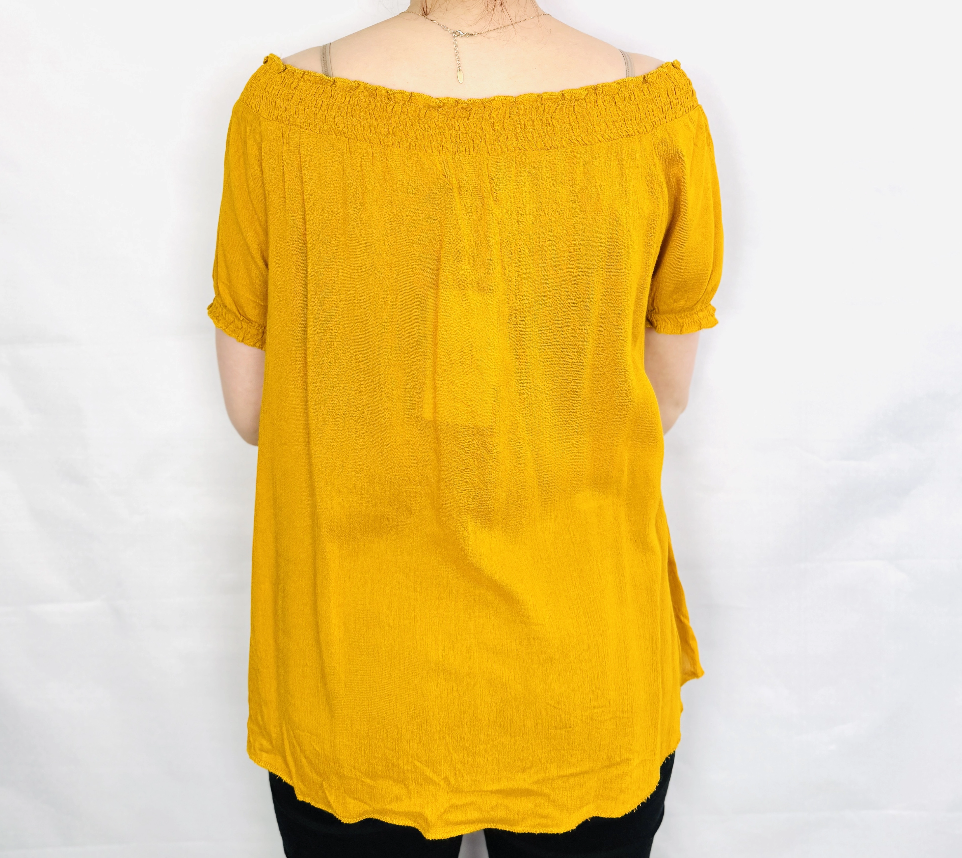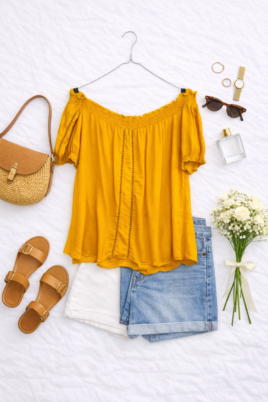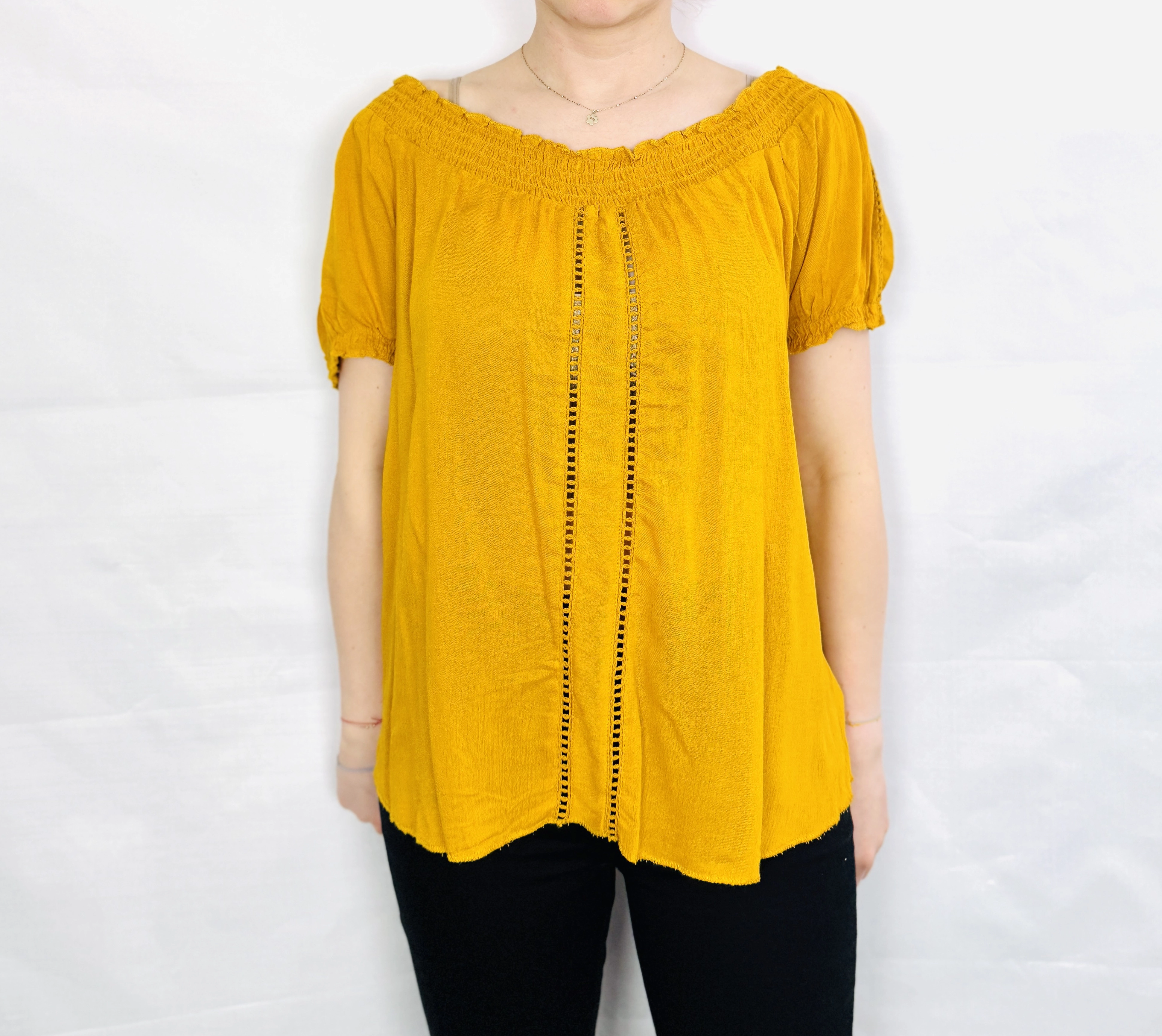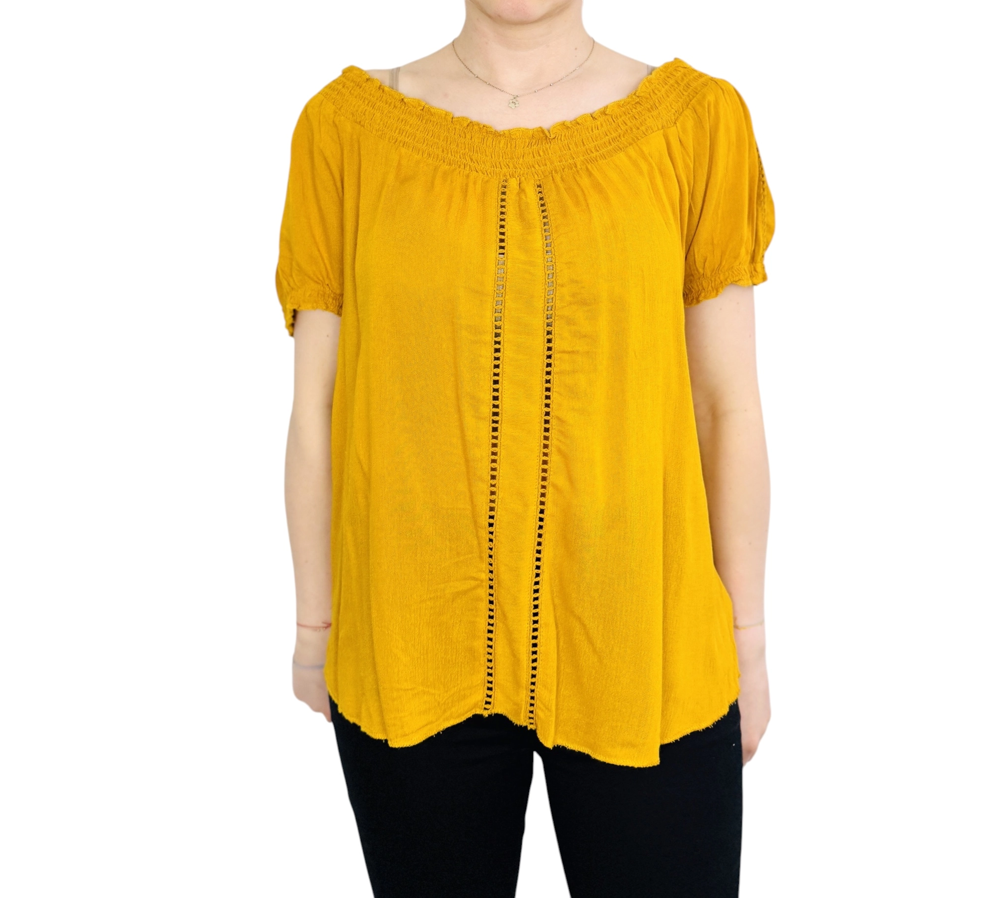 Fason bluzki charakteryzuje się luźniejszym, niezwykle komfortowym krojem, który miękko opływa sylwetkę, zapewniając pełną swobodę ruchów. Najbardziej wzrok przyciąga szeroki, elastyczny dekolt typu carmen, wykończony gęstym marszczeniem. Taka konstrukcja pozwala na subtelne wyeksponowanie linii ramion i obojczyków, co nadaje sylwetce lekkości i zmysłowego wyrazu. Krótkie rękawy, również zakończone delikatną gumką, tworzą uroczy efekt subtelnych bufek, harmonizując z górną częścią ubrania. Materiał jest lekki, przewiewny i posiada delikatną, naturalną strukturę, która sprawia, że bluzka pięknie pracuje przy każdym kroku, nie opinając ciała w newralgicznych miejscach.