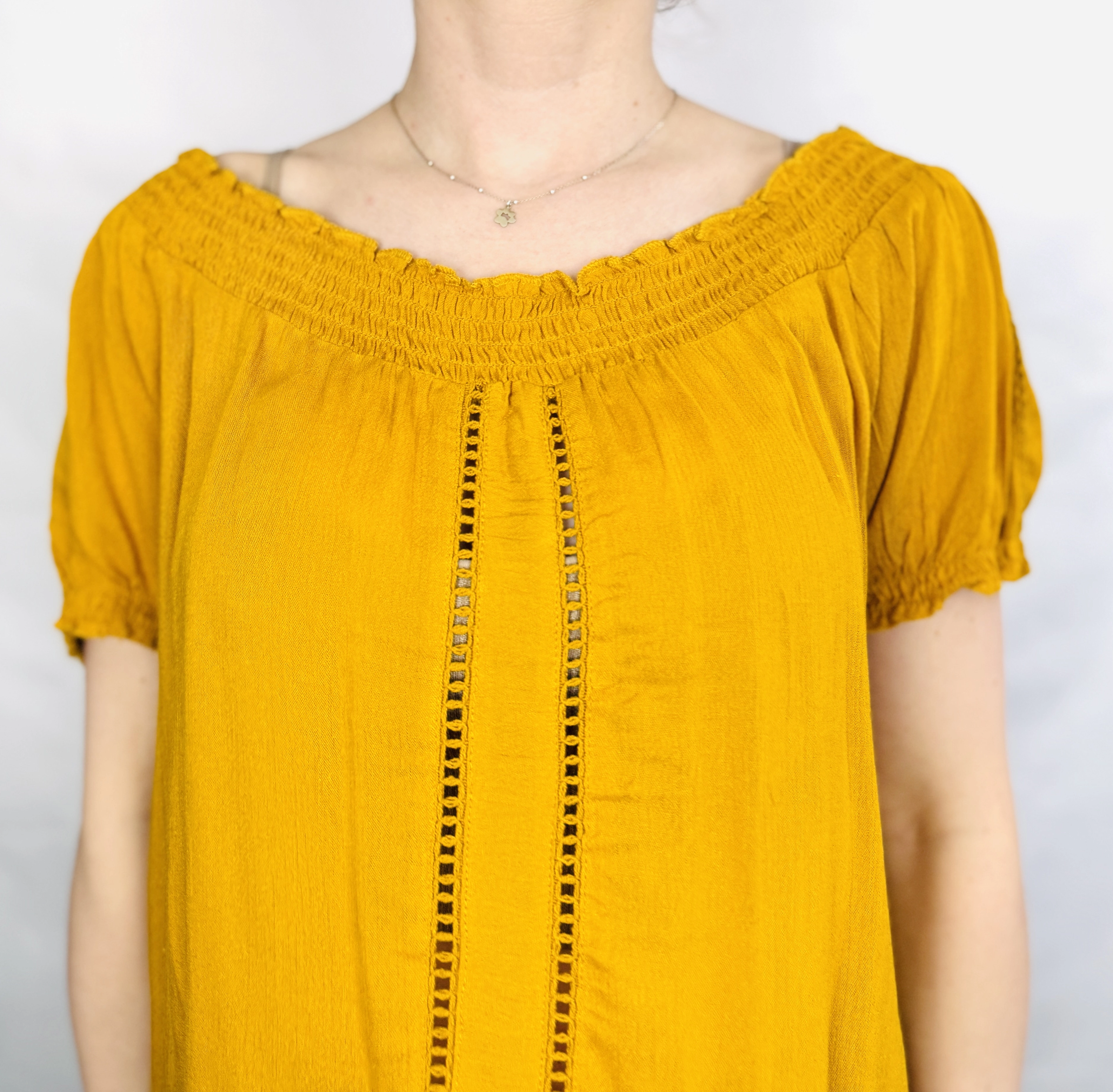 Ta wyjątkowa bluzka w odcieniu nasyconej, słonecznej żółci to kwintesencja radosnej elegancji i kobiecego wdzięku. Jej intensywny, ciepły kolor natychmiast rozświetla cerę i dodaje energii każdej stylizacji, sprawiając, że całość prezentuje się niezwykle świeżo i optymistycznie. To idealna propozycja dla kobiet, które cenią sobie ubrania z charakterem, łączące w sobie swobodę stylu boho z subtelnym, romantycznym wykończeniem. Bluzka emanuje lekkością i sprawia wrażenie niezwykle przytulnej, a jednocześnie wyrafinowanej, co czyni ją doskonałym wyborem na wiele różnorodnych okazji.