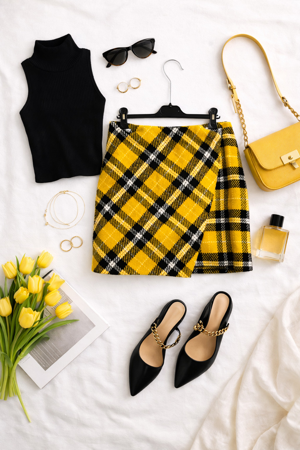 W stylizacjach spódnica daje szerokie możliwości: na co dzień zestaw ją z prostym, białym topem i trampkami lub z miękkim swetrem i botkami dla miejskiego, lekko retro looku; do pracy połącz z dopracowaną koszulą i klasycznymi półbutami, by uzyskać elegancki, ale wyrazisty zestaw; na wieczór wybierz dopasowany, ciemny top i zgrabne szpilki lub efektowne botki, które wydobędą kontrast kratki. Żółta paleta wspaniale komponuje się z czernią i bielą obecnymi w wzorze, a także z odcieniami kremu, camel, butelkowej zieleni czy bordo jako akcentami, pozwalając tworzyć zarówno stonowane, jak i bardziej zdecydowane kompozycje odpowiednie na co dzień, do pracy, na spotkanie czy na wieczór.