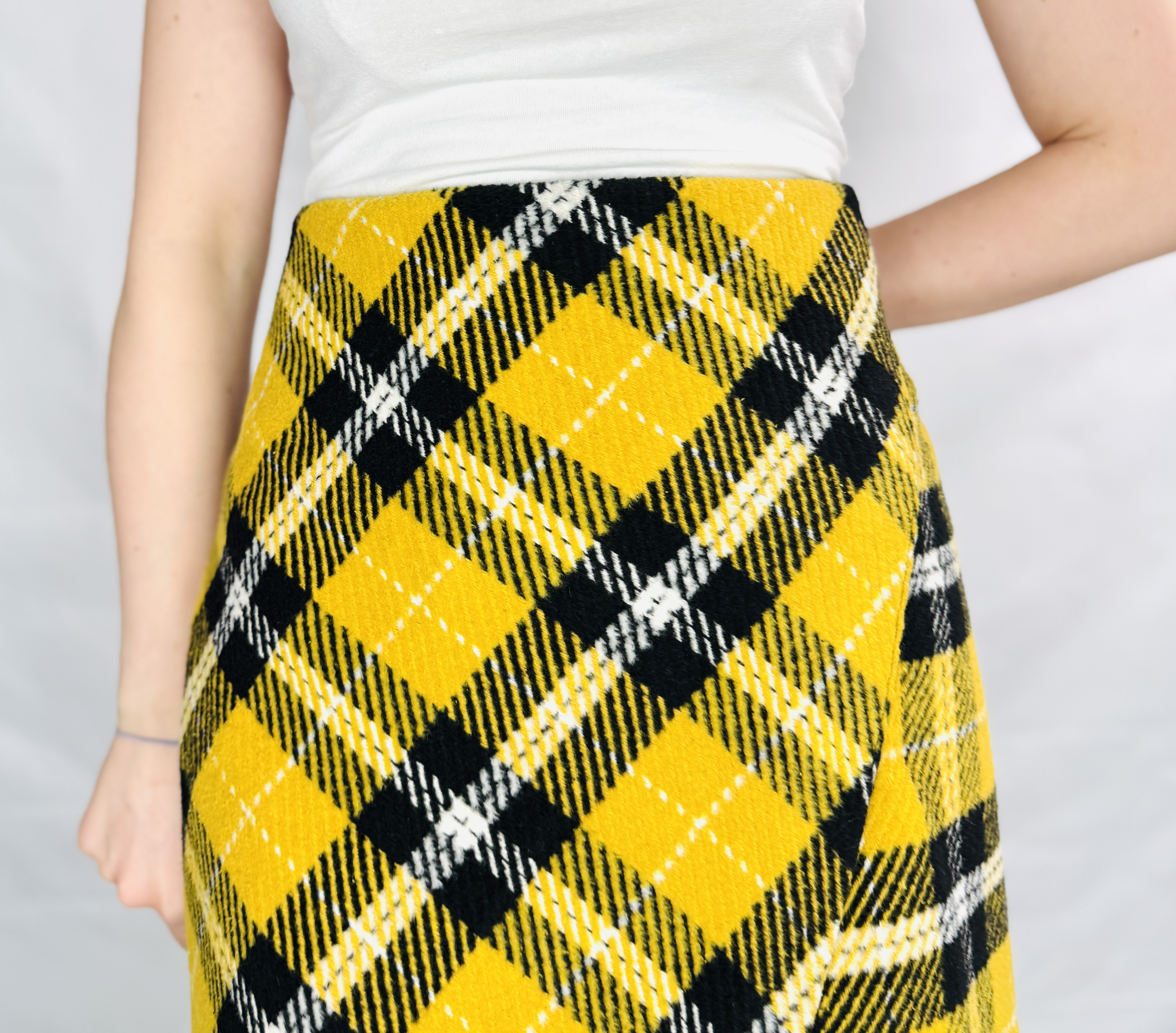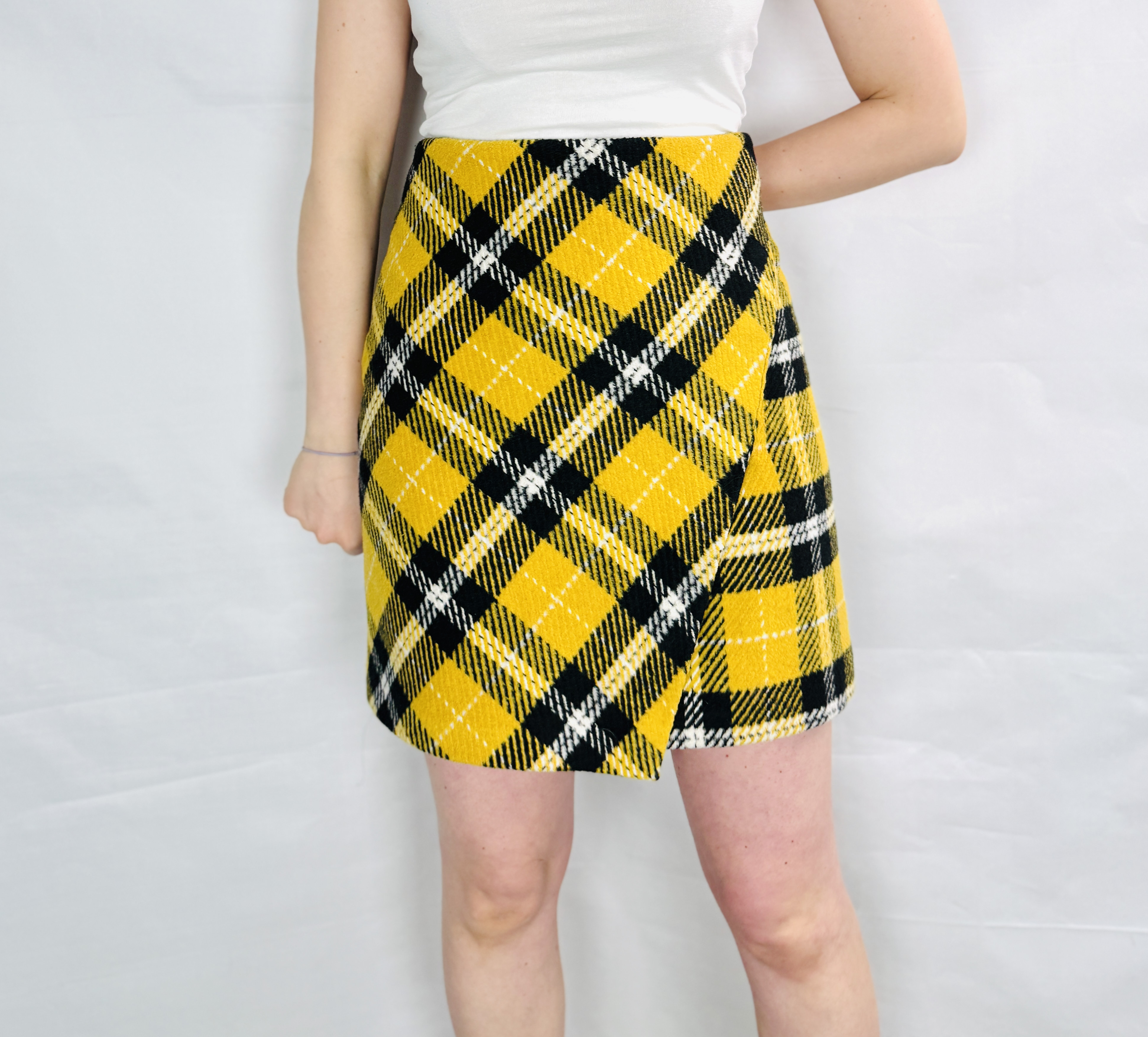 To spódnica o radosnym, a zarazem bardzo stylowym charakterze — intensywna żółć zestawiona z wyrazistą czernią i śnieżnobiałymi akcentami tworzy energetyczną kratę, która przyciąga wzrok i nadaje całości młodzieńczego, modnego wyrazu. Forma łączy w sobie klasyczne inspiracje szkockim motywem z nowoczesnym wykończeniem kopertowego przodu, dzięki czemu projekt brzmi świeżo i kobieco, jednocześnie zachowując elegancką prostotę. To model dla osób, które lubią dodać garderobie wyrazistego akcentu bez rezygnacji ze schludnej formy.