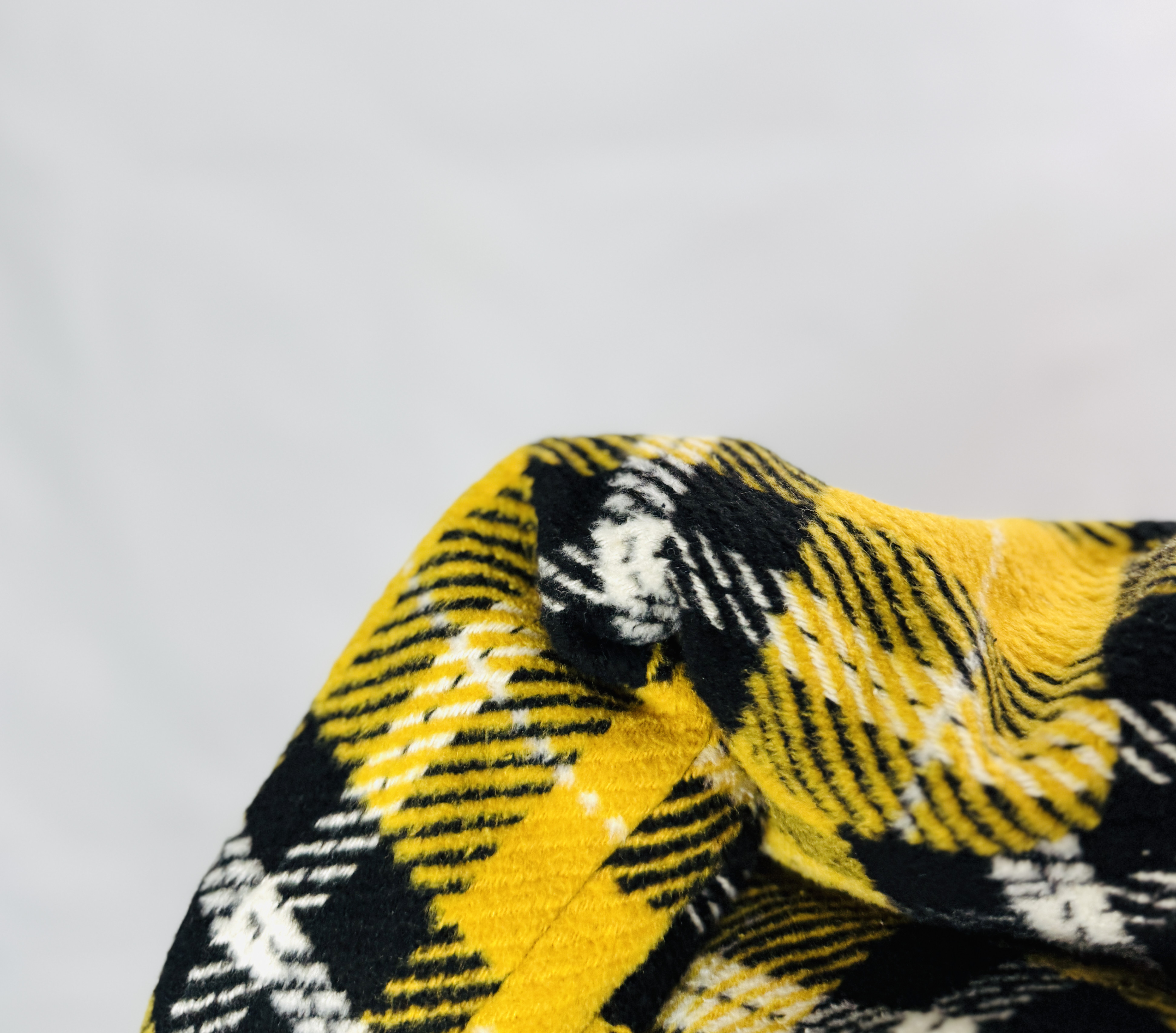 Materiał prezentuje się jako nieco grubszy i otulający, o lekko włoskowanej, matowej fakturze — tkanina trzyma formę, co pozwala na zachowanie czytelnego układu kratki, a jednocześnie daje wrażenie miękkiego, przyjemnego w dotyku wykończenia. Kontrastowe pasy i przerywane linie kratki tworzą rytm, który maskuje ewentualne nierówności i nadaje powierzchni głębi; struktura materiału dodaje projektowi jakościowego, niemal rzemieślniczego charakteru.