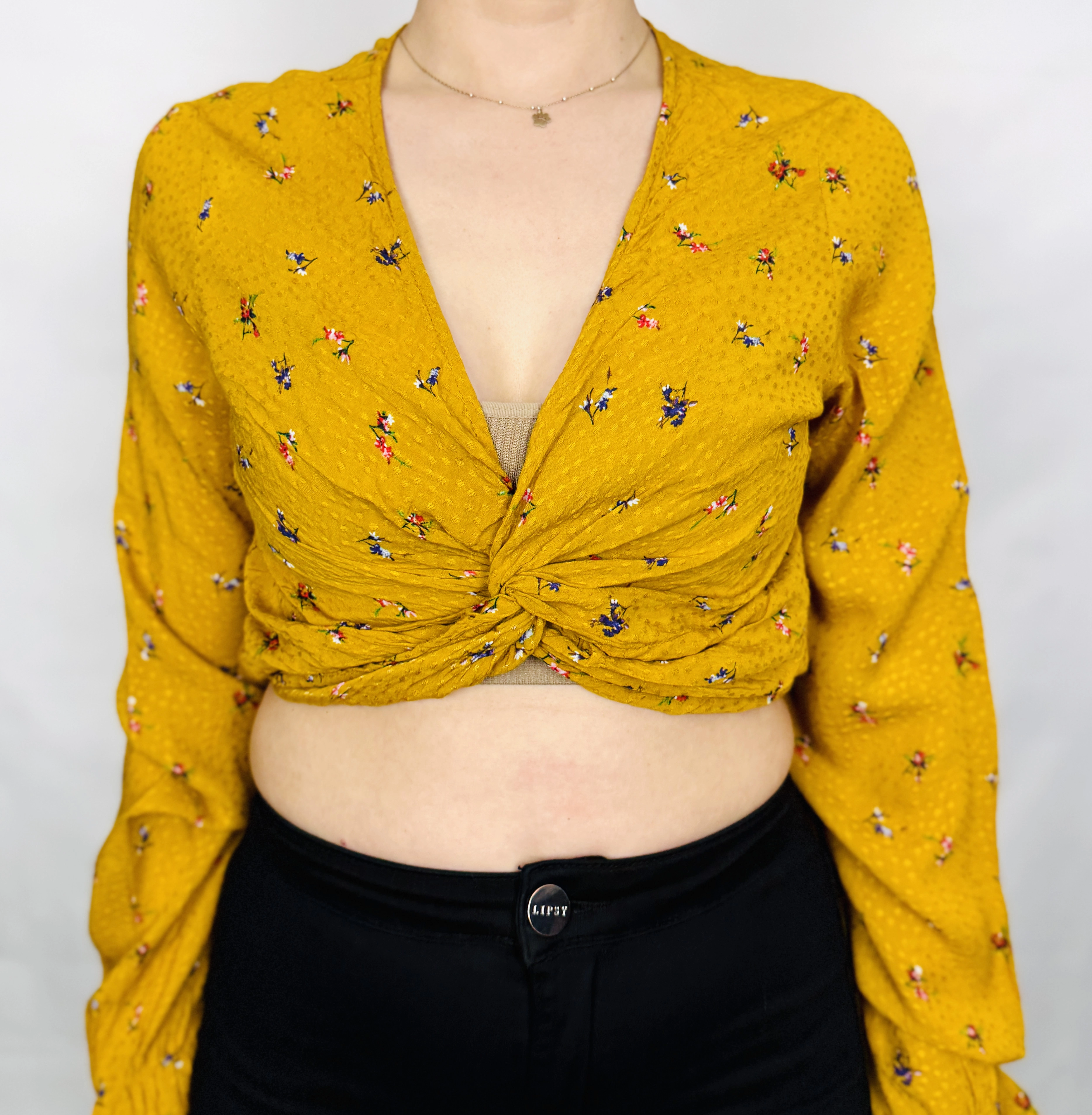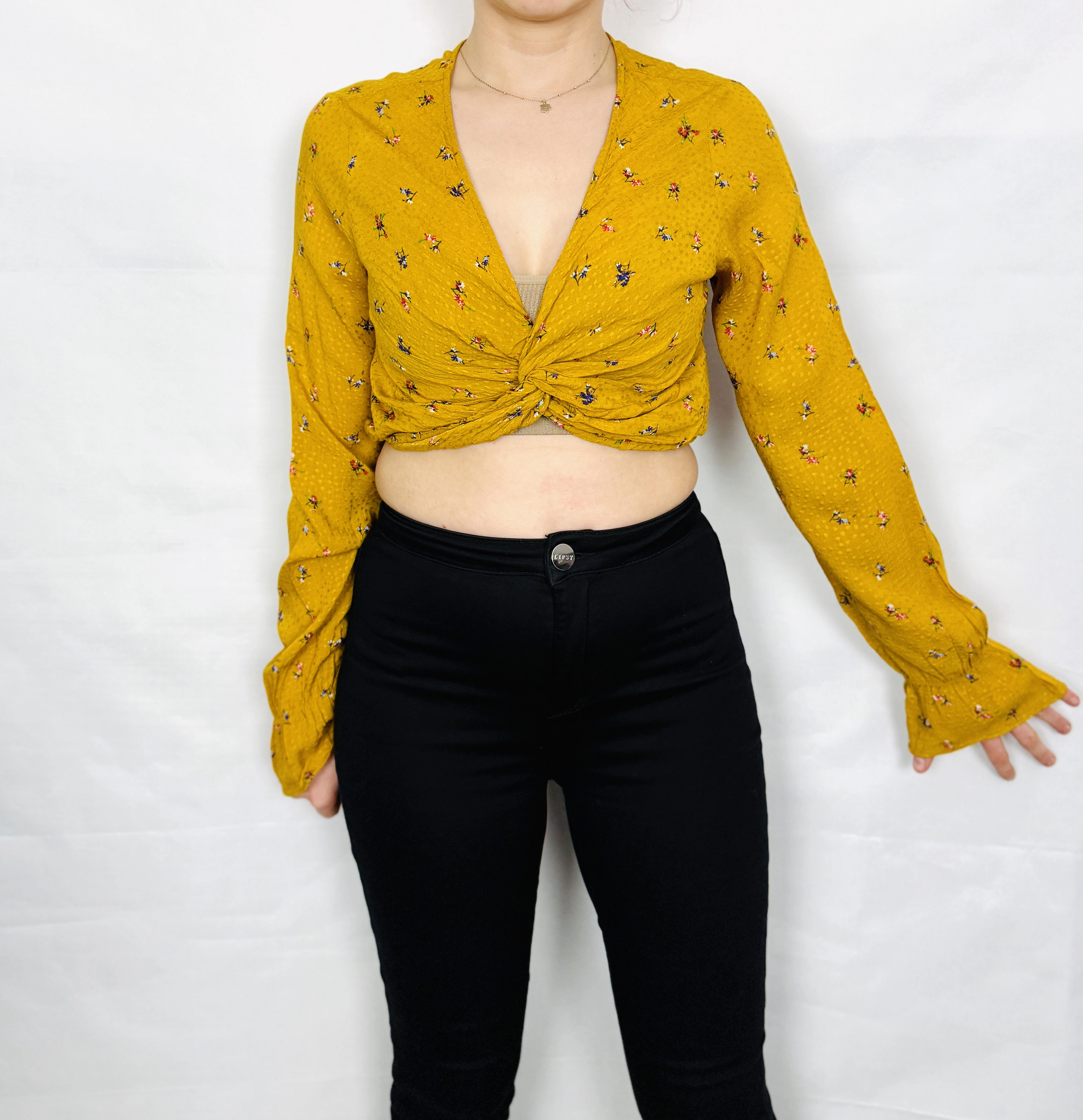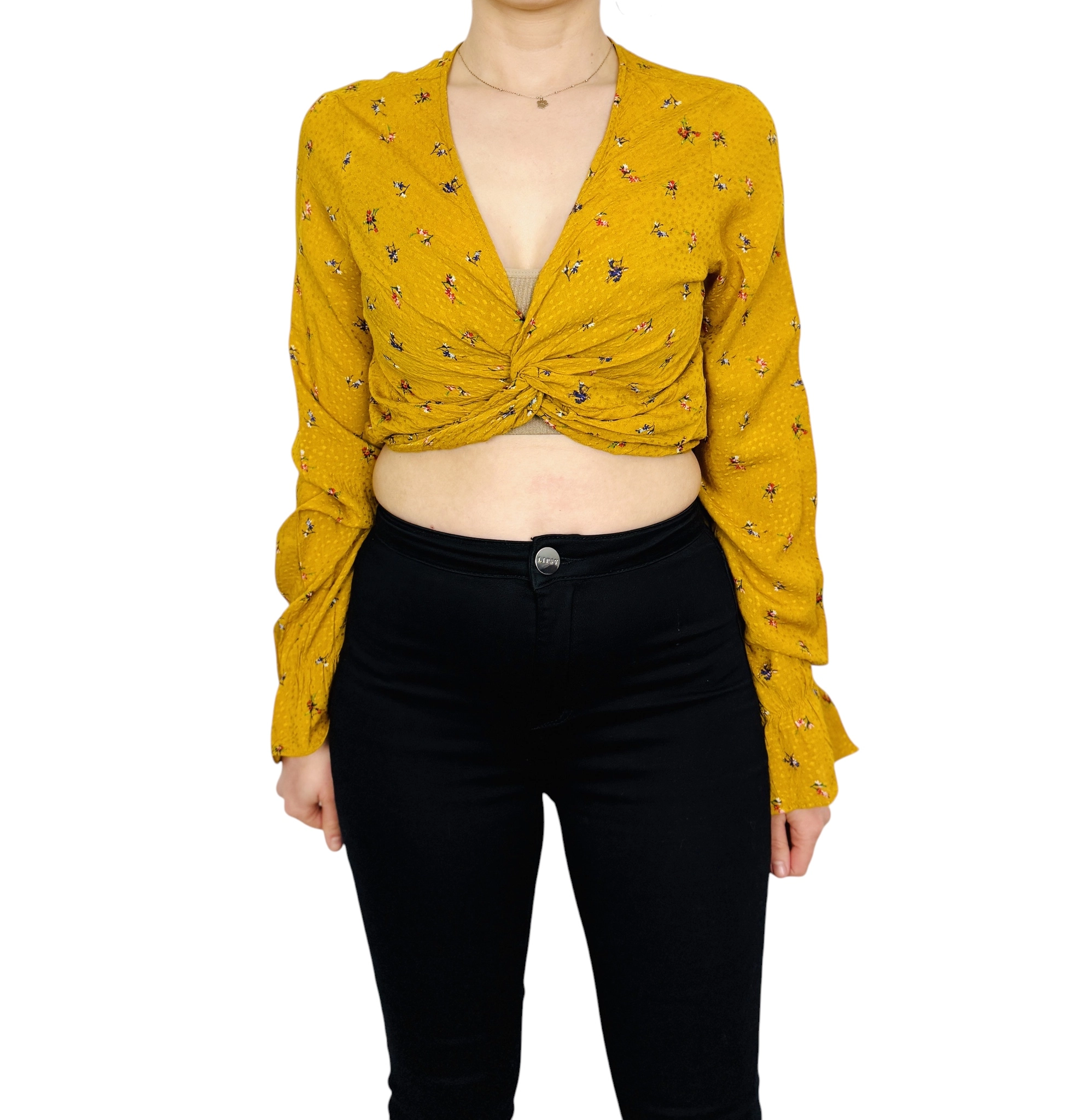 Żółty crop top w kwiaty z węzłem S 36
