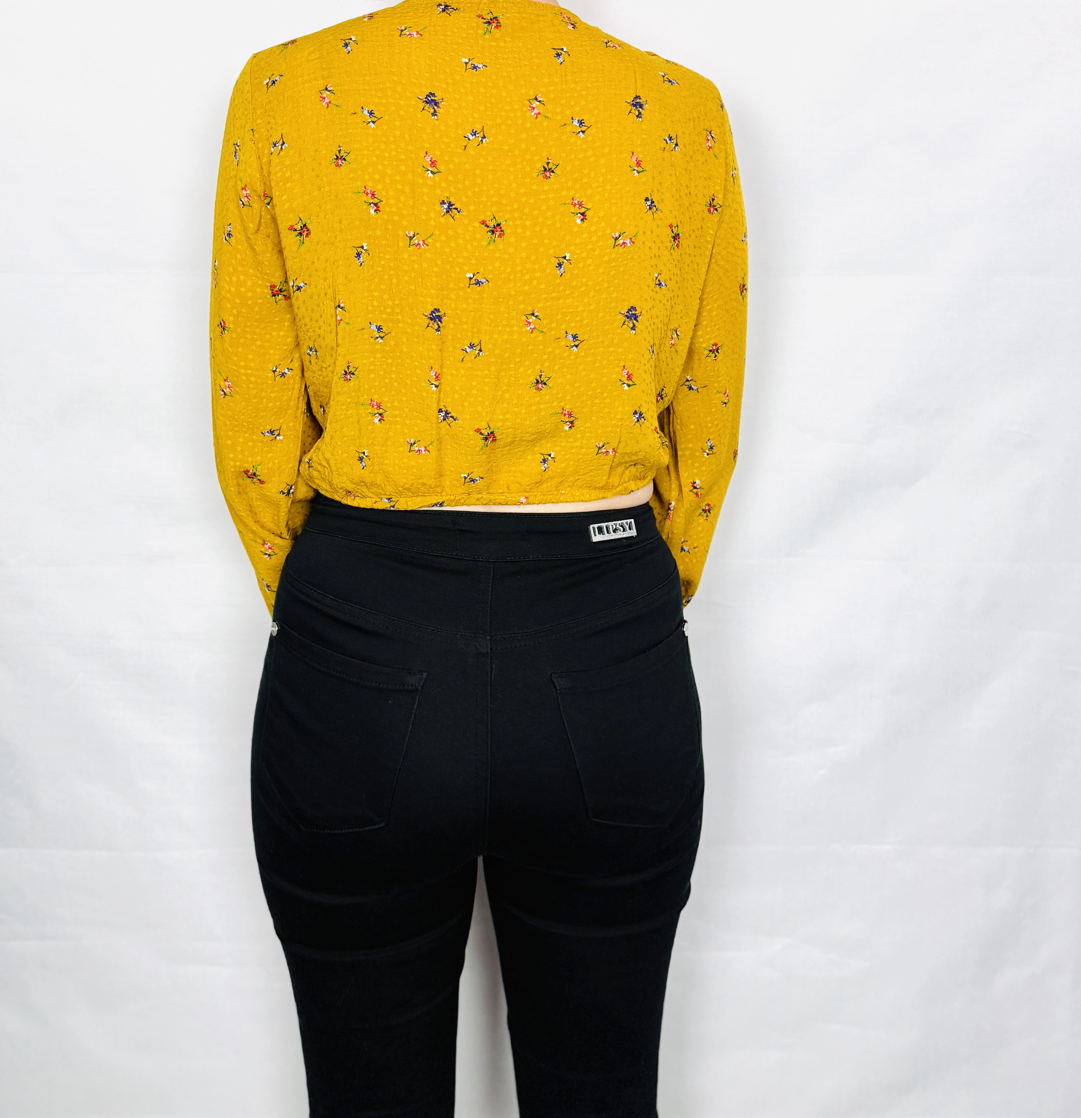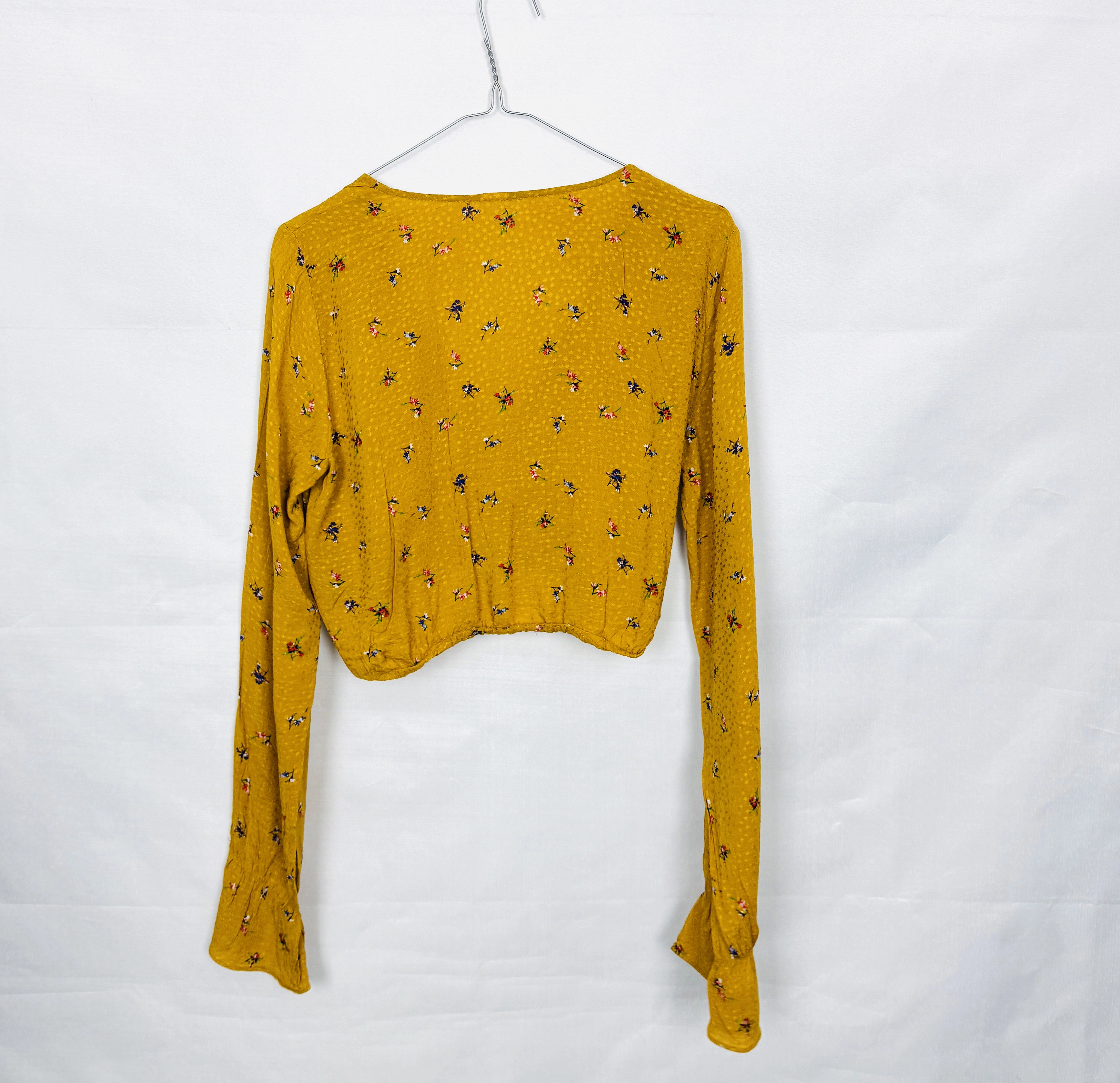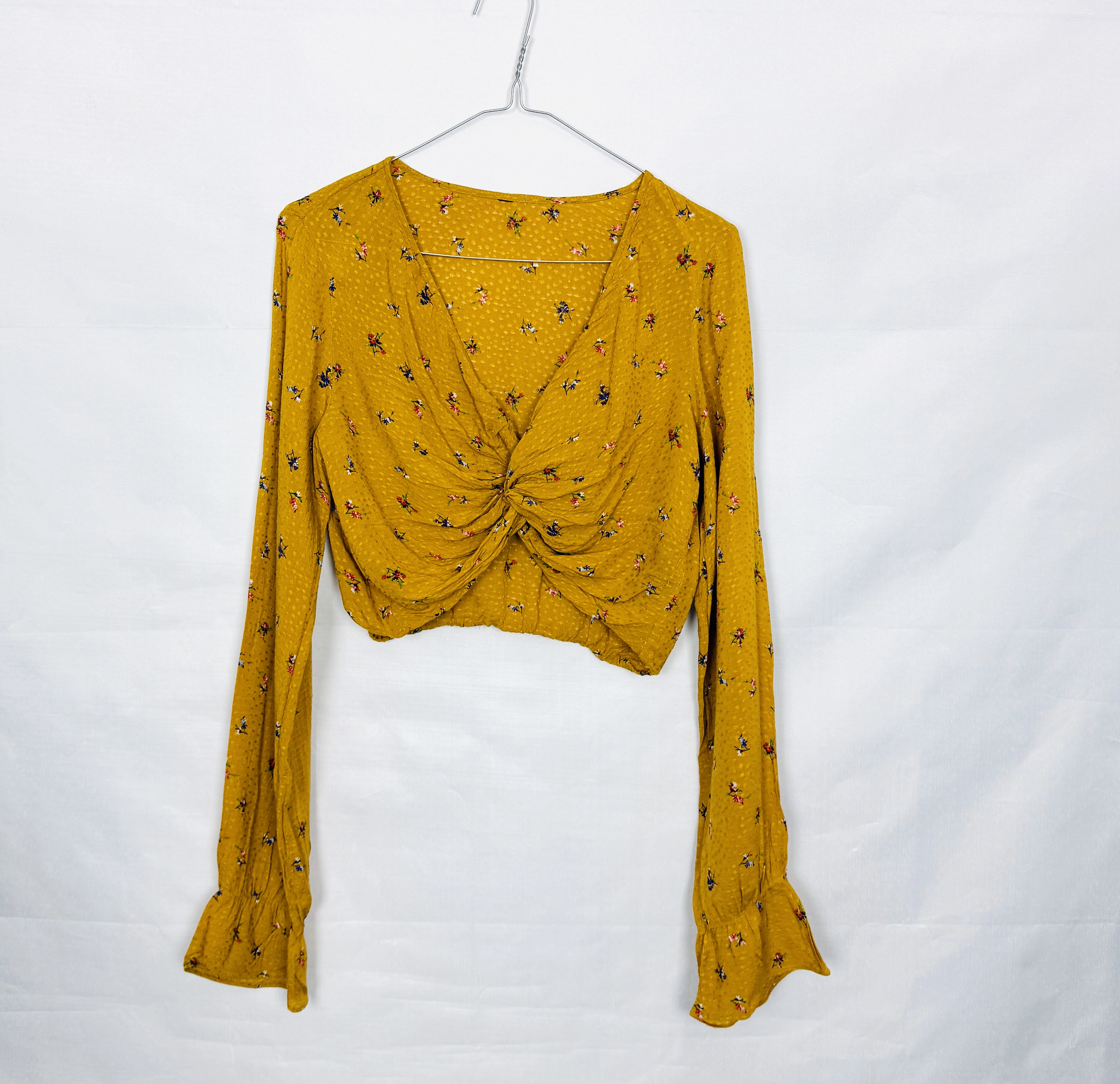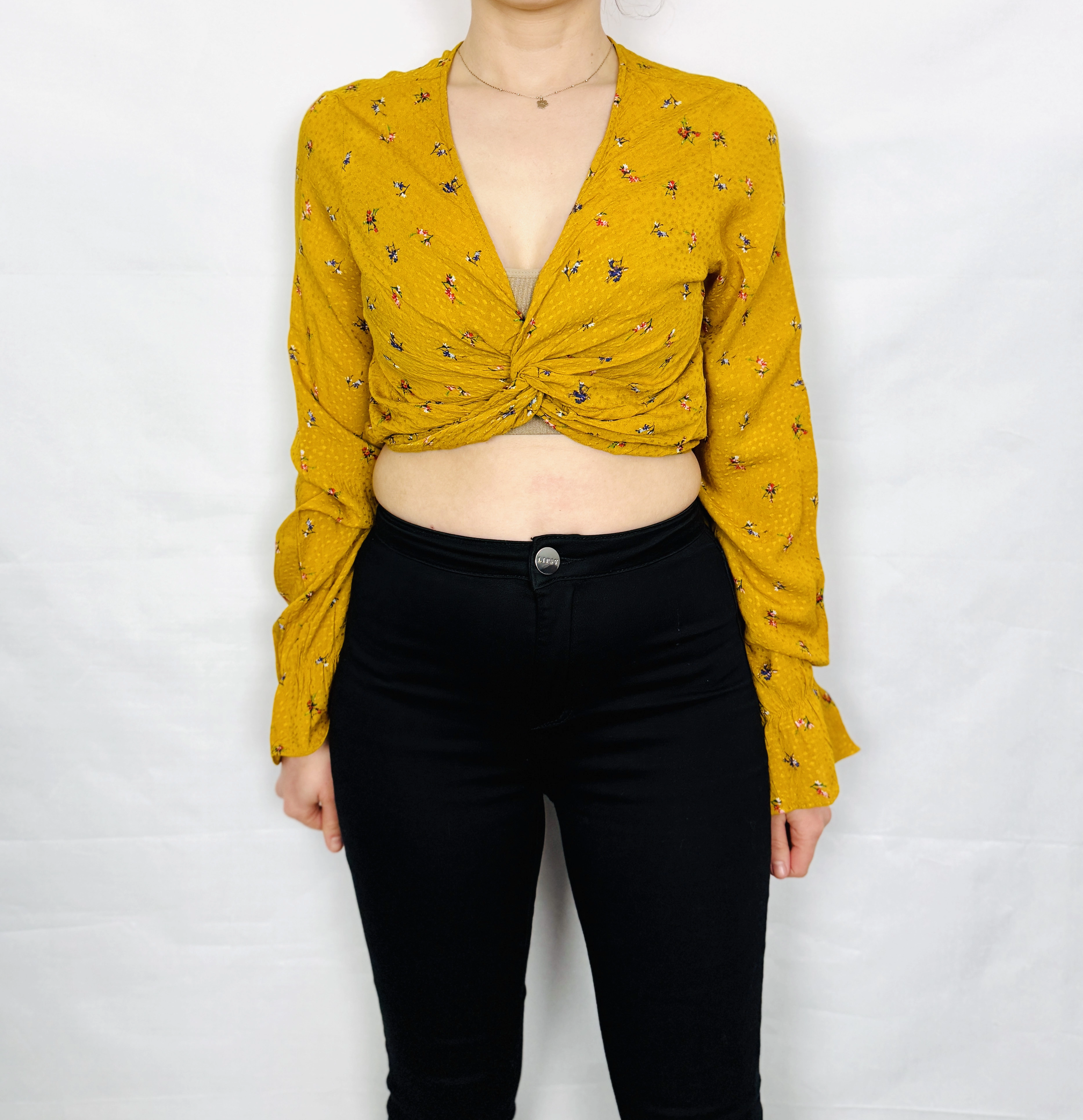 Żółty crop top w kwiaty z węzłem S 36