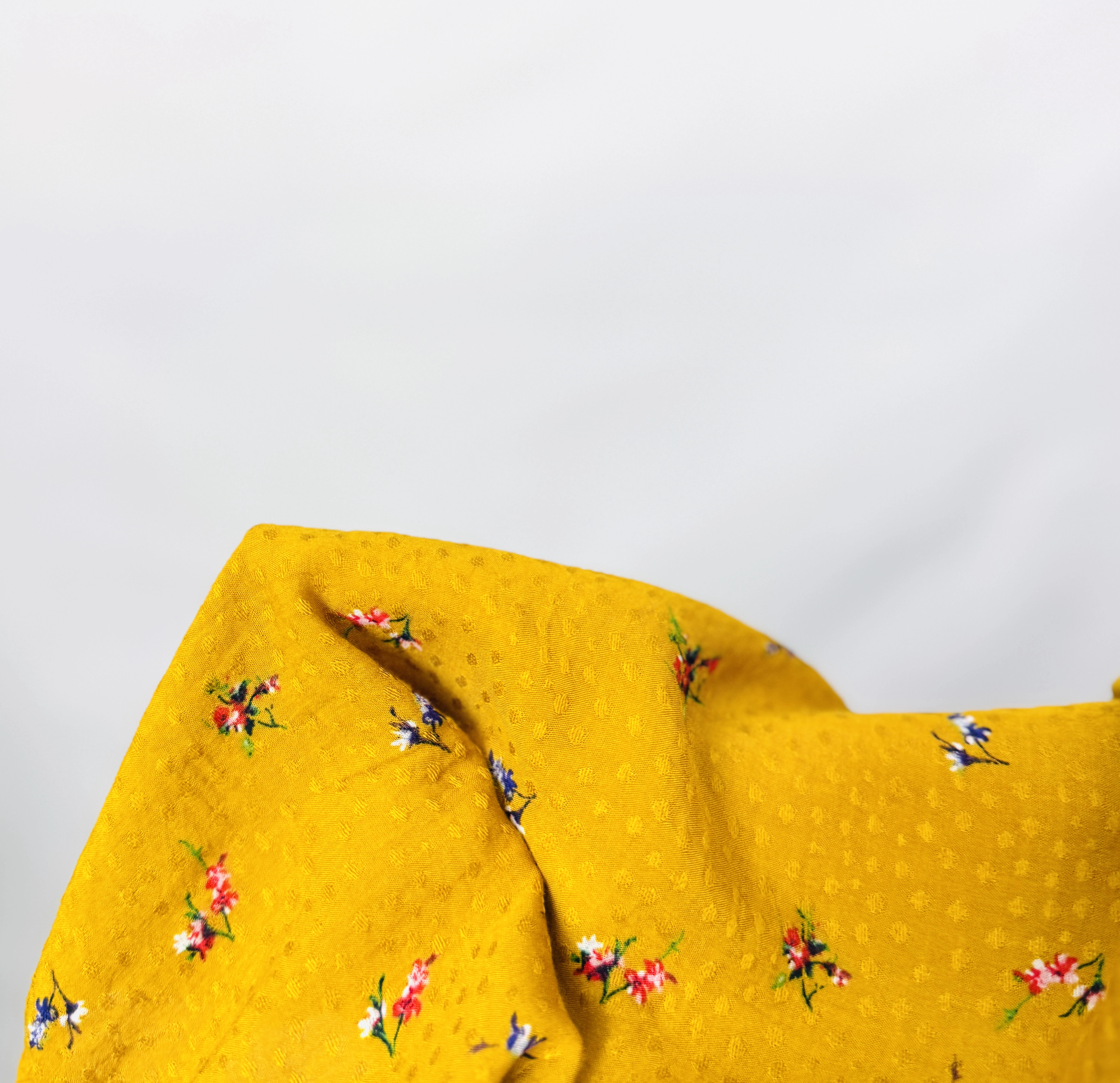 Materiał użyty do wykonania tego topu jest lekki i zwiewny, o delikatnej, nieco ziarnistej strukturze, która nadaje tkaninie szlachetnego wyglądu. Grodkowata faktura materiału sprawia, że bluzka pięknie współpracuje ze światłem, a nadruk drobnych kwiatuszków w odcieniach bieli, czerwieni i granatu jest precyzyjnie naniesiony na miodowe tło. Tkanina miękko układa się na ciele, zapewniając przewiewność i komfort nawet podczas bardzo ciepłych dni. Jest to materiał, który charakteryzuje się subtelnym ruchem przy każdym gestem, co potęguje wrażenie eteryczności i lekkości.