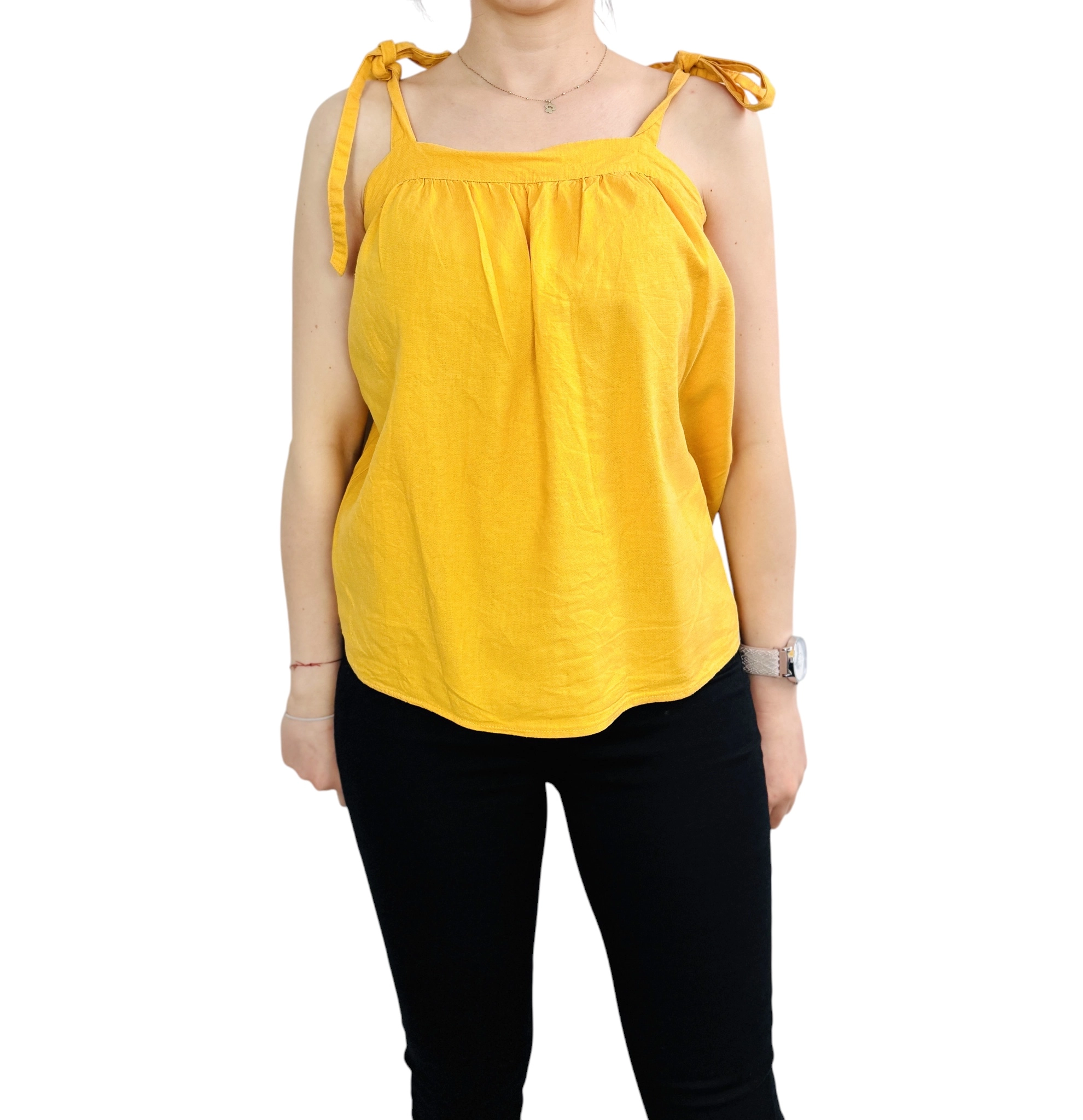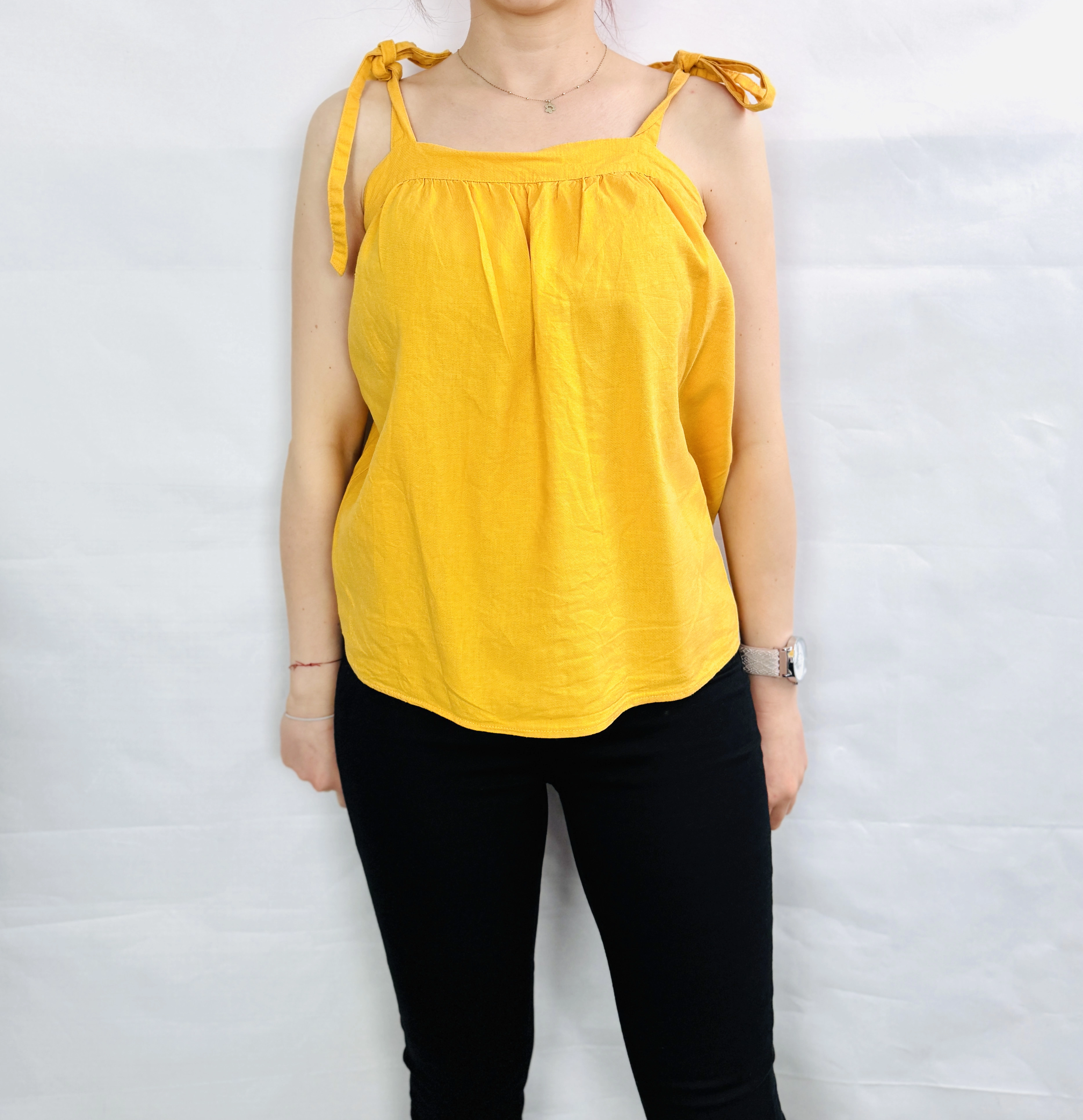 Materiał, z którego wykonano ten model, jest lekki i miękko układający się, o naturalnej, lnianej strukturze, która nadaje tkaninie charakterystycznej świeżości i przewiewności. Tkanina jest delikatnie matowa, co podkreśla intensywność żółtego koloru i dodaje całości naturalnego uroku. Dzięki swojej lekkości i przewiewności, top jest niezwykle komfortowy w noszeniu, idealny na ciepłe dni, a jednocześnie trwały i odporny na zagniecenia. Starannie wykończone detale, takie jak wiązania na ramionach, świadczą o wysokiej jakości wykonania i dbałości o każdy szczegół.