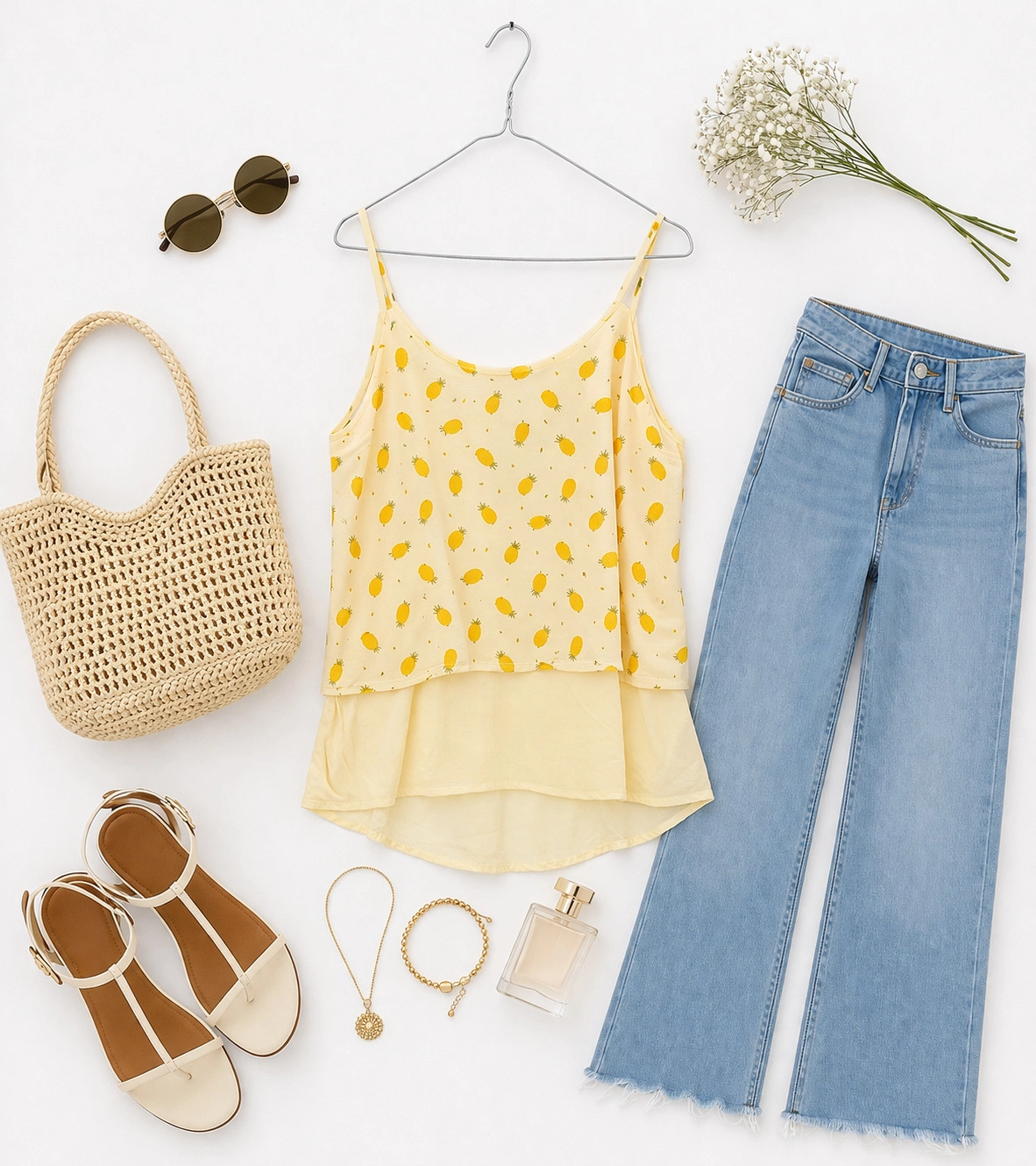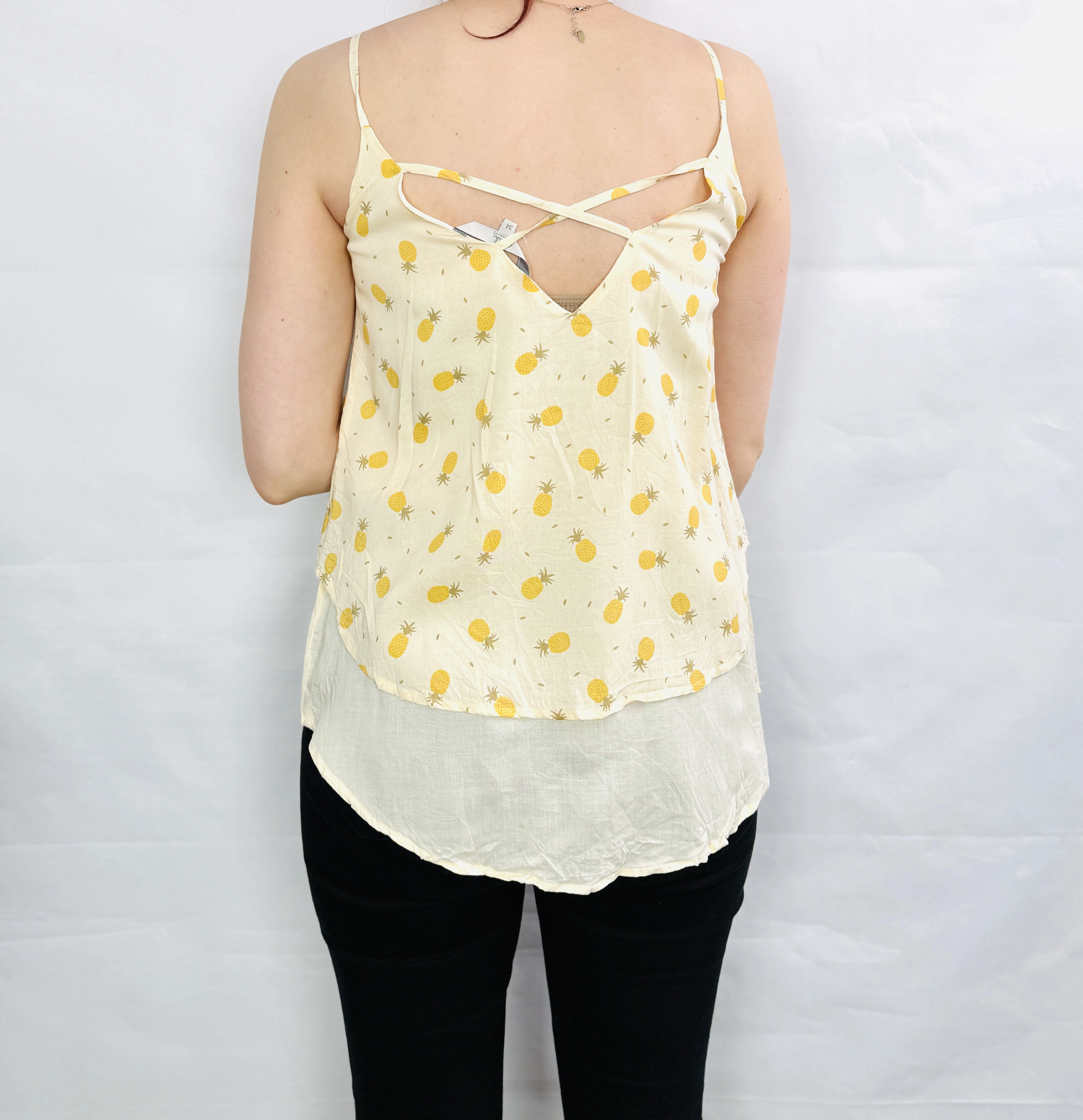 Stylizowanie topu w ananasy to doskonała okazja do tworzenia radosnych, letnich zestawów. Wyśmienicie zaprezentuje się w połączeniu z klasycznymi, białymi szortami lub błękitnymi jeansami z wysokim stanem, co stworzy świeży i bardzo modny look na co dzień. Można go również zestawić z dopasowaną czarną spódnicą, aby uzyskać ciekawy kontrast kolorystyczny i nieco bardziej miejski szyk. Żółty odcień topu prześlicznie łączy się z bielą, czernią, beżem oraz wszelkimi pastelami. To produkt, który zapewnia radosny wygląd i stylową swobodę, będąc obowiązkowym elementem w walizce na każdy wakacyjny wyjazd.