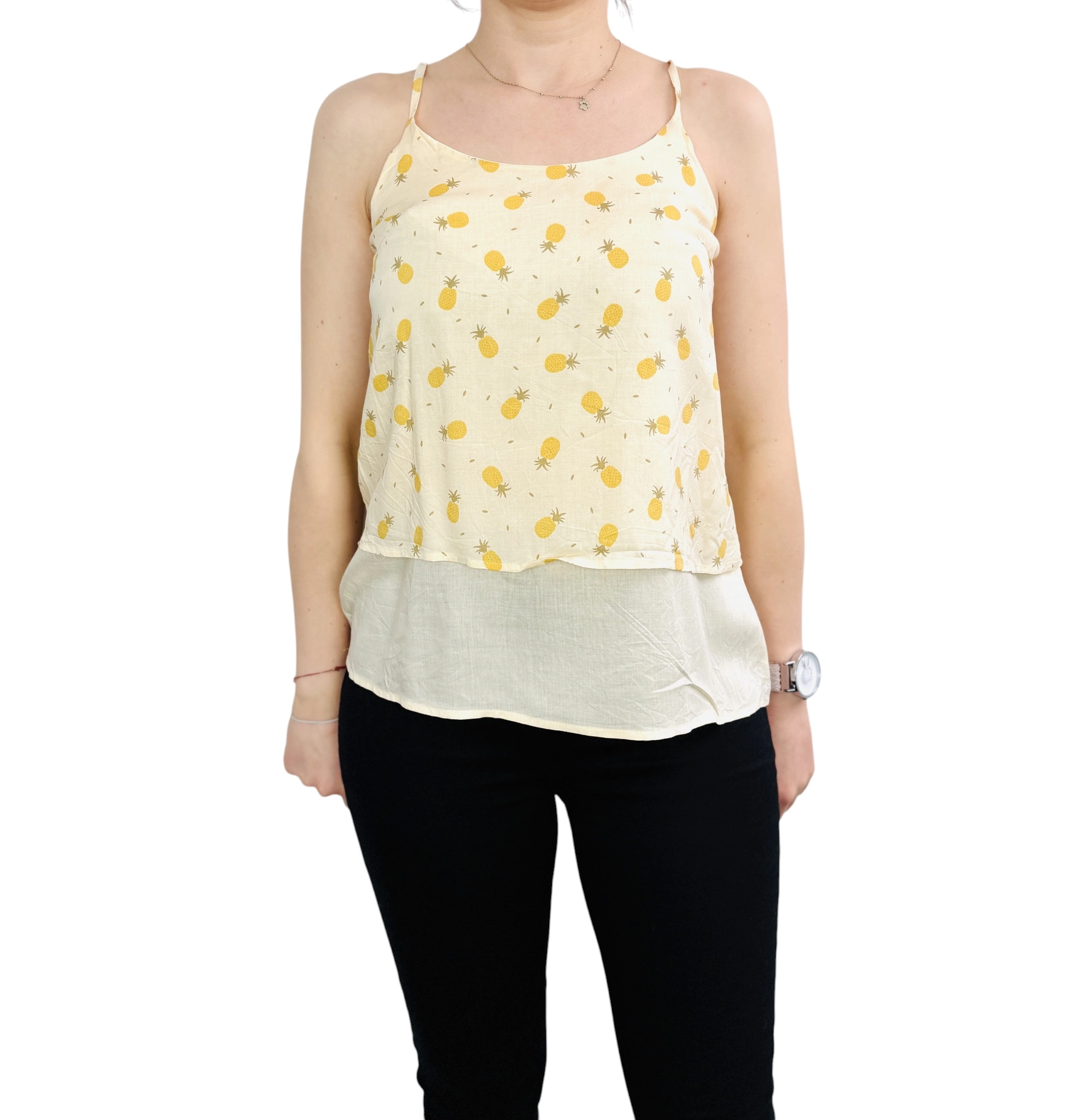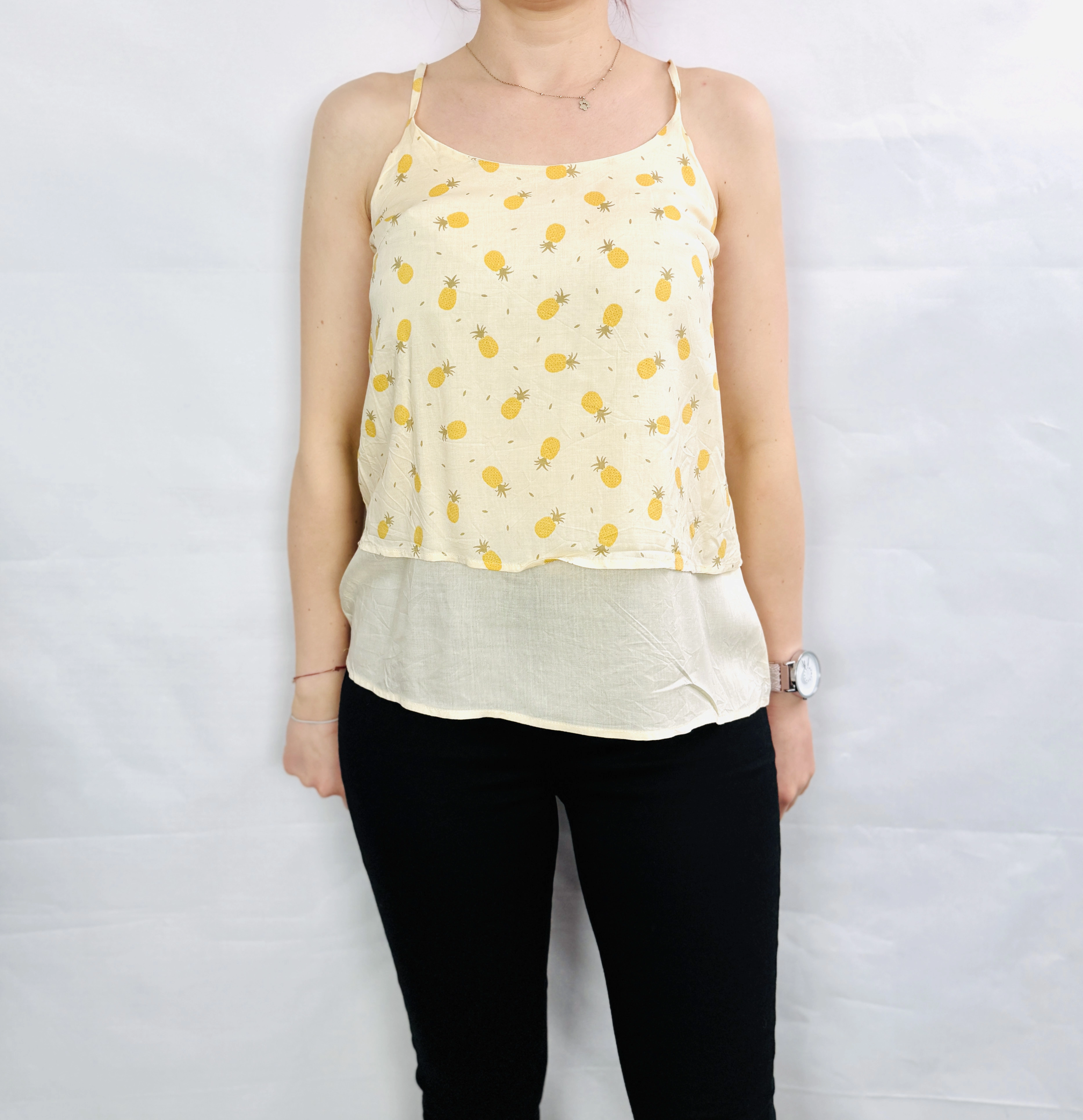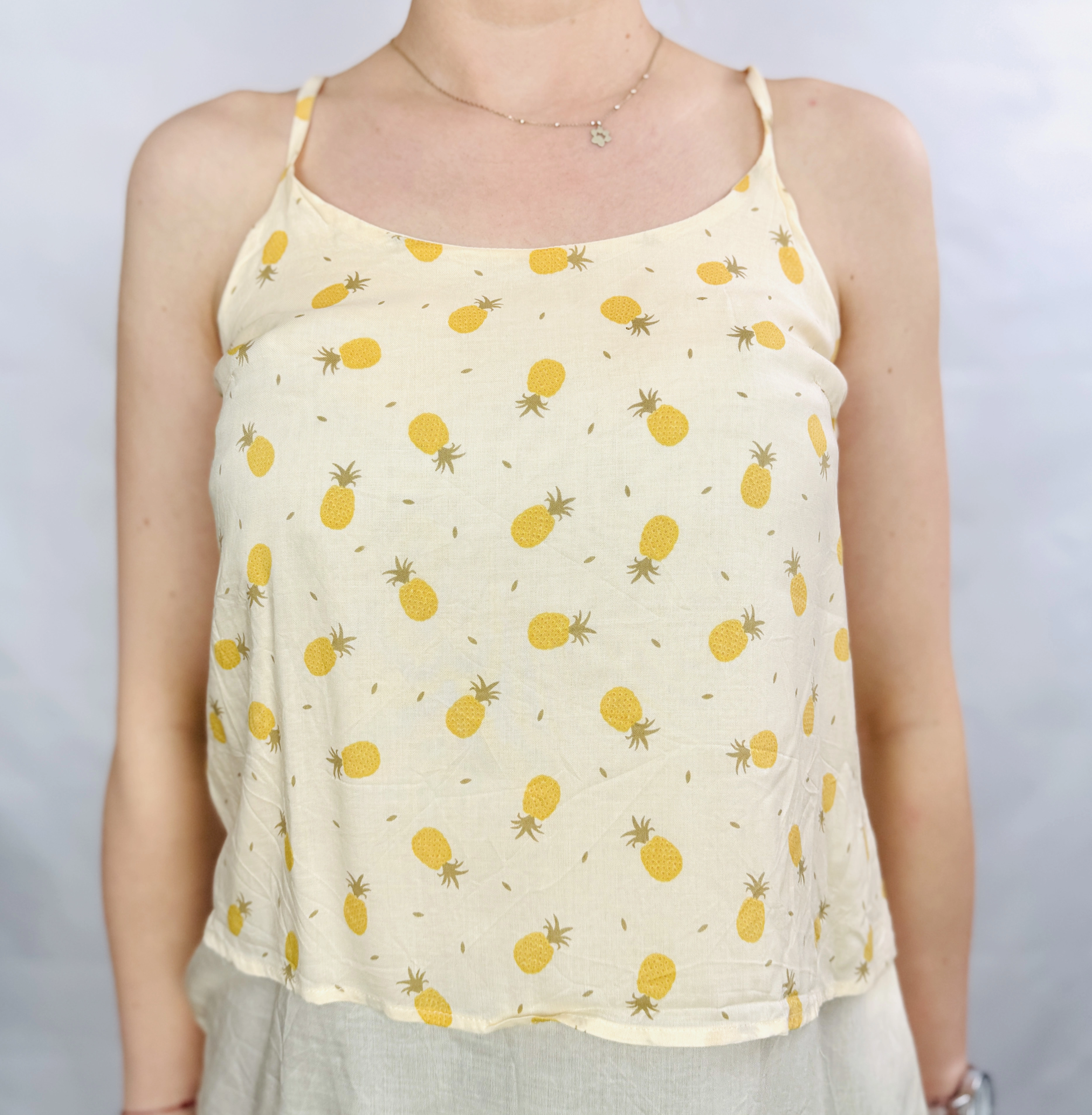 Ten słoneczny top to kwintesencja radosnego, wakacyjnego nastroju i bezpretensjonalnej, kobiecej swobody. Delikatny, jasnożółty odcień tkaniny, przywodzący na myśl ciepłe promienie słońca, stanowi idealne tło dla regularnego wzoru drobnych ananasów, które nadają całości figlarnego i niezwykle modnego charakteru. To ubranie, które od razu wprowadza powiew świeżości do letniej garderoby, będąc doskonałym wyborem dla kobiet ceniących sobie lekkość, optymizm i naturalny wdzięk w codziennych stylizacjach. Top emanuje energią i pozytywnym klimatem, sprawiając, że każdy dzień nabiera tropikalnej lekkości, niezależnie od tego, czy spędzasz go w mieście, czy na piaszczystej plaży.